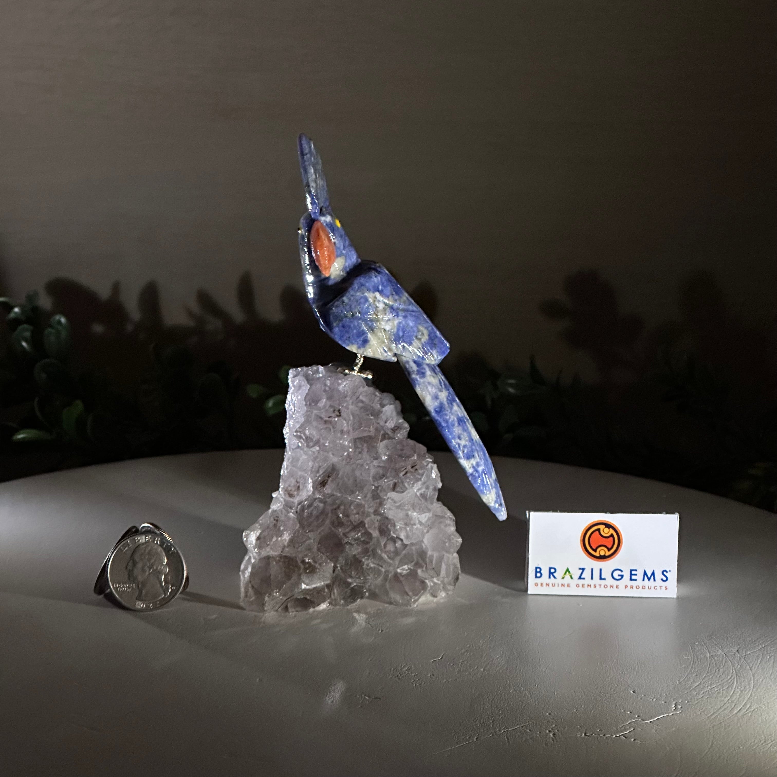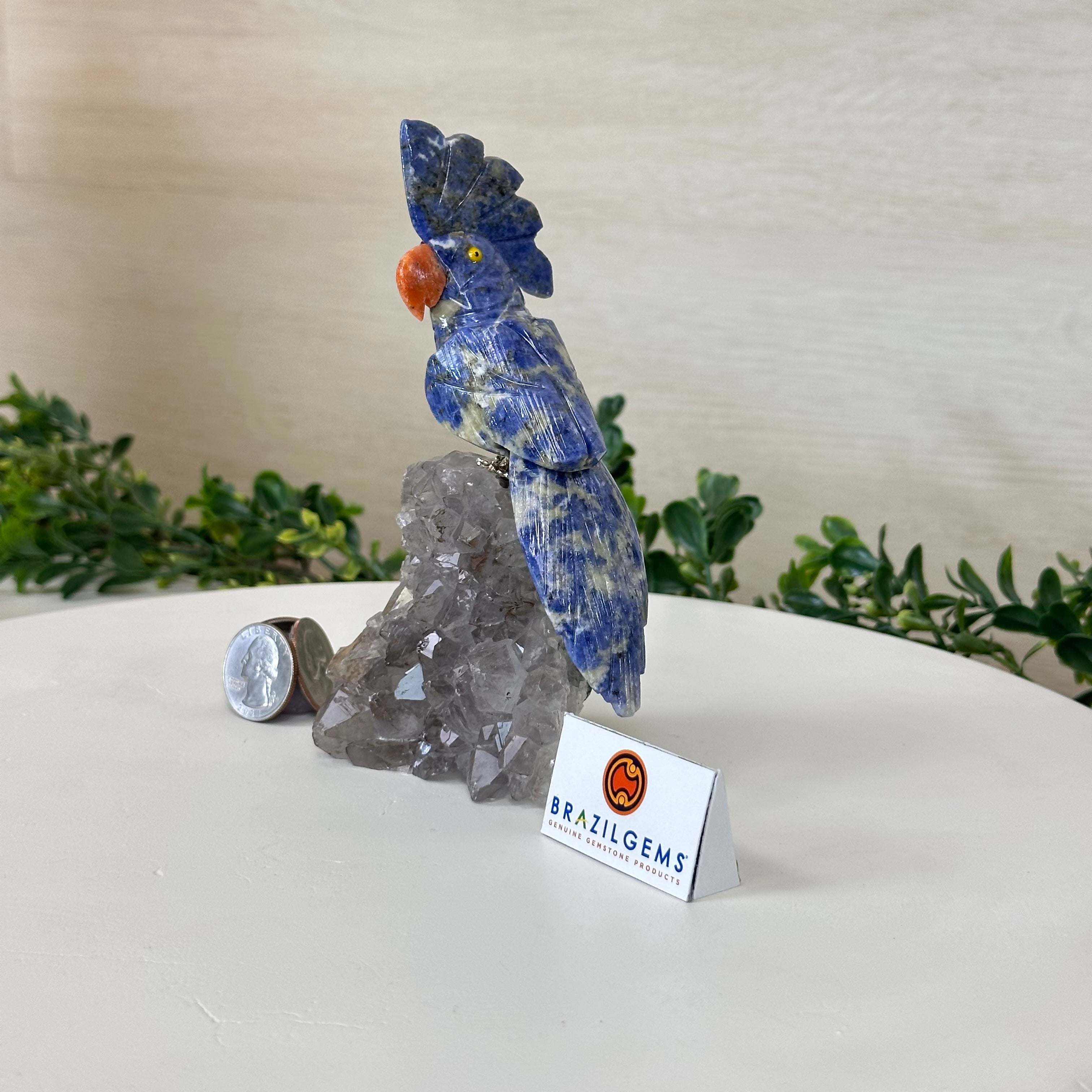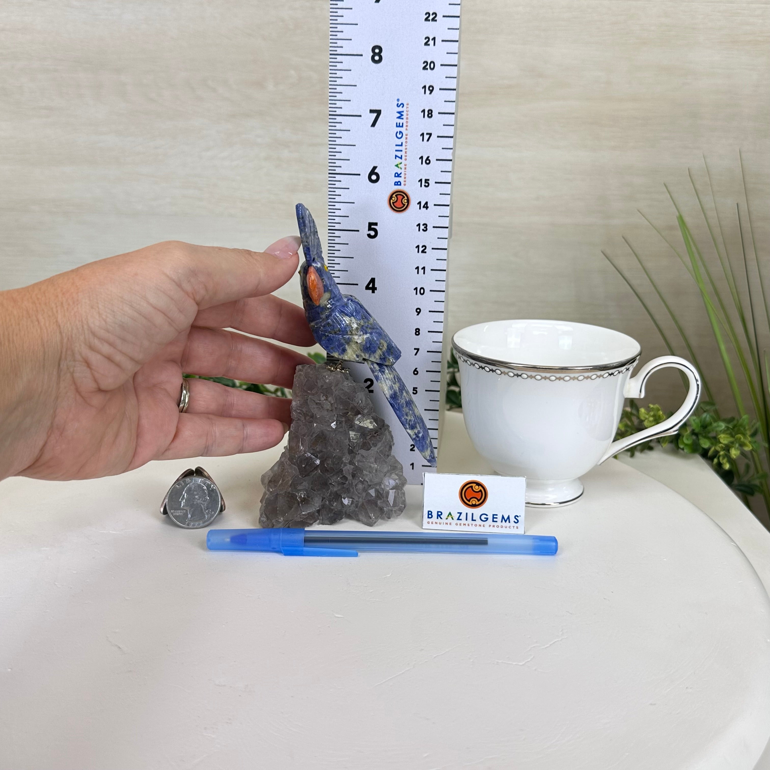 Disclaimer: This is a natural gemstone product sold by Brazil Gems® as is and as you see it in its images and video. The bird figurine has been hand carved out of natural gemstones and constructed together to give it its unique look. It and its cluster base may contain natural imperfections as well as imperfections, broken edges and repairs from the hand carving, extraction, mounting and prepping processes. The cluster base has a small hole drilled in the top for the bird to mount into. The crystal bird detaches from its base for shipping purposes. At Brazil Gems® we make every effort to get measurements as exact as possible but they are done by human hands and eyes and therefore may have minor discrepancies.