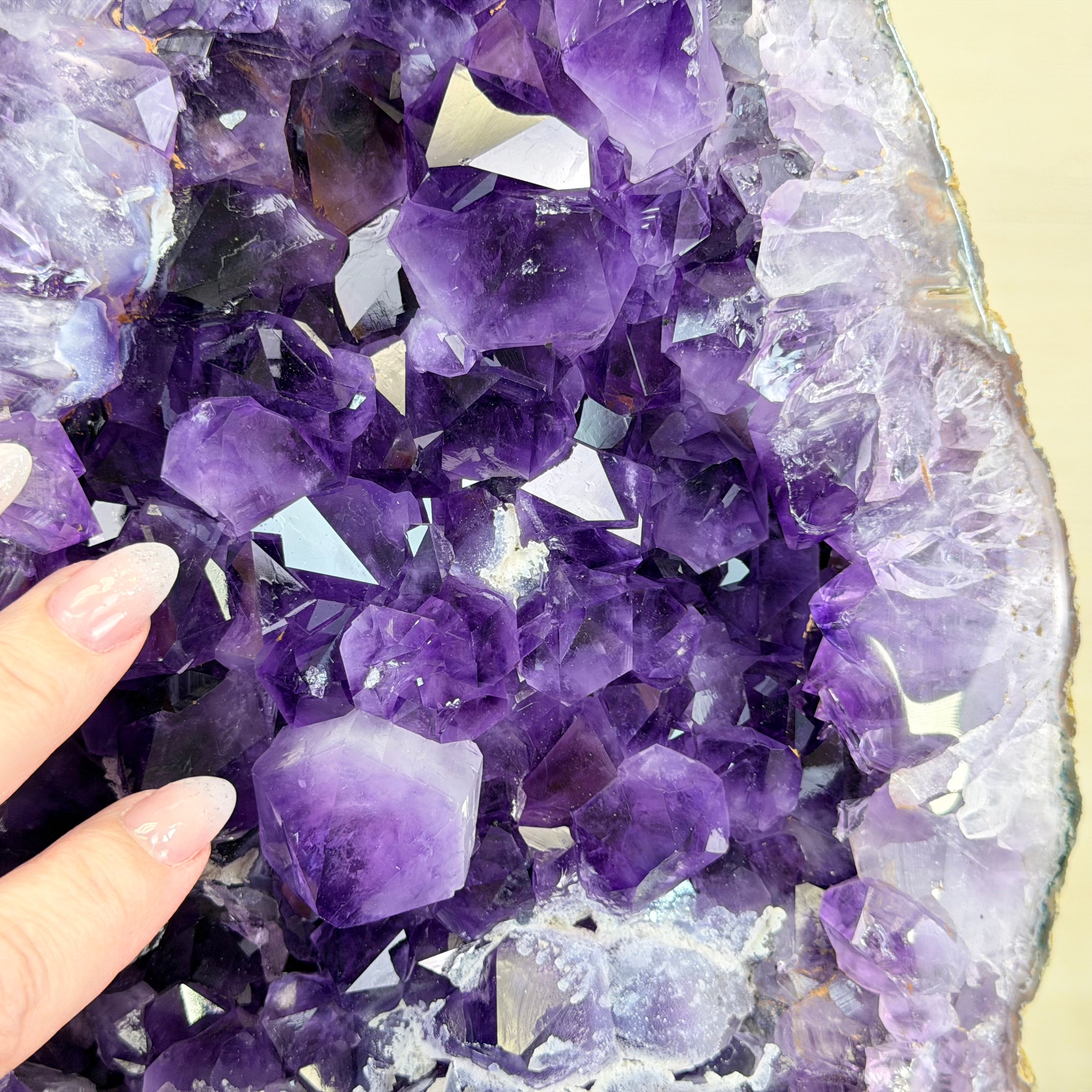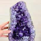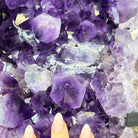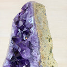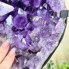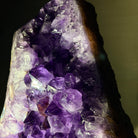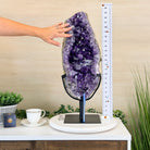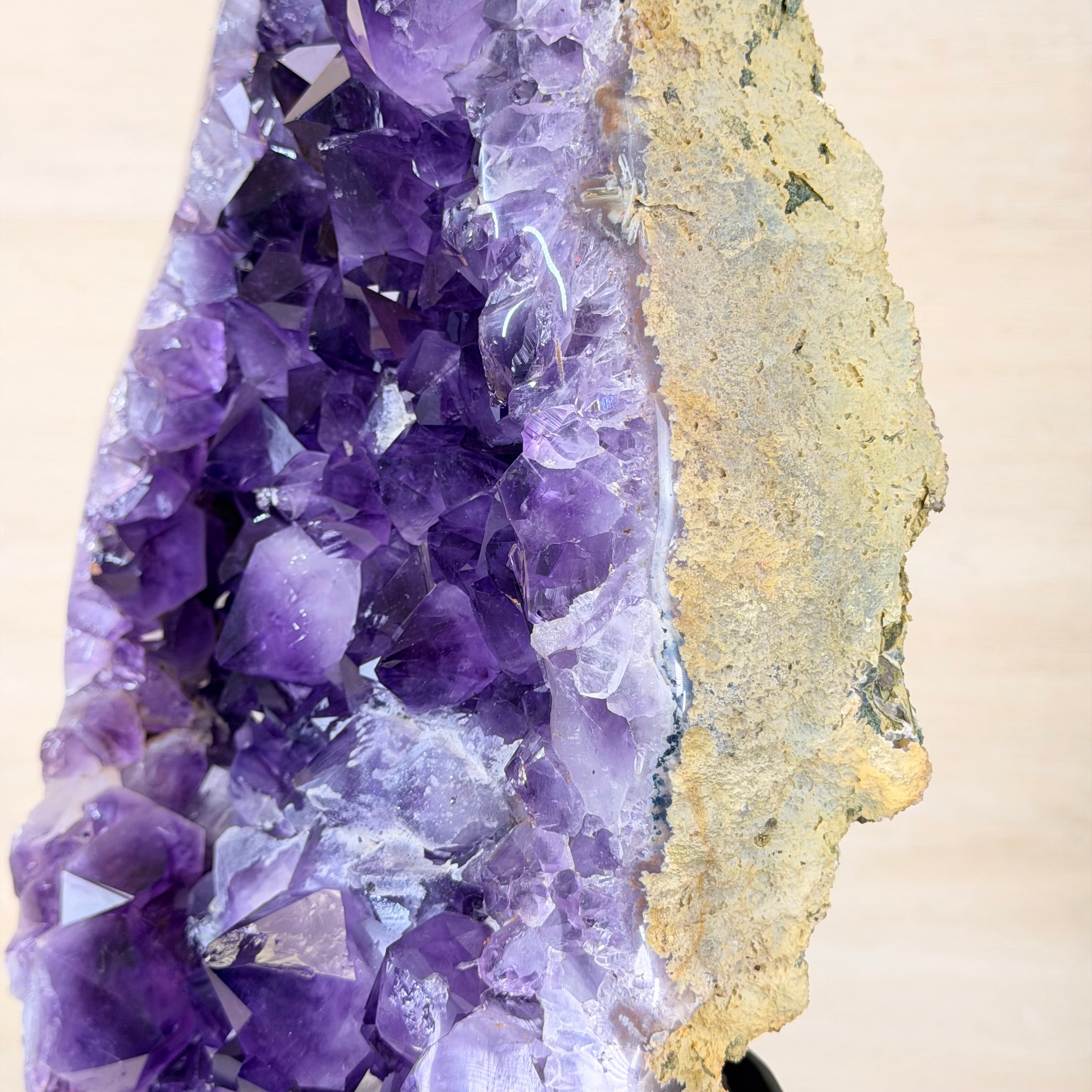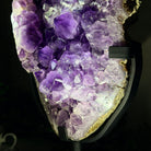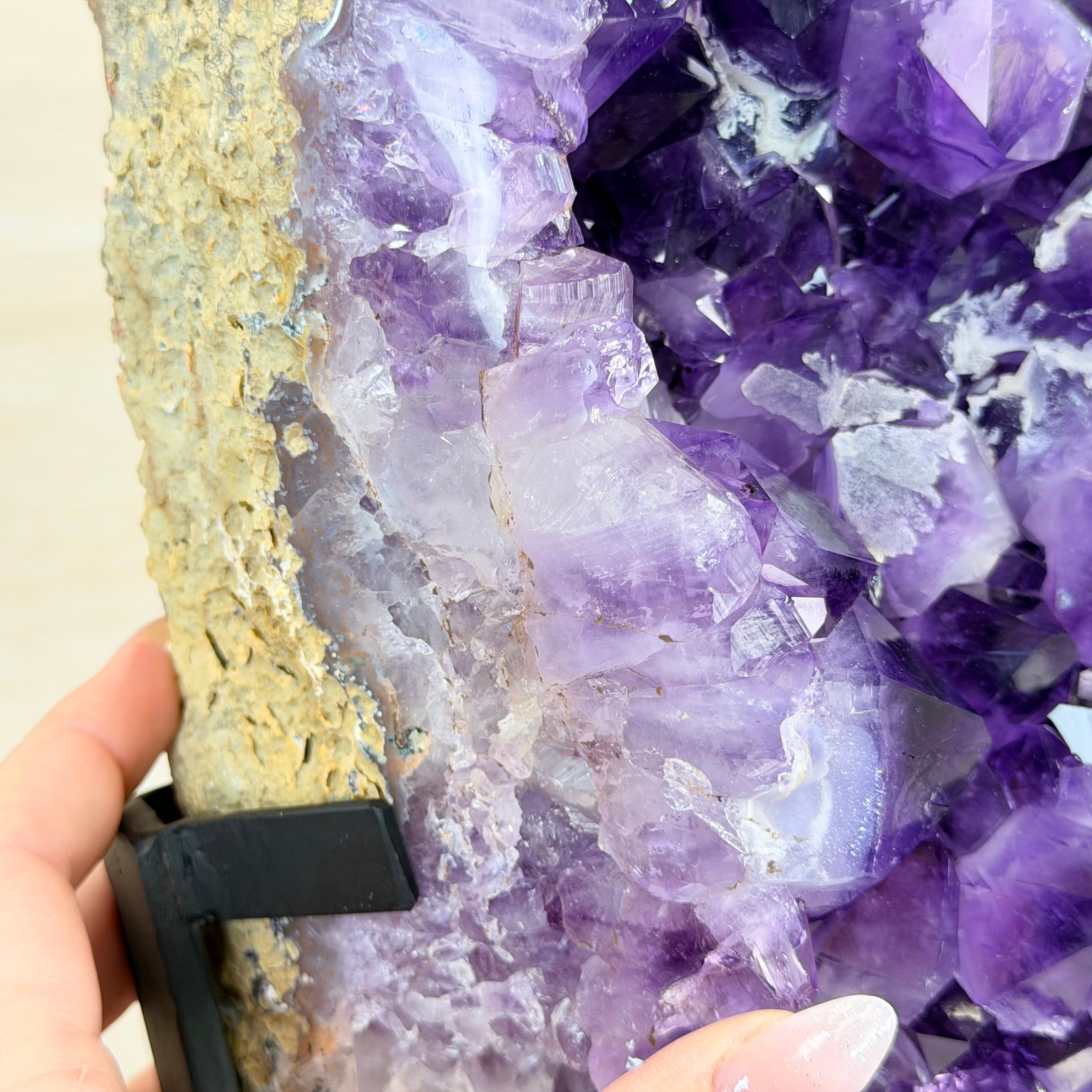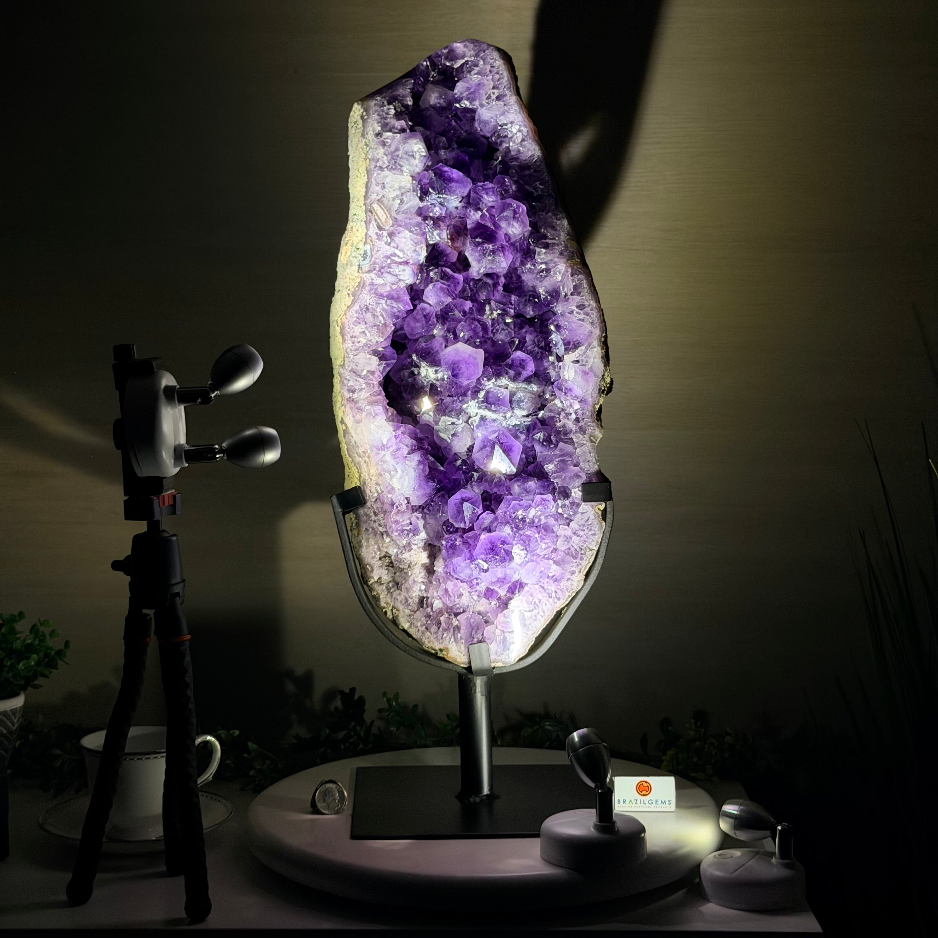 Infuse your room with the natural elegance of this Extra Plus Quality Natural Brazilian Amethyst Cluster on a black metal stand from Brazil Gems®. This gemstone has large, purple amethyst points perfectly displayed in an elegant shape. It is polished in the edges with a natural rough outer shell.