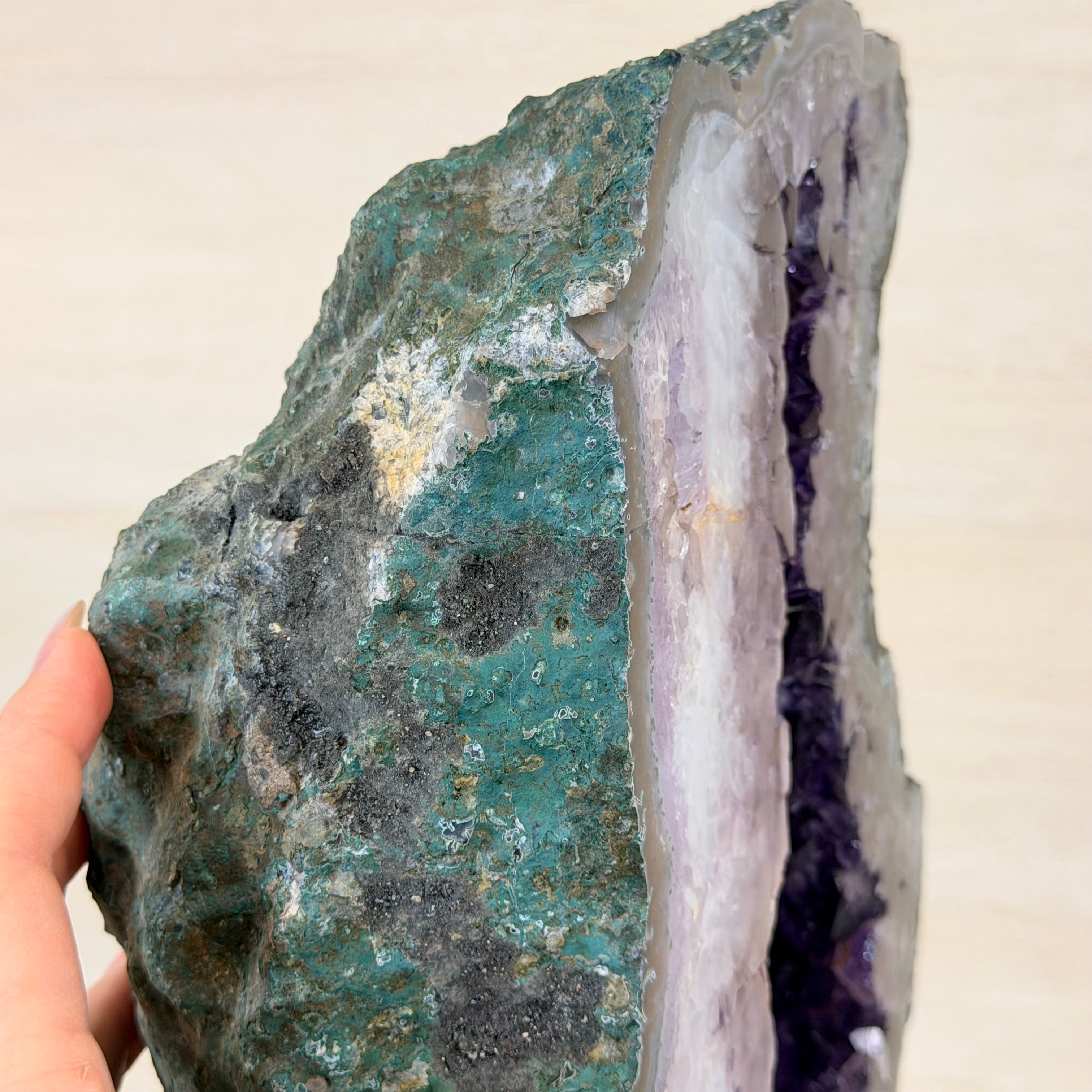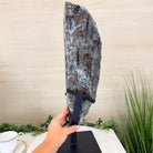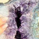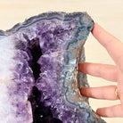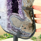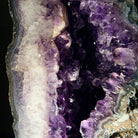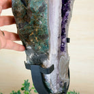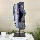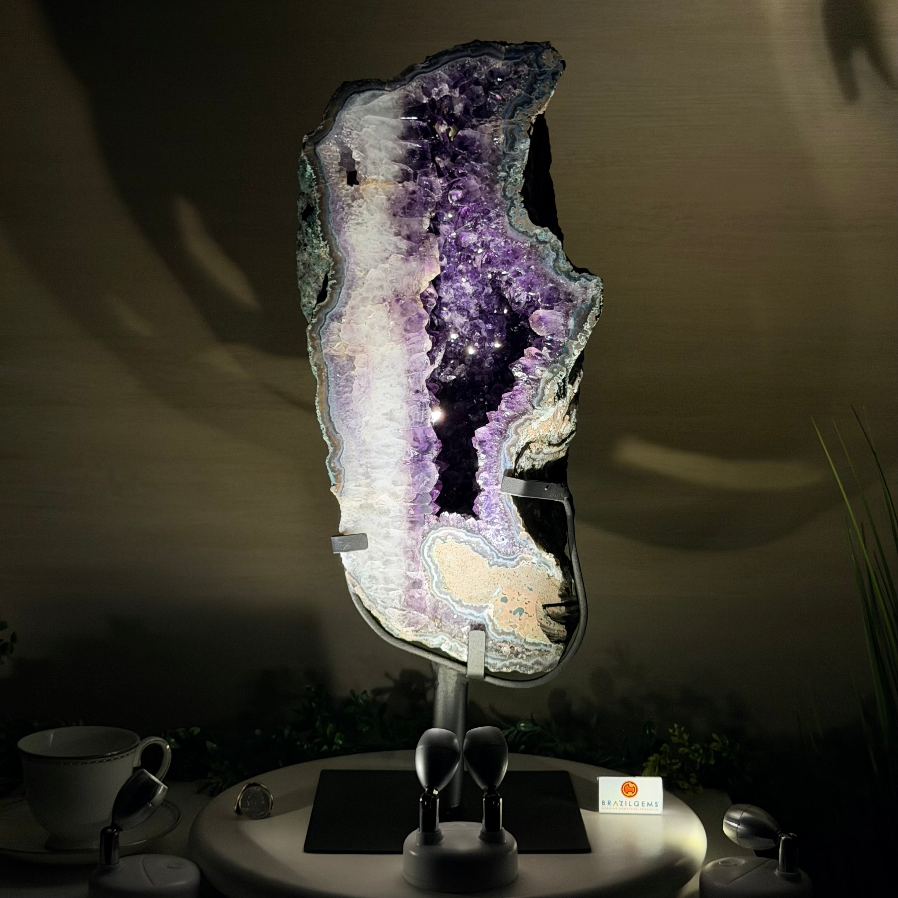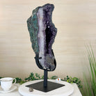 Infuse your room with the natural elegance of this Extra Quality Natural Brazilian Amethyst Cluster on a black metal stand from Brazil Gems®. This gemstone has purple amethyst points with lovely agate bands surrounding it. It is polished in the front edges with a natural rough outer shell.