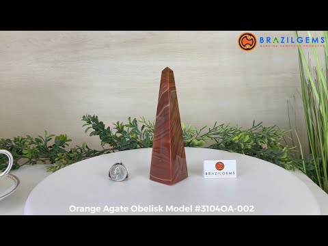 Crafted by master artisans in Brazil, this Orange Agate crystal obelisk showcases 4 smooth, flat sides that taper to a sharp, elegant point. Polished to perfection with a flat base for upright display, this crystal point stands tall as a testament to skilled craftsmanship. To achieve this dark orange color, the agate stones have been heated in a kiln which enhances the natural color and makes it a darker richer shade of orange.