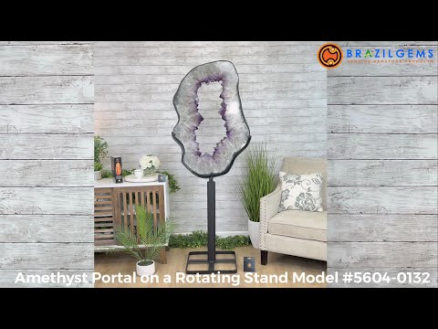 Brazil Gems® brings you this Large Super Quality Amethyst Portal. It is sure to bring a breathtaking presence to any room with its large bright violet points and white crystal bands atop a sturdy rotating base. It weighs 170.2 lbs and stands 73.5" tall.