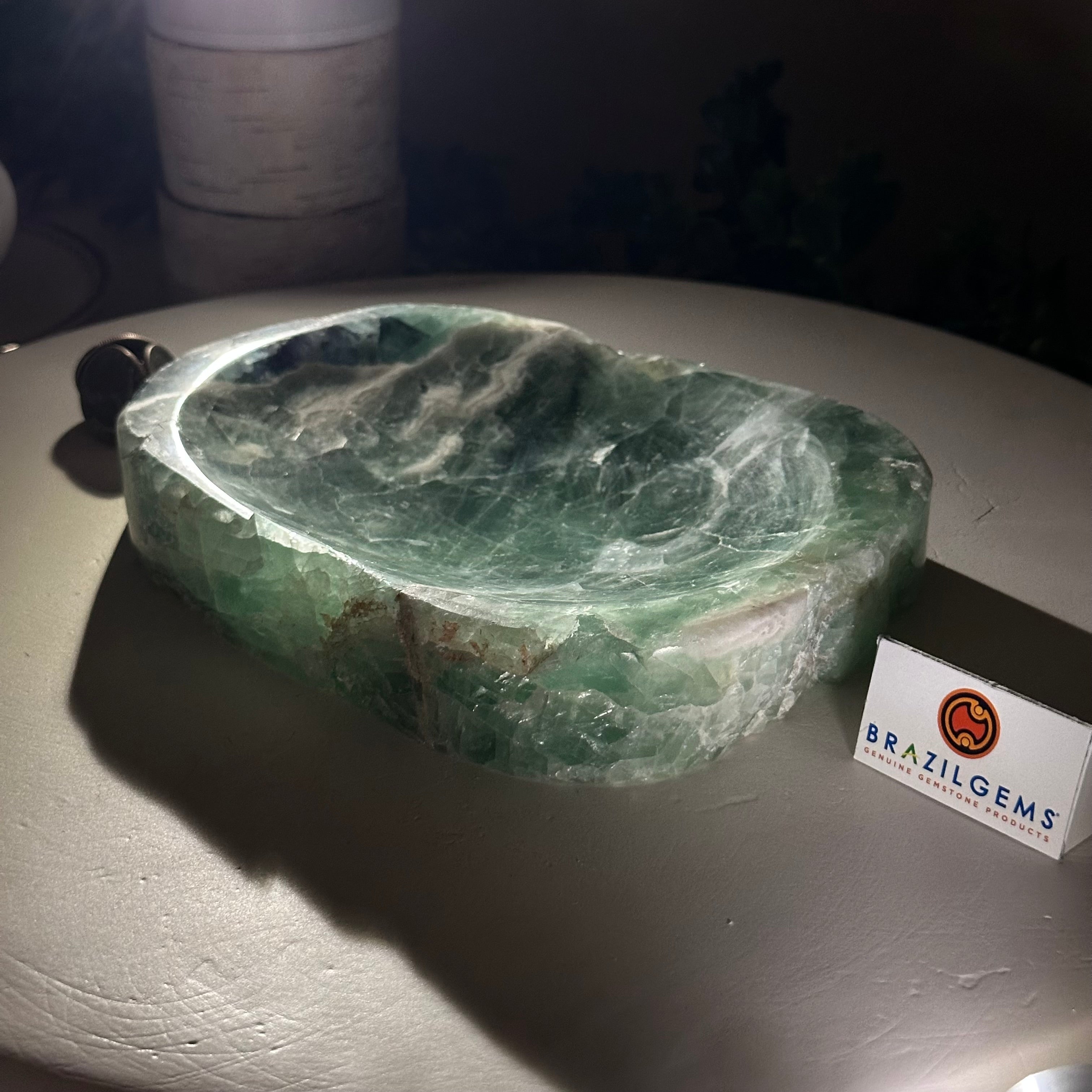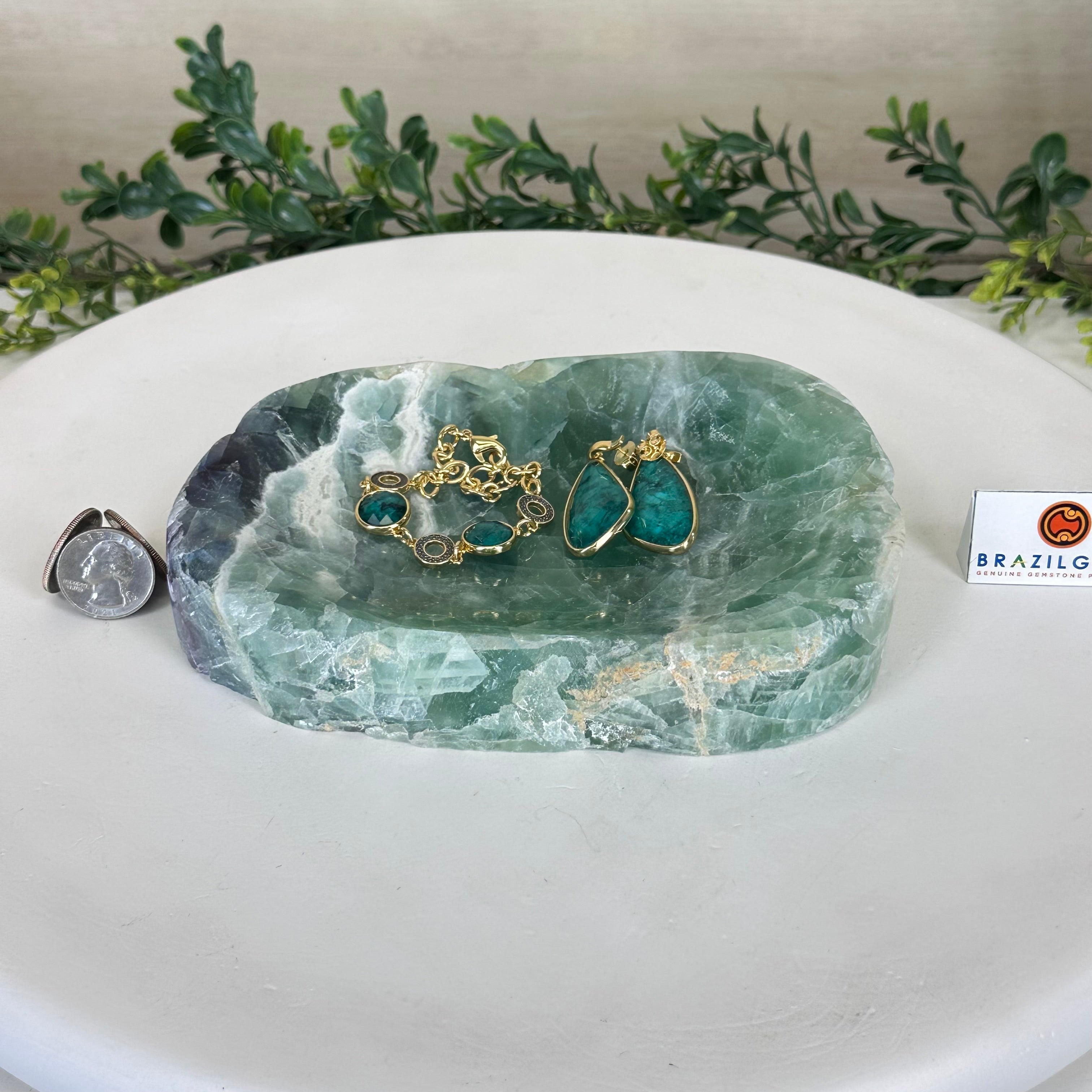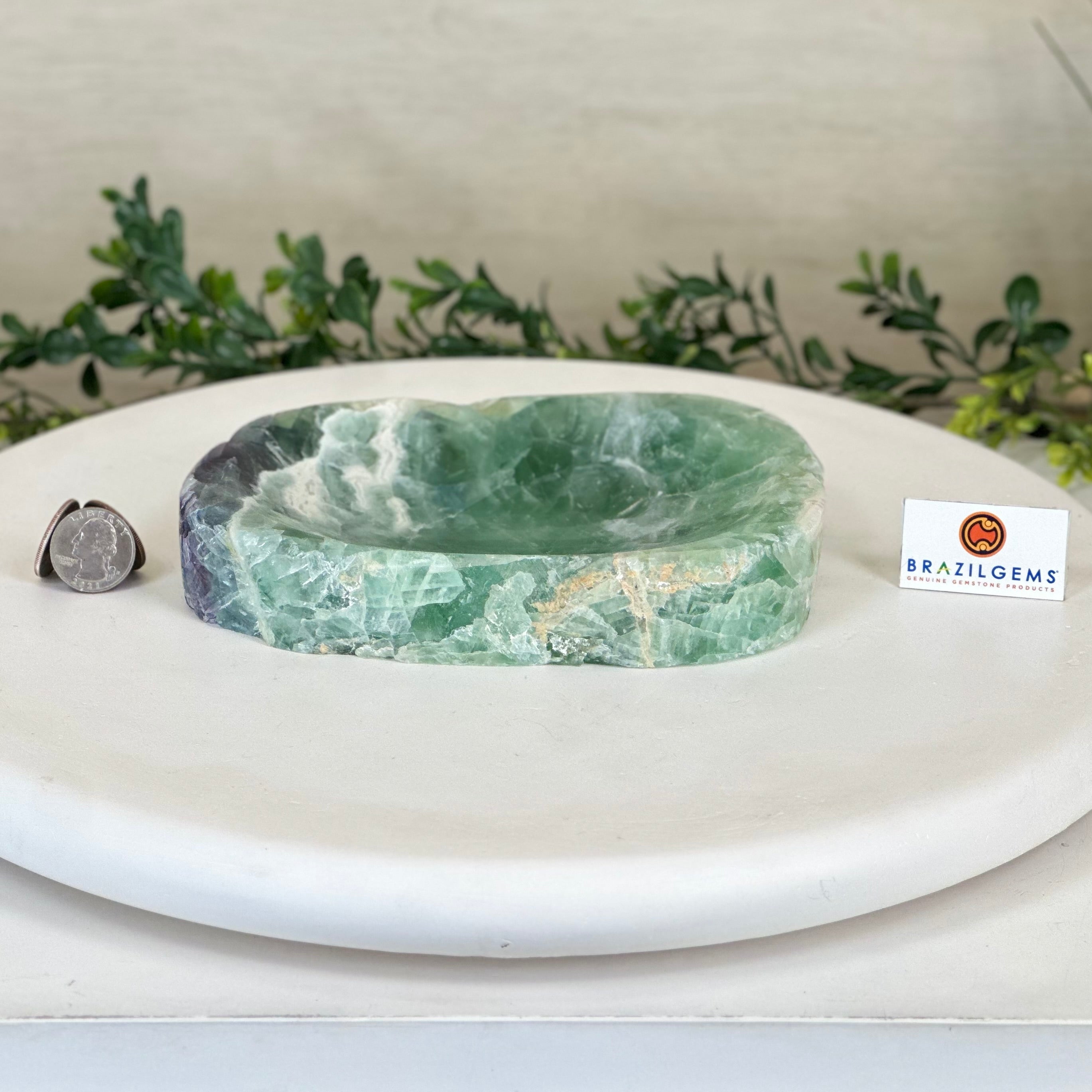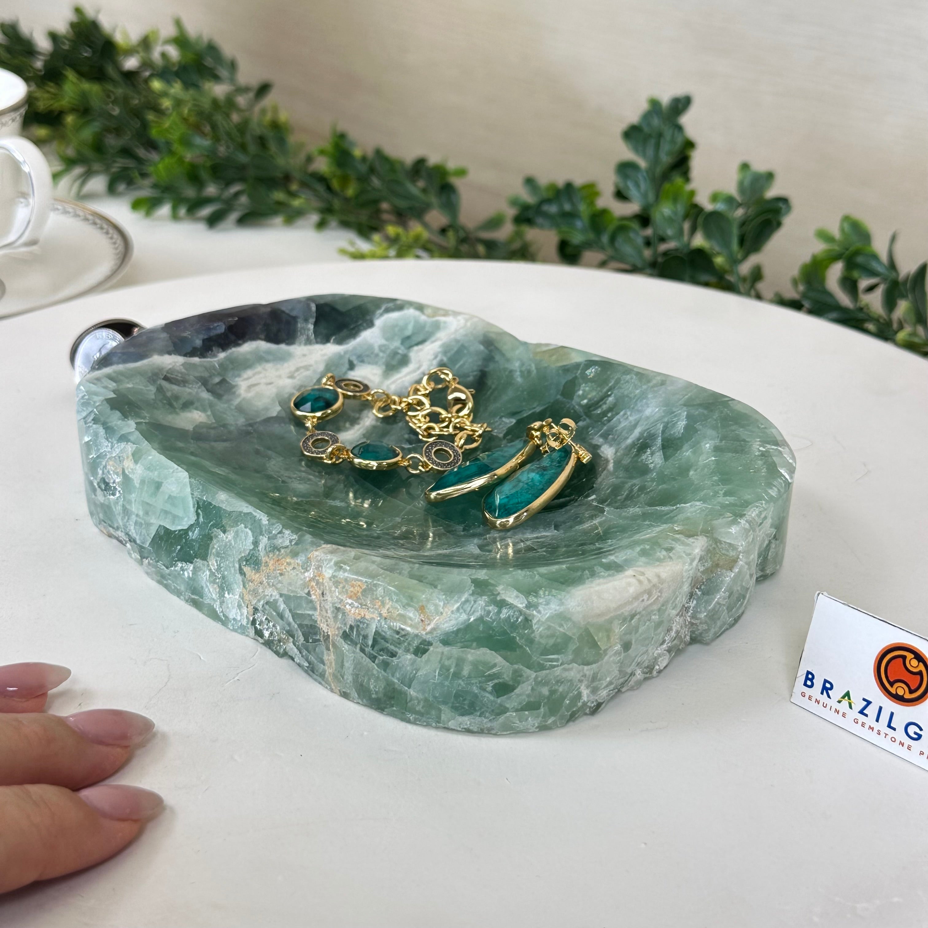 Elegant and versatile, this Fluorite decorative bowl is handcrafted from natural Brazilian stone and polished to reveal bright green tones. Use it as a soap dish, jewelry and ring holder, or a decorative catch-all for small items like crystals, keys, or loose change. Its smooth, durable surface makes it ideal for bathroom countertops, bedside tables, or entryway décor. Its edges are rough and not polished.