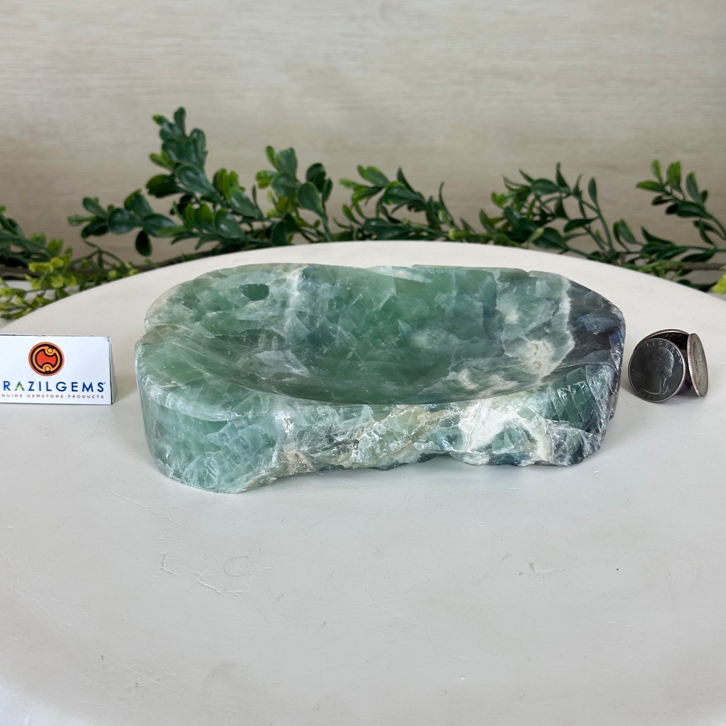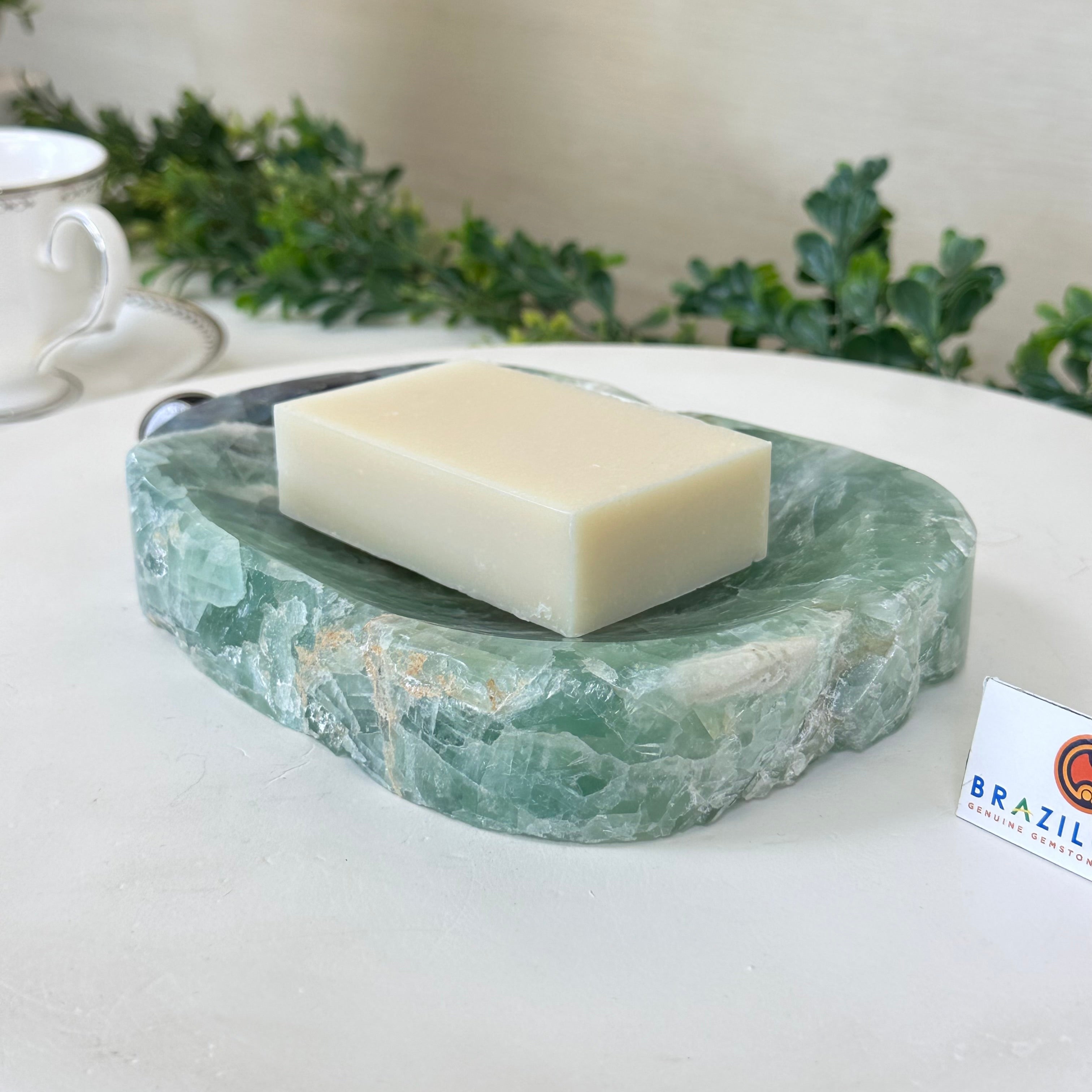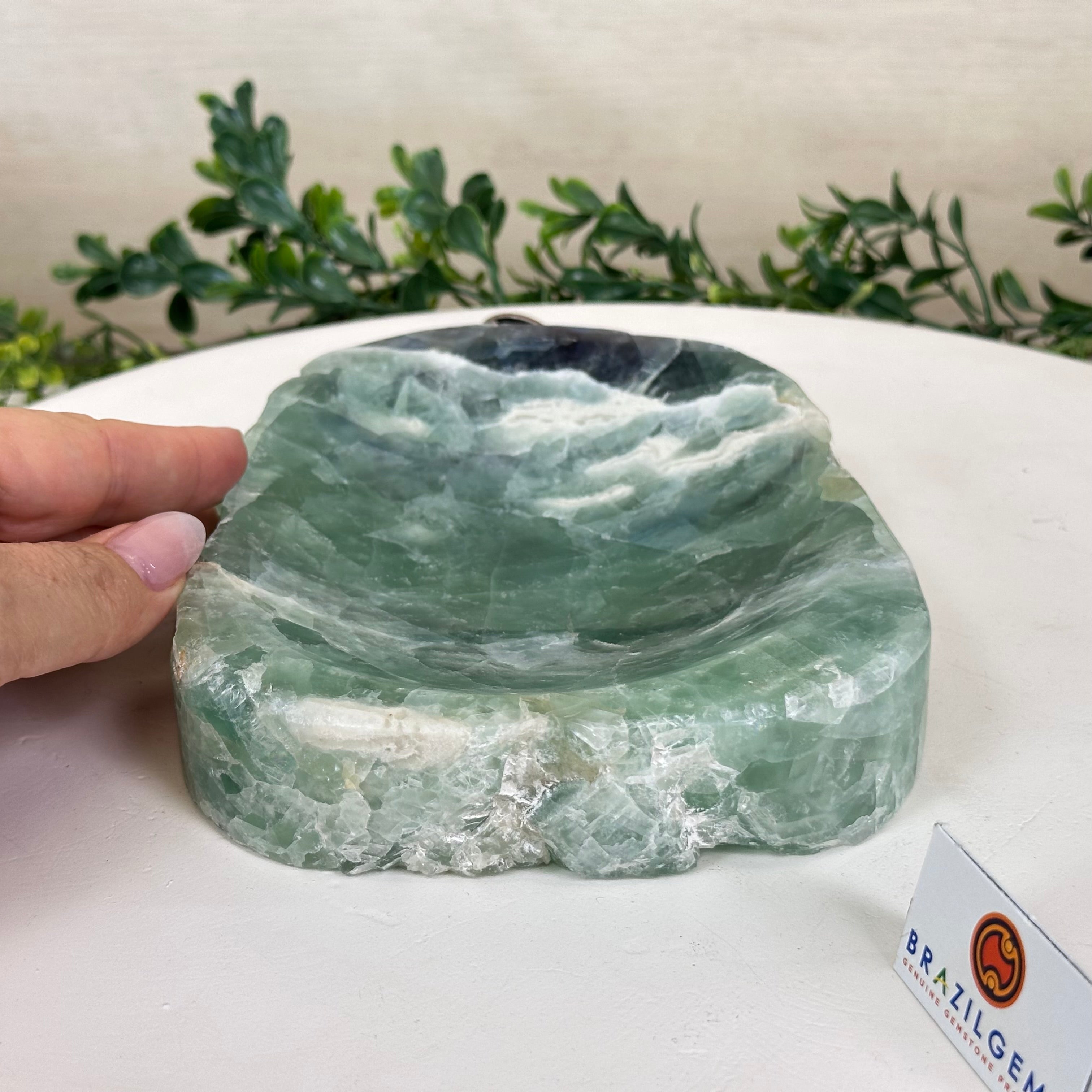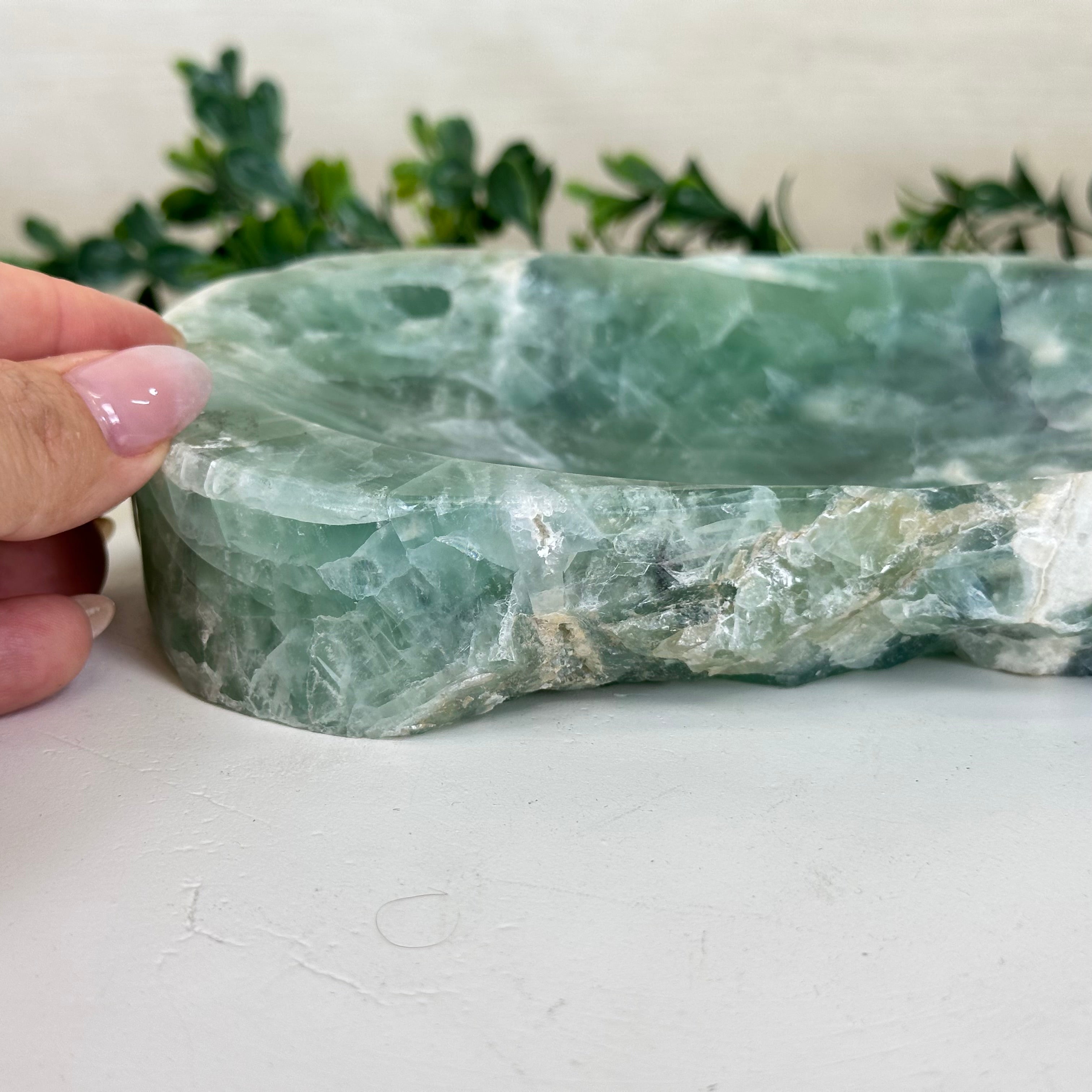 Elegant and versatile, this Fluorite decorative bowl is handcrafted from natural Brazilian stone and polished to reveal bright green tones. Use it as a soap dish, jewelry and ring holder, or a decorative catch-all for small items like crystals, keys, or loose change. Its smooth, durable surface makes it ideal for bathroom countertops, bedside tables, or entryway décor. Its edges are rough and not polished.