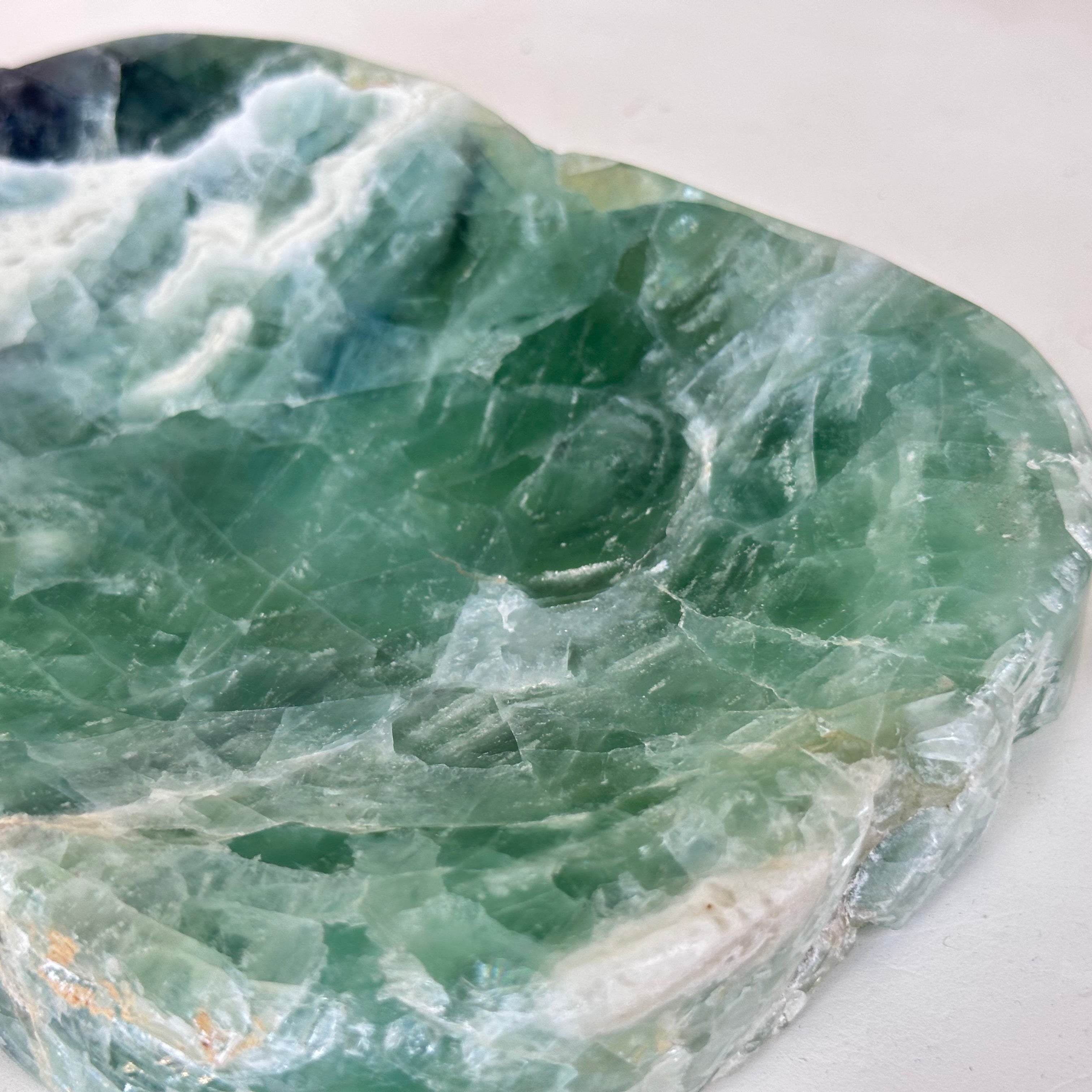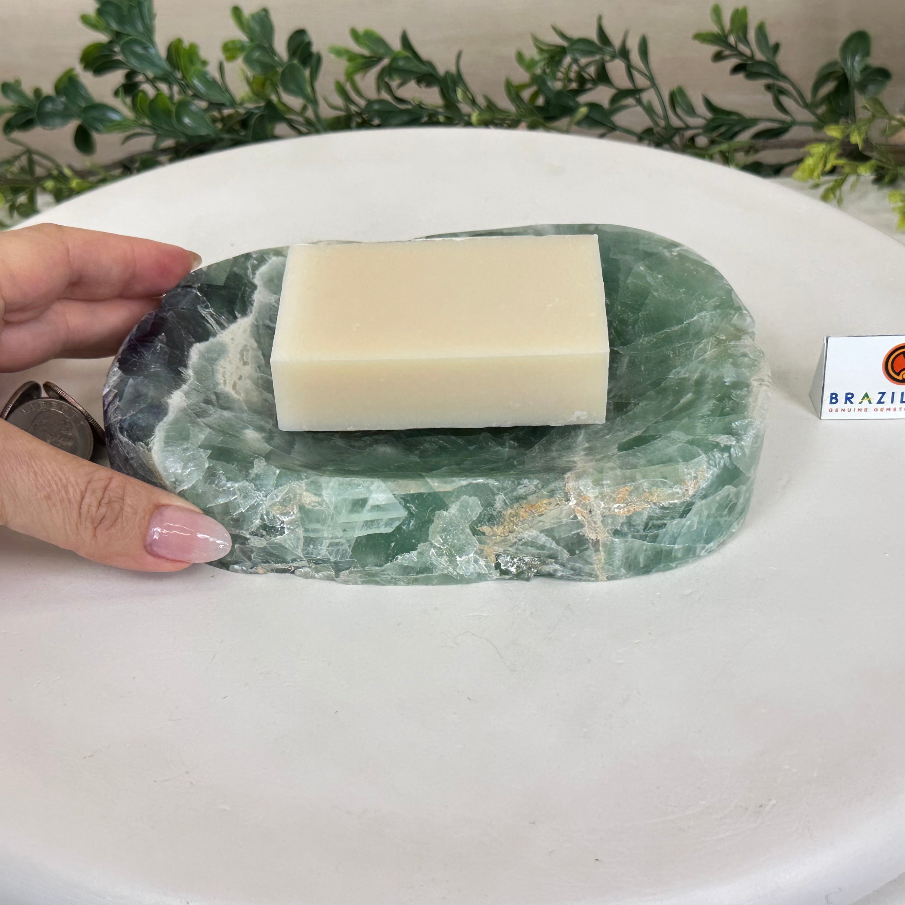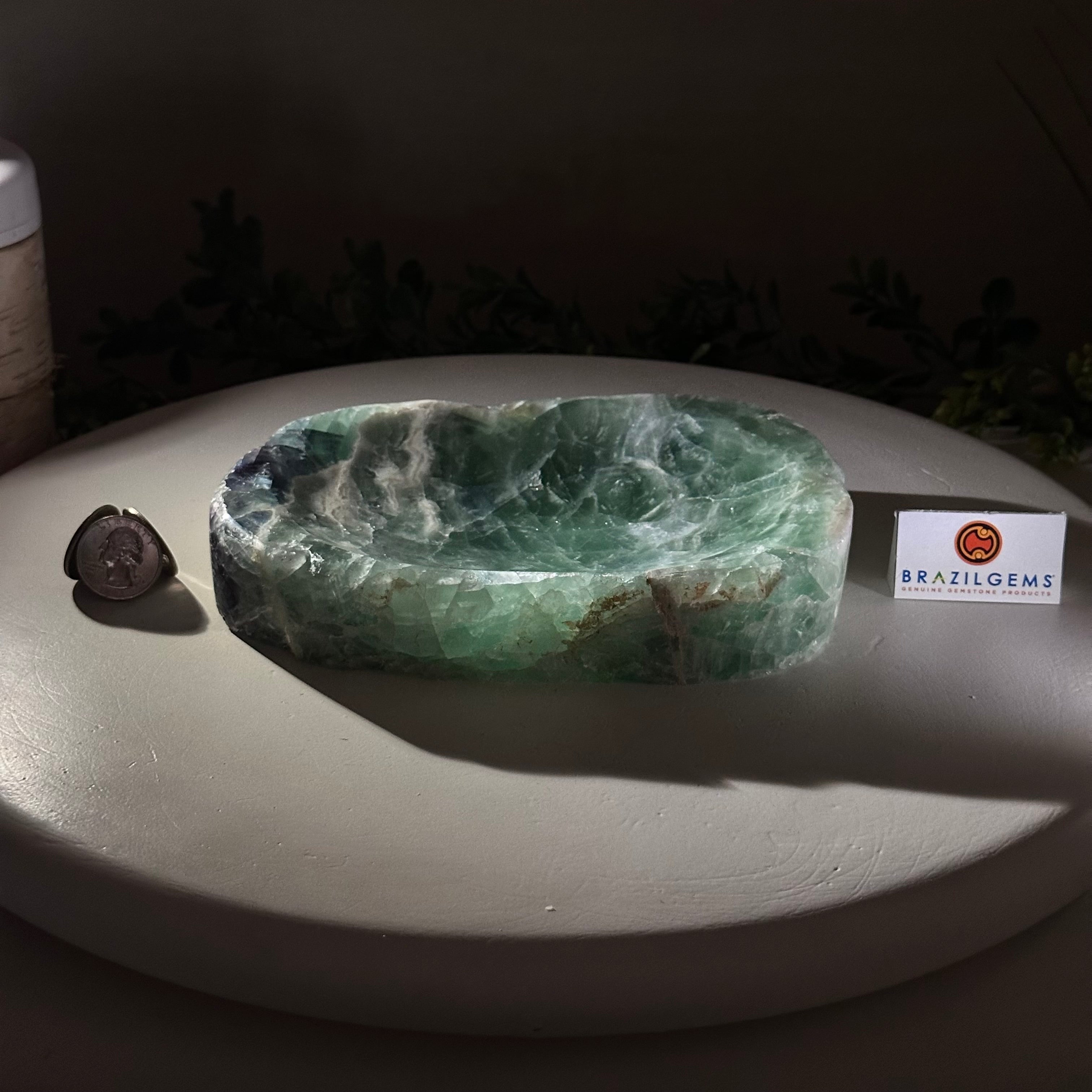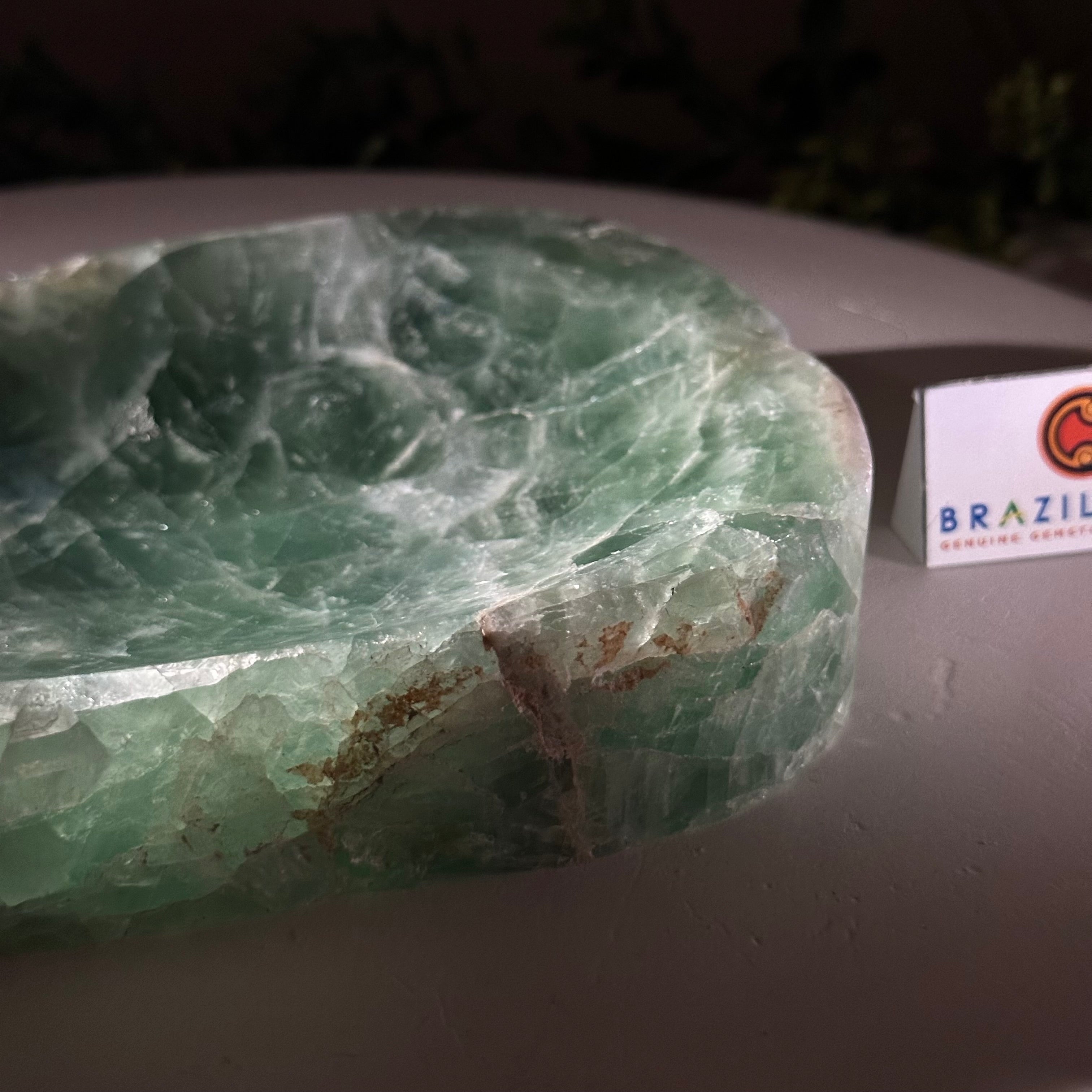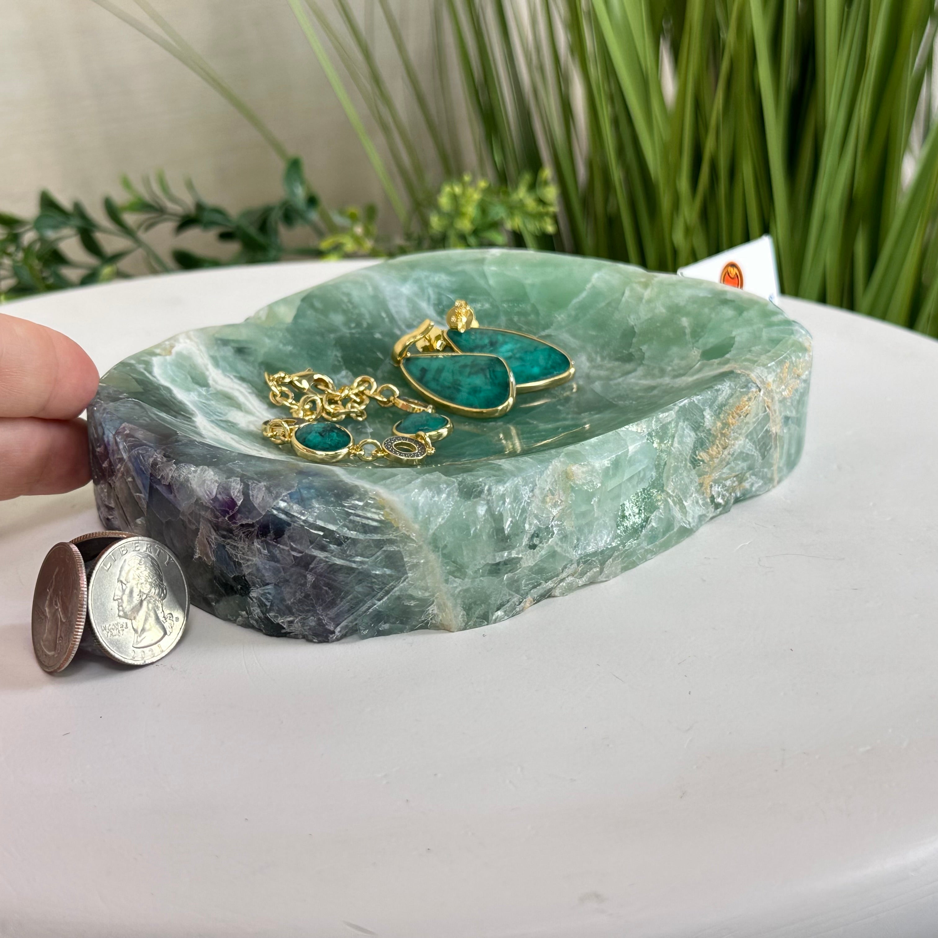 Elegant and versatile, this Fluorite decorative bowl is handcrafted from natural Brazilian stone and polished to reveal bright green tones. Use it as a soap dish, jewelry and ring holder, or a decorative catch-all for small items like crystals, keys, or loose change. Its smooth, durable surface makes it ideal for bathroom countertops, bedside tables, or entryway décor. Its edges are rough and not polished.