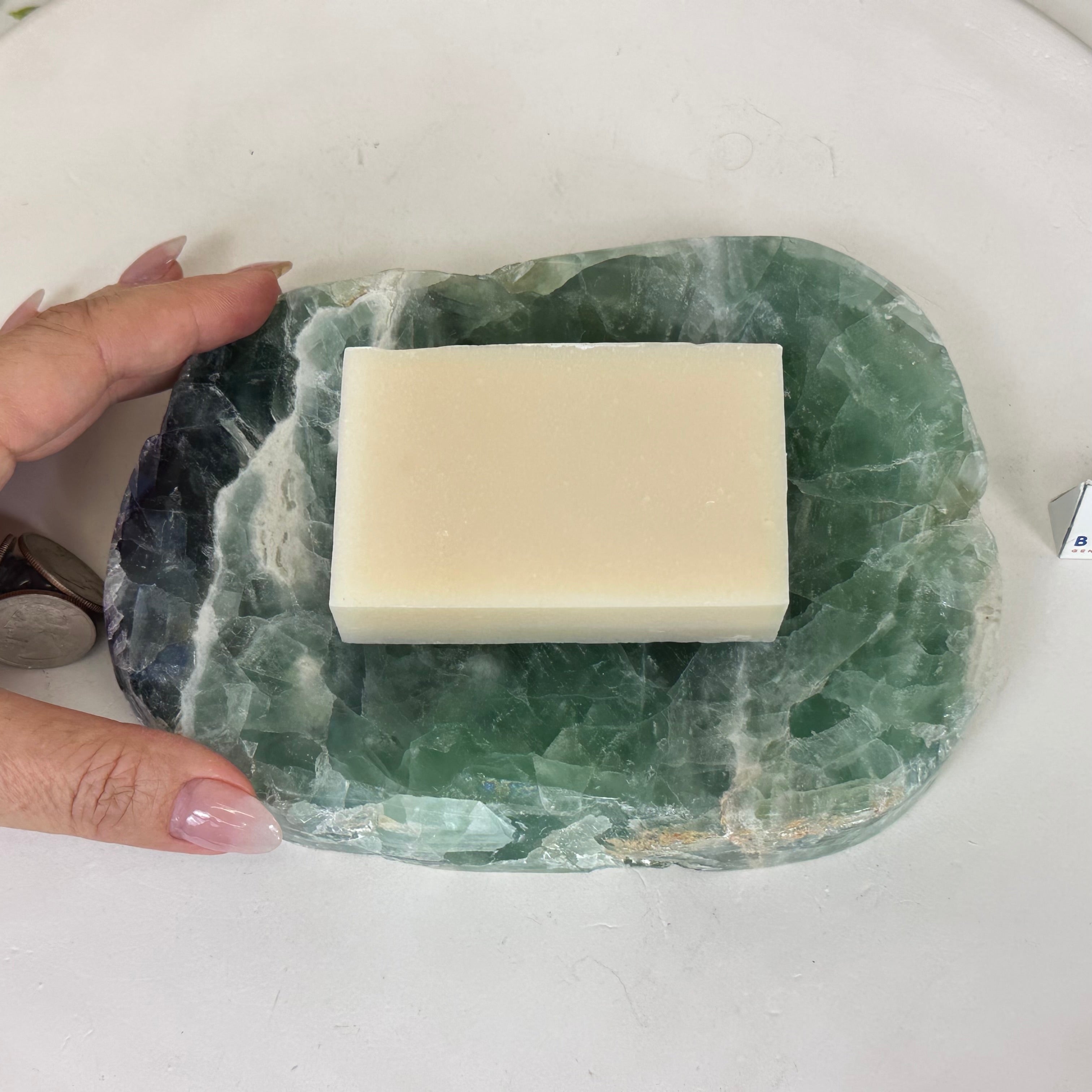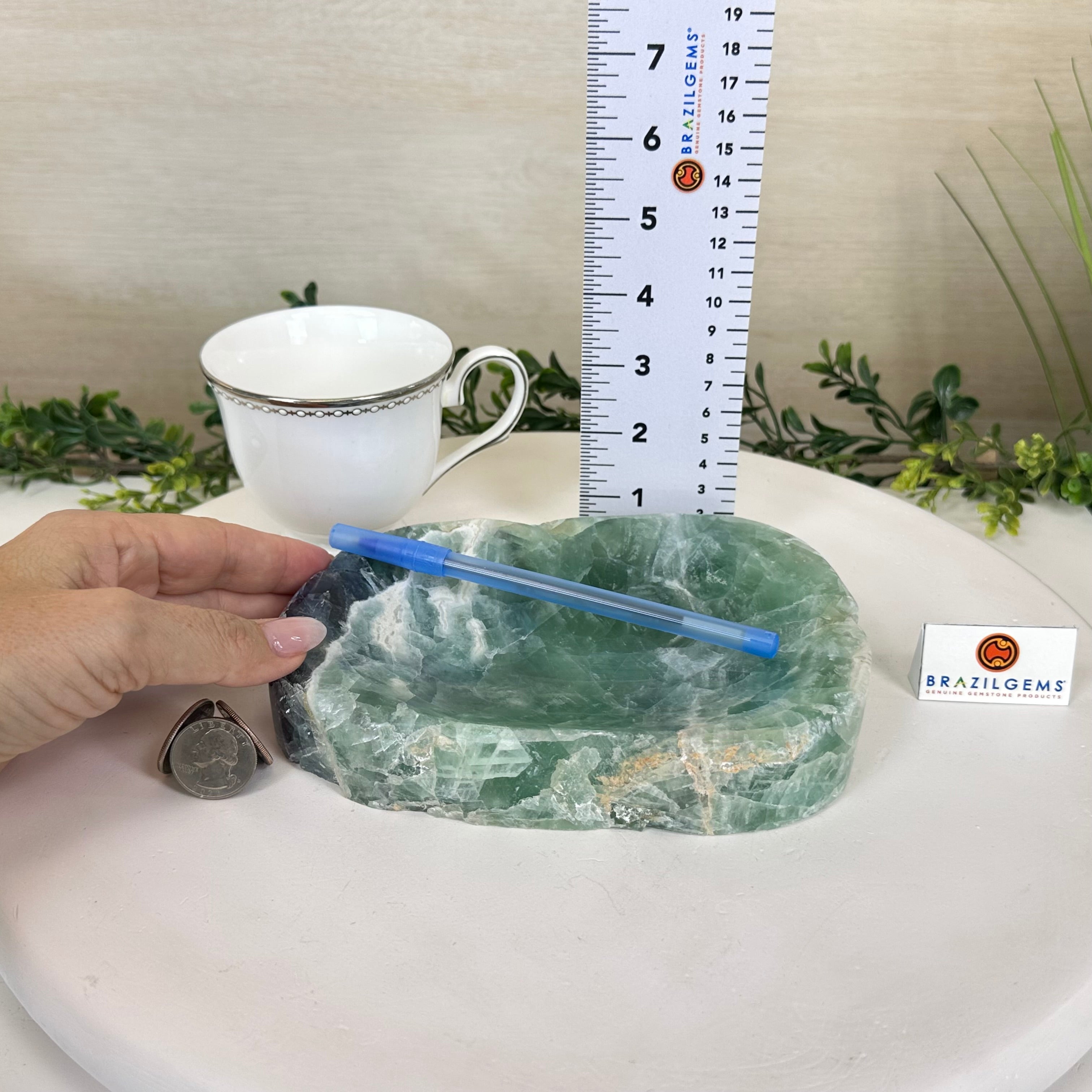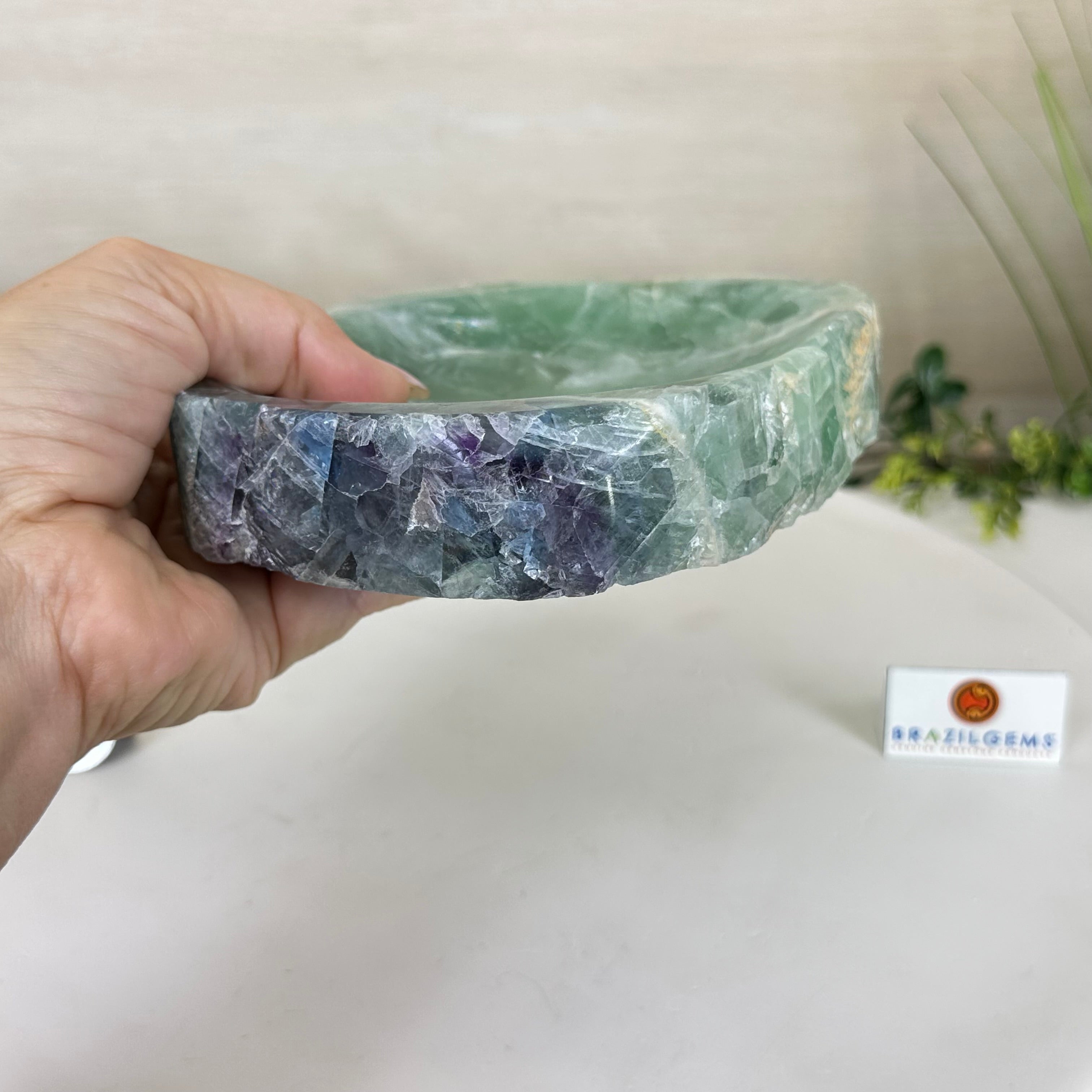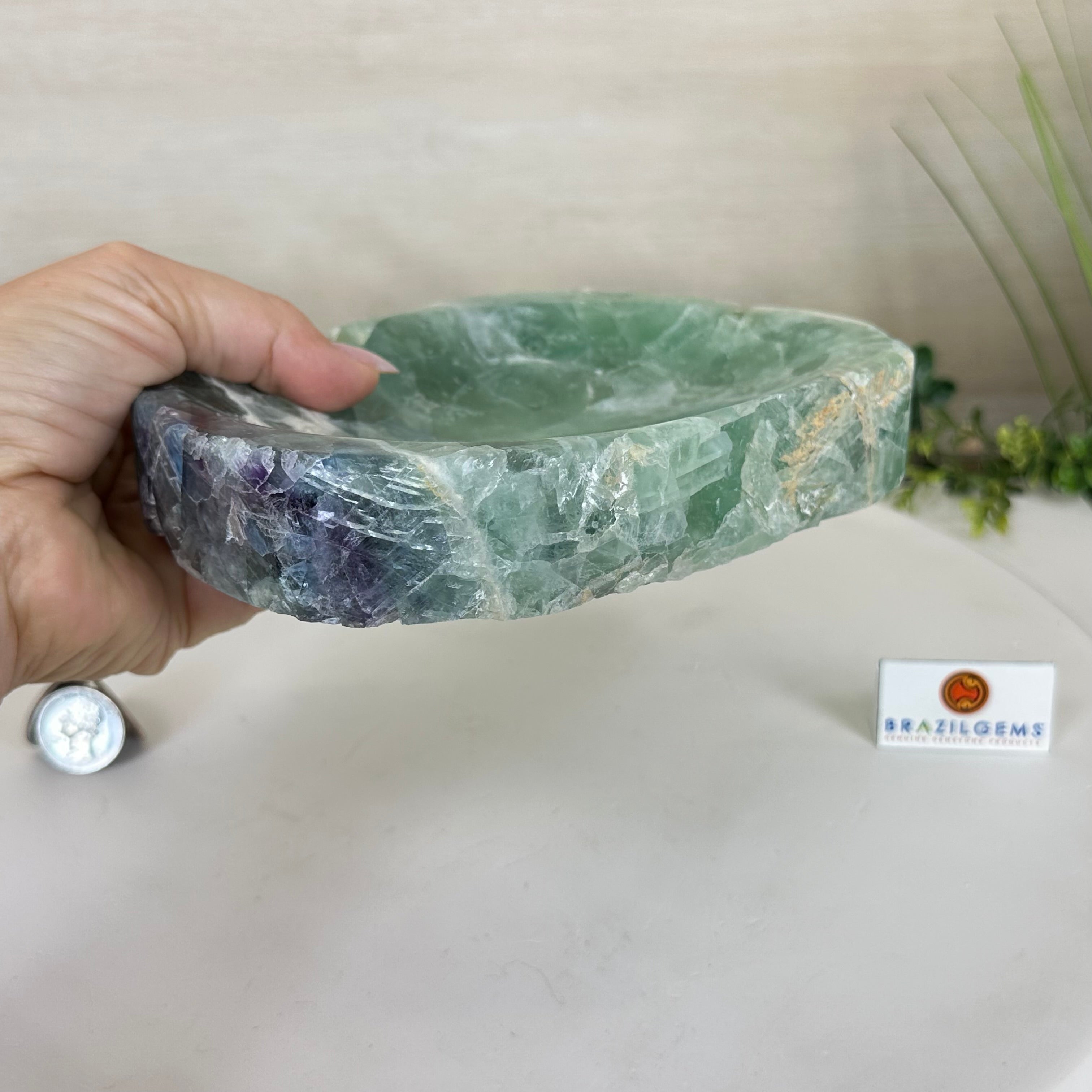 Elegant and versatile, this Fluorite decorative bowl is handcrafted from natural Brazilian stone and polished to reveal bright green tones. Use it as a soap dish, jewelry and ring holder, or a decorative catch-all for small items like crystals, keys, or loose change. Its smooth, durable surface makes it ideal for bathroom countertops, bedside tables, or entryway décor. Its edges are rough and not polished.