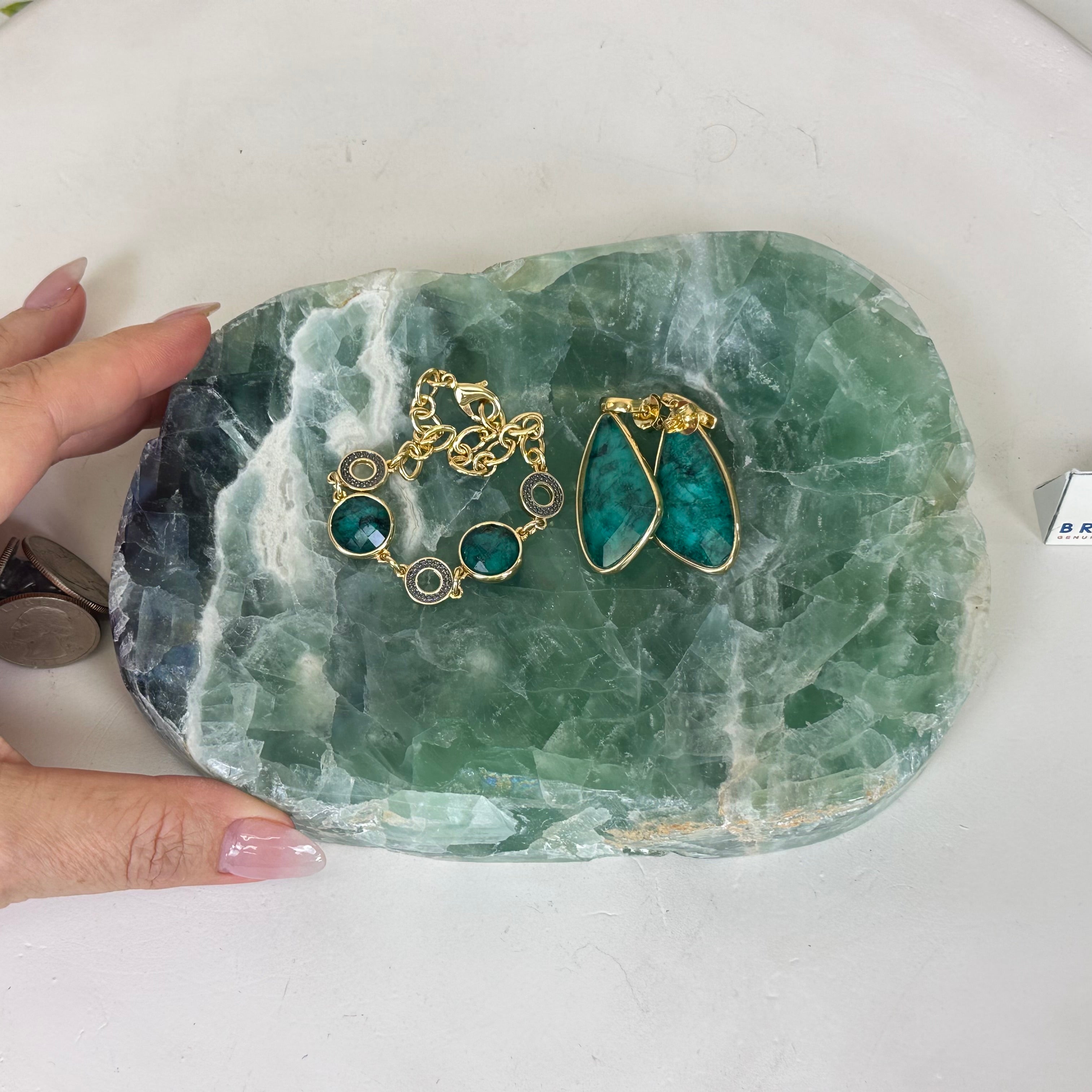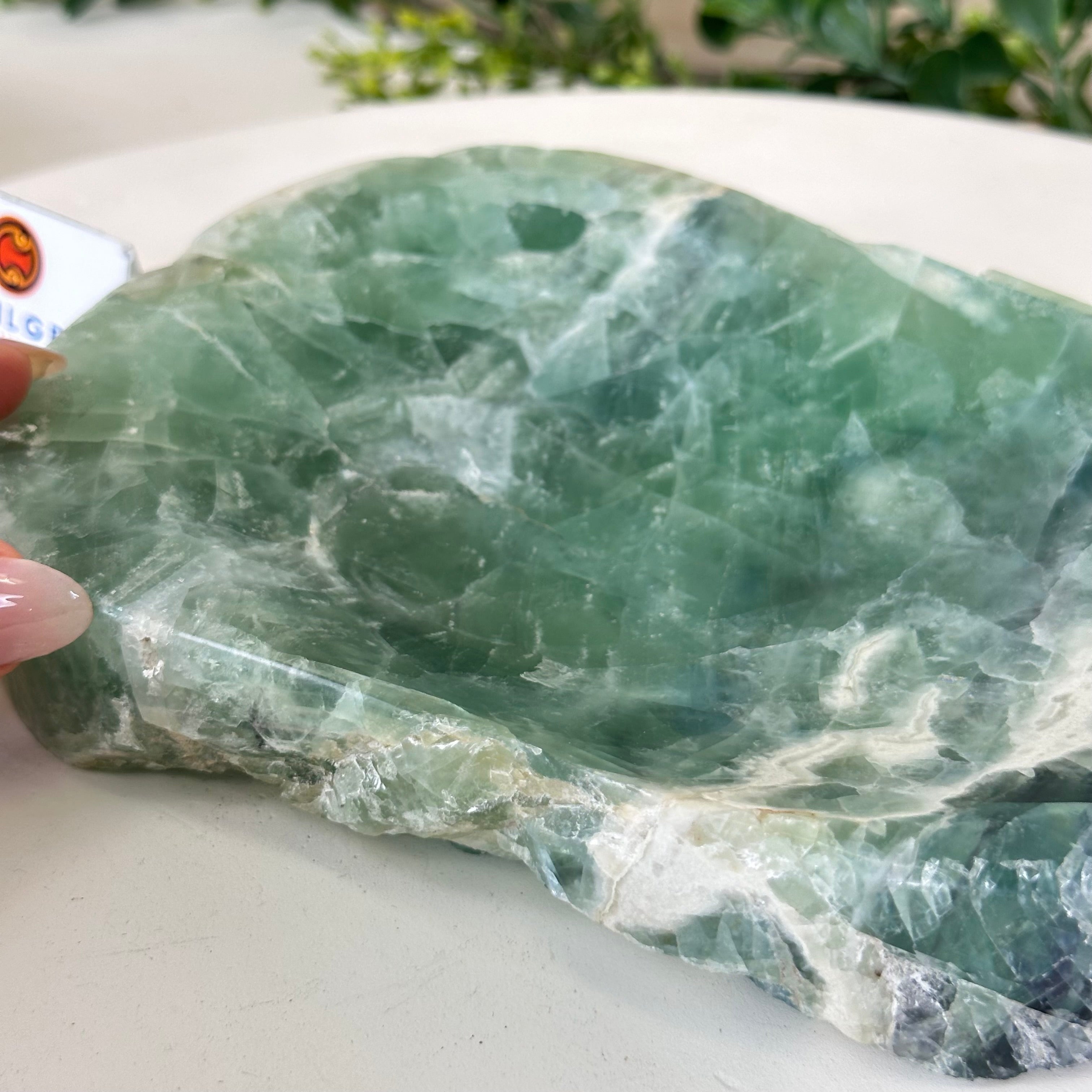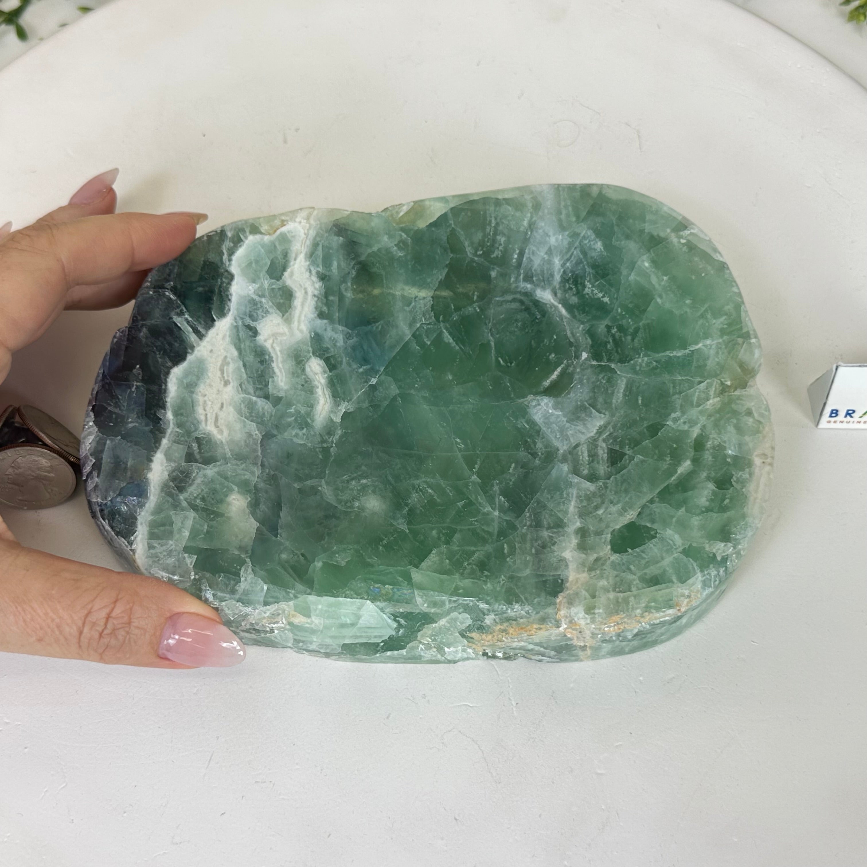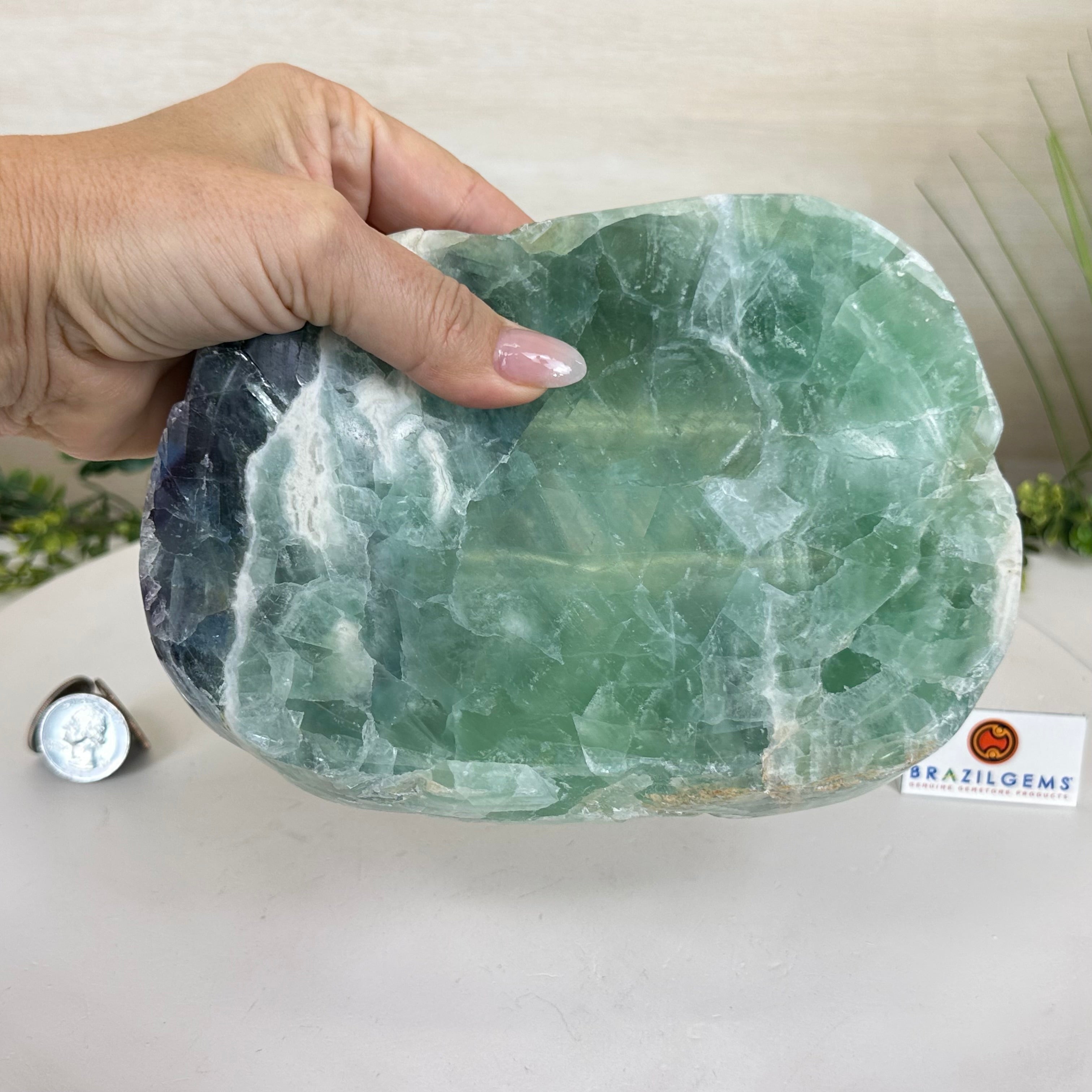 Elegant and versatile, this Fluorite decorative bowl is handcrafted from natural Brazilian stone and polished to reveal bright green tones. Use it as a soap dish, jewelry and ring holder, or a decorative catch-all for small items like crystals, keys, or loose change. Its smooth, durable surface makes it ideal for bathroom countertops, bedside tables, or entryway décor. Its edges are rough and not polished.
