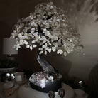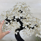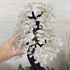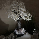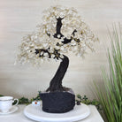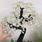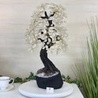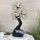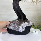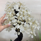 Nature and Artistry combine to create this Large Handmade Gemstone Tree with Clear Quartz Gemstones as leaves. Set atop a large Amethyst cluster base, it has a masterfully detailed trunk and branches crafted from resin in a bonsai tree style and 108 wired branches supporting 540 tumbled gemstones.