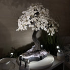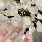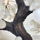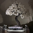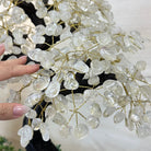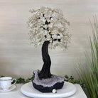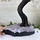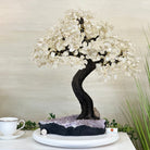 Nature and Artistry combine to create this Large Handmade Gemstone Tree with Clear Quartz Gemstones as leaves. Set atop a large Amethyst cluster base, it has a masterfully detailed trunk and branches crafted from resin in a bonsai tree style and 108 wired branches supporting 540 tumbled gemstones.