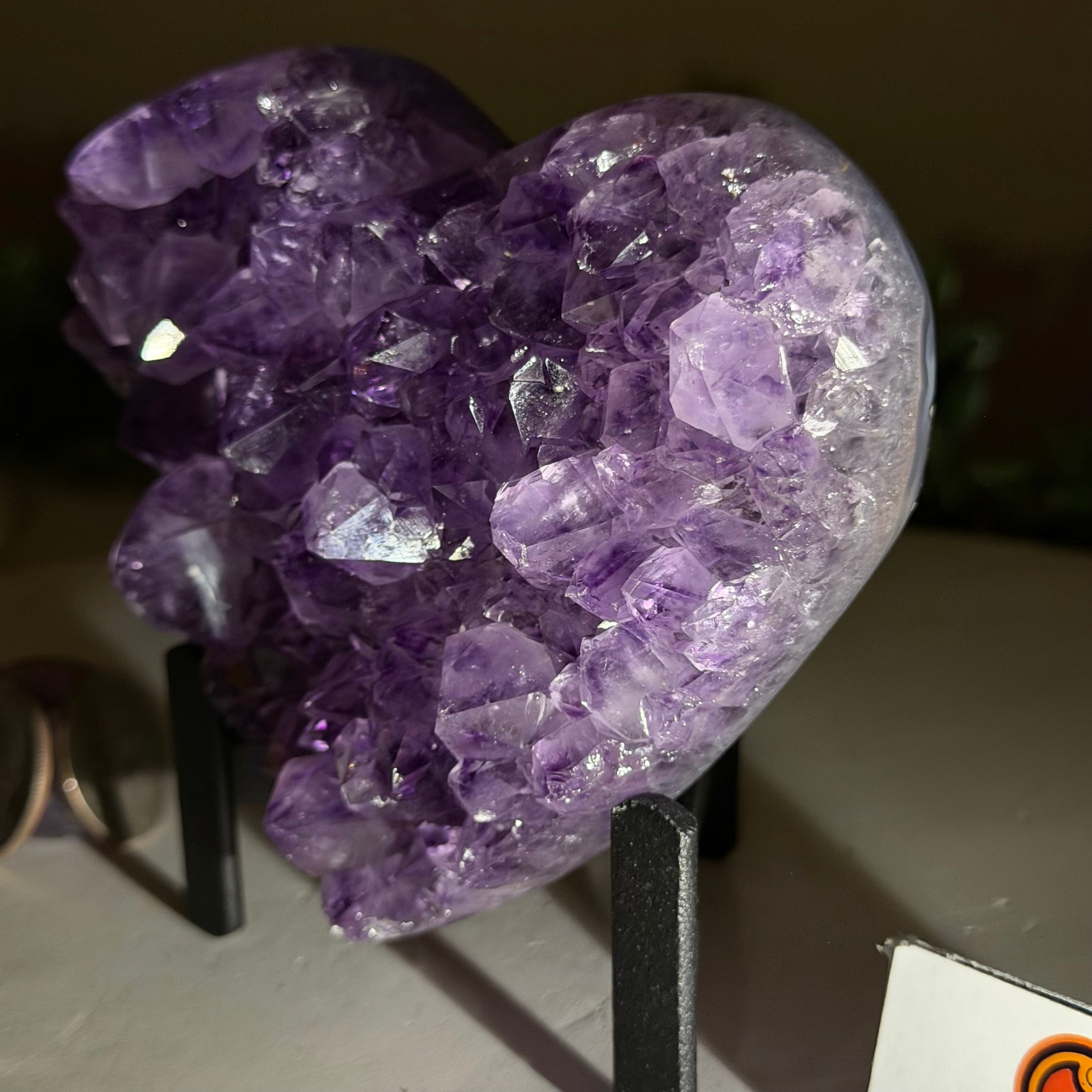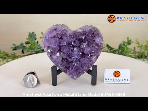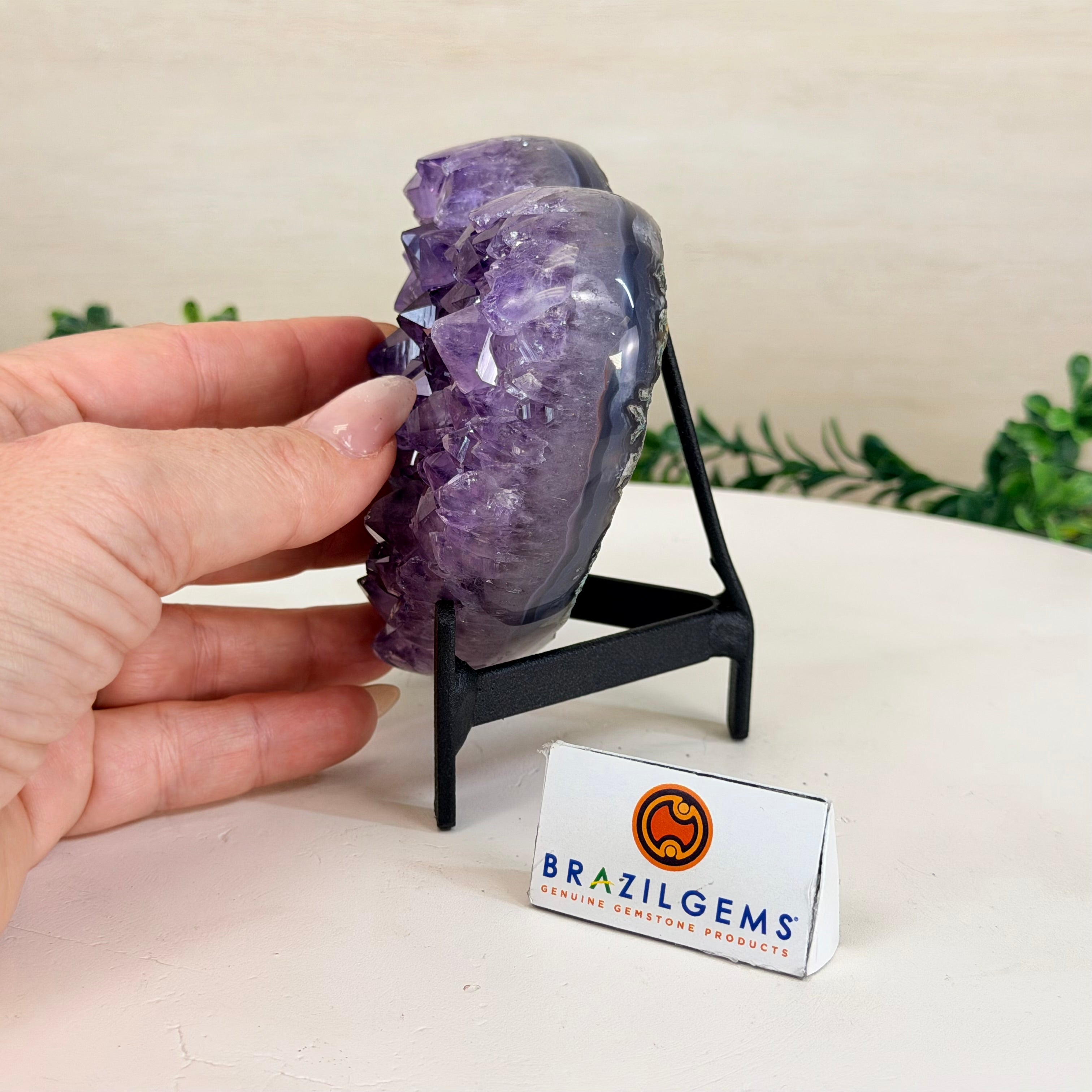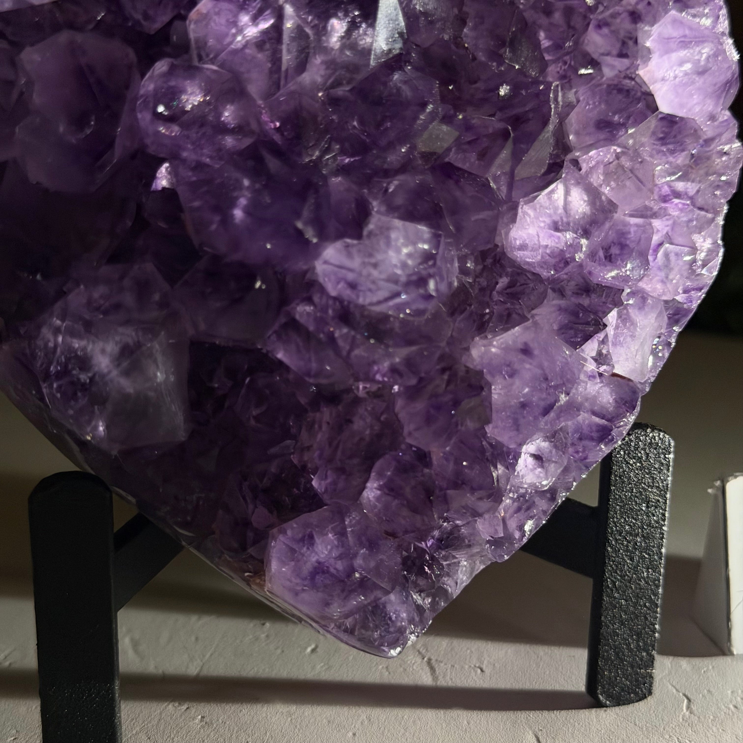 Experience the captivating beauty of this Extra Quality Heart-Shaped Amethyst Geode by Brazil Gems®. Elegantly displayed on a sleek black metal stand, this stunning gemstone showcases polished edges that highlight its vibrant violet hues, while the natural rough stone on the backside adds a touch of raw authenticity. Each crystal point sparkles with the unique, untouched beauty crafted by Mother Nature herself.
