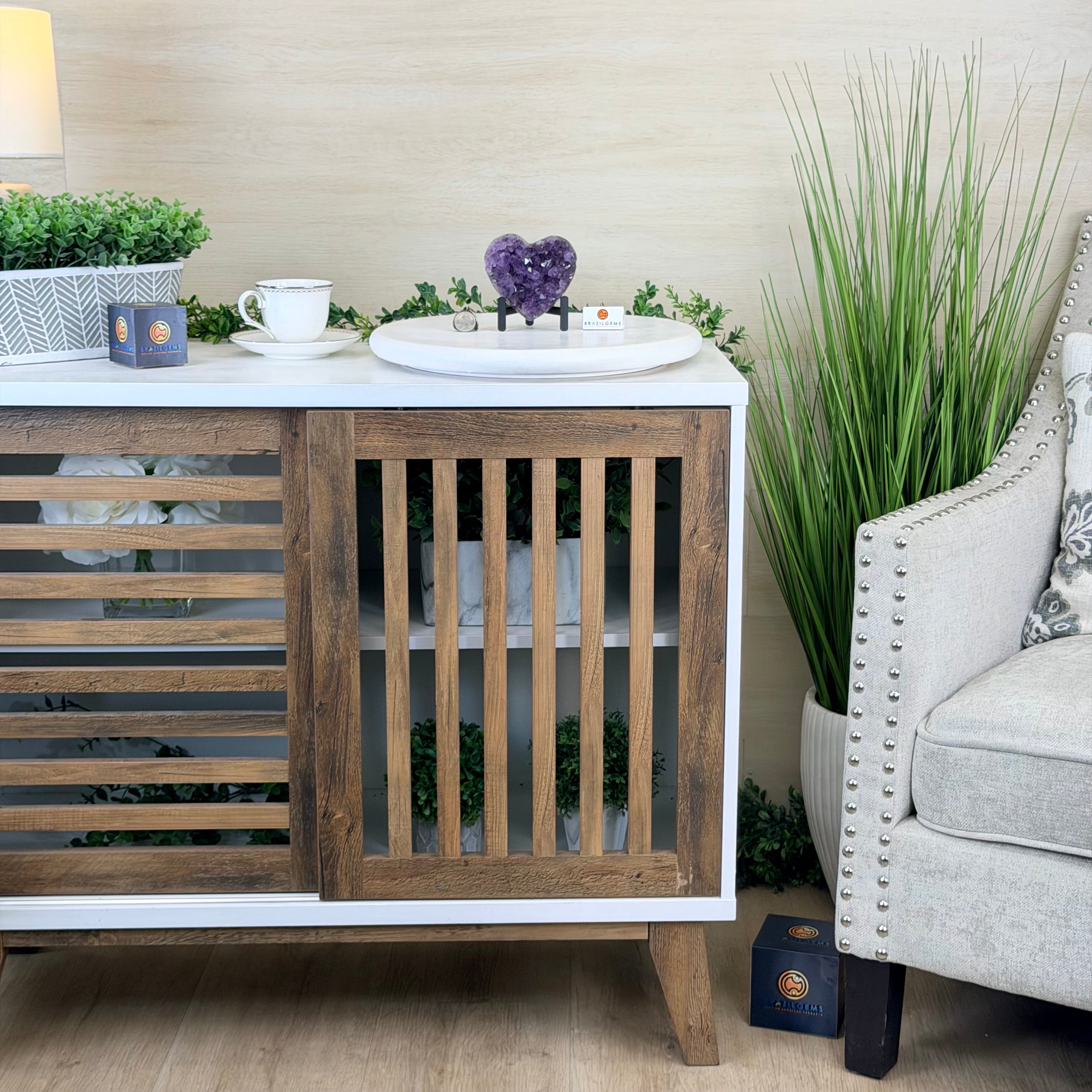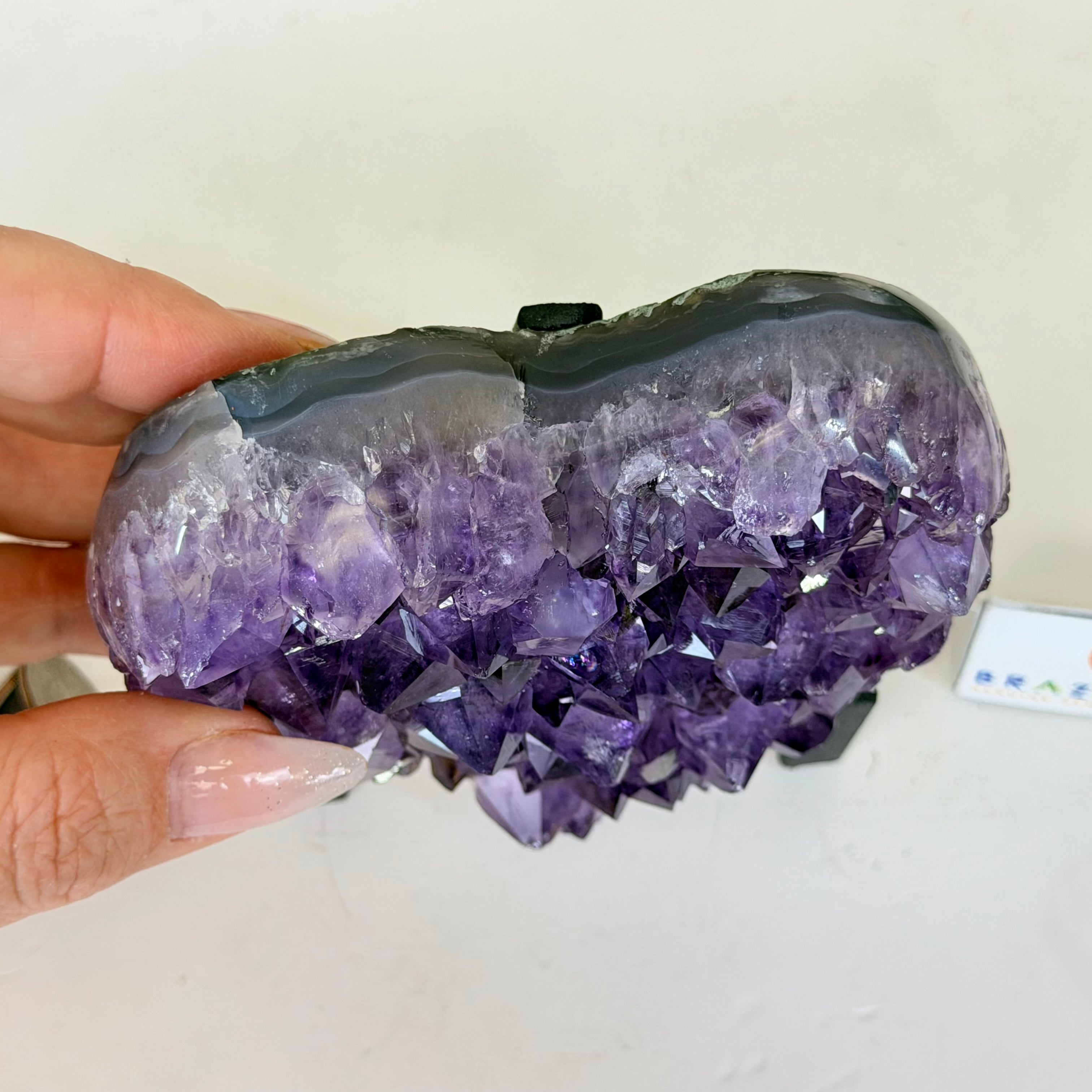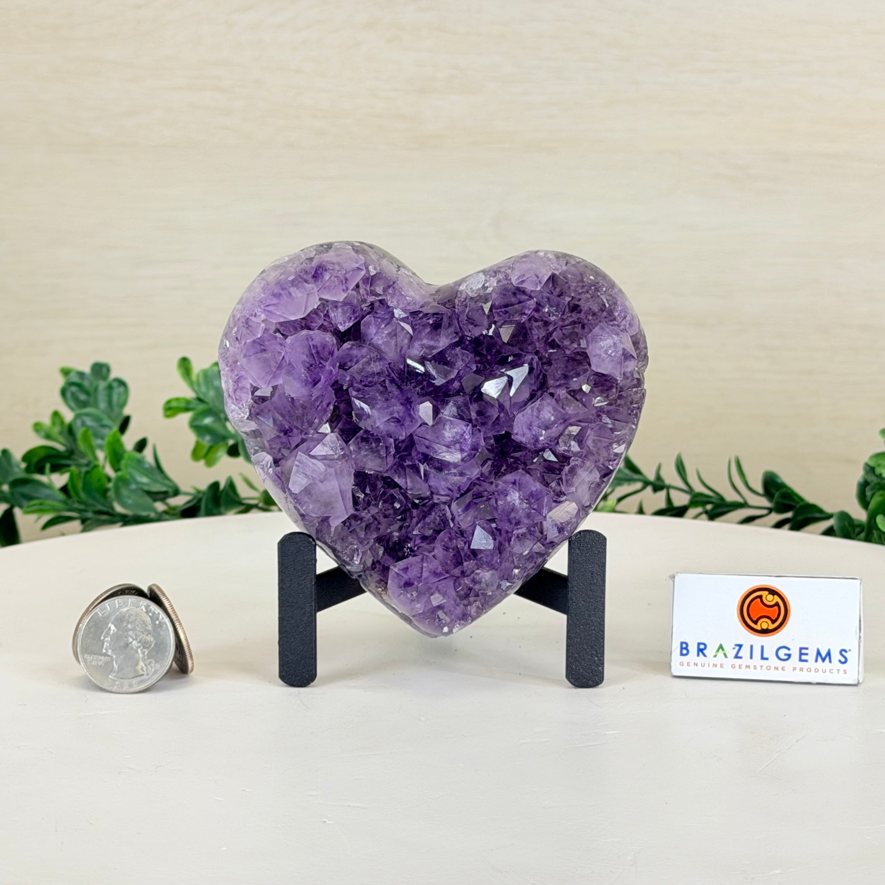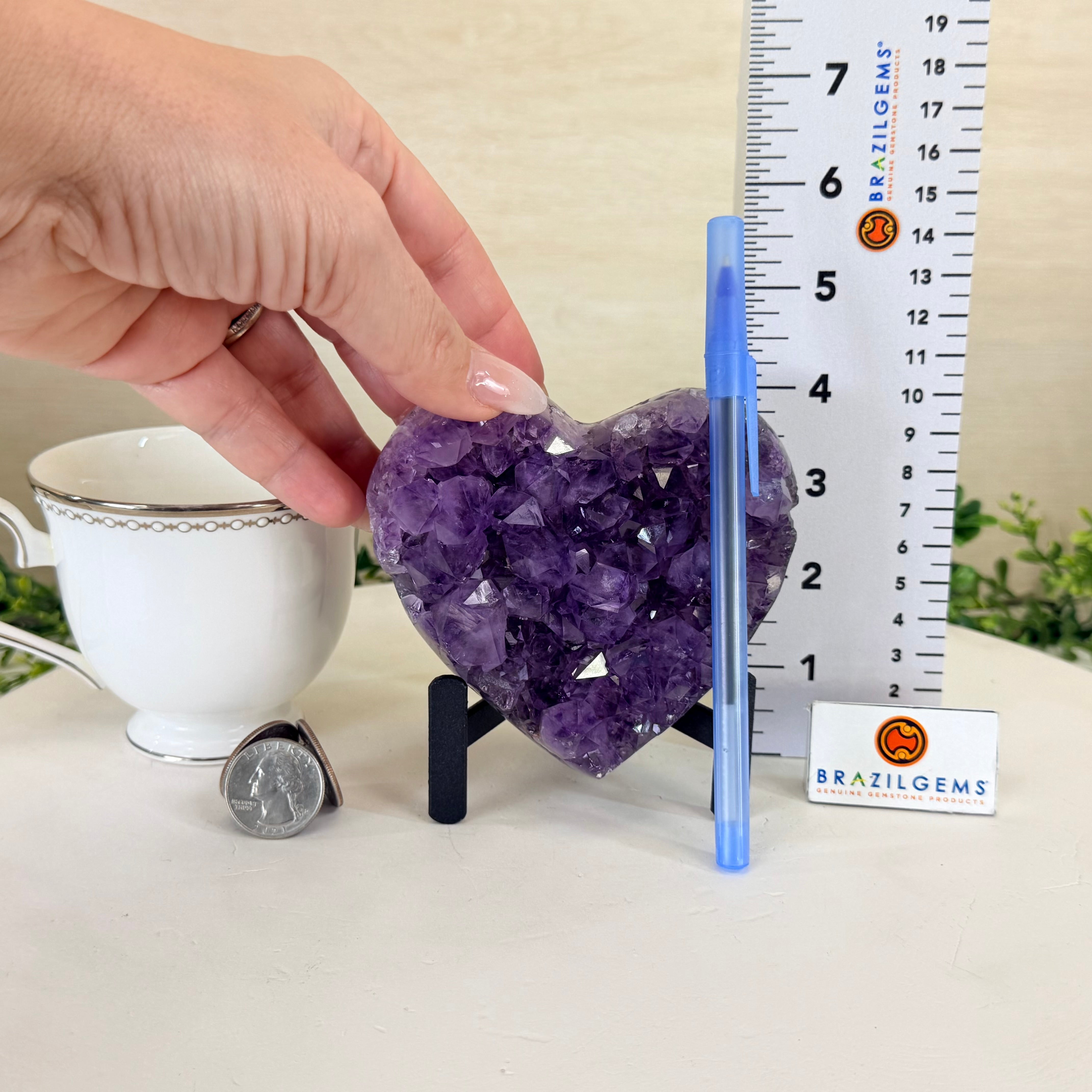Experience the captivating beauty of this Extra Quality Heart-Shaped Amethyst Geode by Brazil Gems®. Elegantly displayed on a sleek black metal stand, this stunning gemstone showcases polished edges that highlight its vibrant violet hues, while the natural rough stone on the backside adds a touch of raw authenticity. Each crystal point sparkles with the unique, untouched beauty crafted by Mother Nature herself.