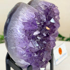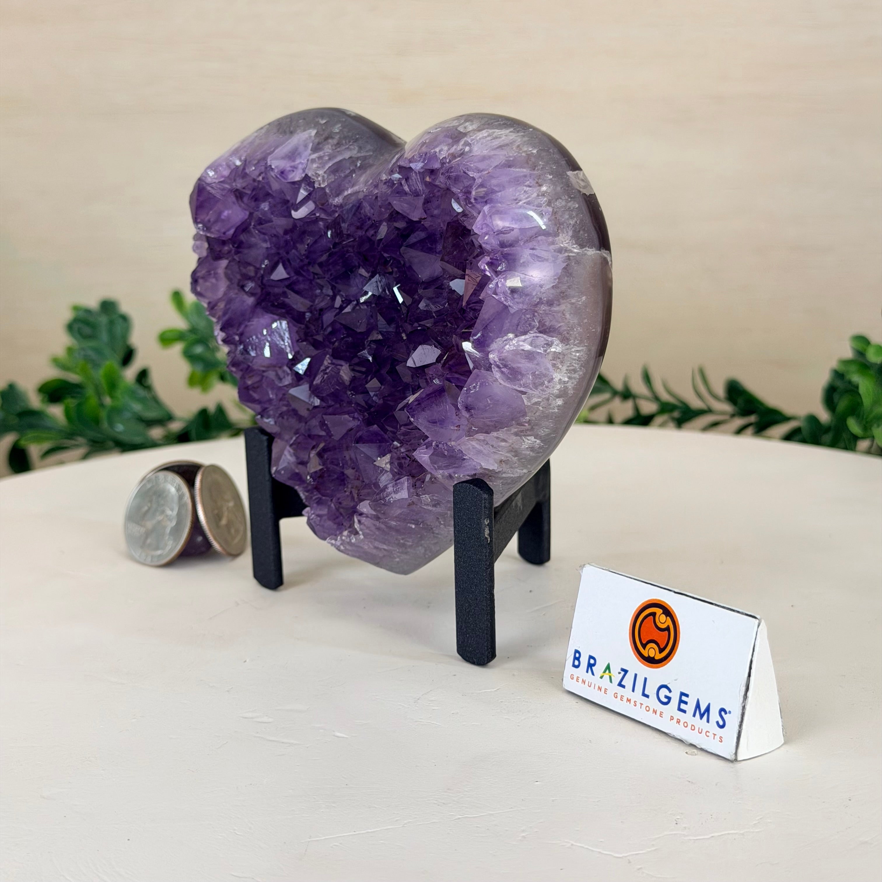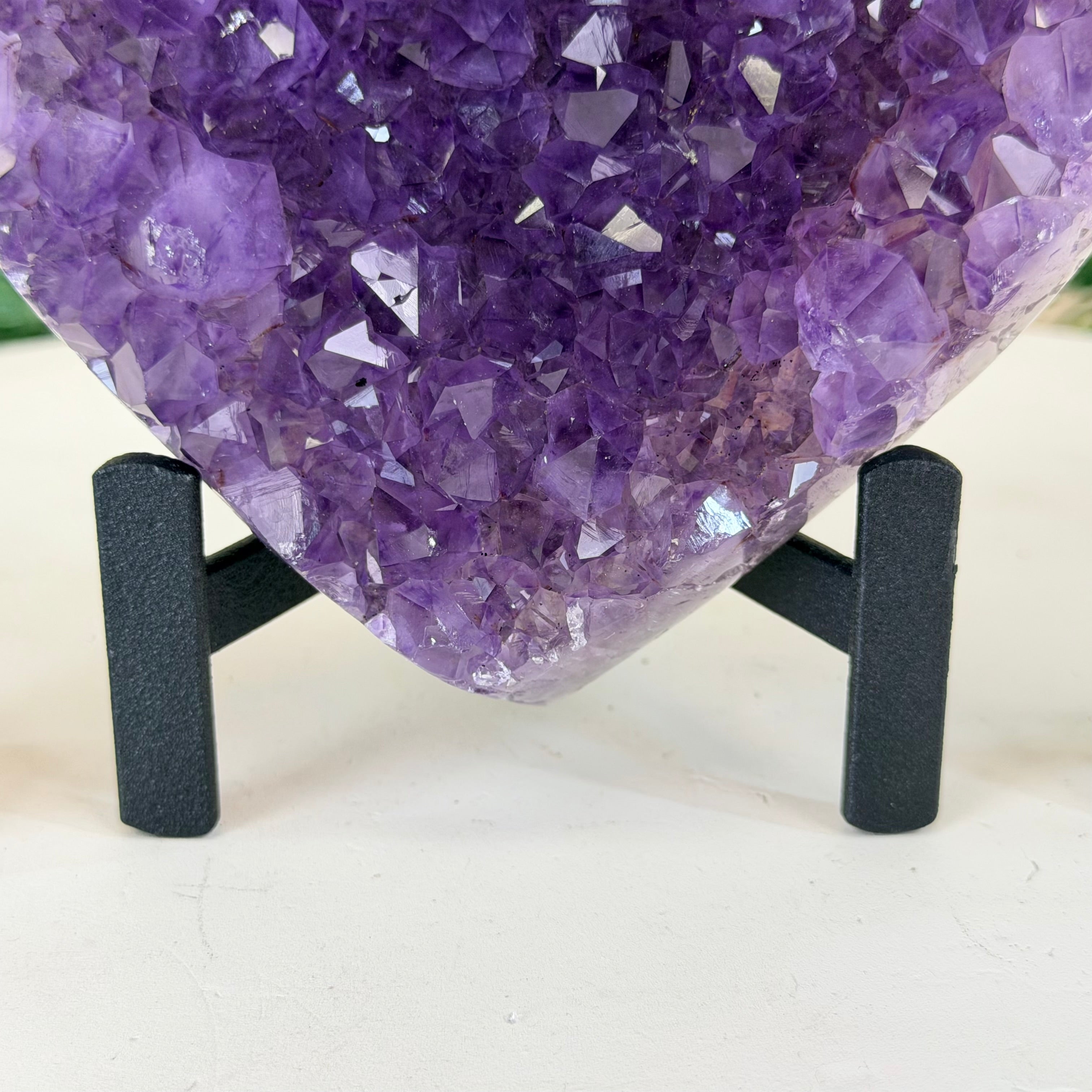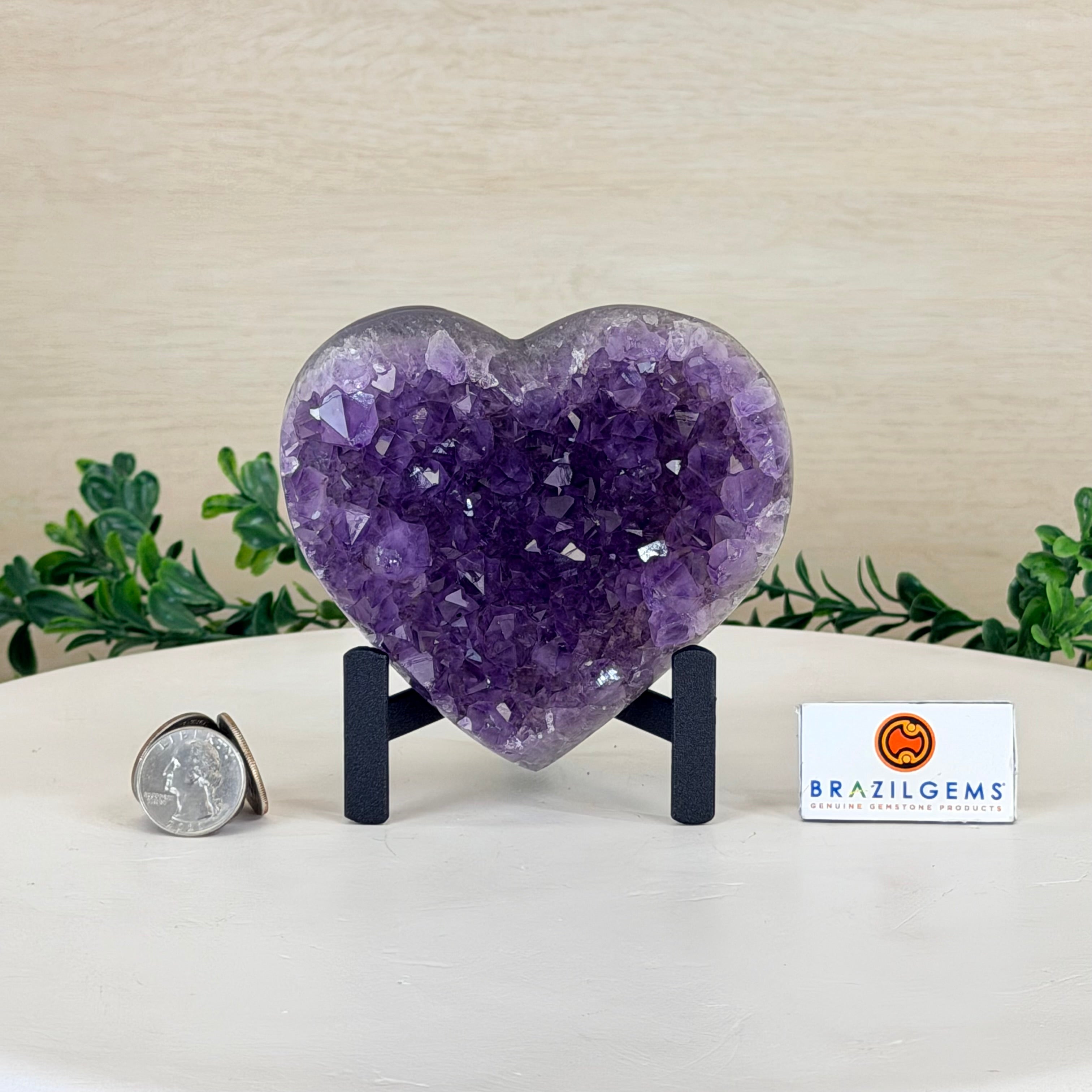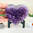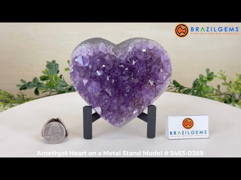 Experience the captivating beauty of this Extra Quality Heart-Shaped Amethyst Geode by Brazil Gems®. Elegantly displayed on a sleek black metal stand, this stunning gemstone showcases polished edges that highlight its vibrant violet hues, while the natural rough stone on the backside adds a touch of raw authenticity. Each crystal point sparkles with the unique, untouched beauty crafted by Mother Nature herself.