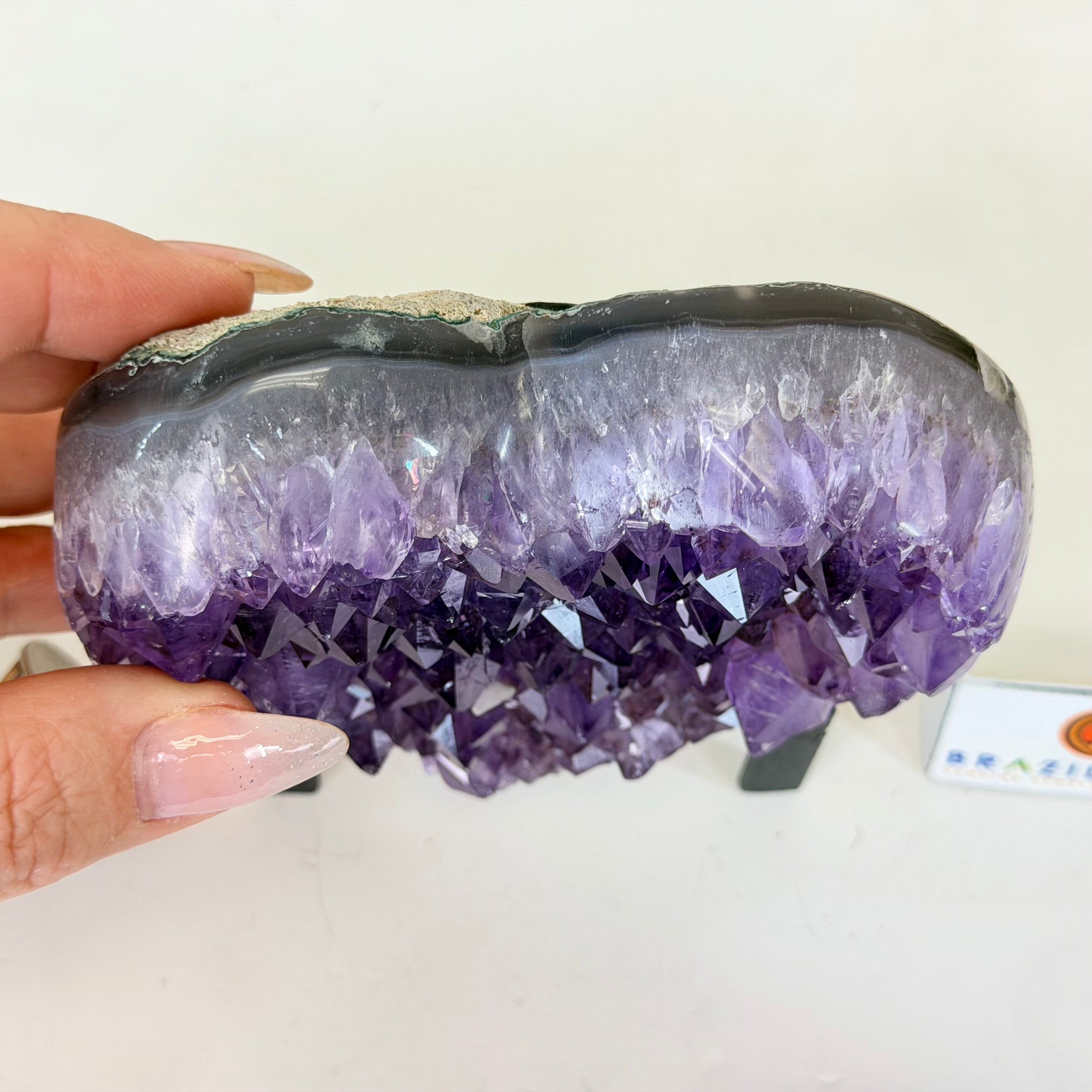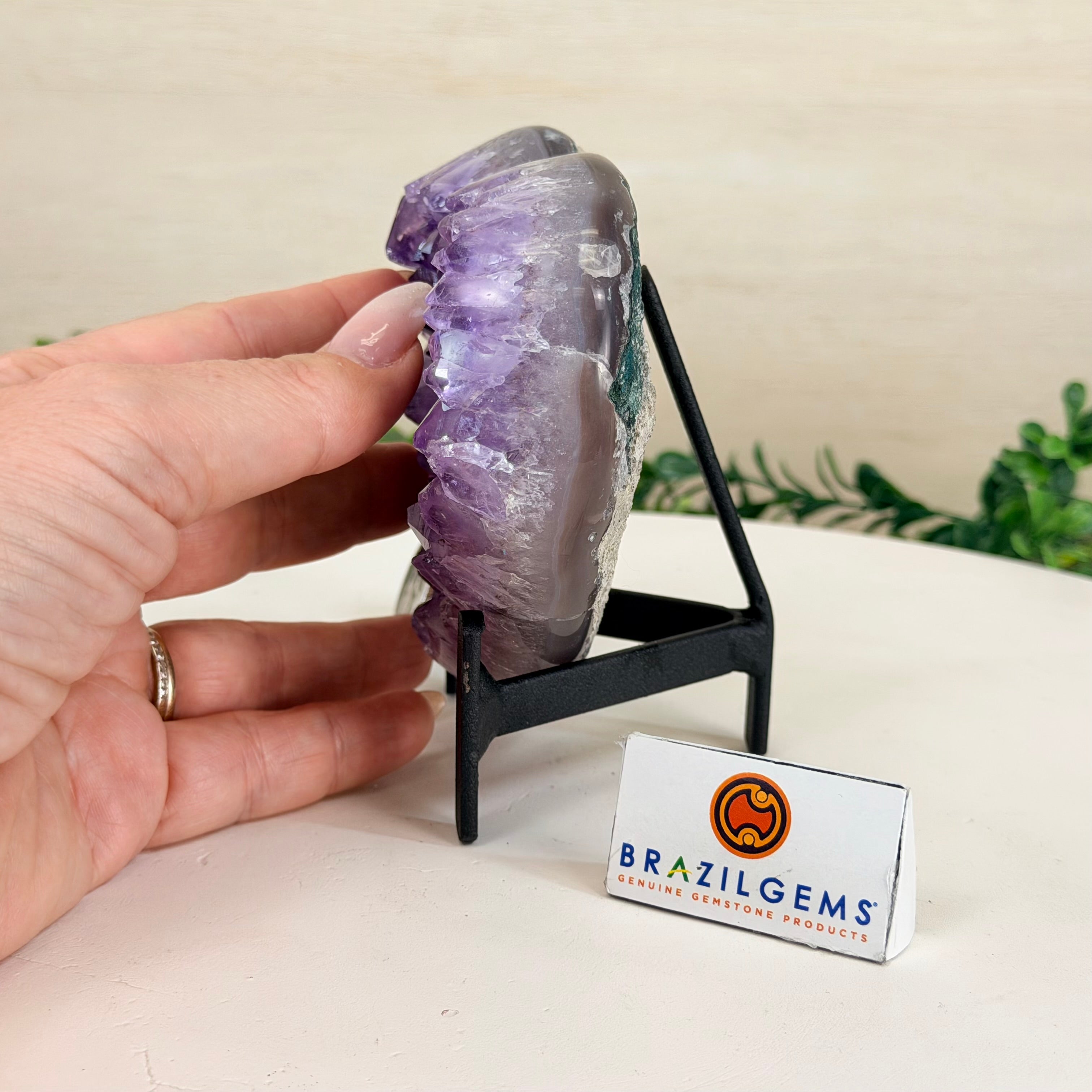 Disclaimer: This is a natural gemstone crystal sold by Brazil Gems® as is and as you see it in its images and video. It is the exact one you will receive. It may contain natural imperfections as well as imperfections, broken edges and repairs from the extraction, polishing, prepping and mounting processes. The metal stand is custom made to fit this gemstone and painted black. At Brazil Gems® we make every effort to get measurements as exact as possible but they are done by human hands and eyes and therefore may have minor discrepancies.