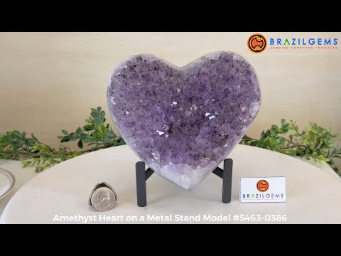 Experience the captivating beauty of this Extra Plus Quality Heart-Shaped Amethyst Geode by Brazil Gems®. Elegantly displayed on a sleek black metal stand, this stunning gemstone showcases polished edges that highlight its vibrant violet hues, while the natural rough stone on the backside adds a touch of raw authenticity. Each crystal point sparkles with the unique, untouched beauty crafted by Mother Nature herself.
