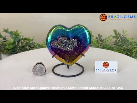 Add a touch of enchantment to your crystal collection with Brazil Gems® Rainbow Aura Quartz Heart on a black metal stand. This captivating piece features polished edges and drusy crystals that glisten with an iridescent rainbow aura effect.