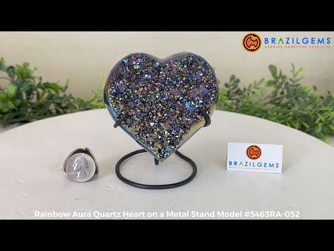 Add a touch of enchantment to your crystal collection with Brazil Gems® Rainbow Aura Quartz Heart on a black metal stand. This captivating piece features polished edges and drusy crystals that glisten with an iridescent rainbow aura effect.