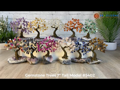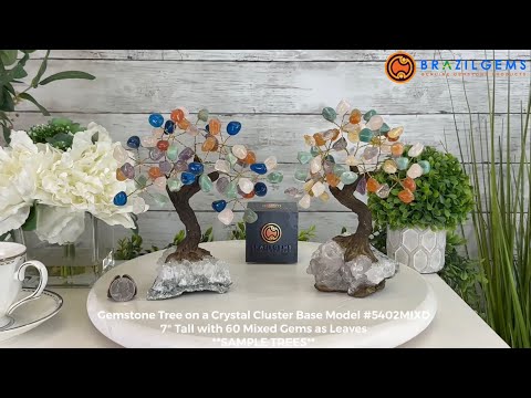 **STOCK IMAGES** Please Note: The images you see are NOT of the exact tree you will receive. The images are of actual trees we had in stock at one time and were selected to serve as the models. Since these products are handmade from natural stone, each one will be unique especially their crystal cluster bases which can vary in size, shape and color (from white to purple) . The gemstones that are the "leaves" for the "Mixed Gems Tree" can vary in color with their mix of gems. Feel free to reach out to ask which mix of gemstones as leaves (as seen in the sample images) is available and we will do our best to accommodate.