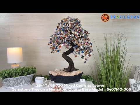 Disclaimer: This is a genuine gemstone handmade item sold by Brazil Gems® as is and as you see it in its images and video. It is the exact tree you will receive. The base may contain natural imperfections as well as imperfections, repairs and broken edges from the extraction, polishing, and prepping processes and the branches and leaf gemstones may contain imperfections as well. To allow for it to stand on its own the cluster base may have a small amount of cement added to the bottom then painted black. At Brazil Gems® we make every effort to get measurements as exact as possible but they are done by human hands and eyes and therefore may have minor discrepancies. Mixed Gems trees in this size may include (and usually do) the following gemstones: Amethyst, Carnelian, Citrine, Clear Quartz, Green Quartz, Rose Quartz, Blue Quartz, Hematite, Dyed Pink Agate, Dyed Purple Agate, Dyed Blue Agate, Red Jasper, Yellow Jasper, Zebra Jasper, Sodalite and Tiger's Eye. Other gemstones maybe included as well.
