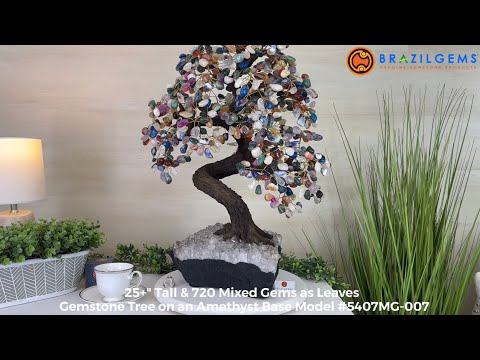 Disclaimer: This is a genuine gemstone handmade item sold by Brazil Gems® as is and as you see it in its images and video. It is the exact tree you will receive. The base may contain natural imperfections as well as imperfections, repairs and broken edges from the extraction, polishing, and prepping processes and the branches and leaf gemstones may contain imperfections as well. To allow for it to stand on its own the amethyst cluster base may have a small amount of cement added to the bottom then painted black. At Brazil Gems® we make every effort to get measurements as exact as possible but they are done by human hands and eyes and therefore may have minor discrepancies. Mixed Gems trees in this size may include (and usually do) the following gemstones: Amethyst, Carnelian, Citrine, Clear Quartz, Green Quartz, Rose Quartz, Blue Quartz, Hematite, Dyed Pink Agate, Dyed Purple Agate, Dyed Blue Agate, Red Jasper, Yellow Jasper, Zebra Jasper, Sodalite and Tiger's Eye. Other gemstones maybe included as well.