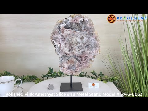 Enhance your room's decor with this beautiful Polished Pink Amethyst Slice, featuring both a smooth front and back with natural rough edges. Display it on a table, shelf, or desk for a stunning and unique addition to any space. This natural slice on a stand will surely impress as a one-of-a-kind statement piece.