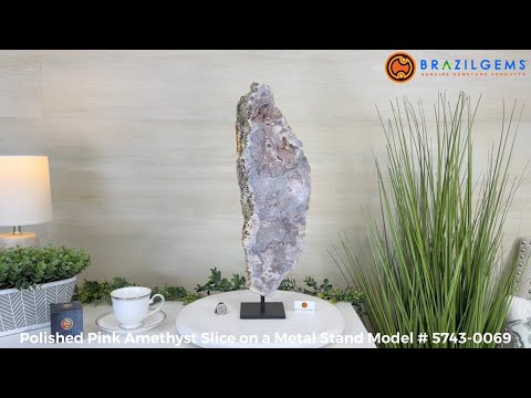 Enhance your room's decor with this beautiful Polished Pink Amethyst Slice, featuring both a smooth front and back with natural rough edges. Display it on a table, shelf, or desk for a stunning and unique addition to any space. This natural slice on a stand will surely impress as a one-of-a-kind statement piece.