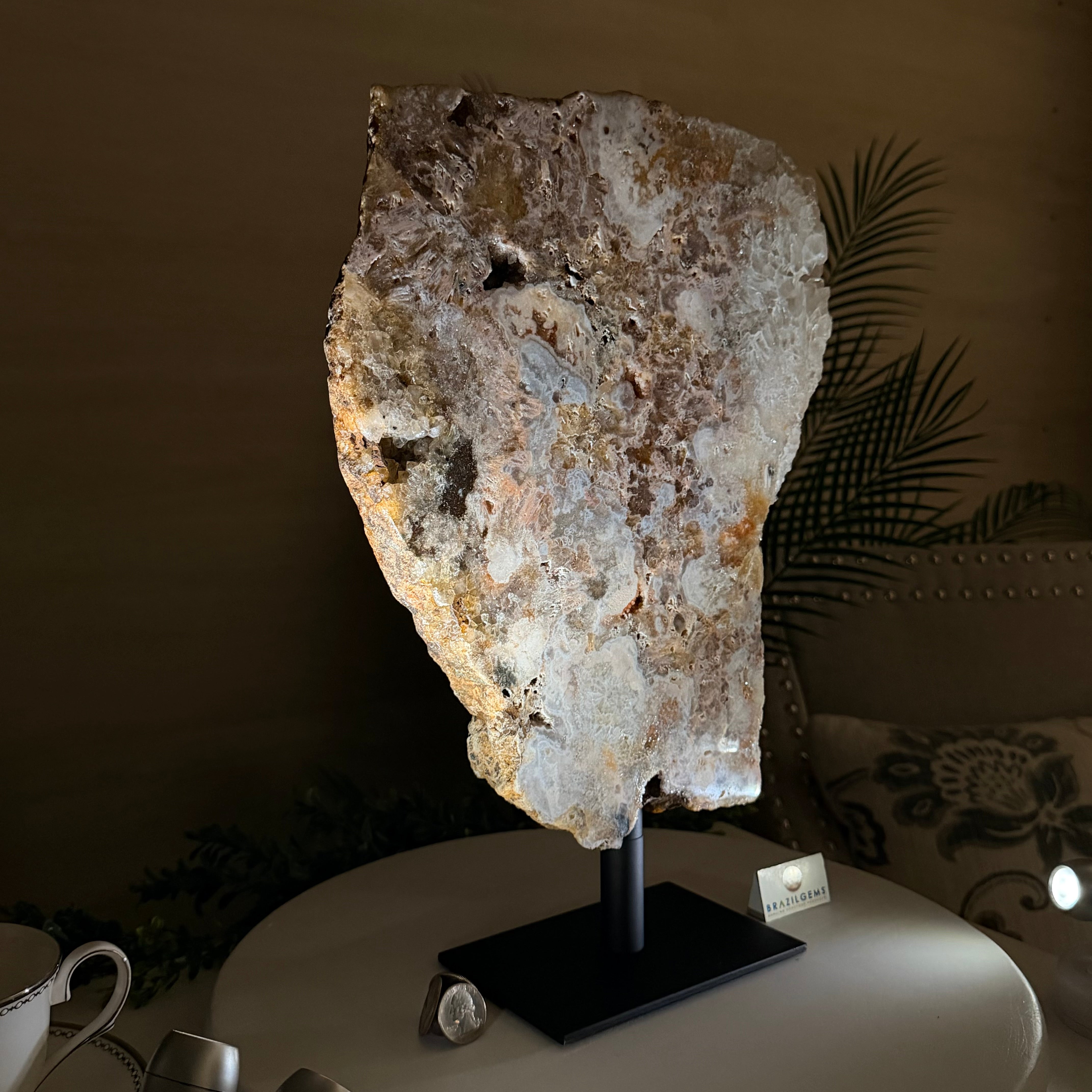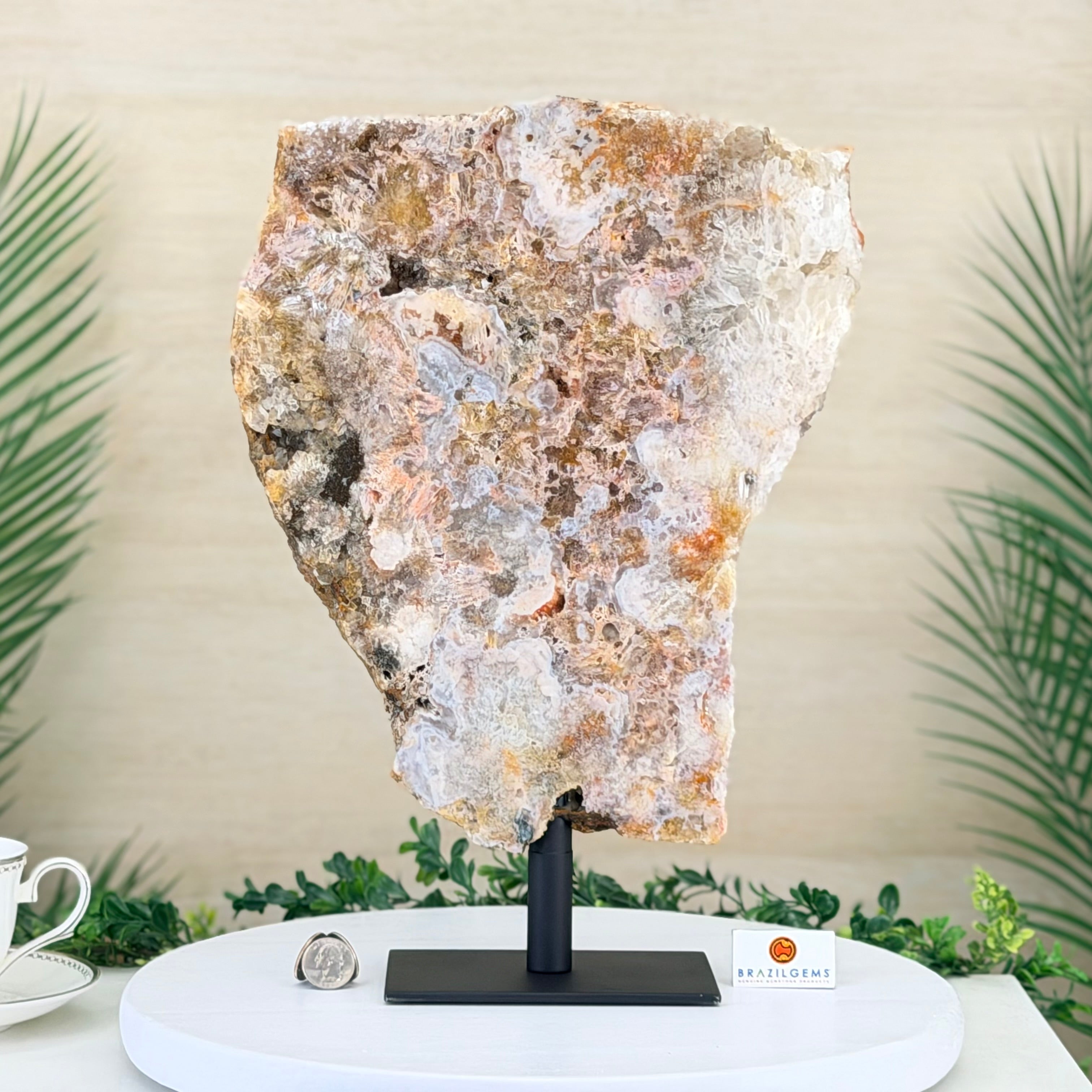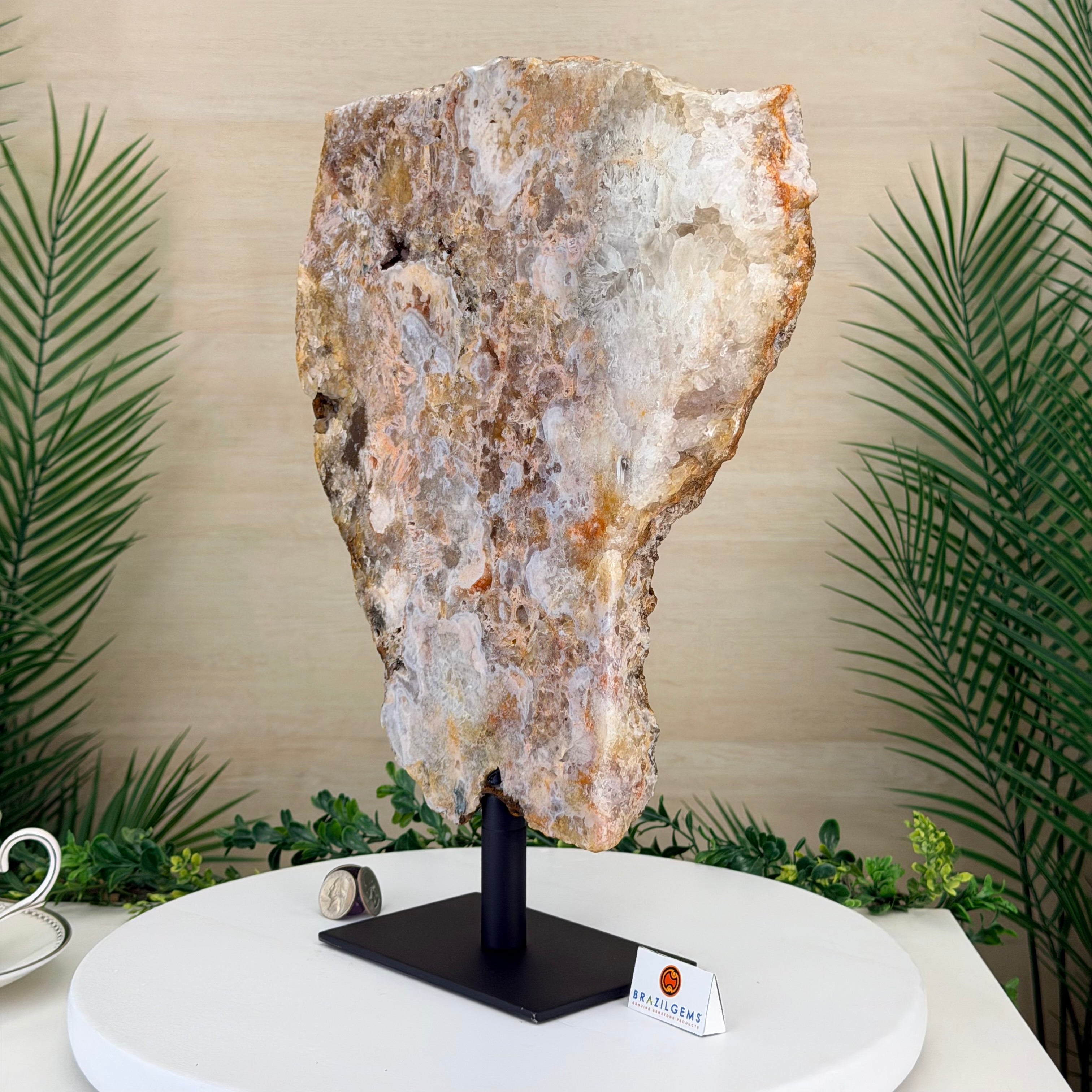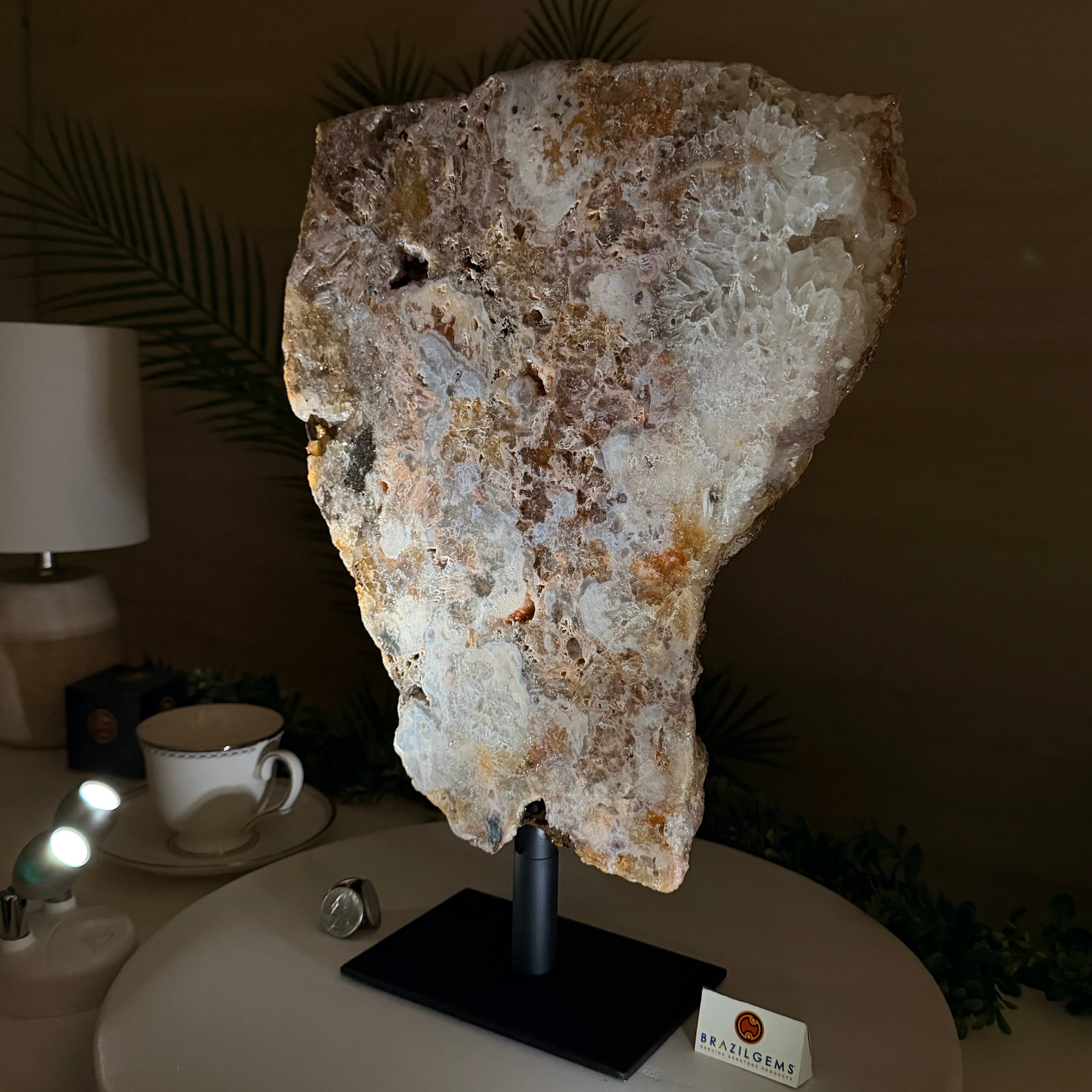 Presented on a modern metal stand, this piece transforms a natural gemstone into a sophisticated décor accent, perfect for adding an elegant, organic touch to any space.