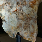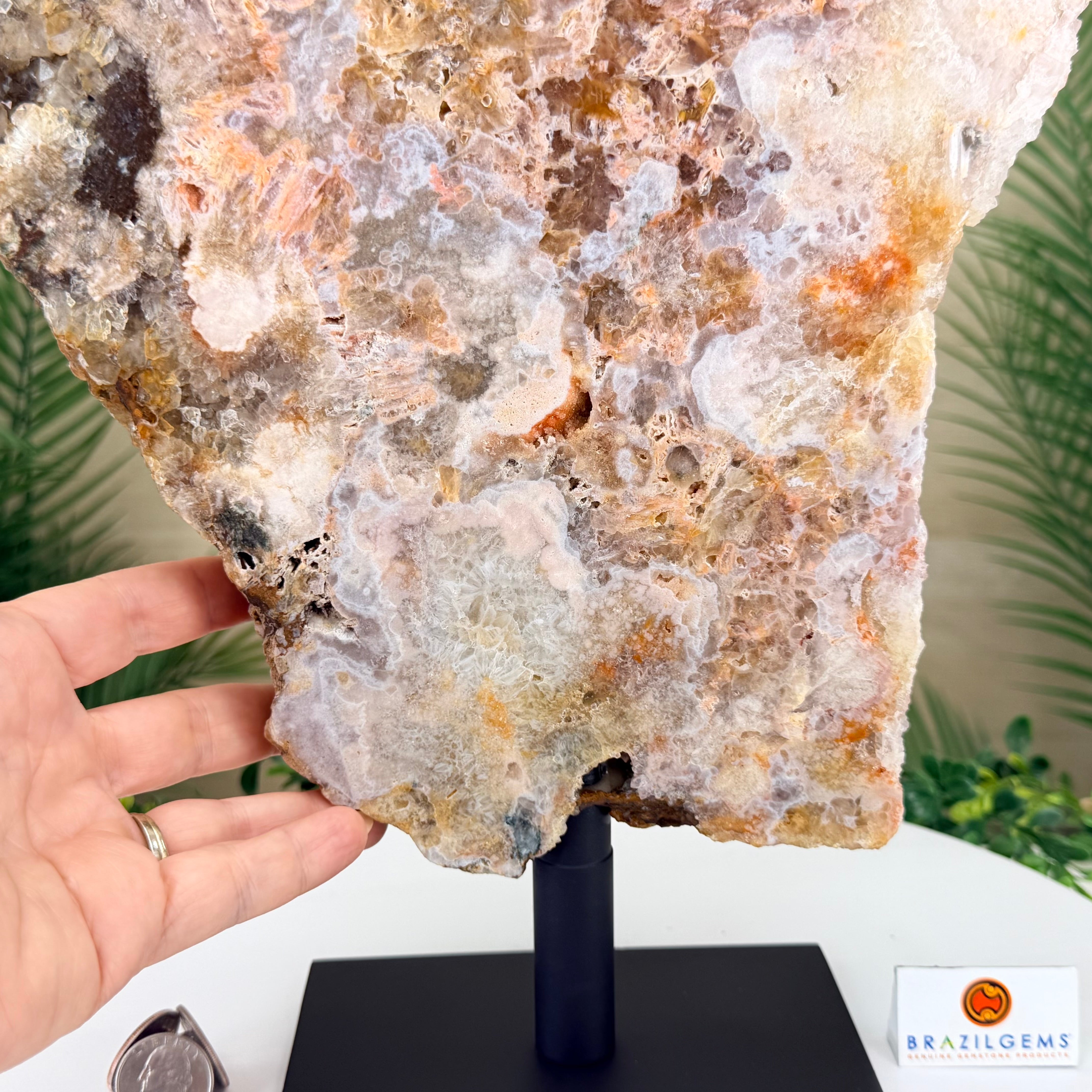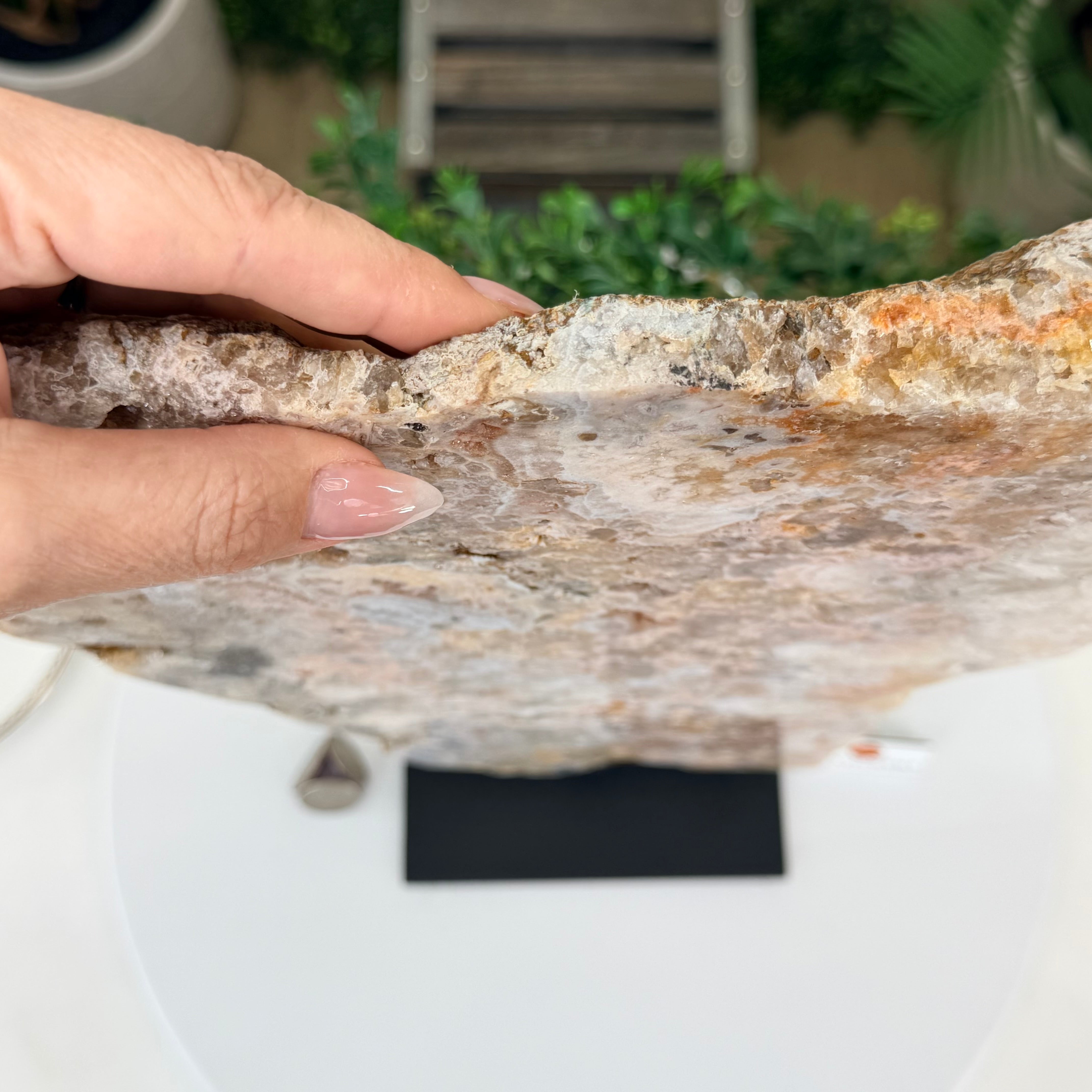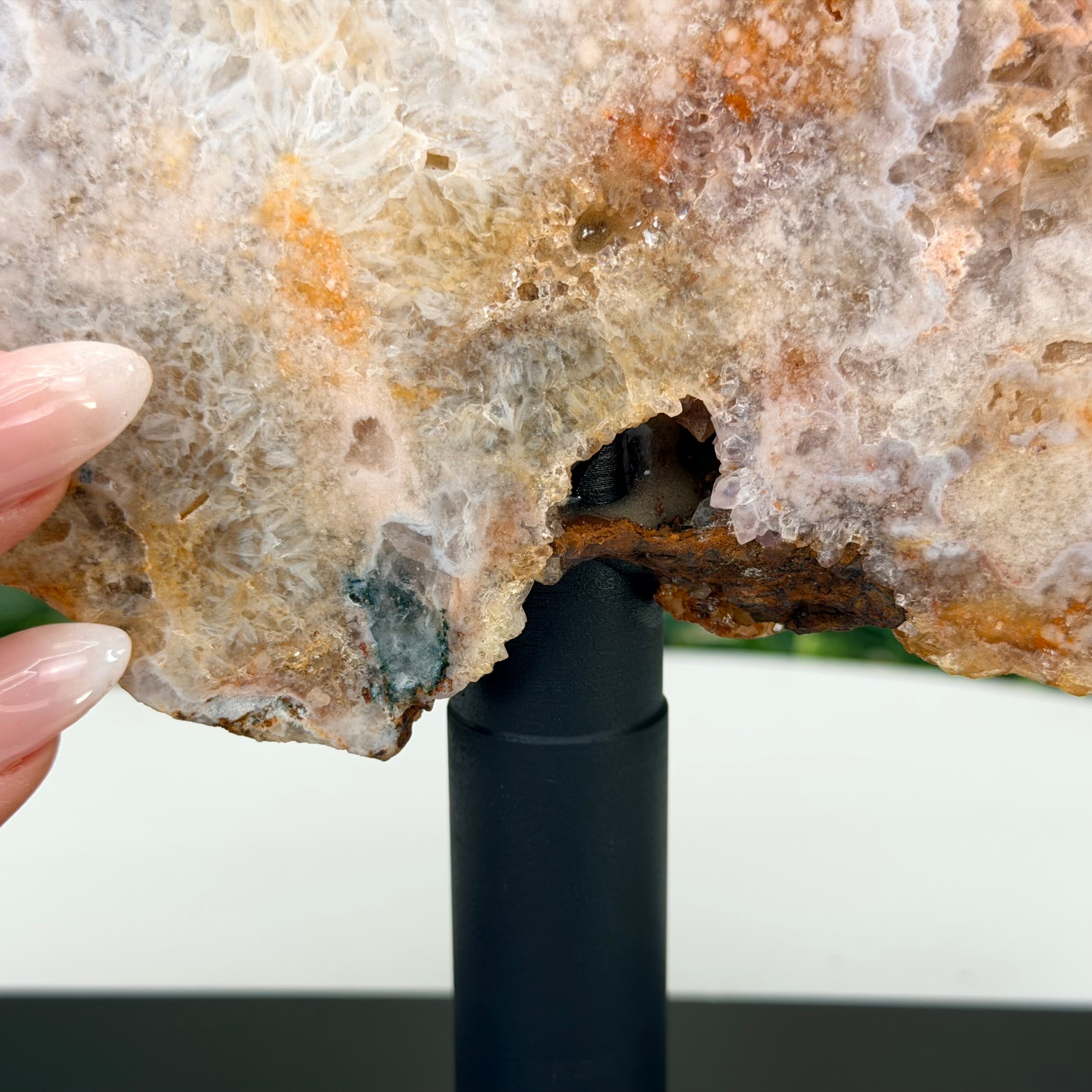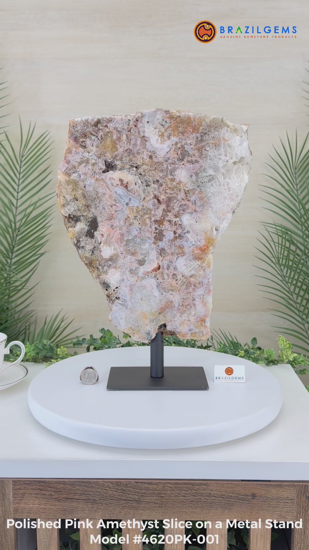 A polished Brazilian Pink Amethyst slice on a metal stand, featuring soft natural hues and a unique crystal formation. One side is smooth and polished, while the other retains its natural rough texture.