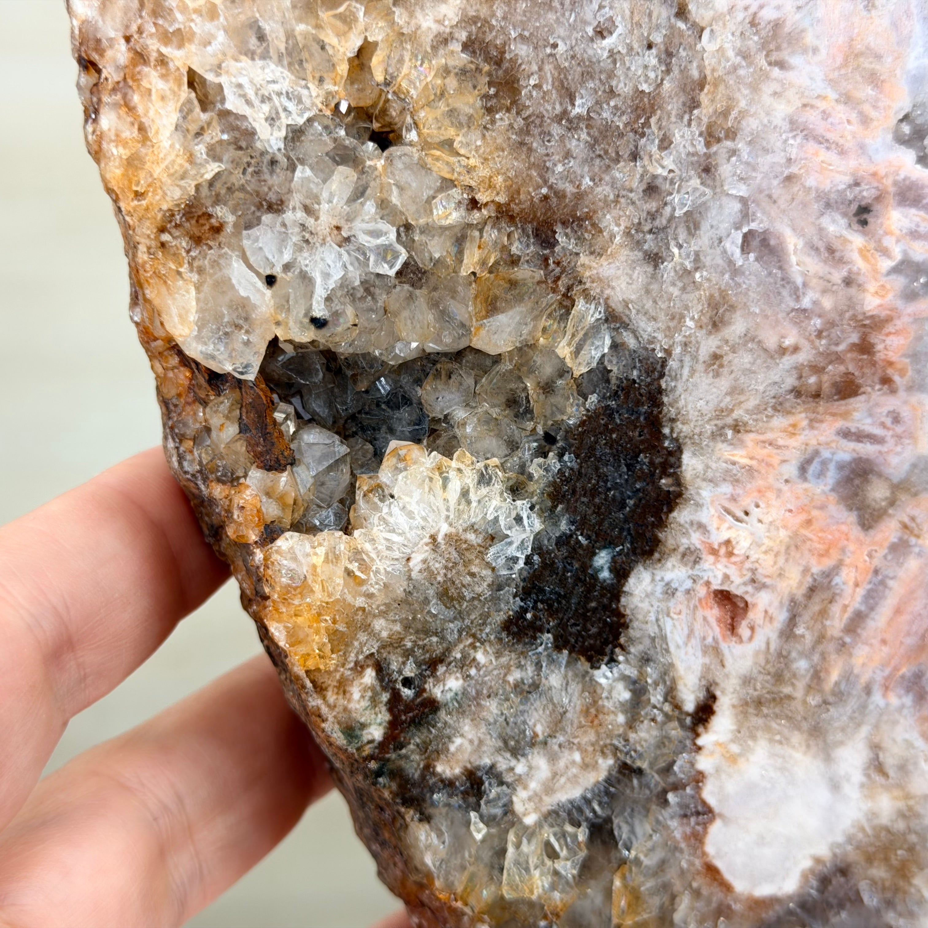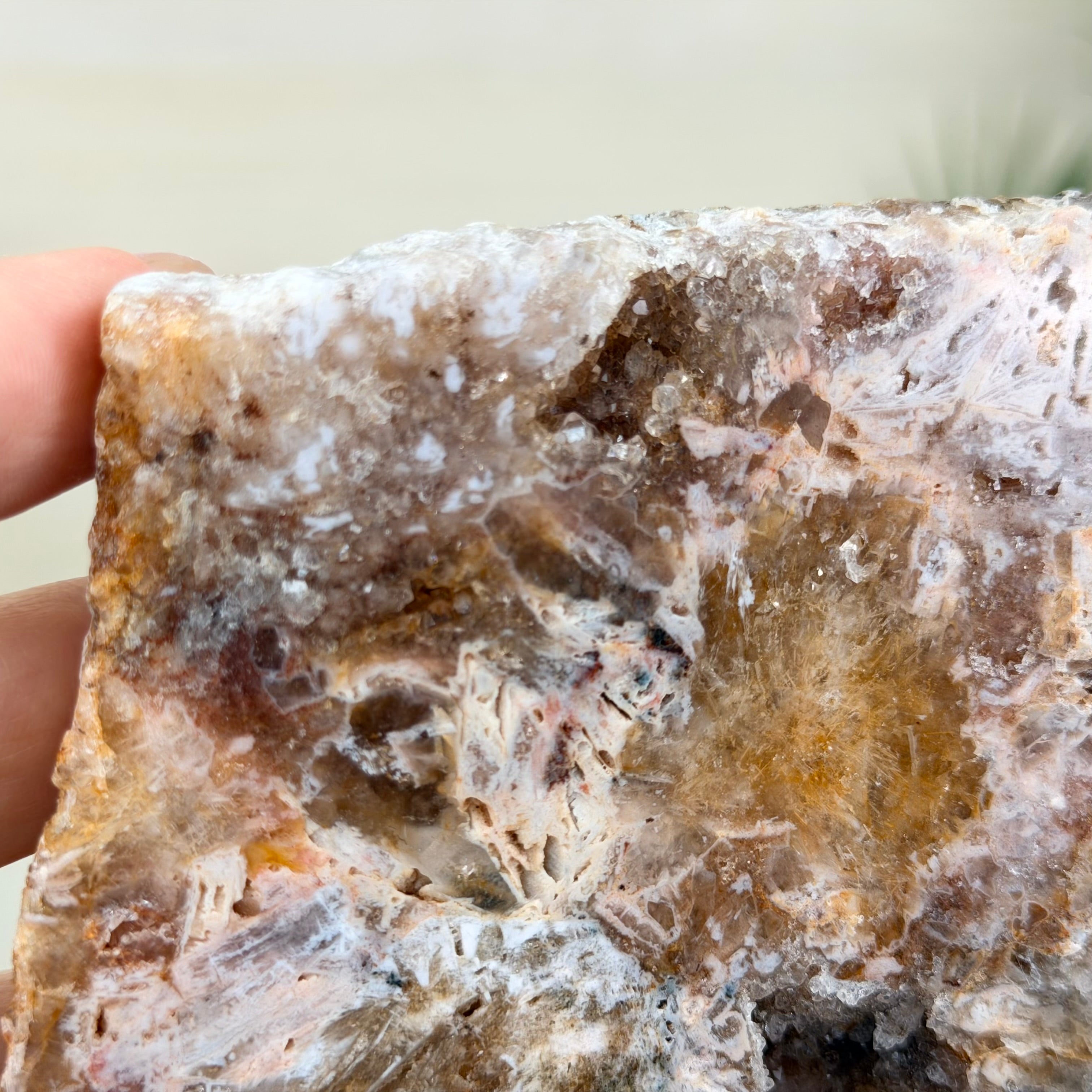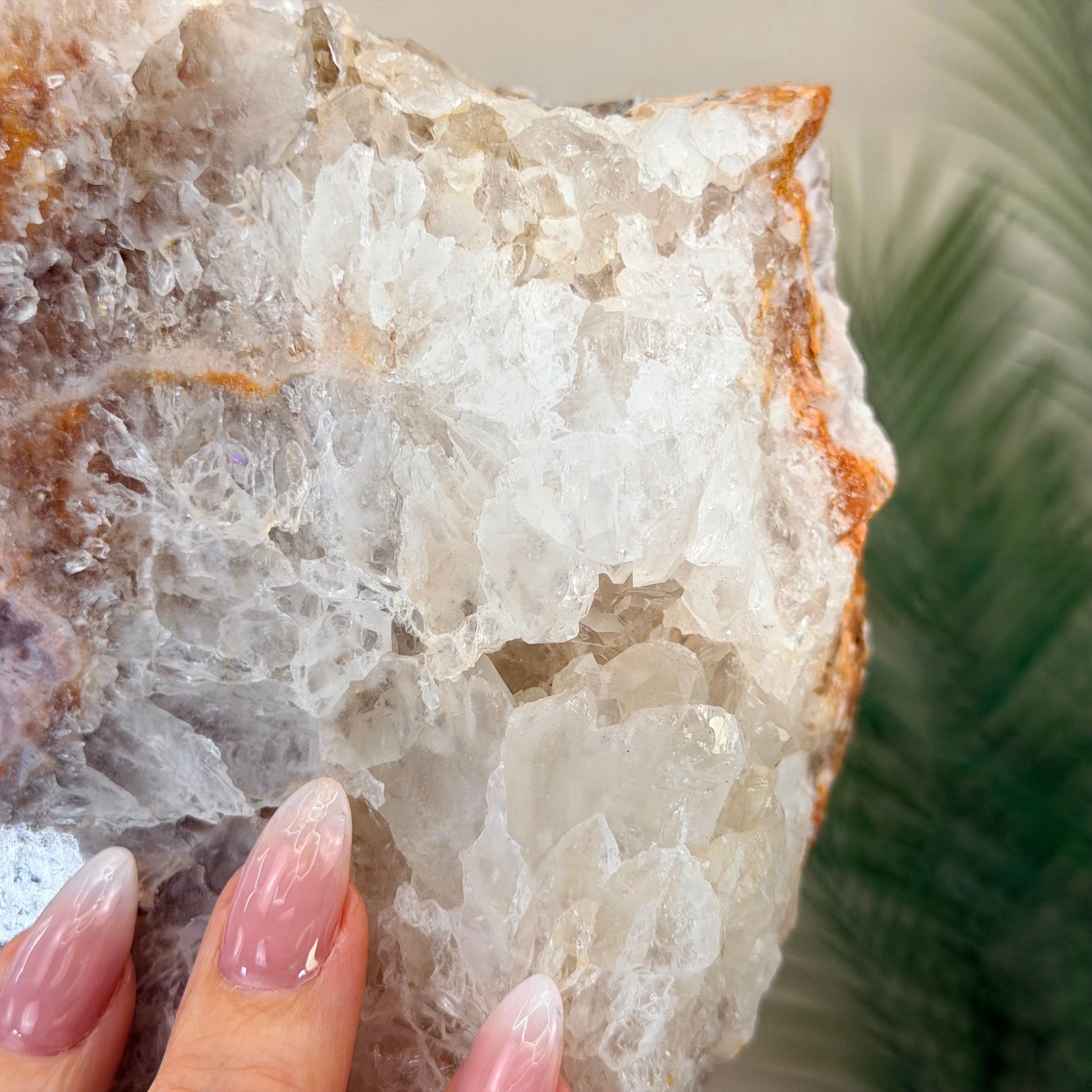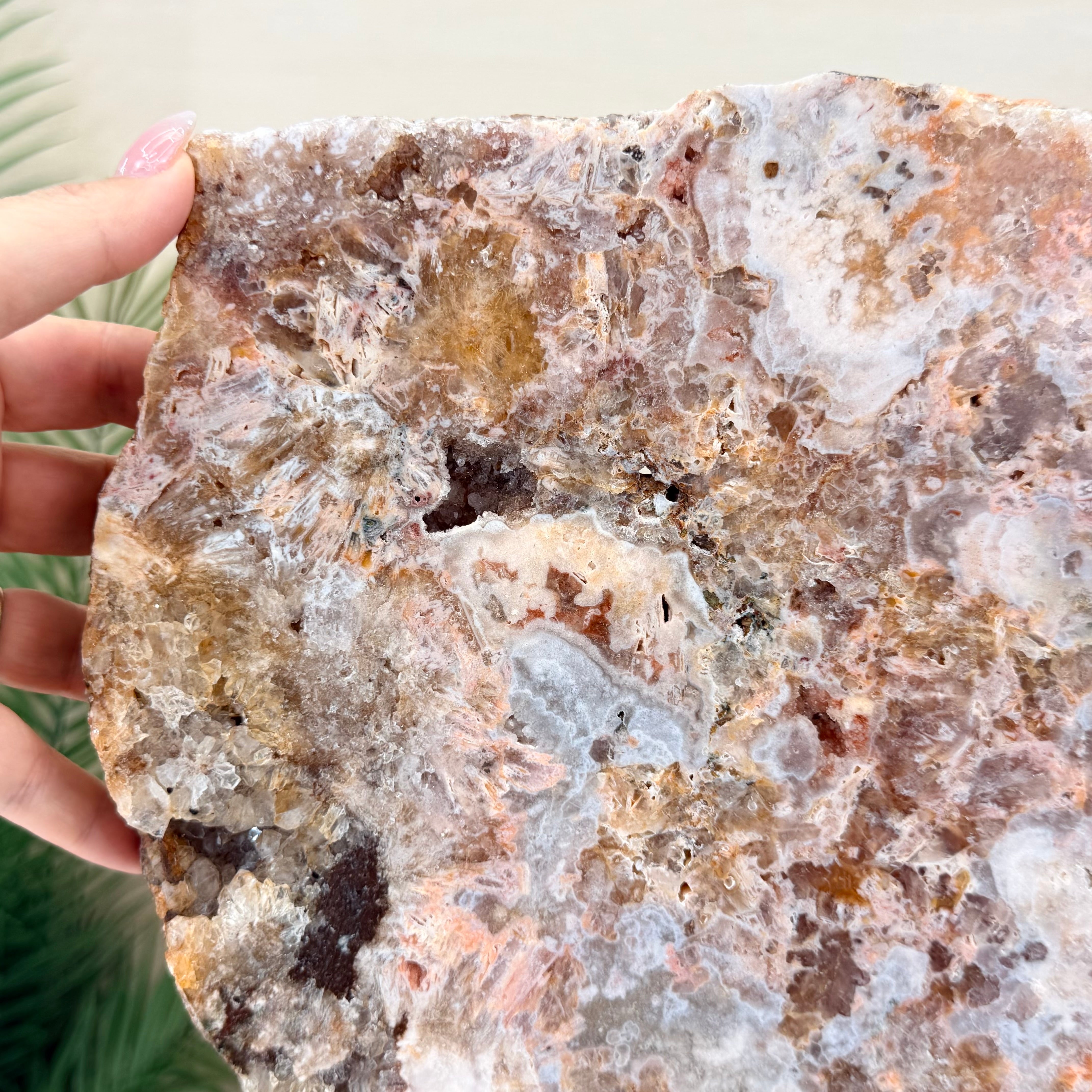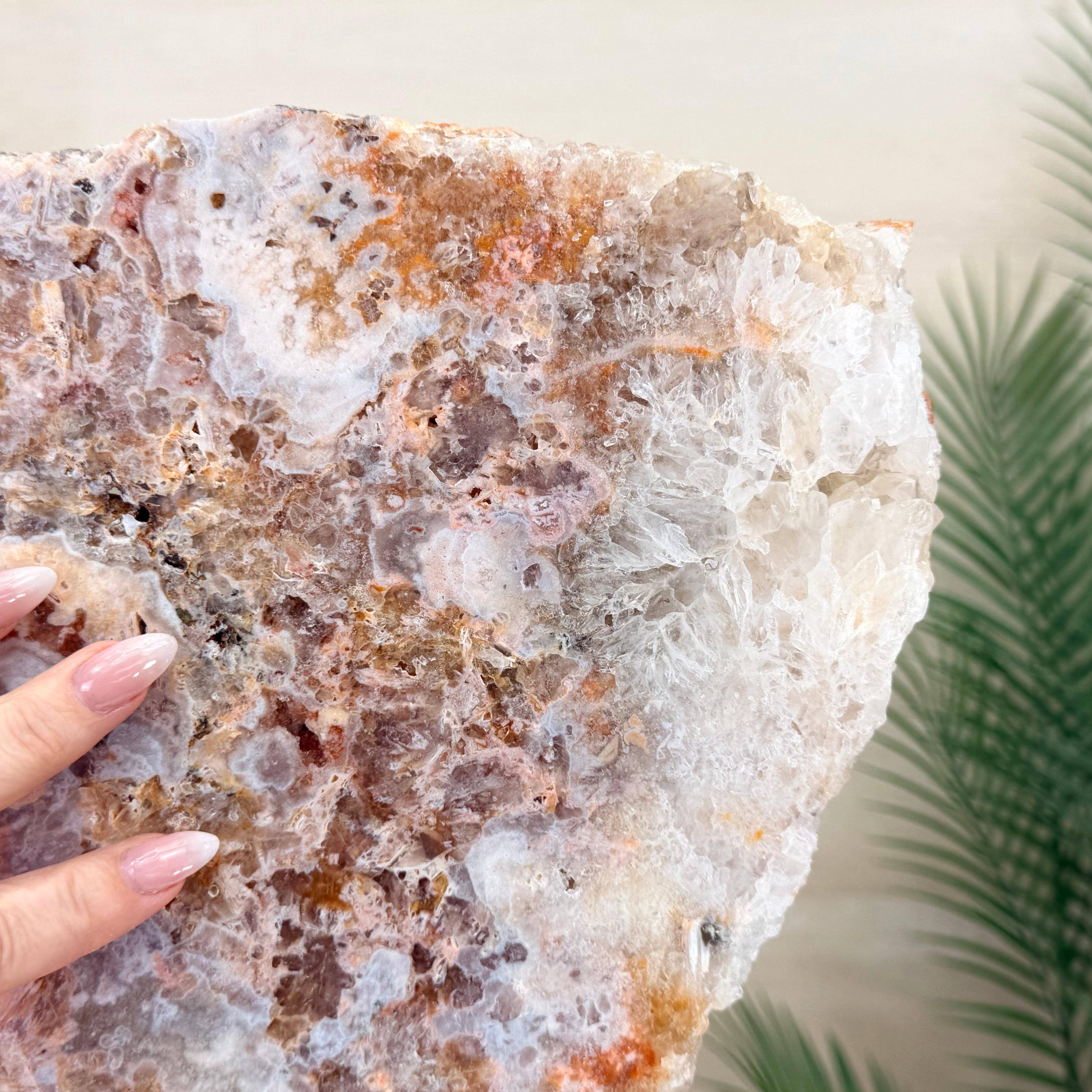 A polished Brazilian Pink Amethyst slice on a metal stand, featuring soft natural hues and a unique crystal formation. One side is smooth and polished, while the other retains its natural rough texture.