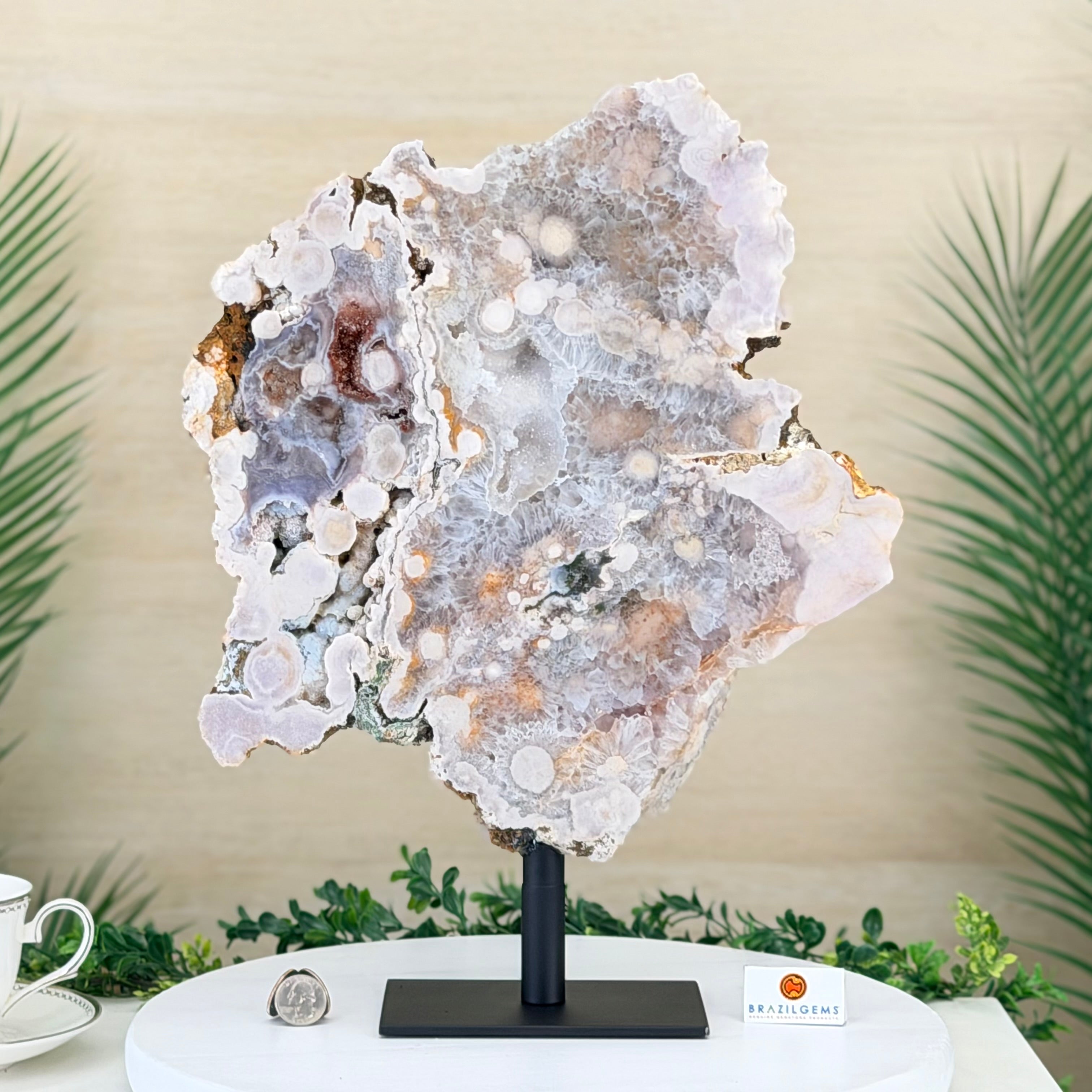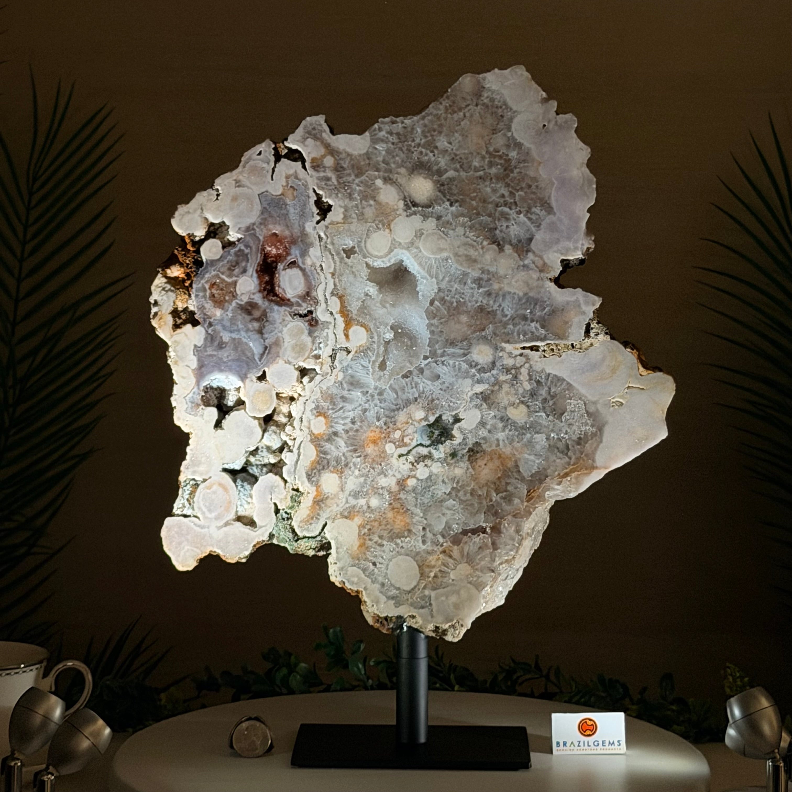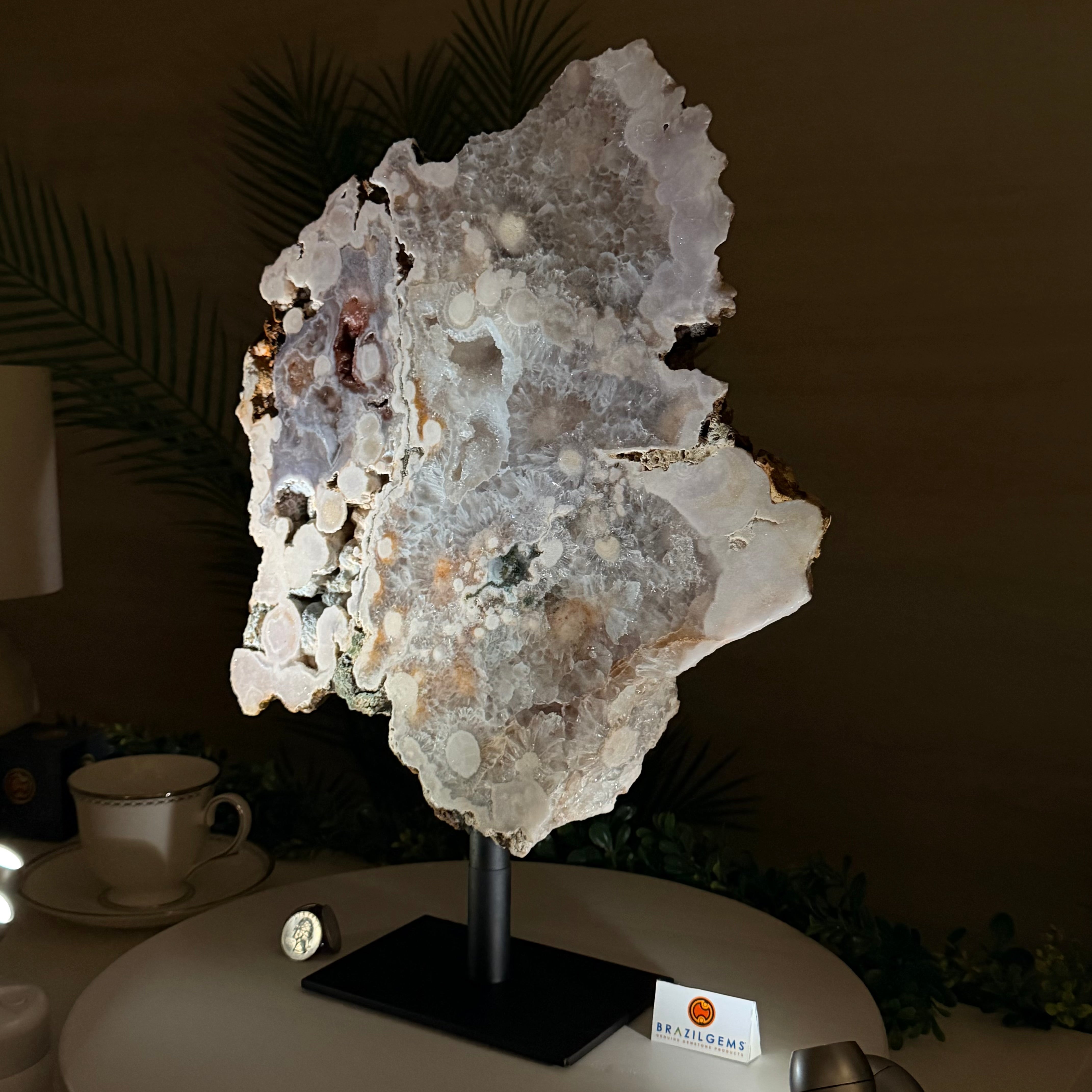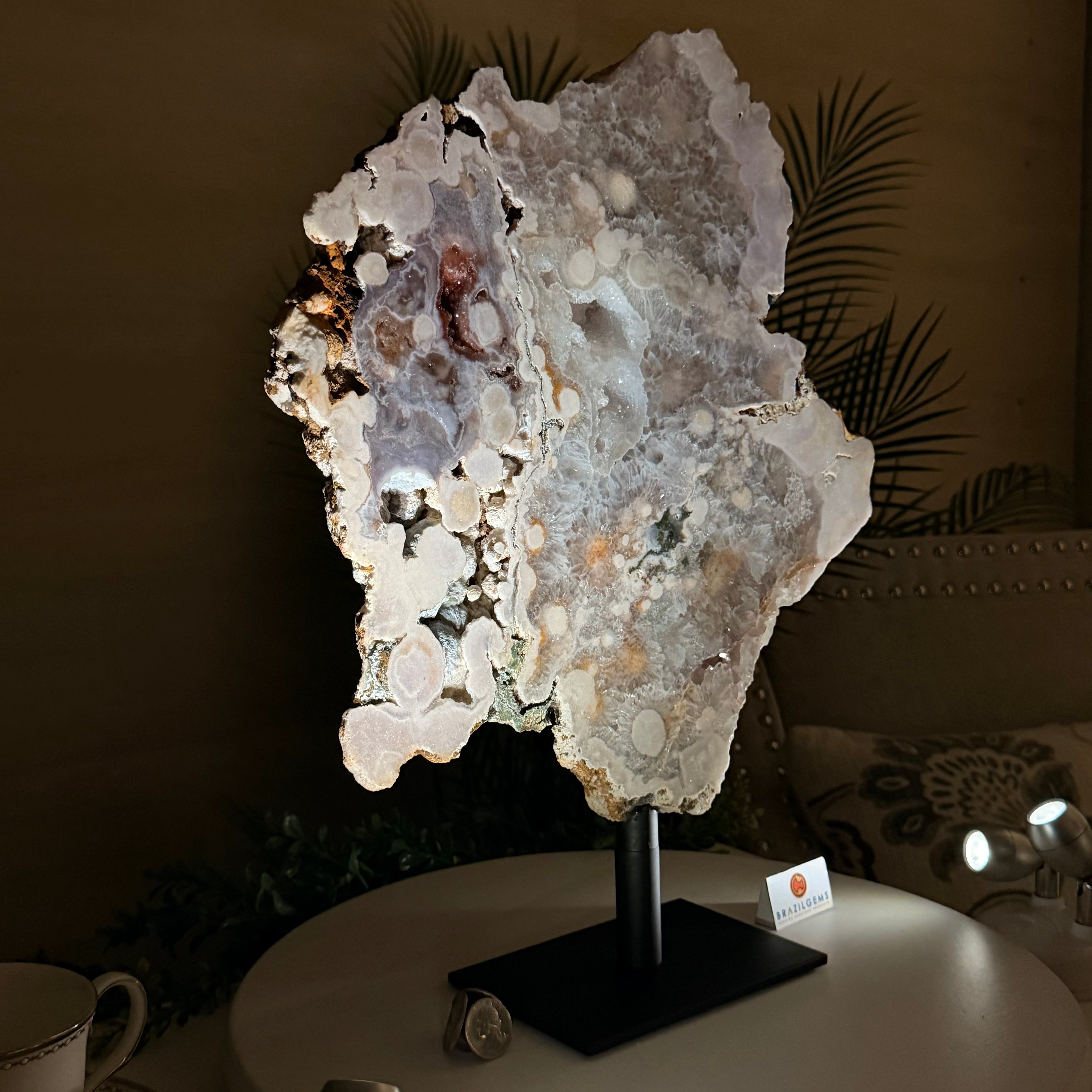 Presented on a modern metal stand, this piece transforms a natural gemstone into a sophisticated décor accent, perfect for adding an elegant, organic touch to any space.