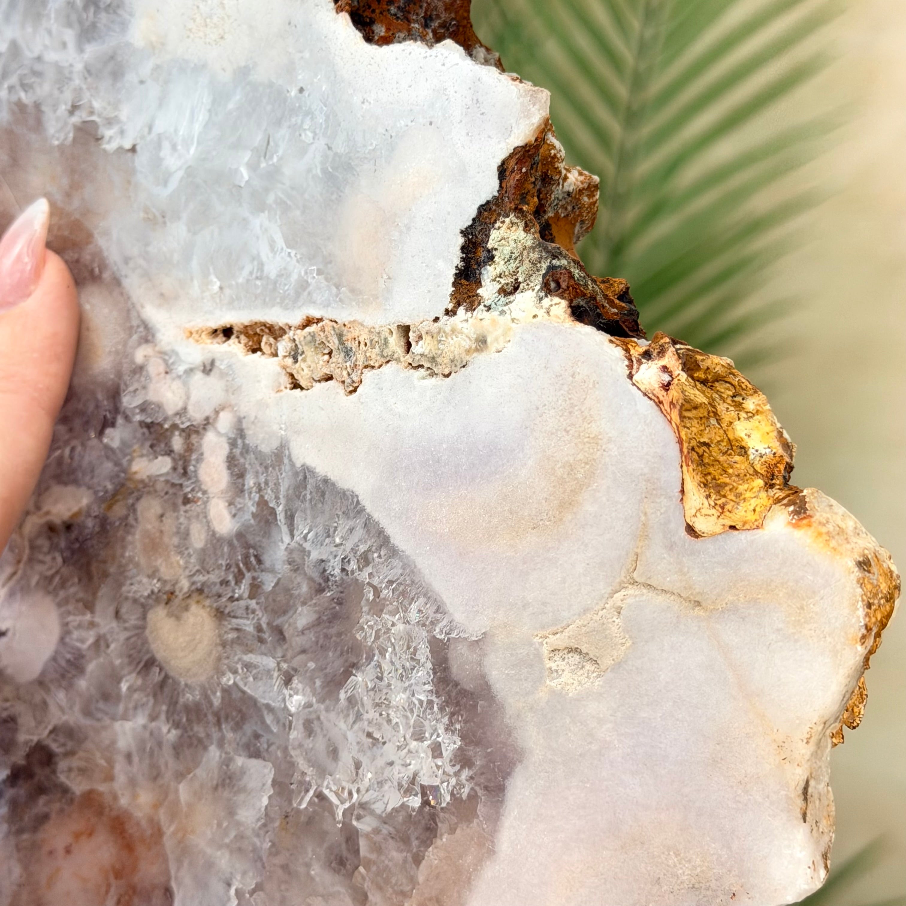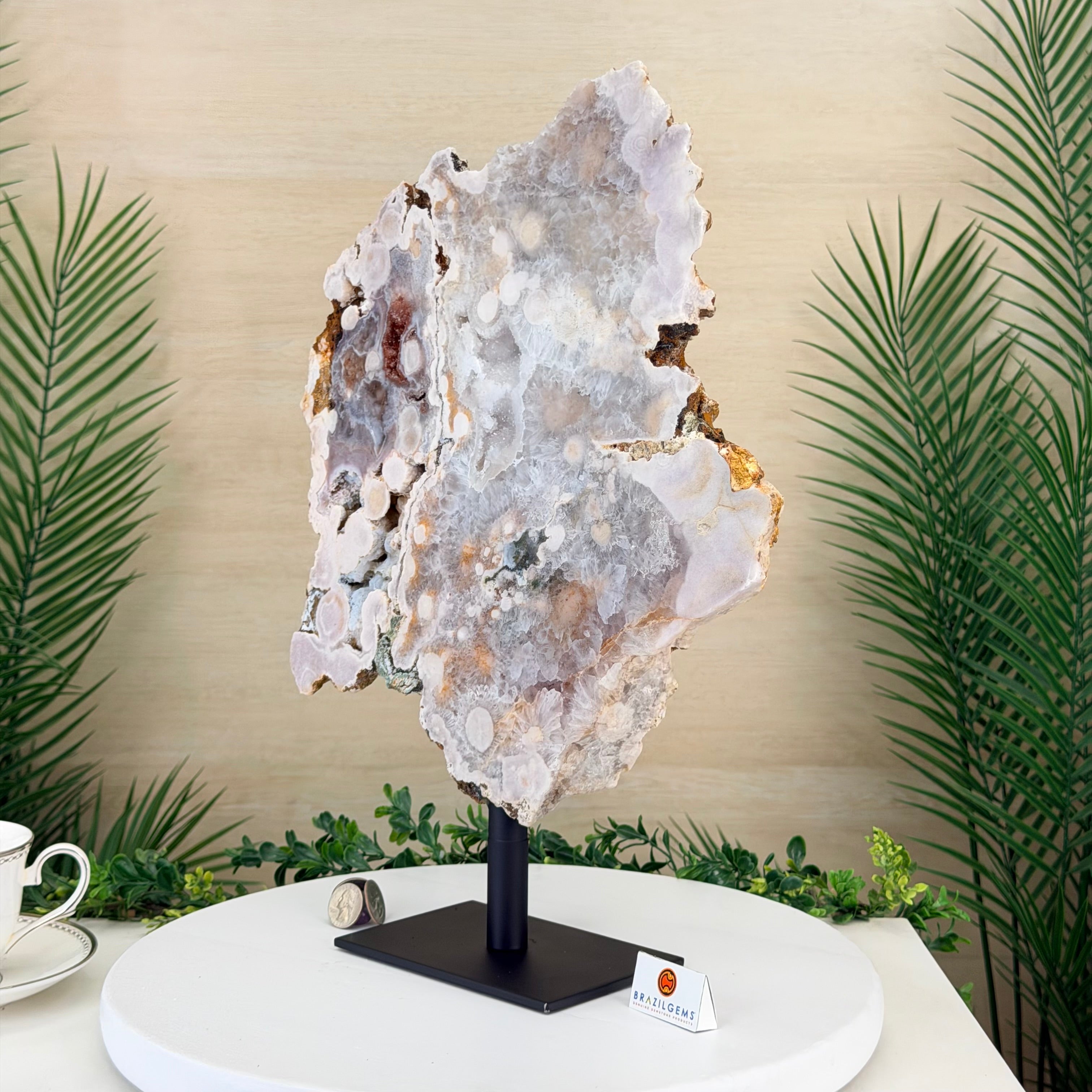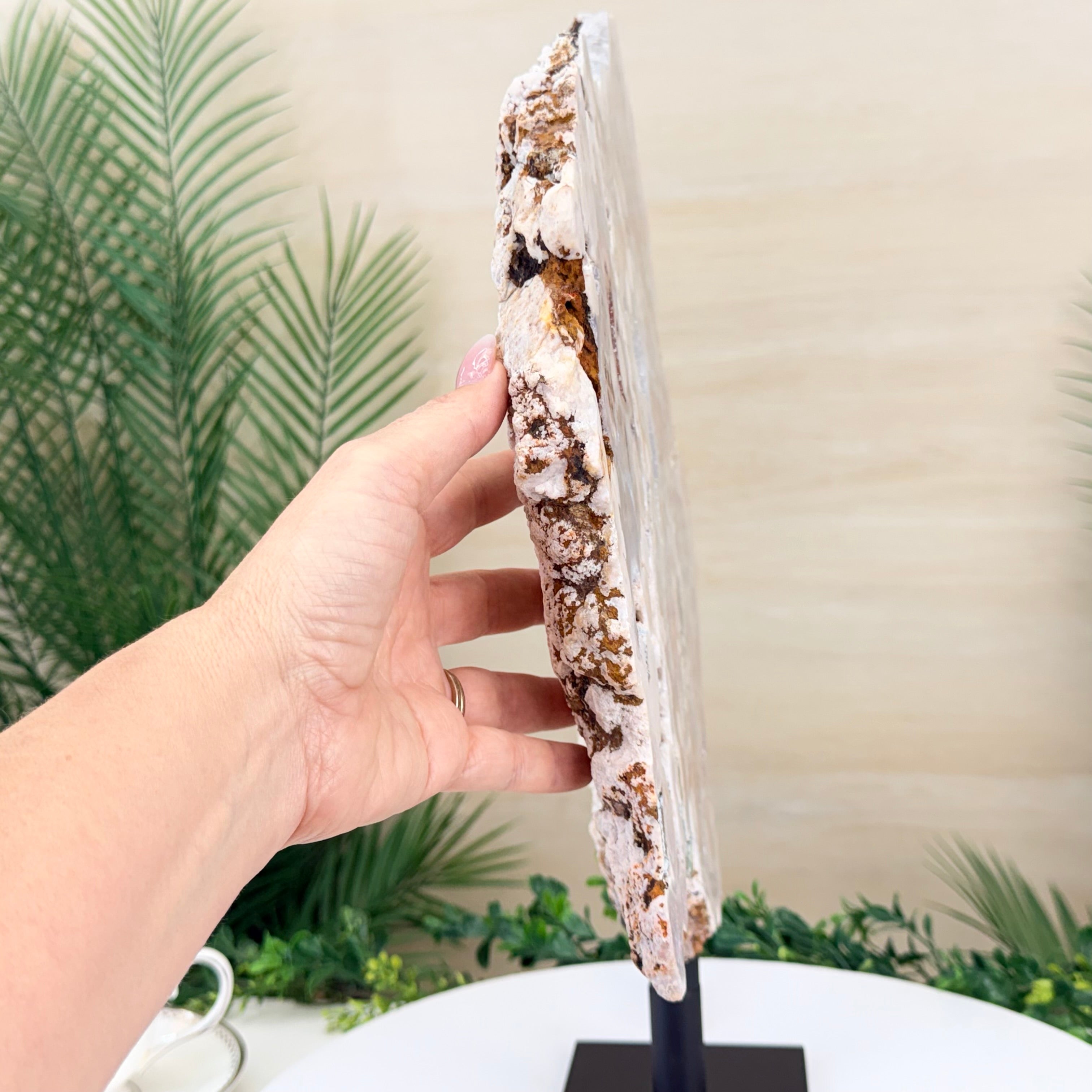 A polished Brazilian Pink Amethyst slice on a metal stand, featuring soft natural hues and a unique crystal formation. One side is smooth and polished, while the other retains its natural rough texture.