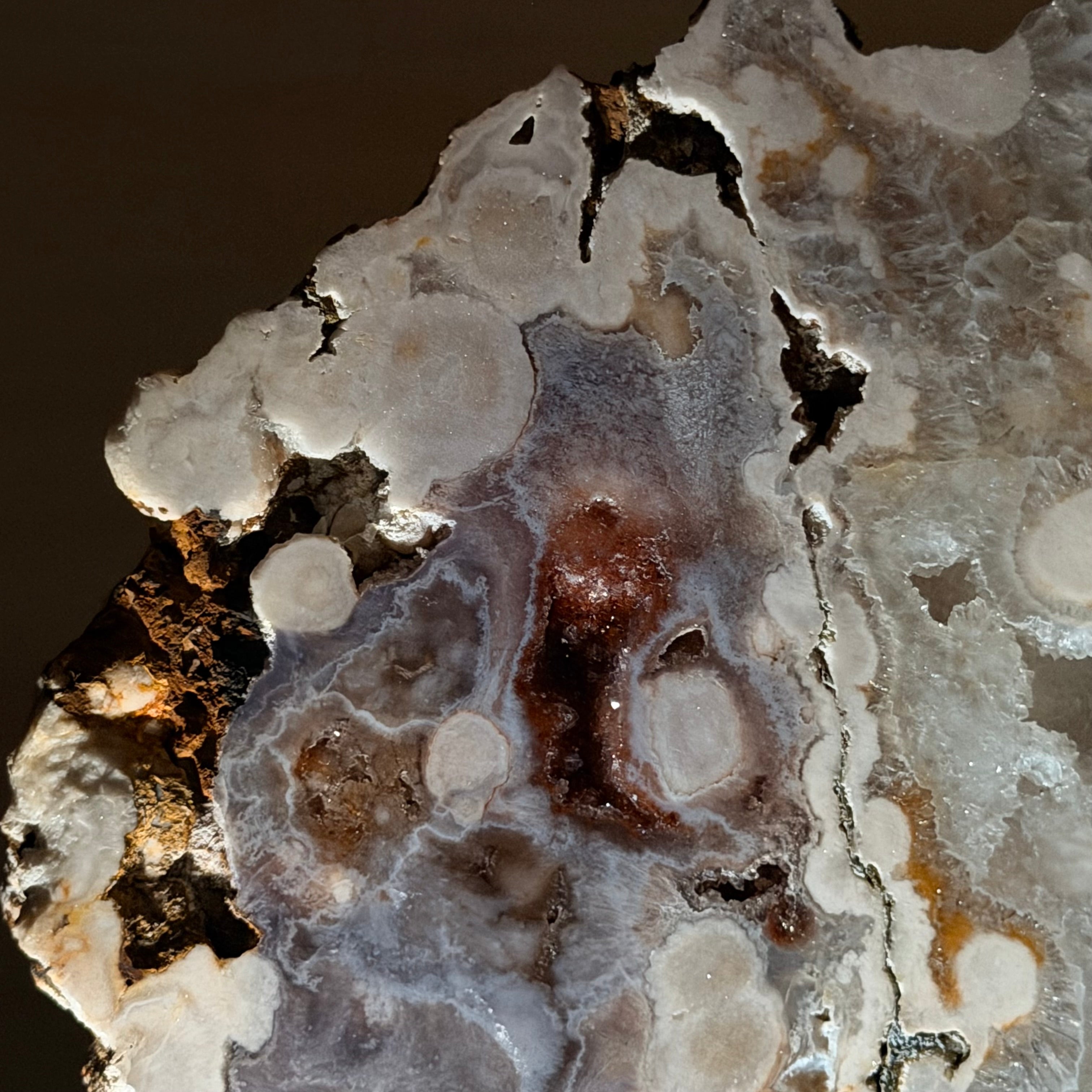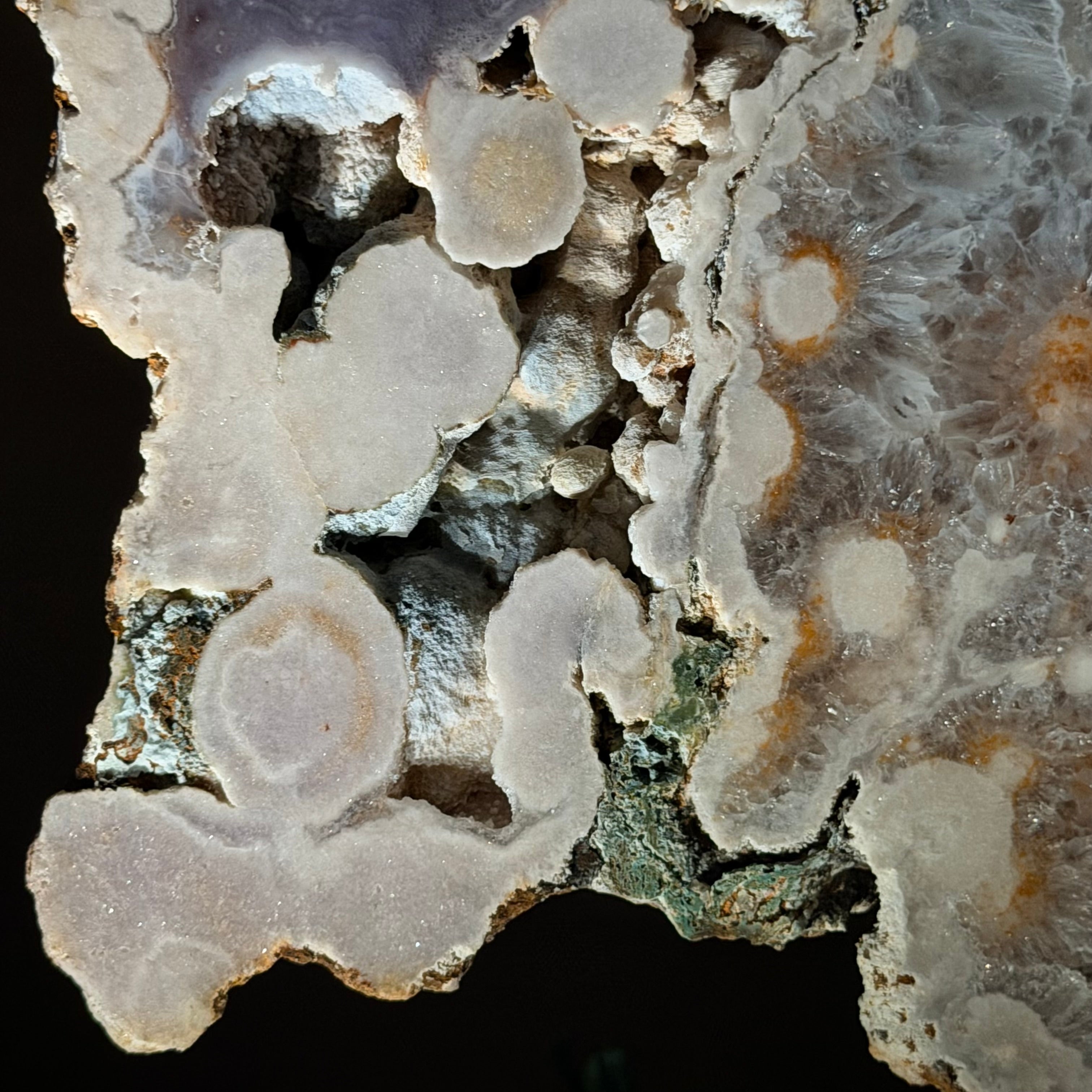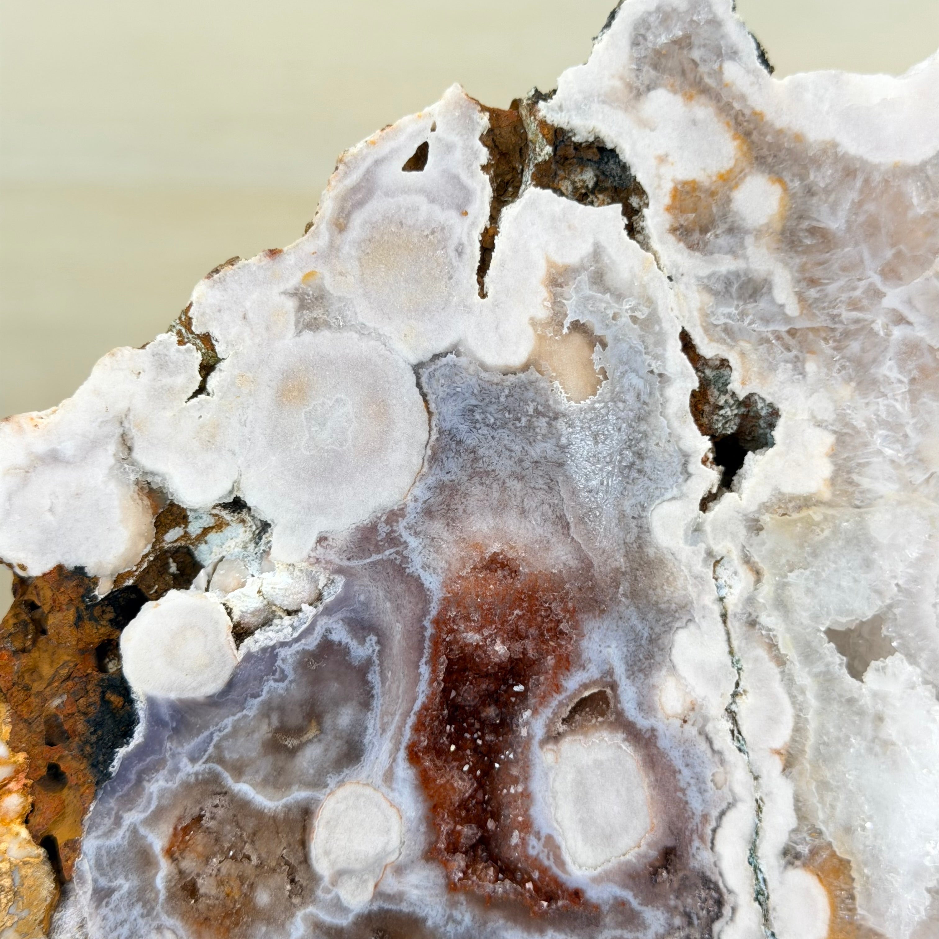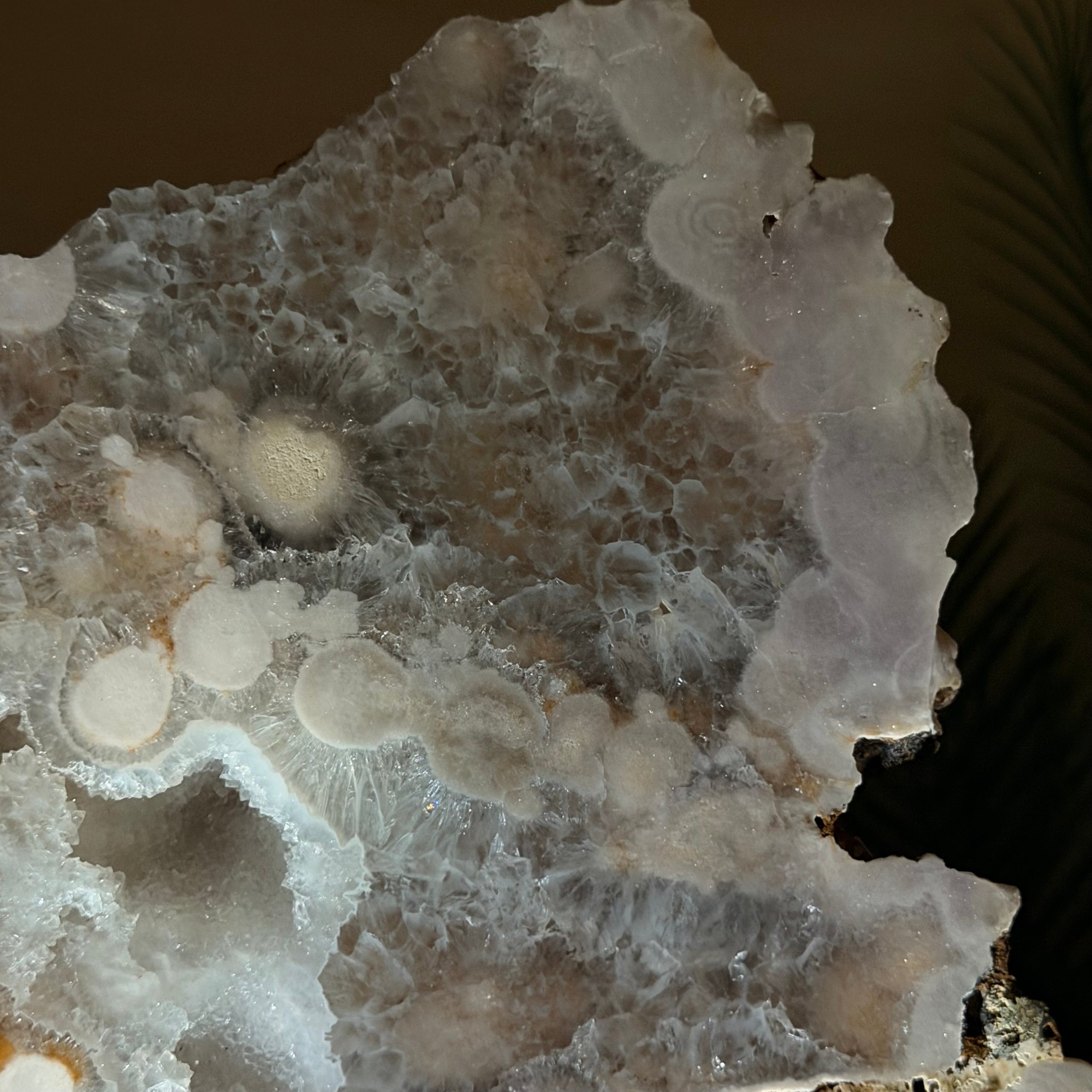 A polished Brazilian Pink Amethyst slice on a metal stand, featuring soft natural hues and a unique crystal formation. One side is smooth and polished, while the other retains its natural rough texture.