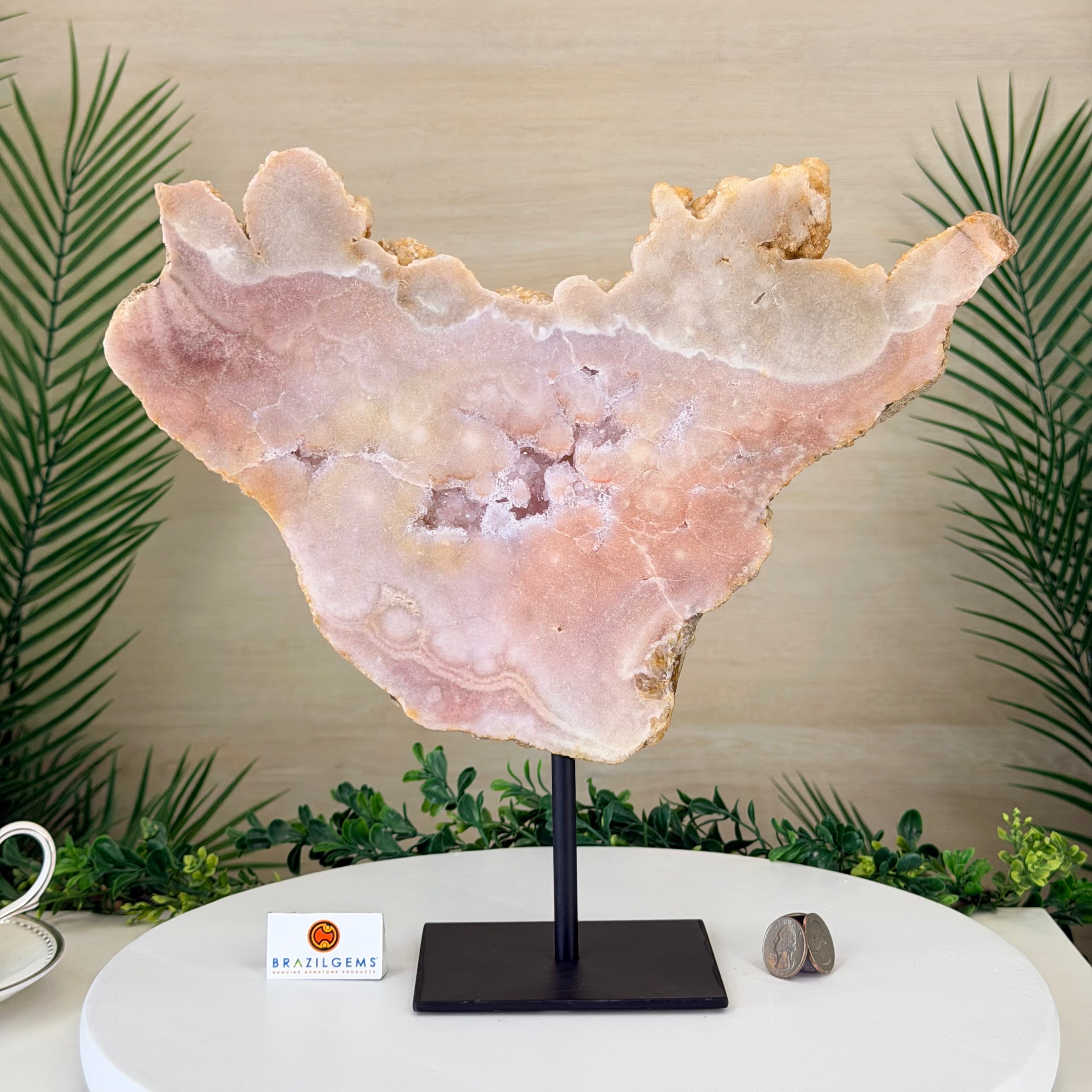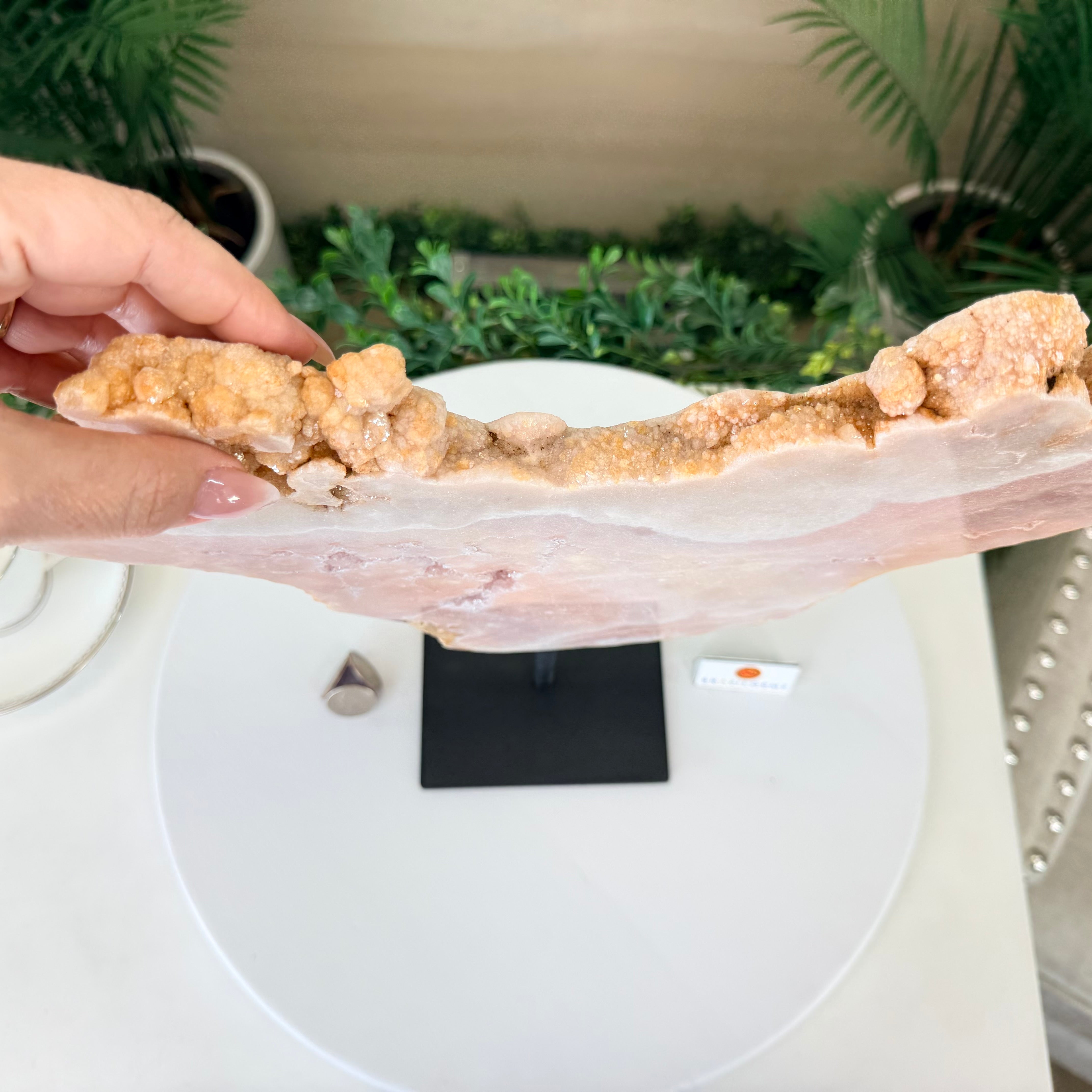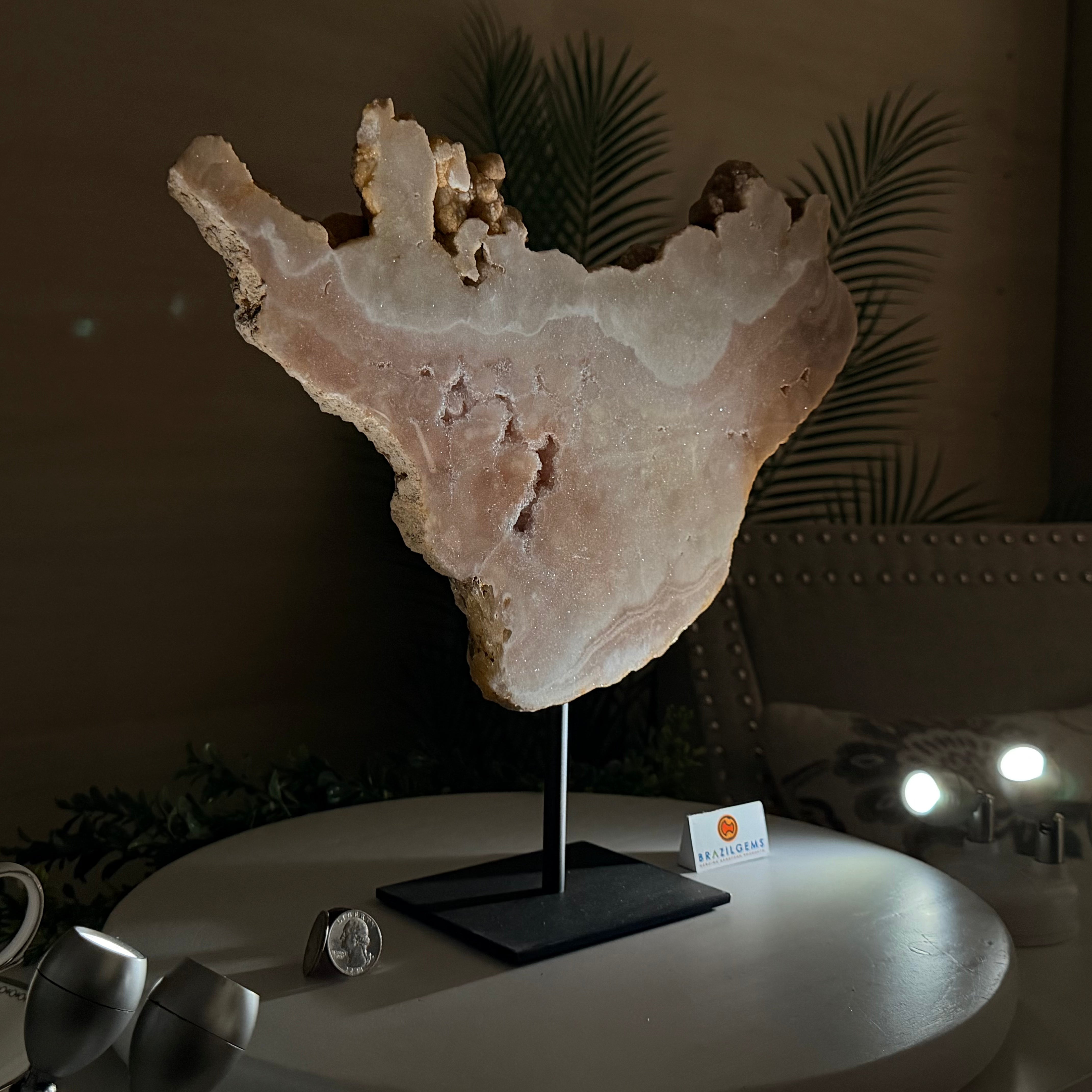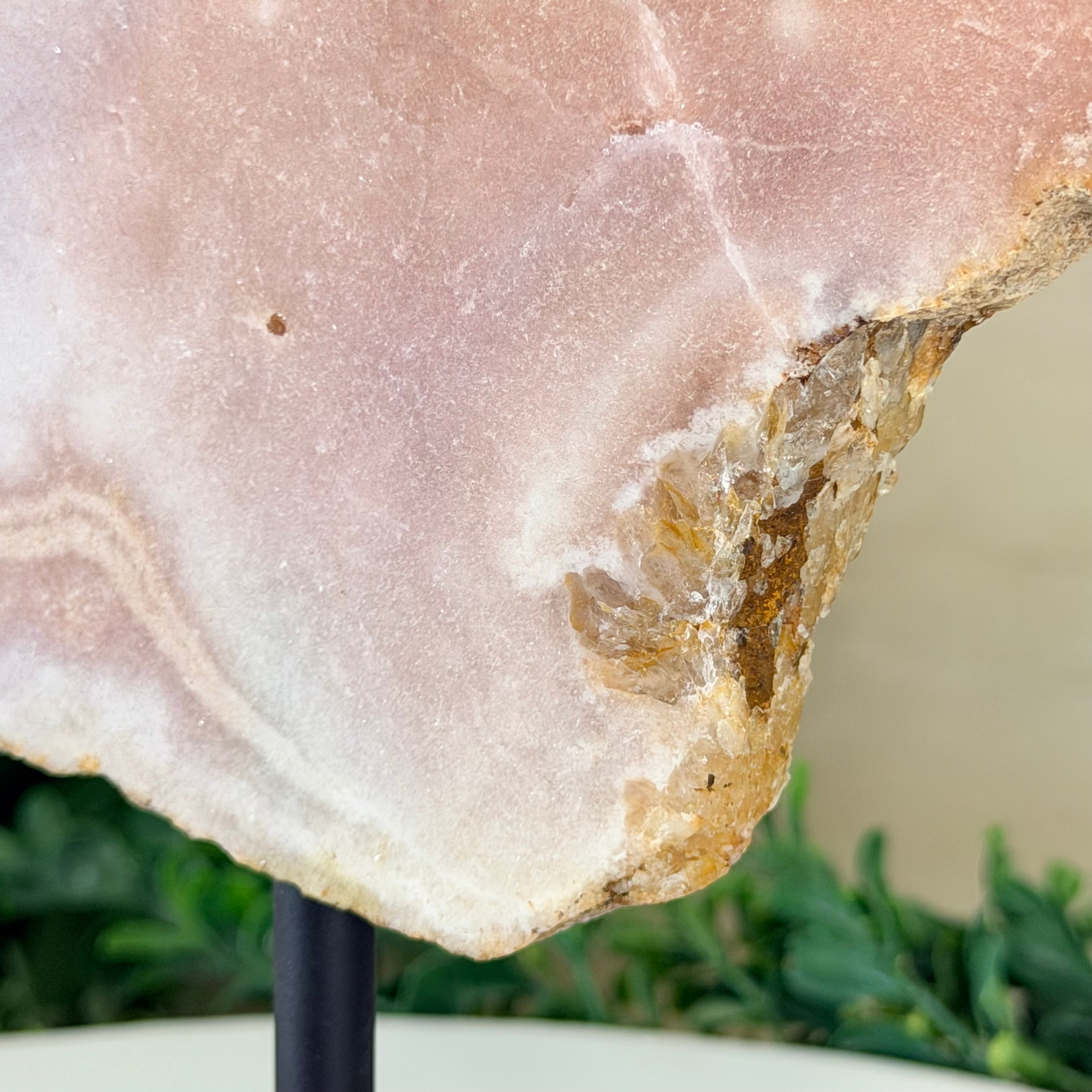 A polished Brazilian Pink Amethyst slice on a metal stand, featuring soft natural hues and a unique crystal formation. Both sides are polished smooth, highlighting the uniqueness of each piece.