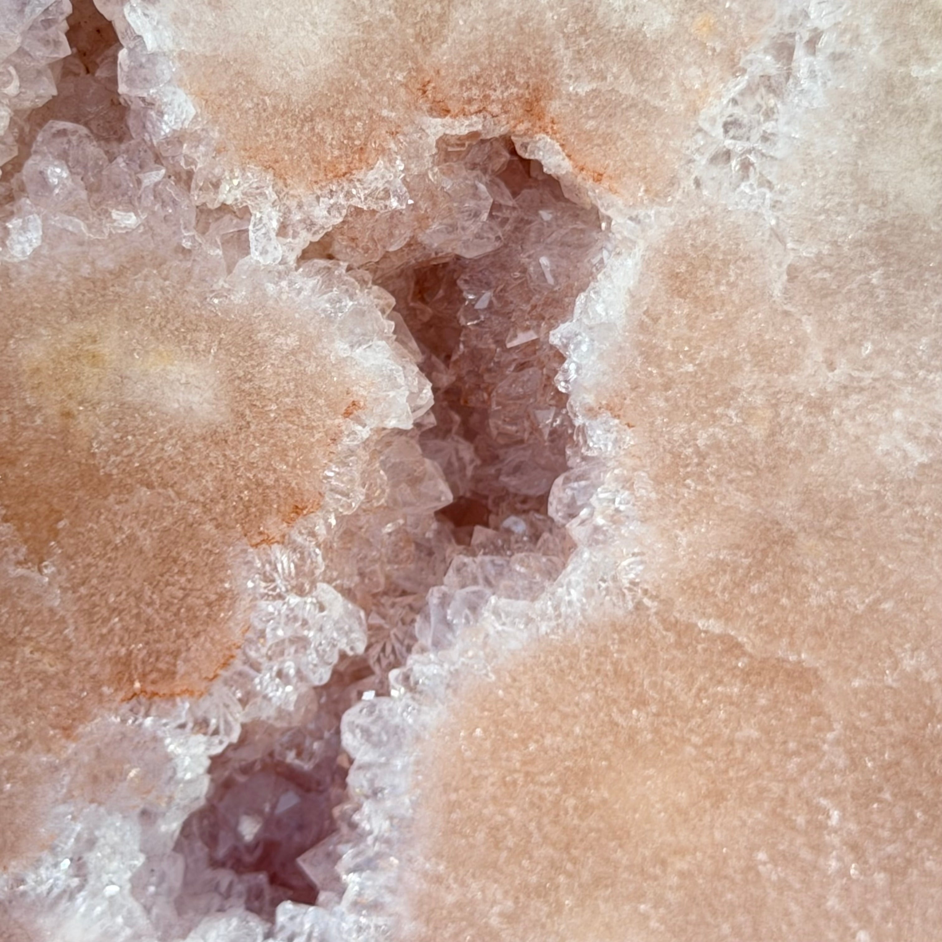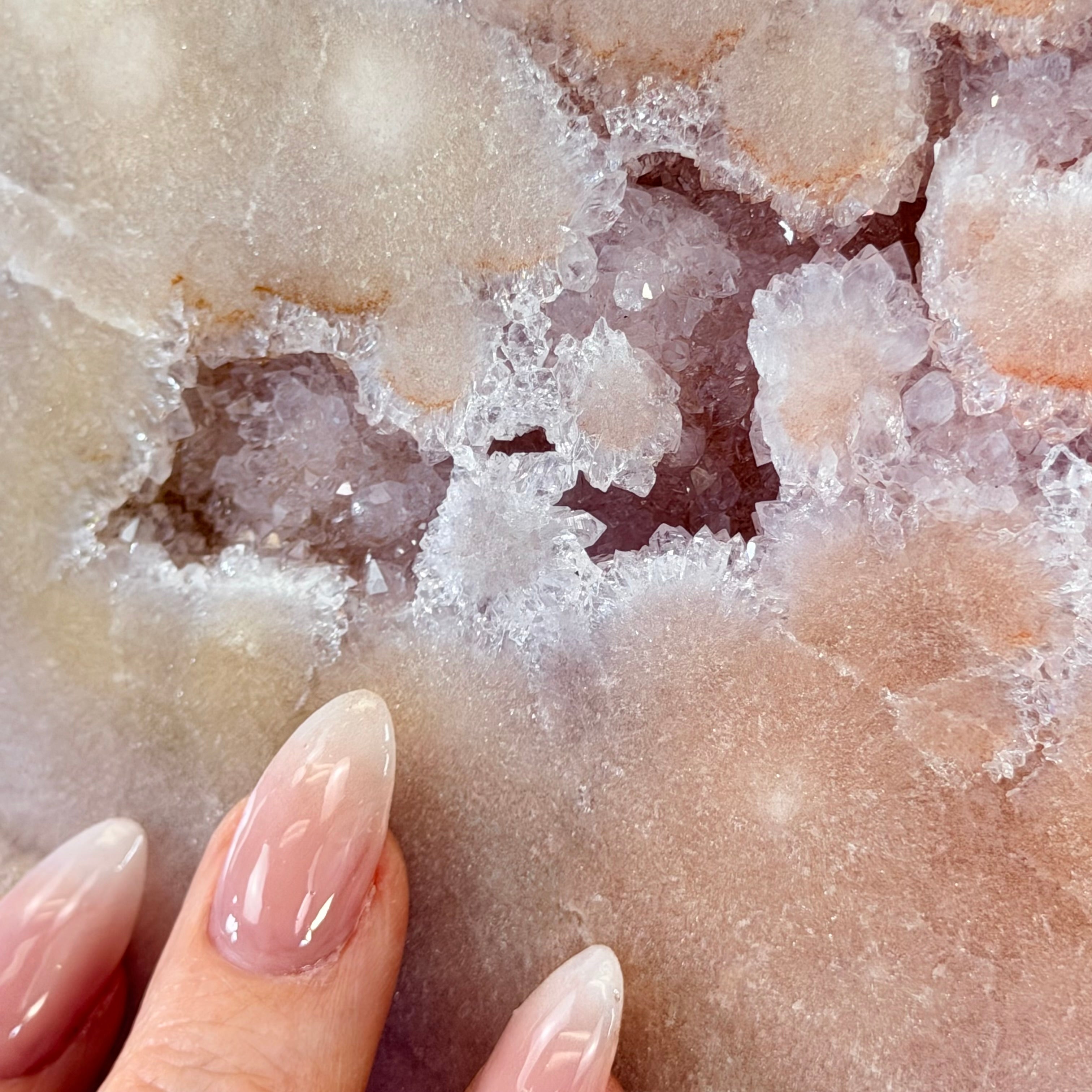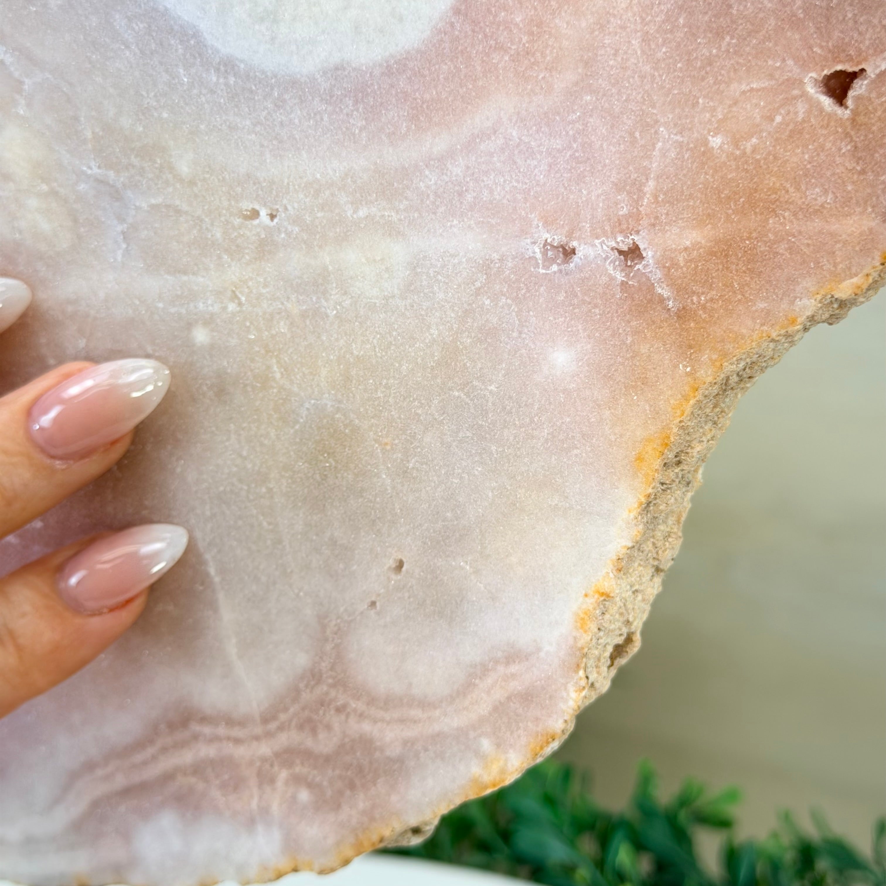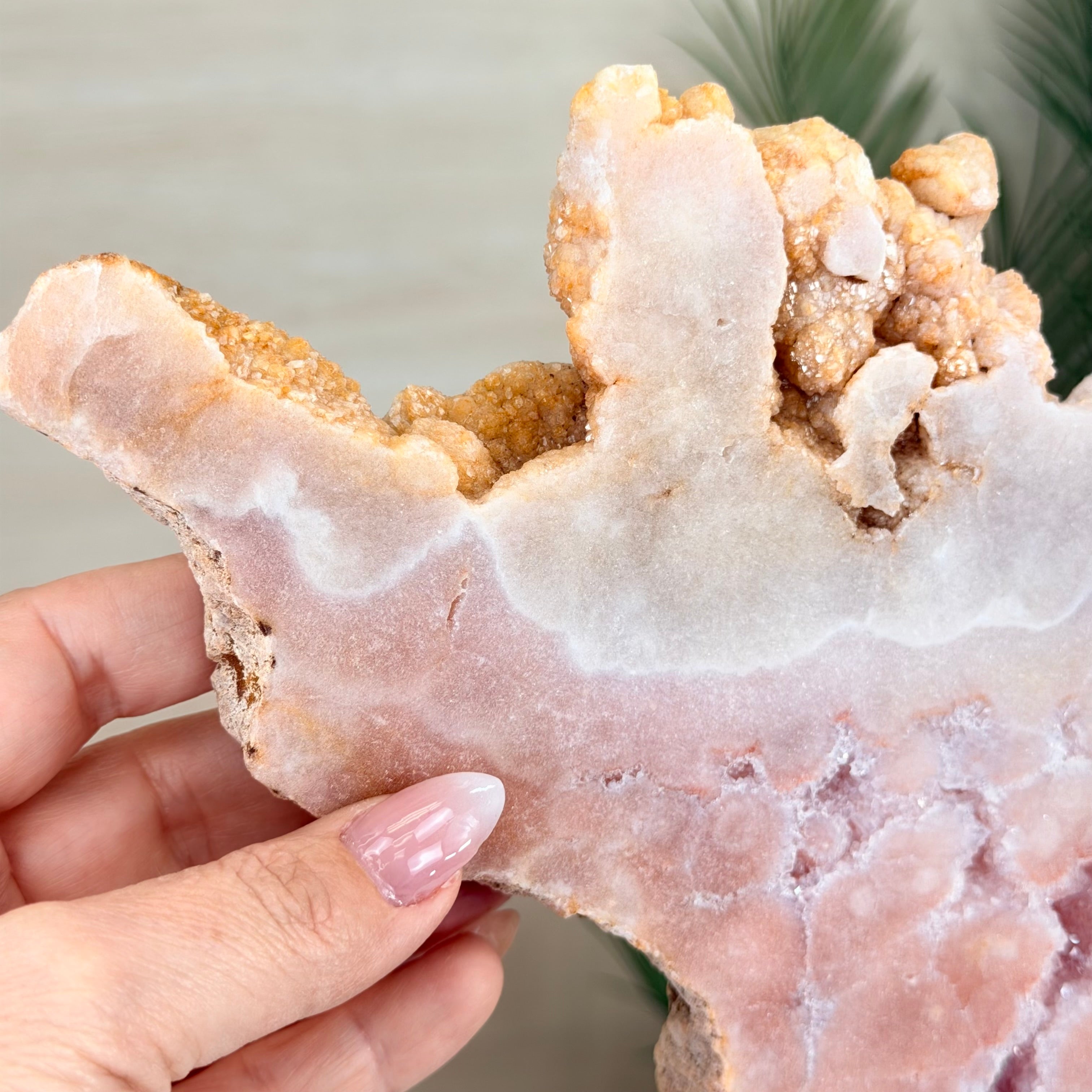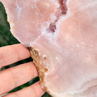 A polished Brazilian Pink Amethyst slice on a metal stand, featuring soft natural hues and a unique crystal formation. Both sides are polished smooth, highlighting the uniqueness of each piece.