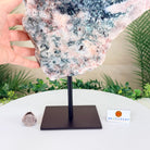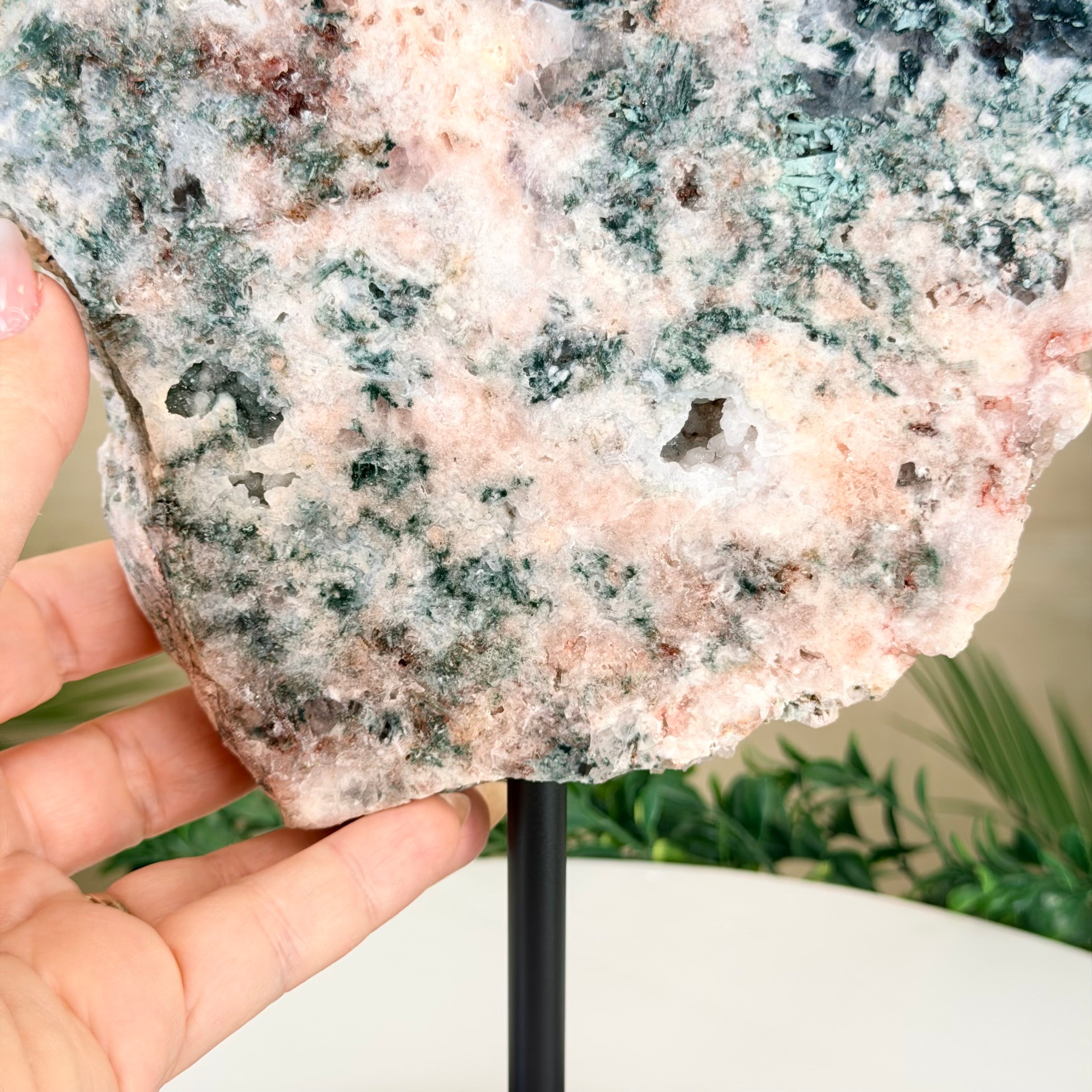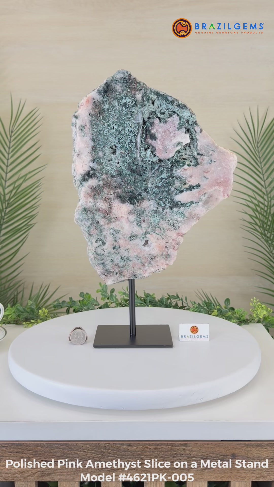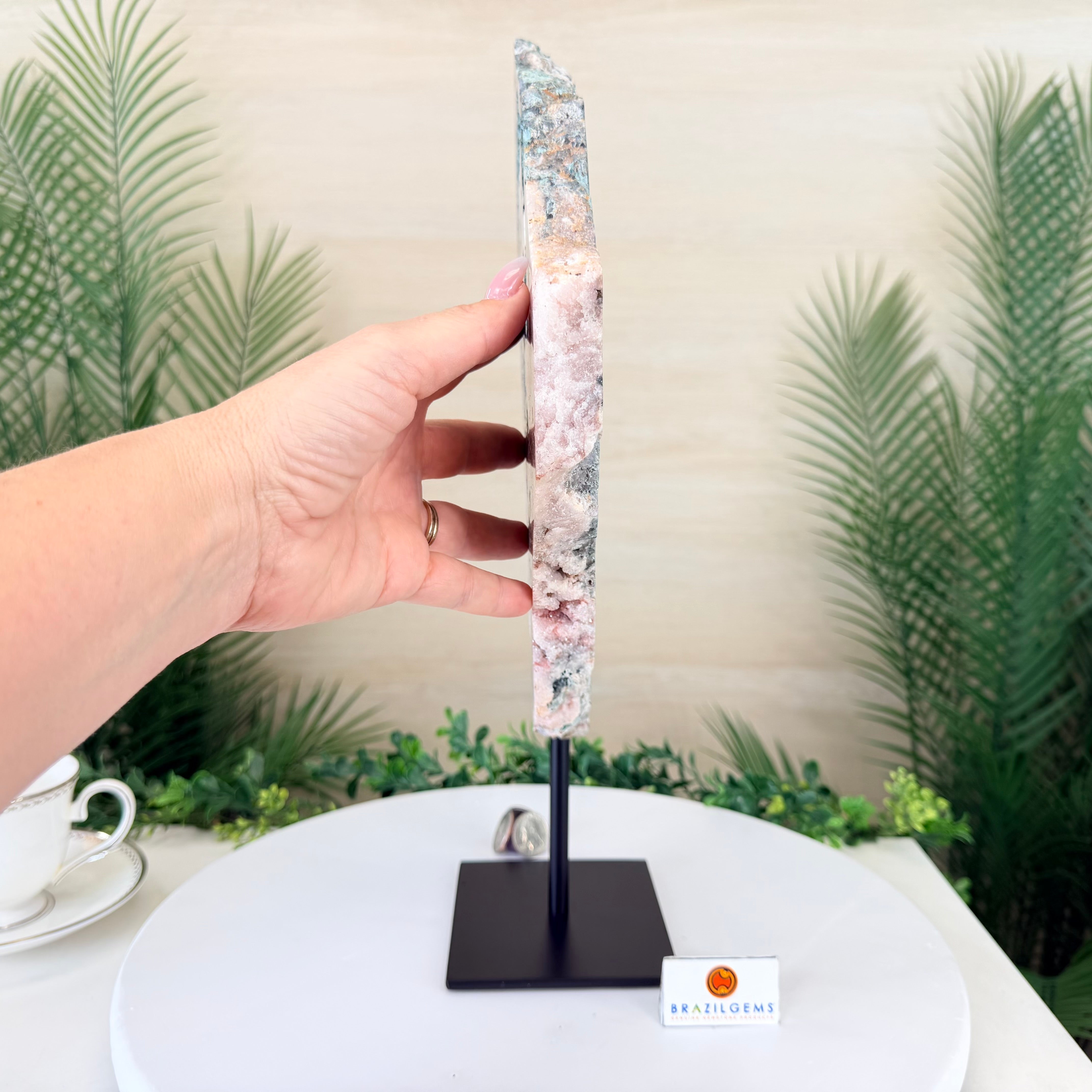 A polished Brazilian Pink Amethyst slice on a metal stand, featuring soft natural hues and a unique crystal formation. Both sides are polished smooth, highlighting the uniqueness of each piece.