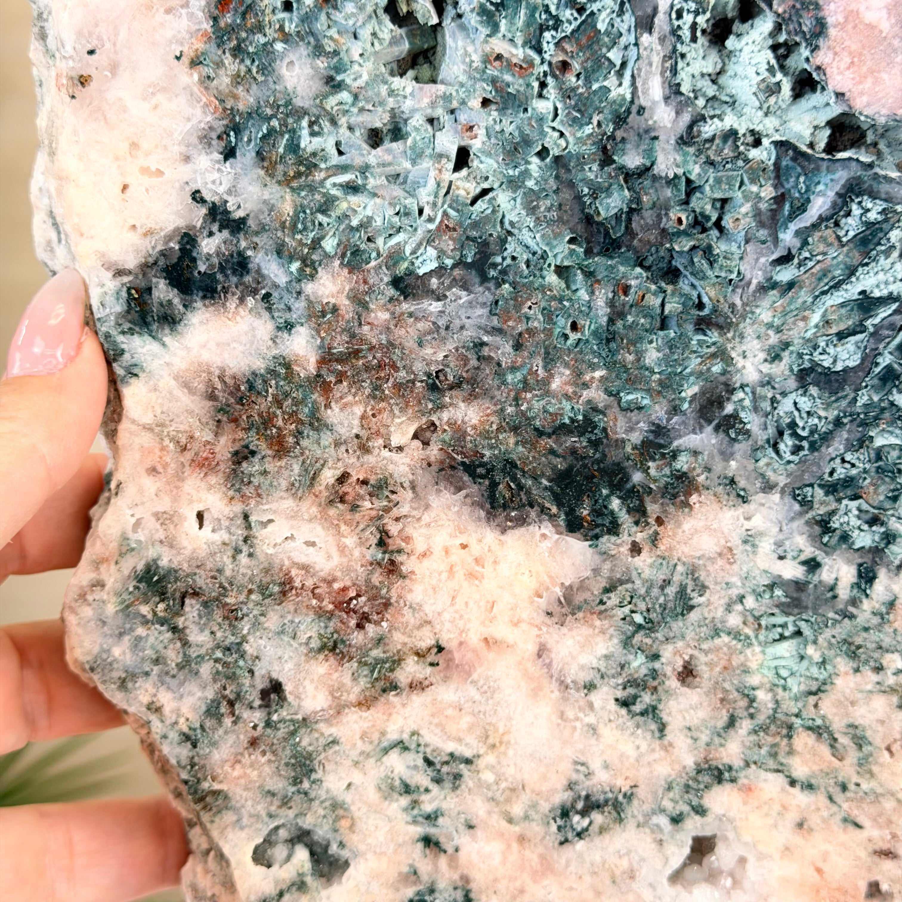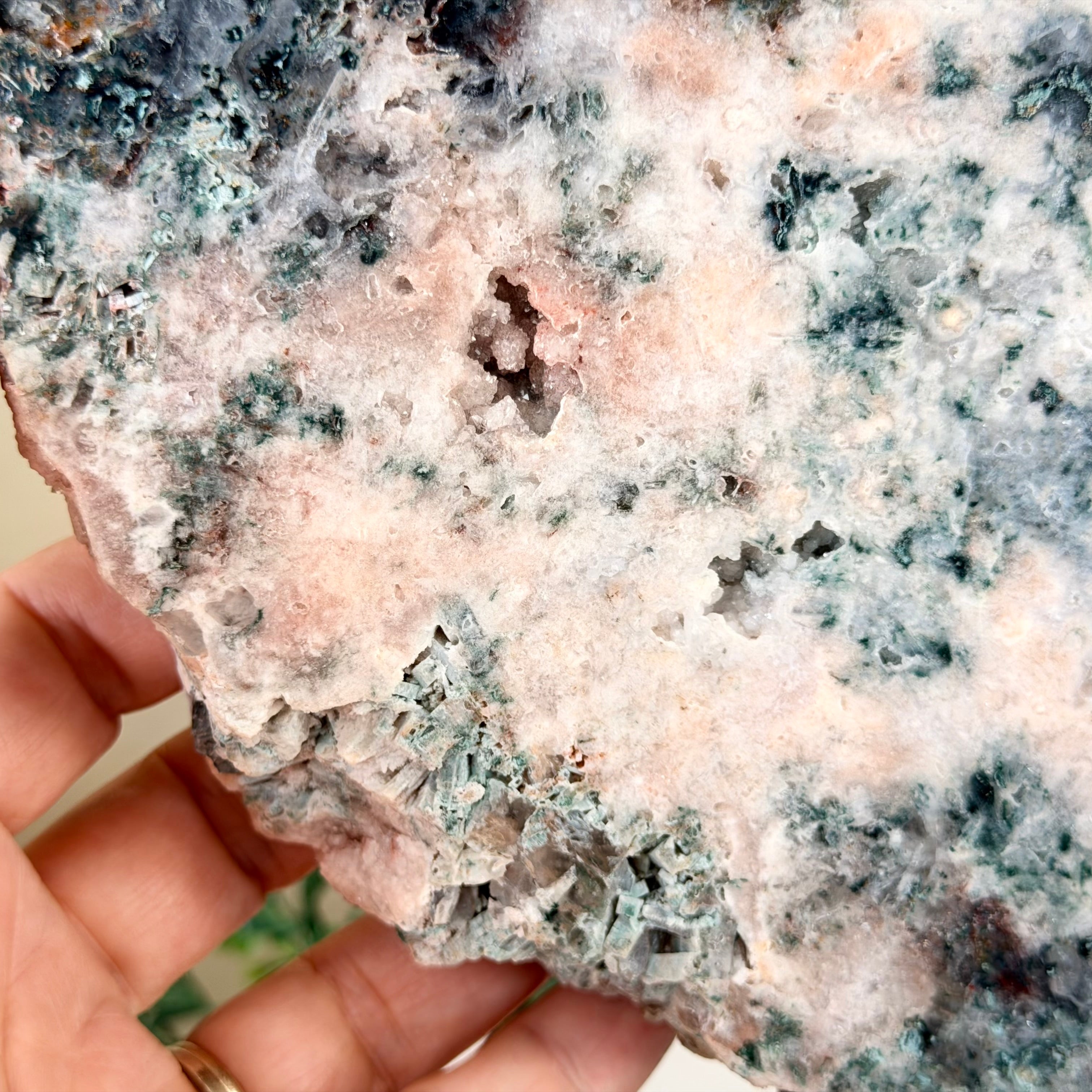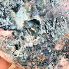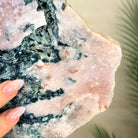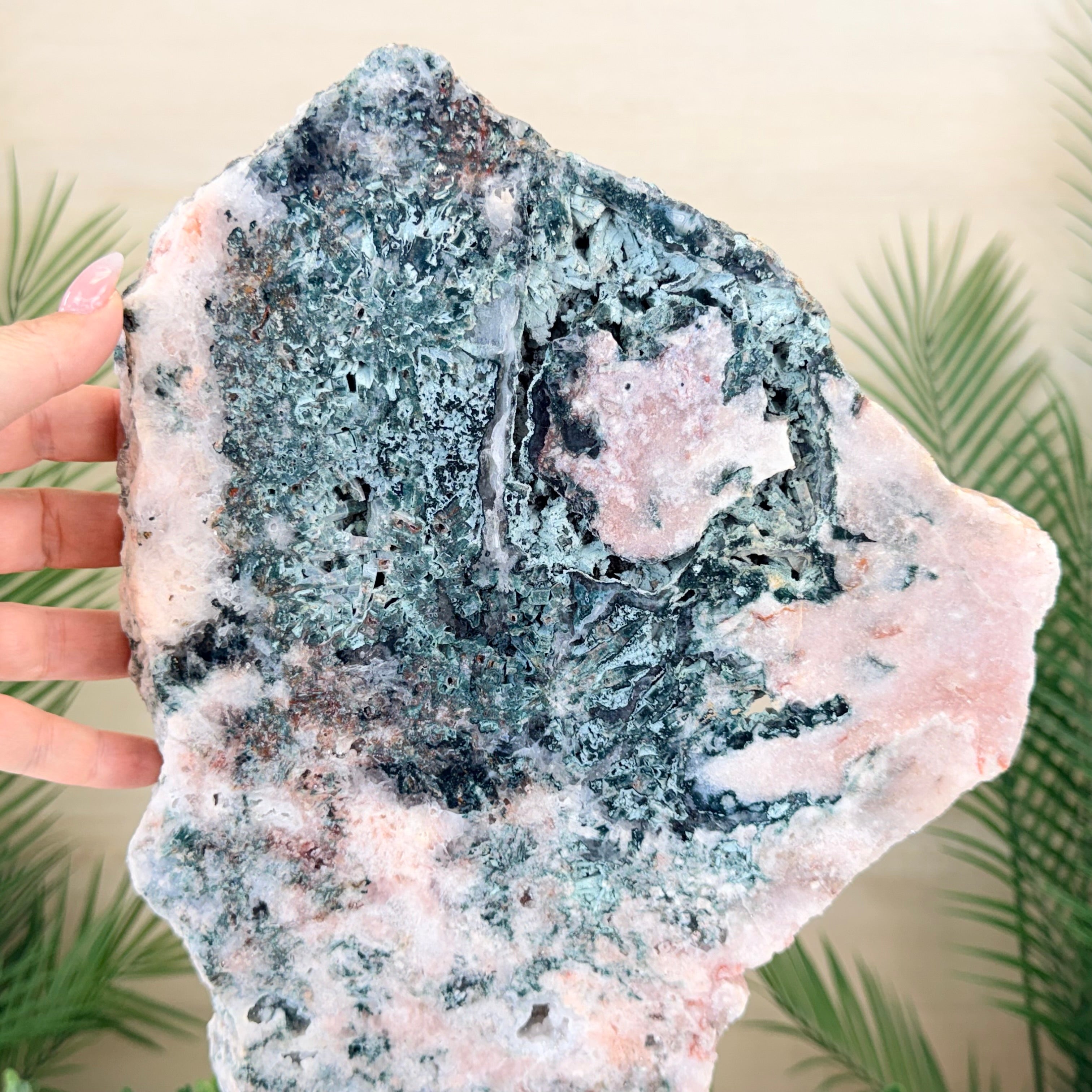 A polished Brazilian Pink Amethyst slice on a metal stand, featuring soft natural hues and a unique crystal formation. Both sides are polished smooth, highlighting the uniqueness of each piece.