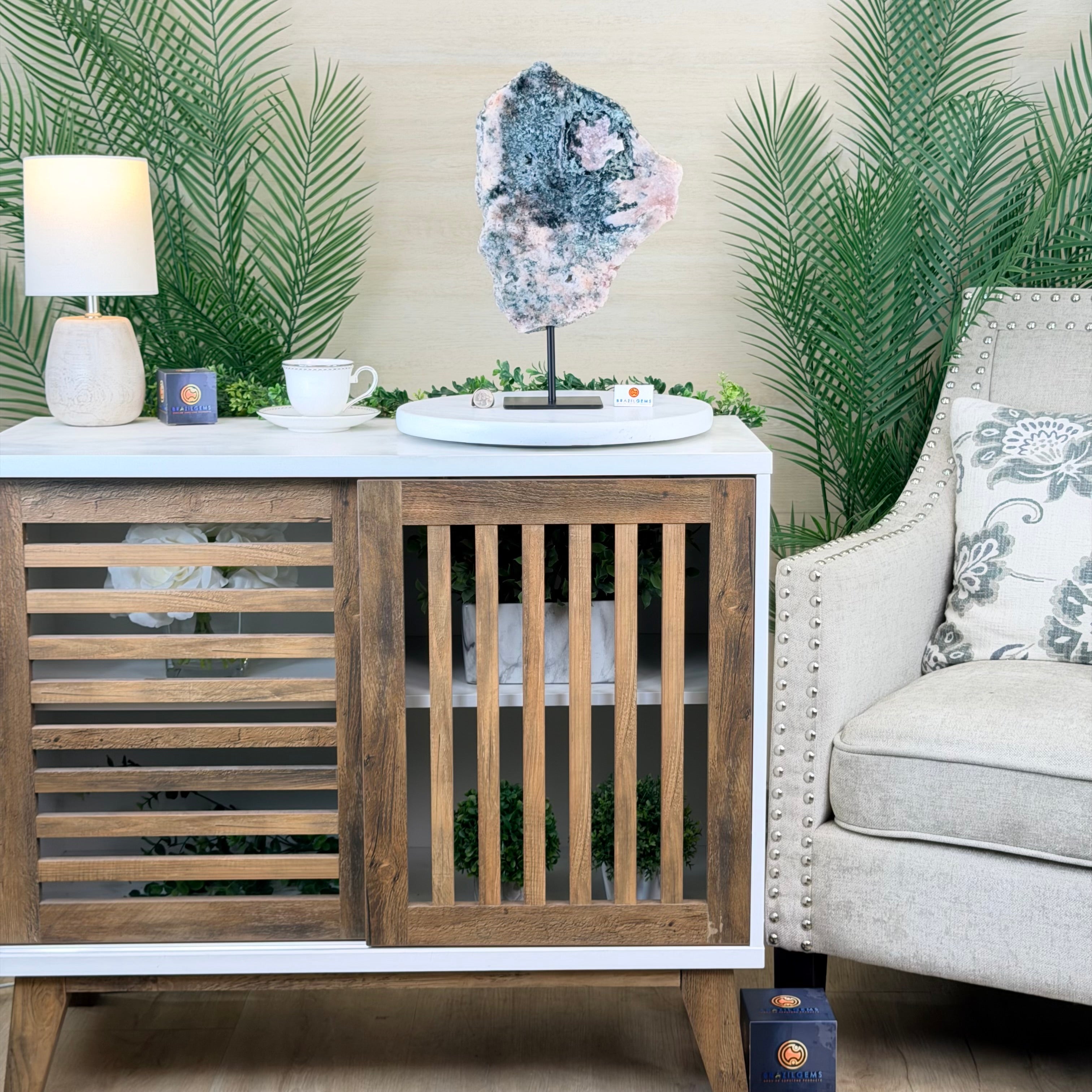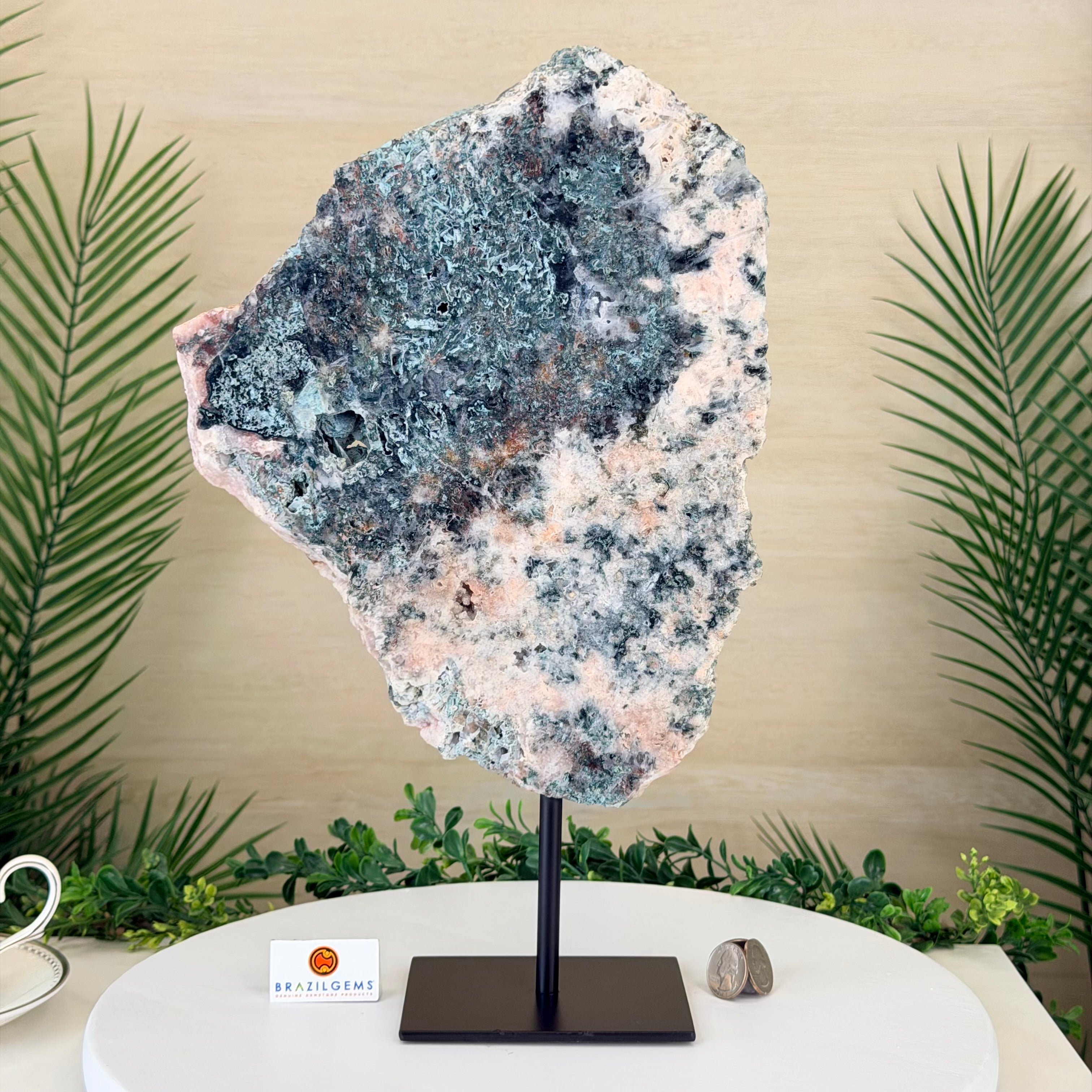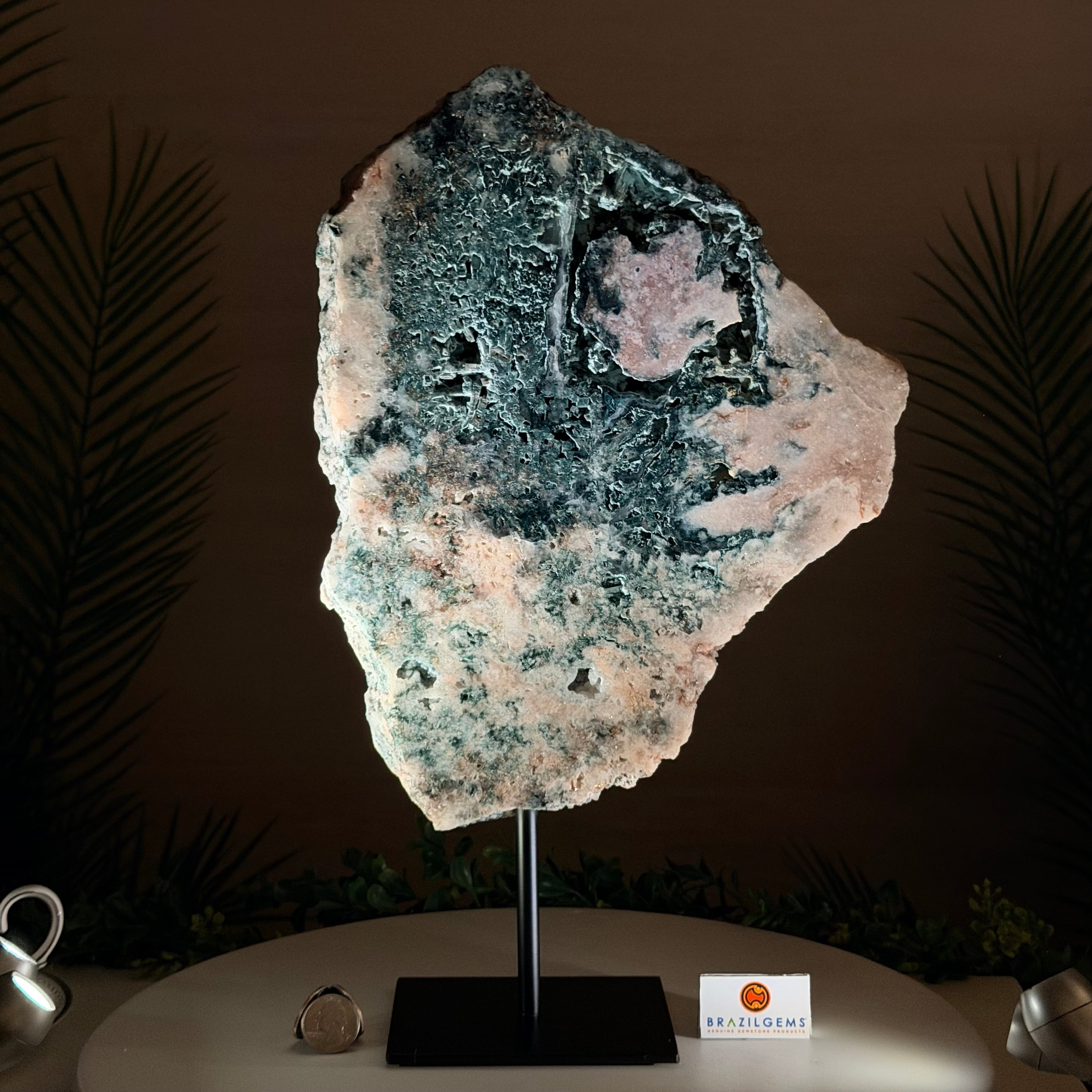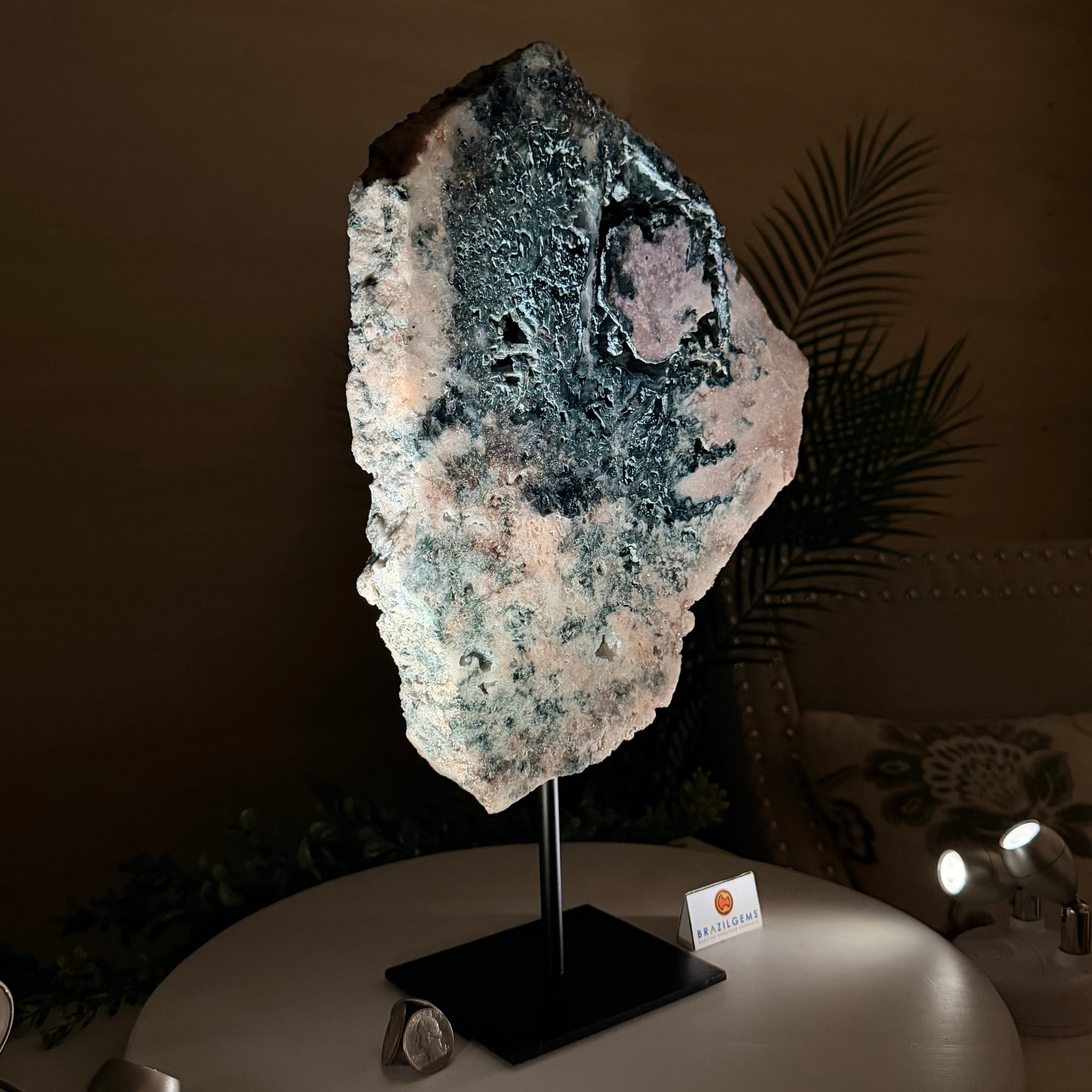 Presented on a modern metal stand, this piece transforms a natural gemstone into a sophisticated décor accent, perfect for adding an elegant, organic touch to any space.