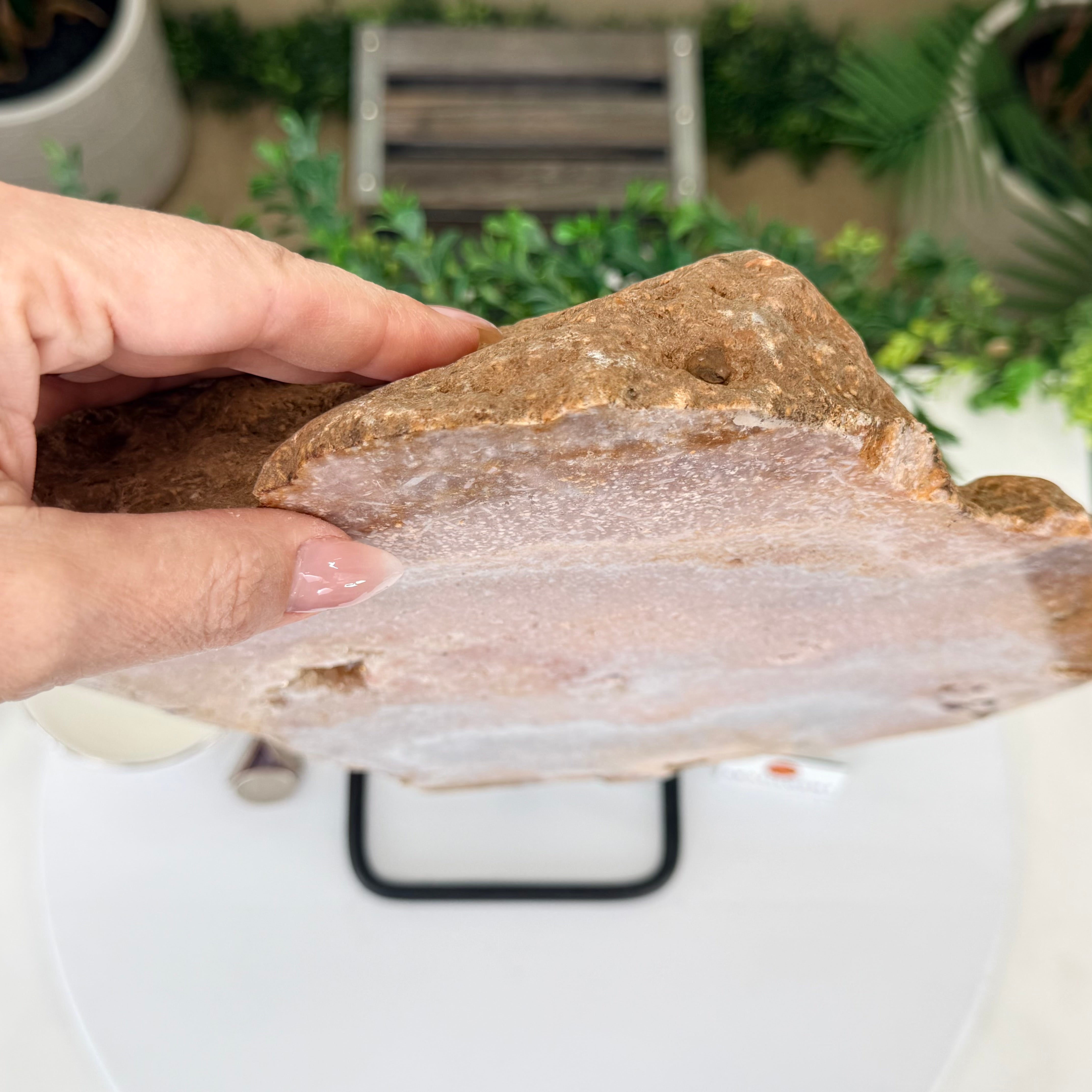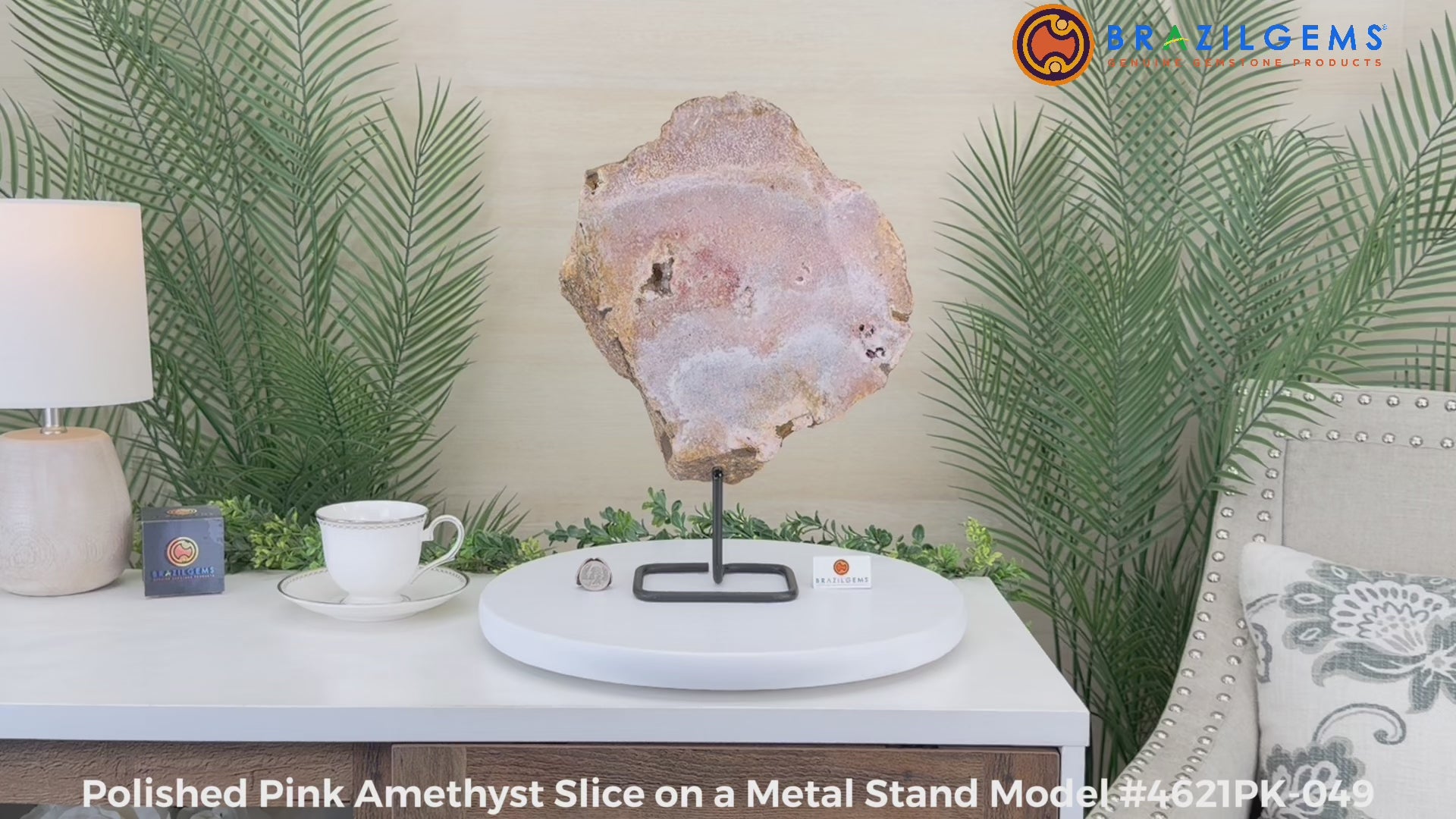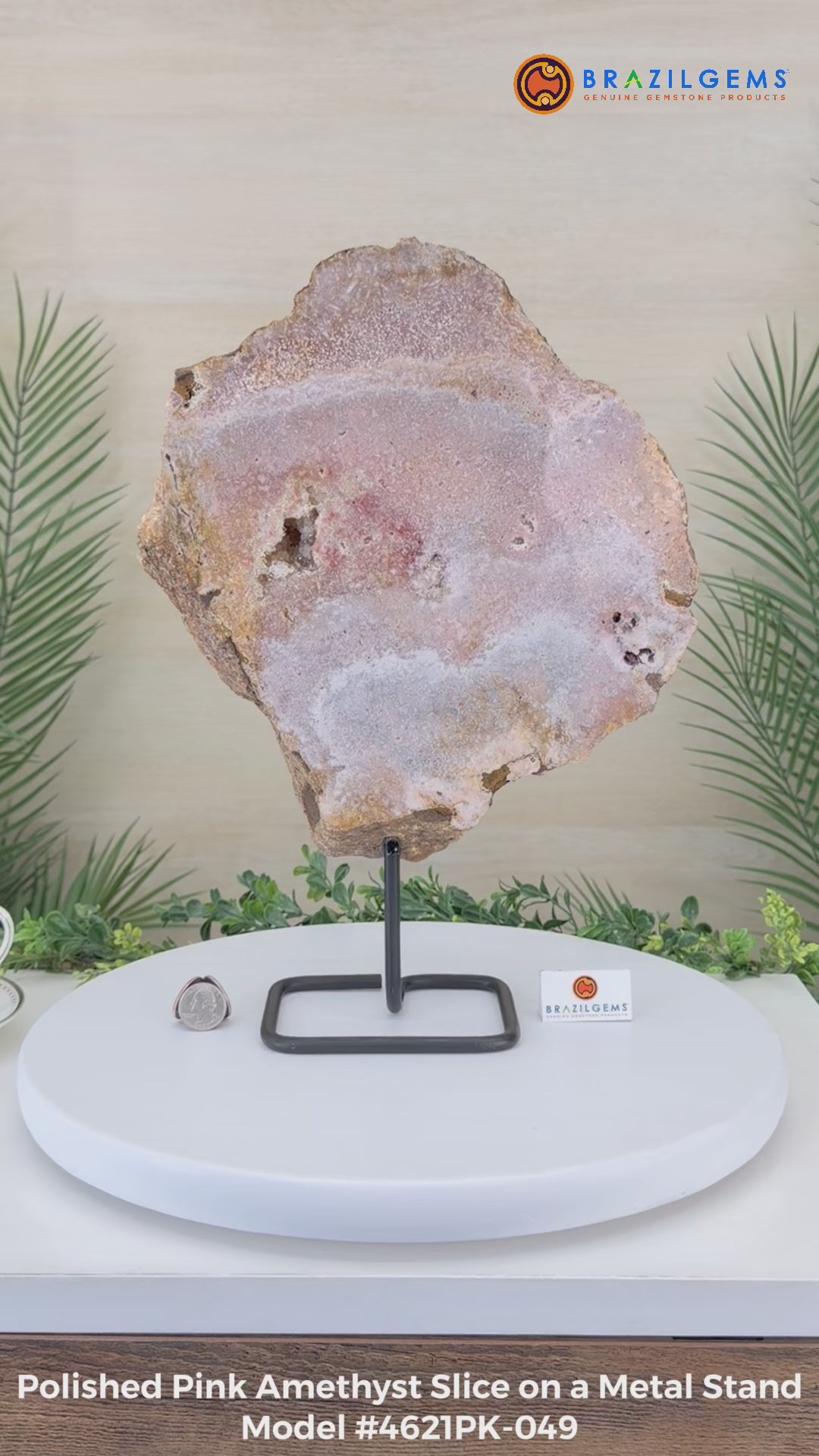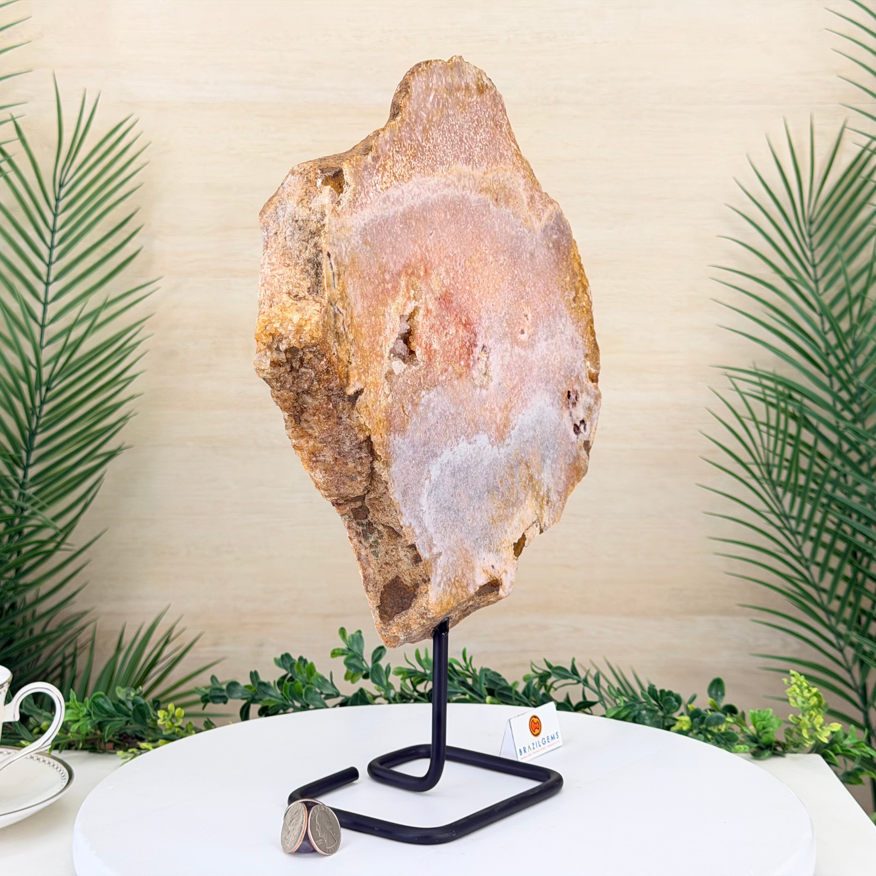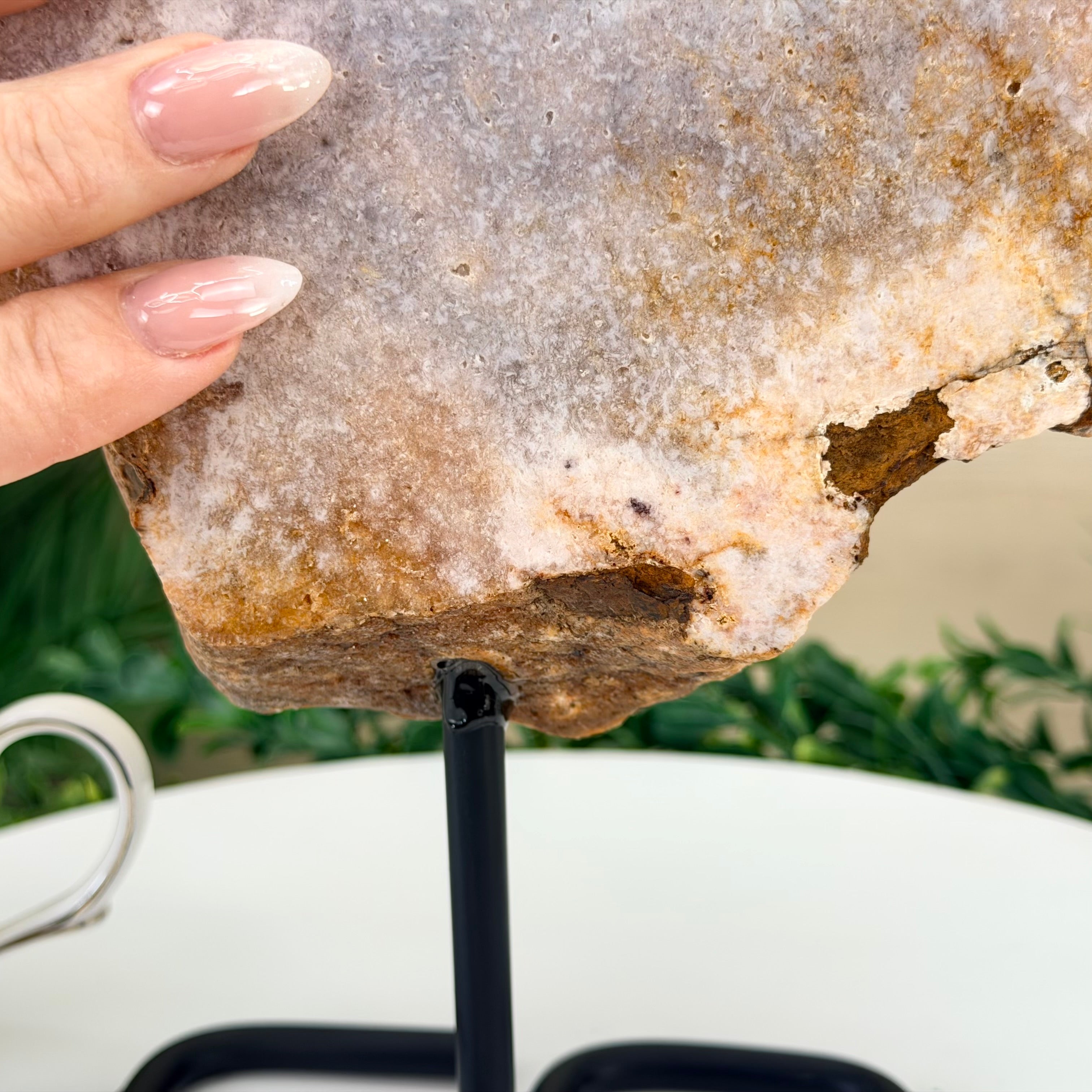 A polished Brazilian Pink Amethyst slice on a metal stand, featuring soft natural hues and a unique crystal formation. Both sides are polished smooth, highlighting the uniqueness of each piece.