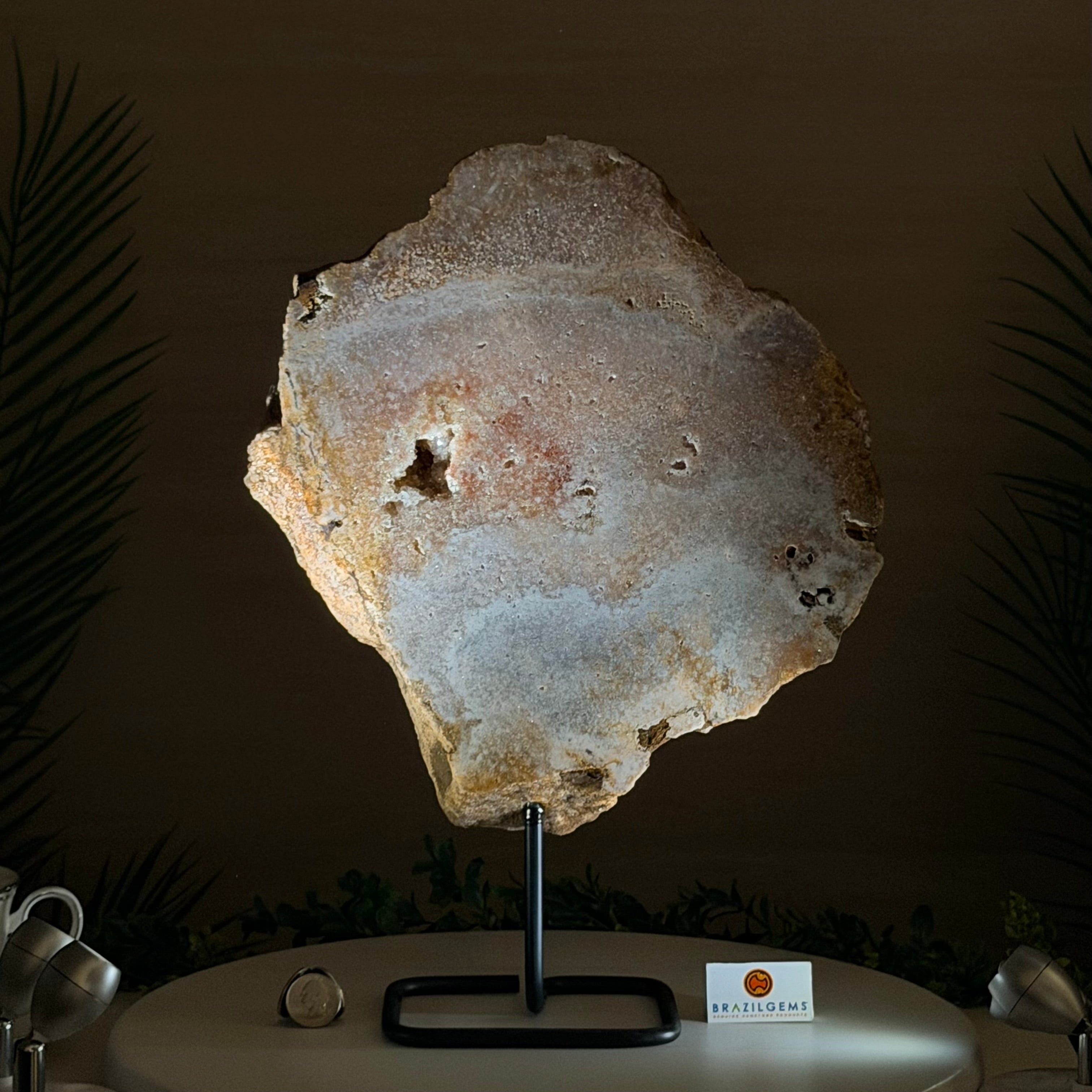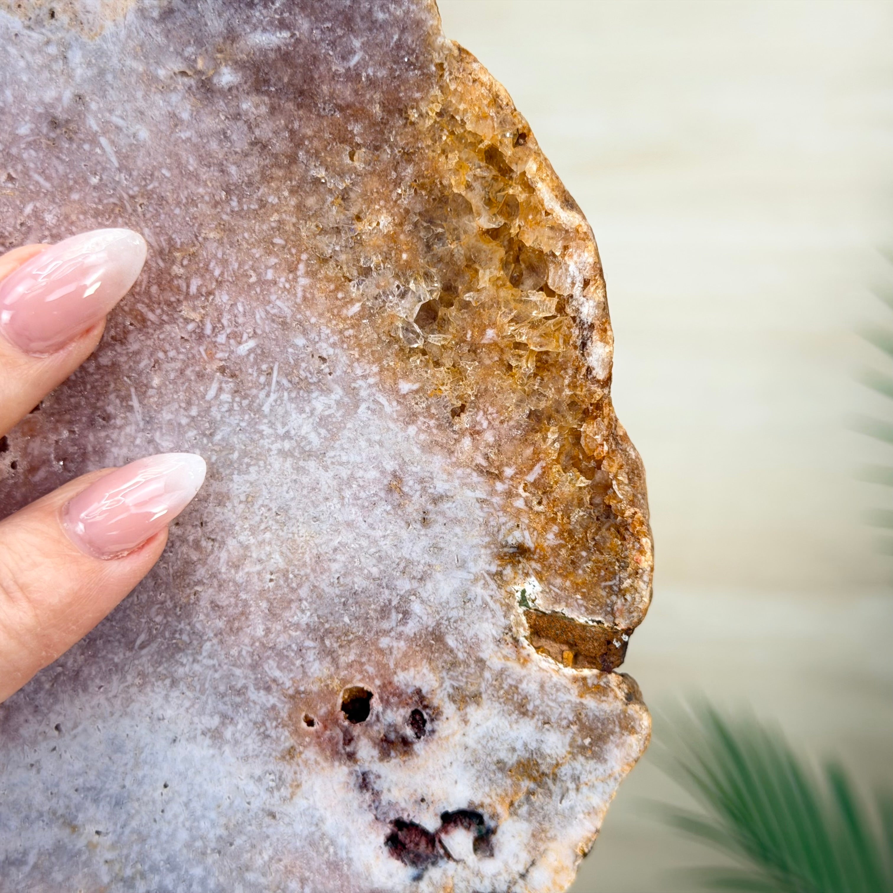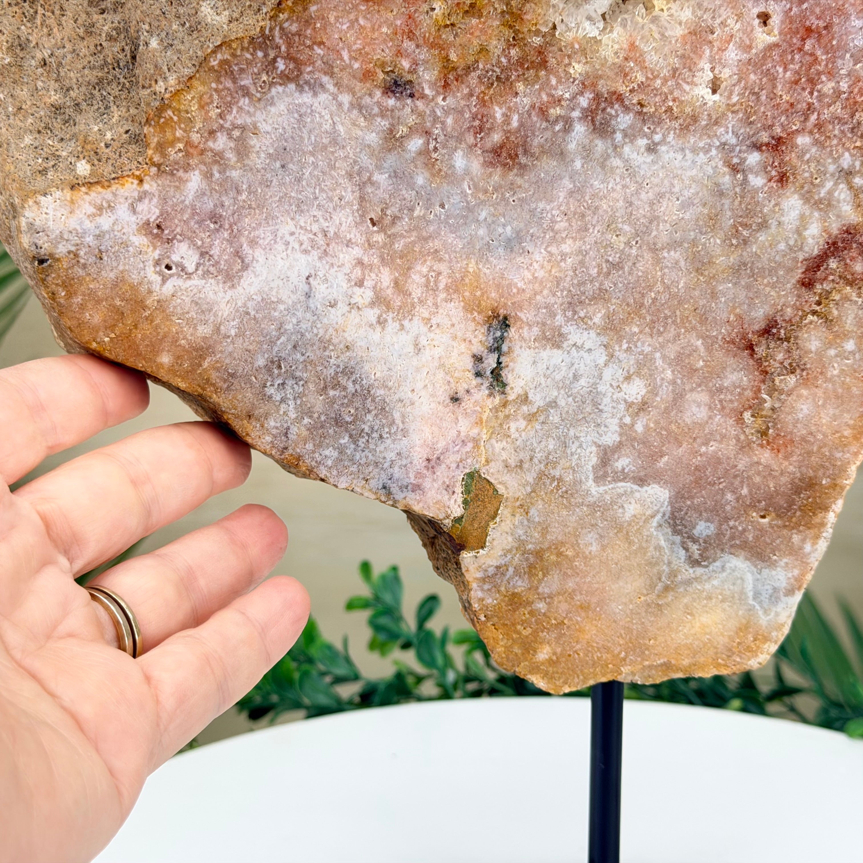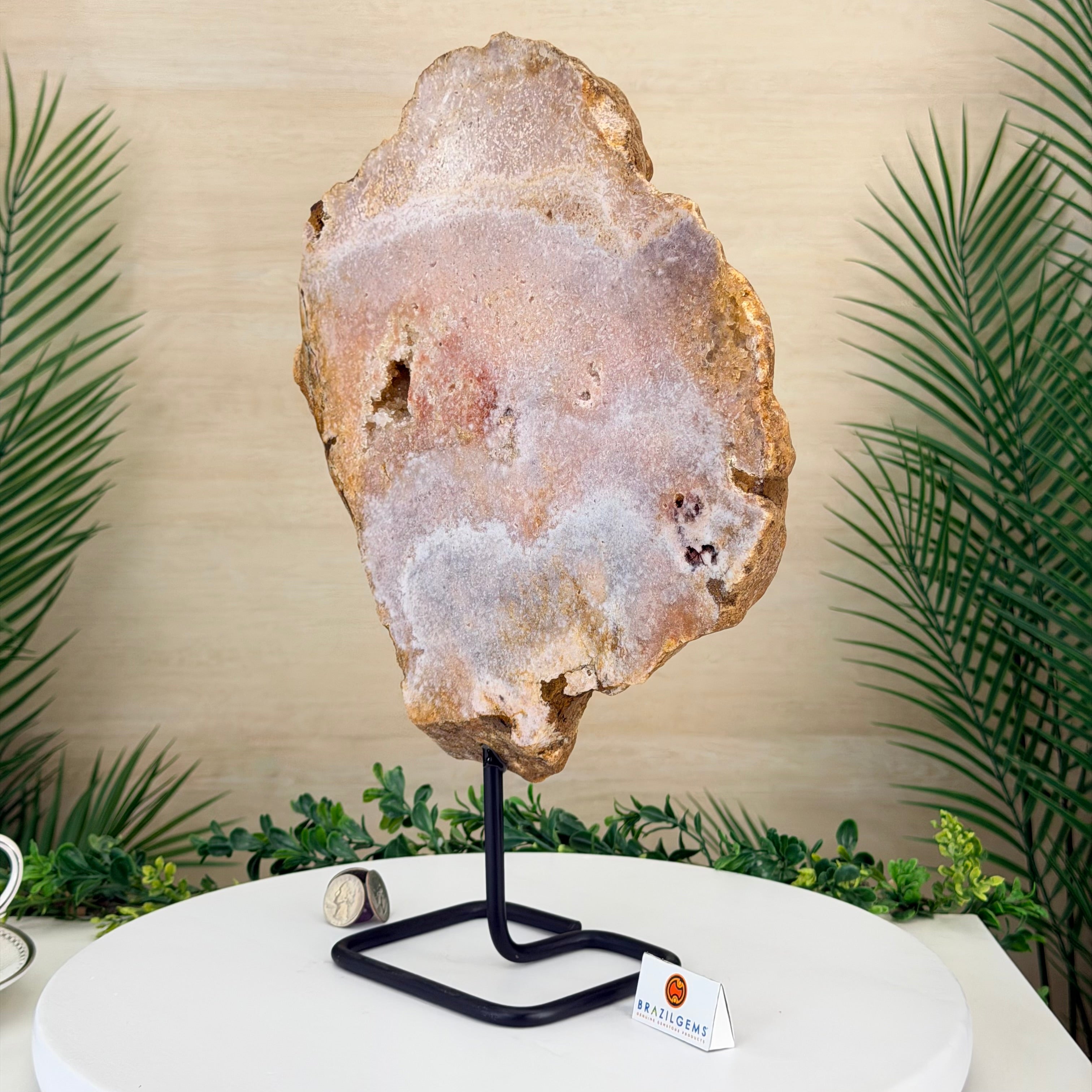 A polished Brazilian Pink Amethyst slice on a metal stand, featuring soft natural hues and a unique crystal formation. Both sides are polished smooth, highlighting the uniqueness of each piece.