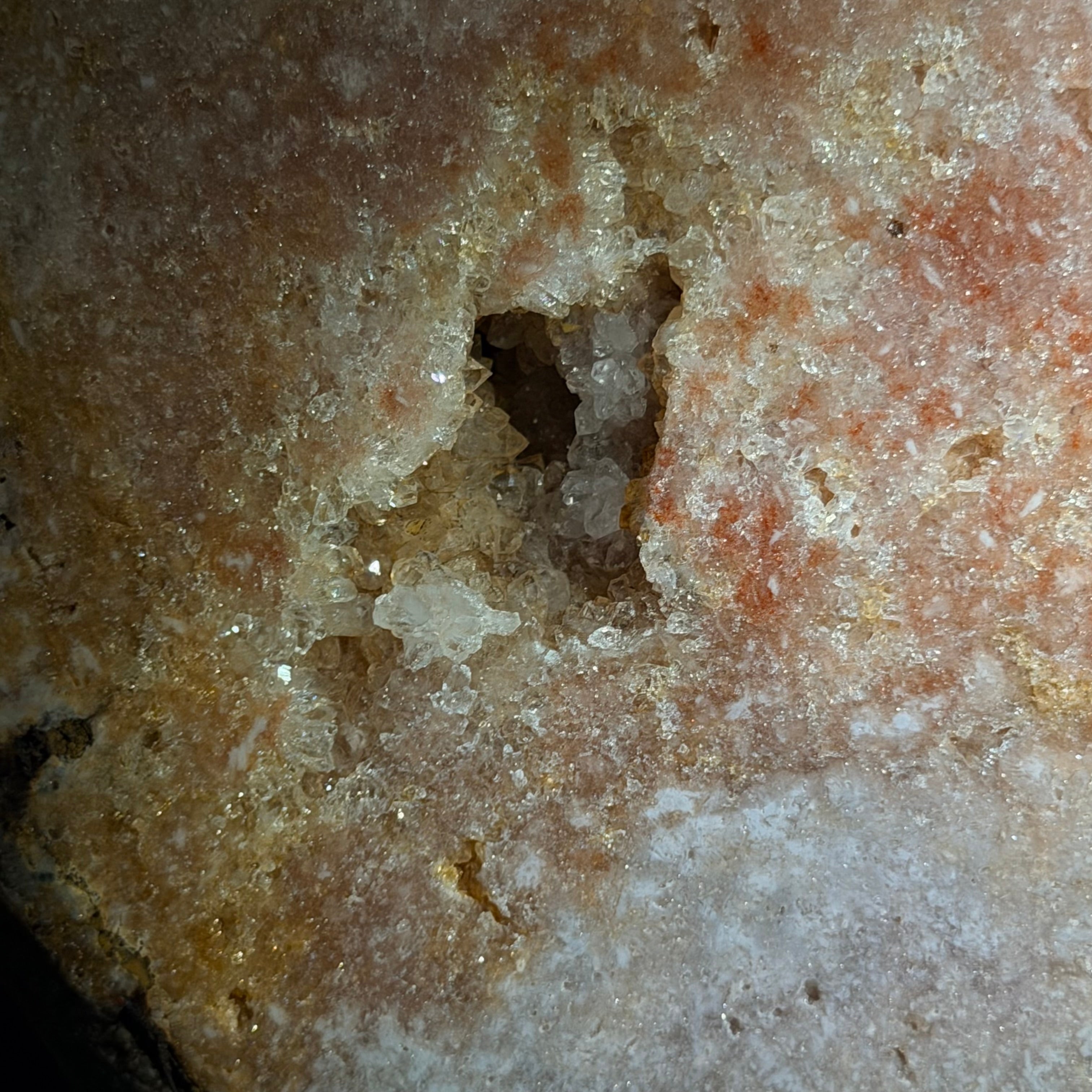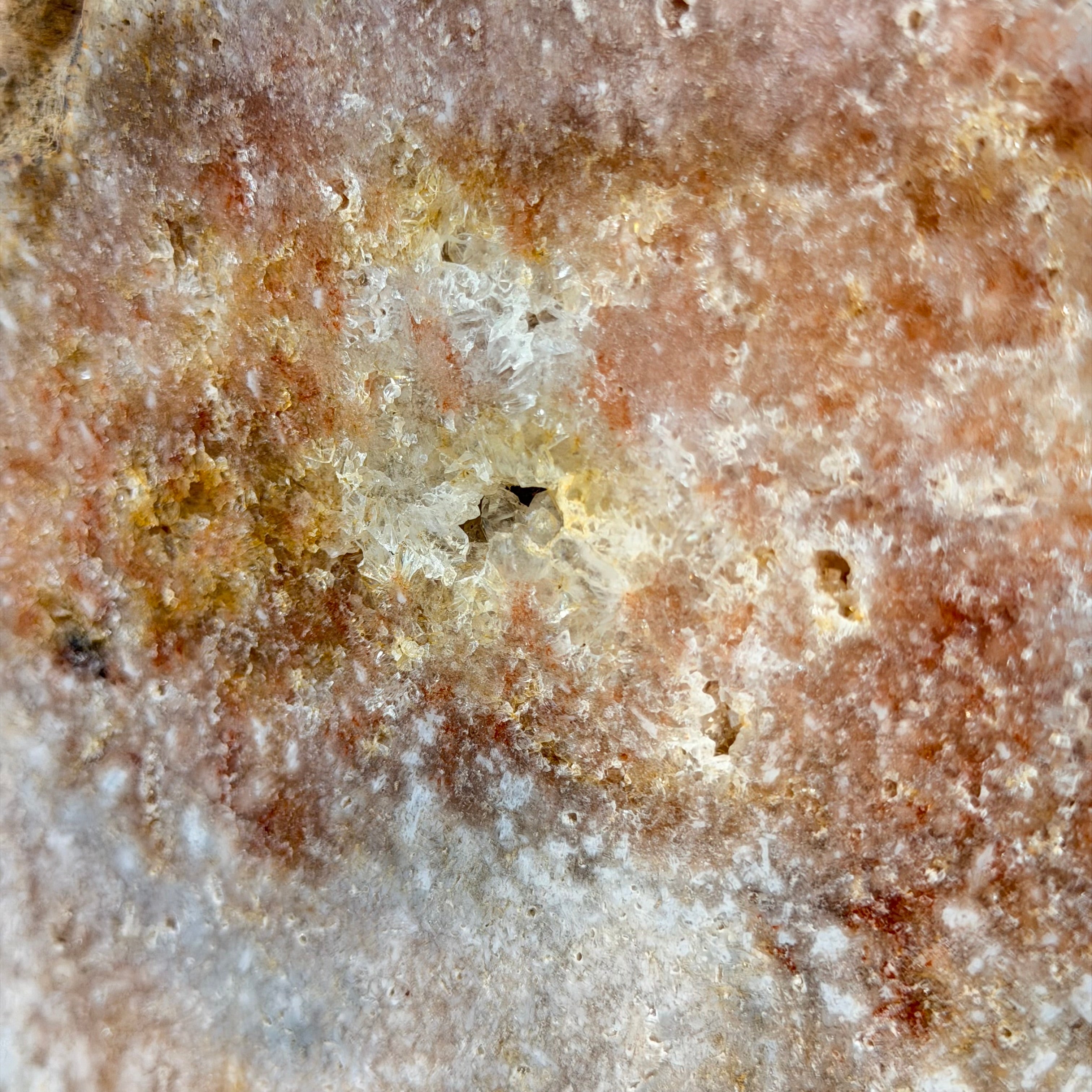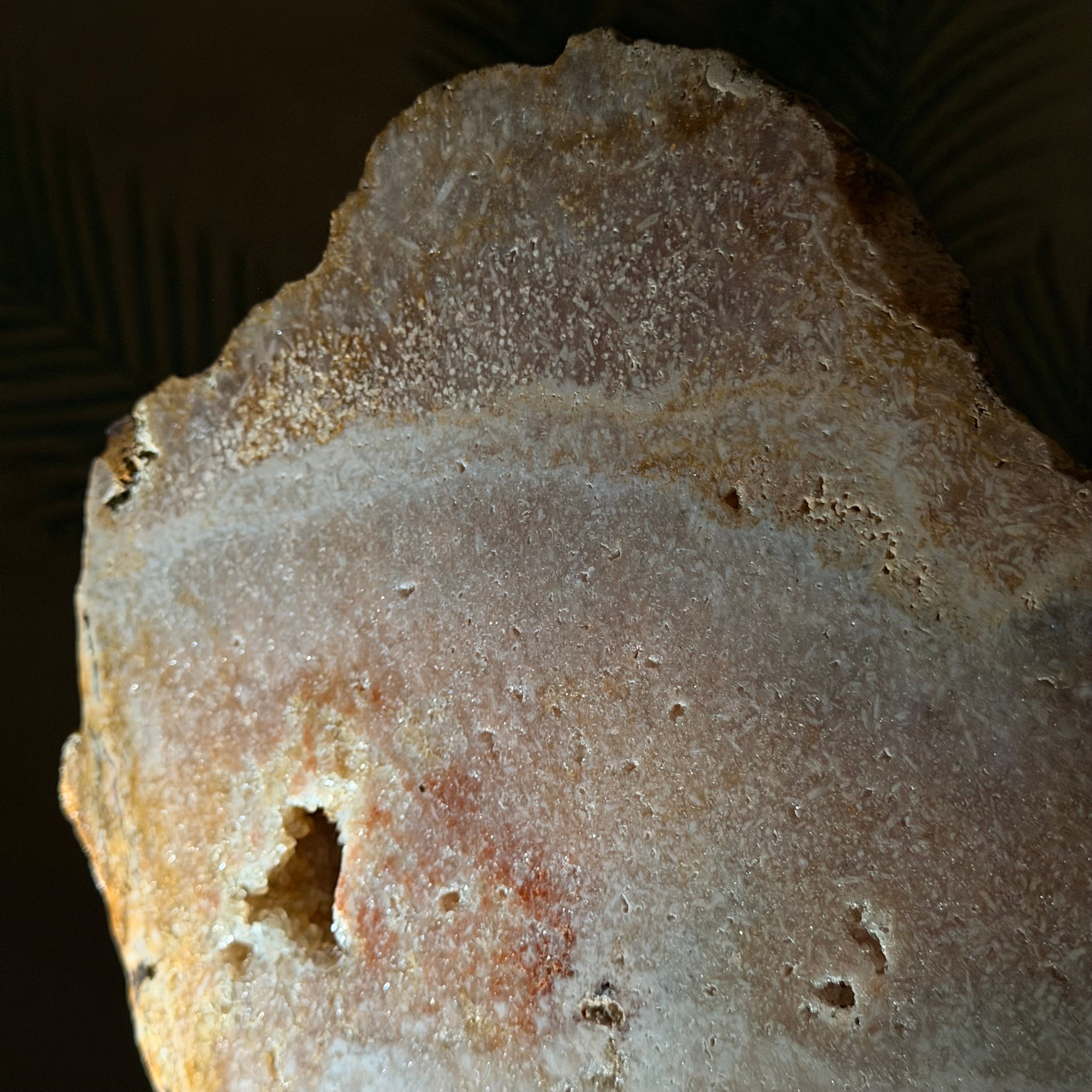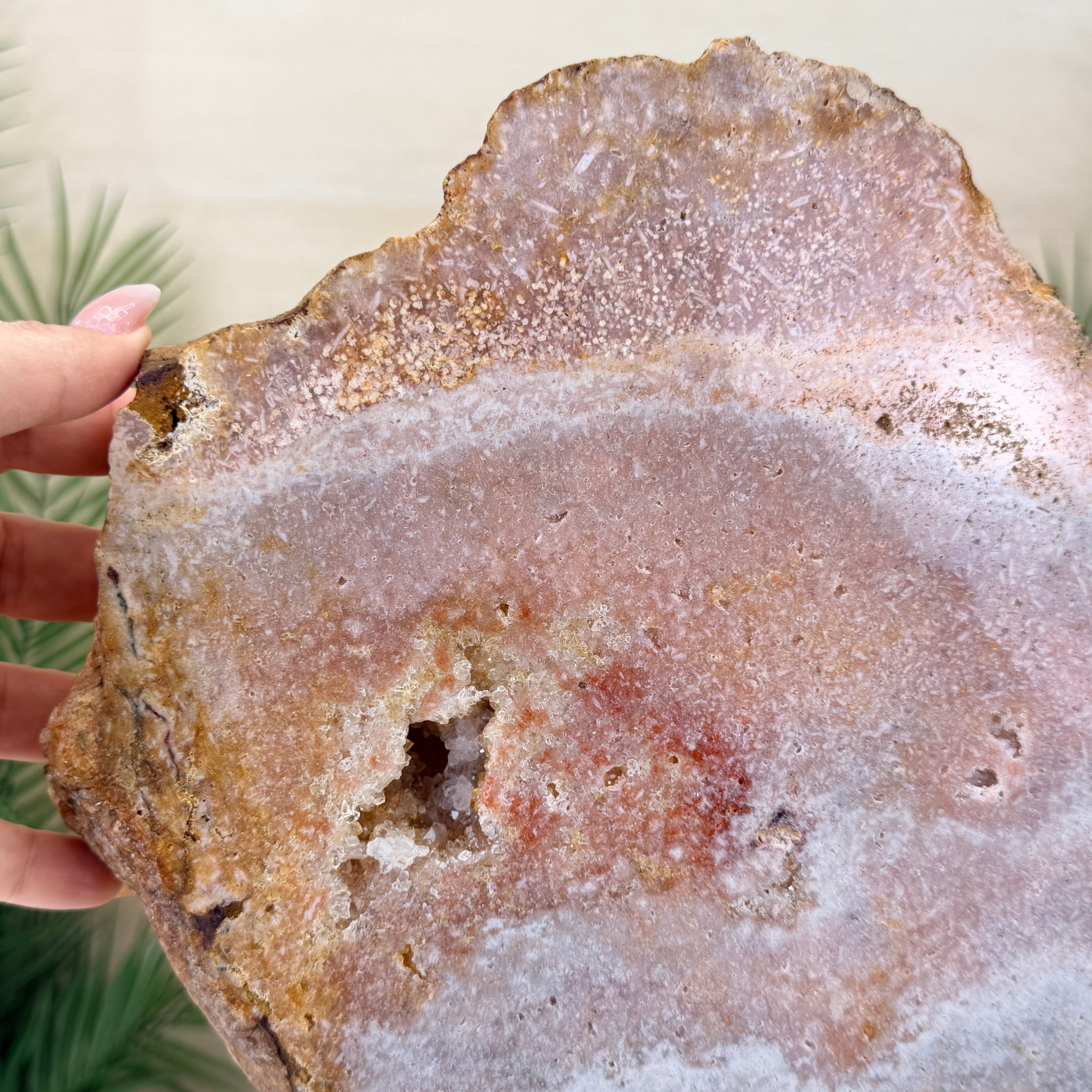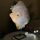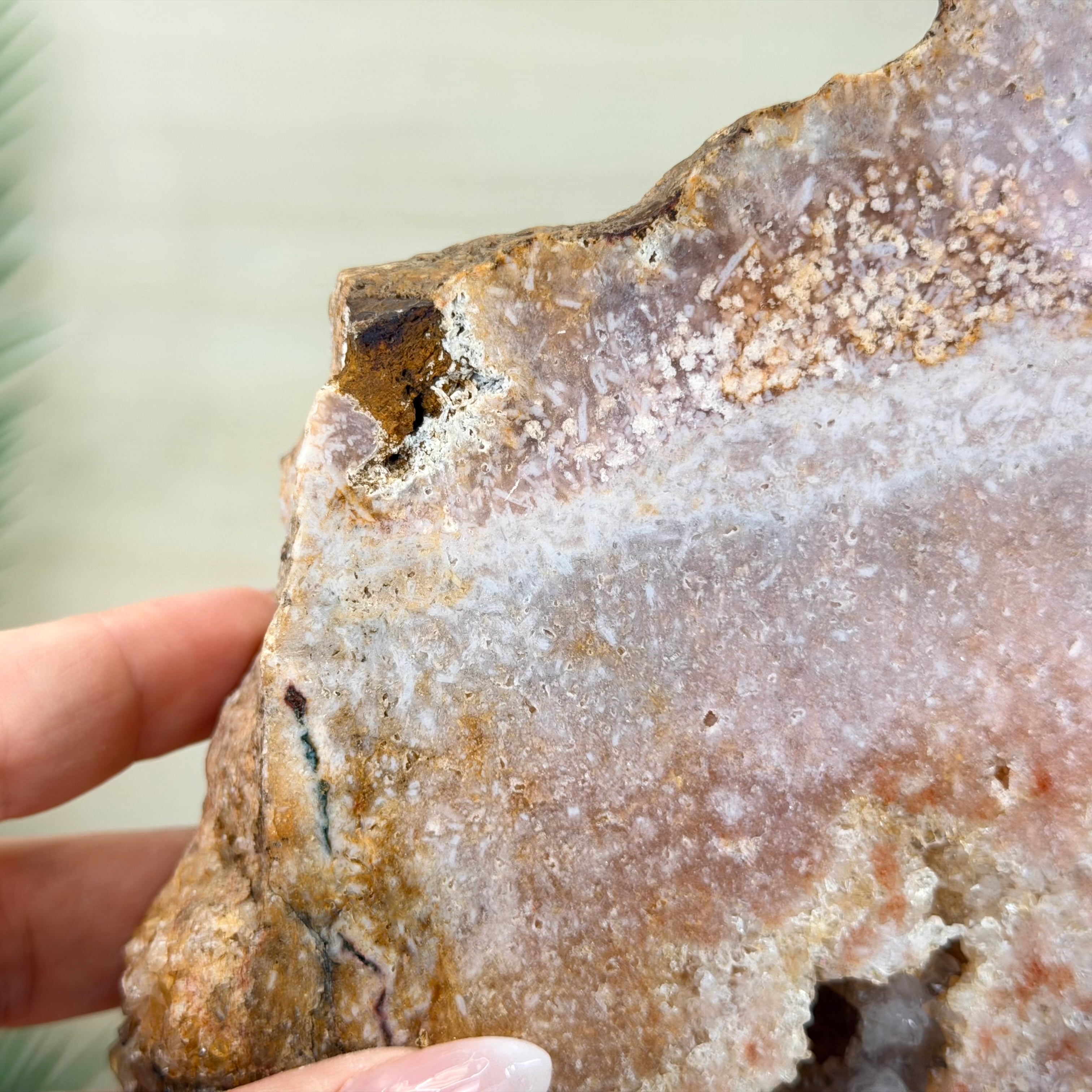 A polished Brazilian Pink Amethyst slice on a metal stand, featuring soft natural hues and a unique crystal formation. Both sides are polished smooth, highlighting the uniqueness of each piece.