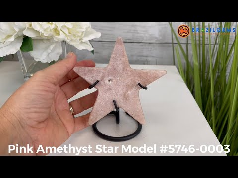 This is a Natural Polished Brazilian Pink Amethyst Star on a metal stand. With its polished edges and natural crystals shining through you'll enjoy this piece for years to come.