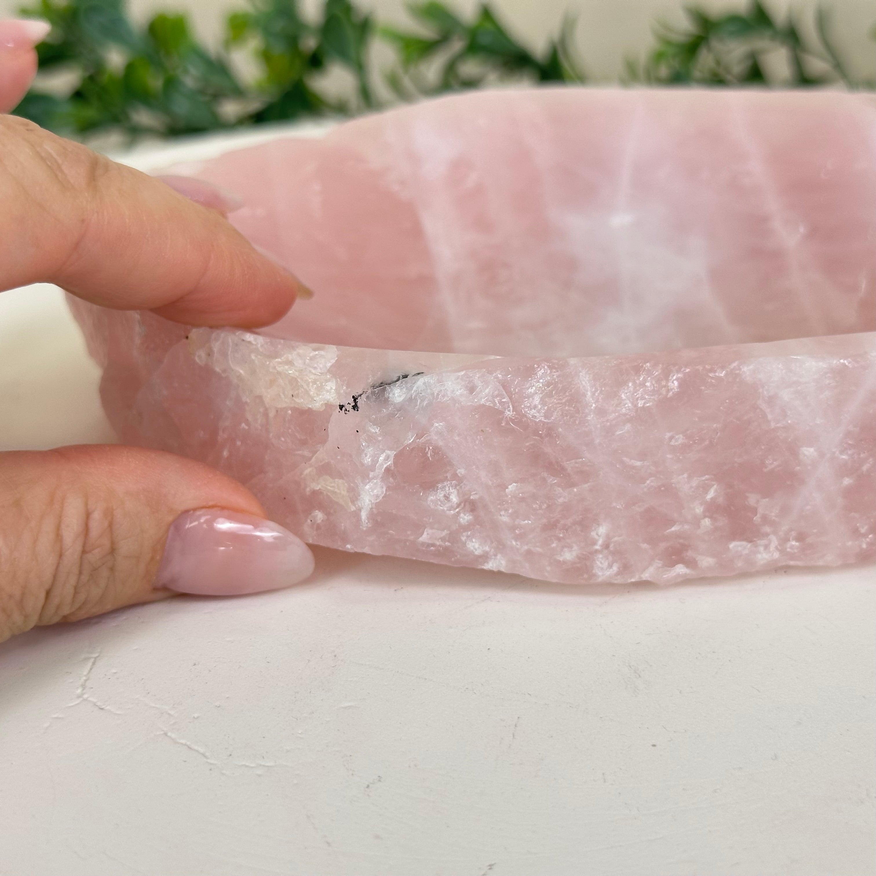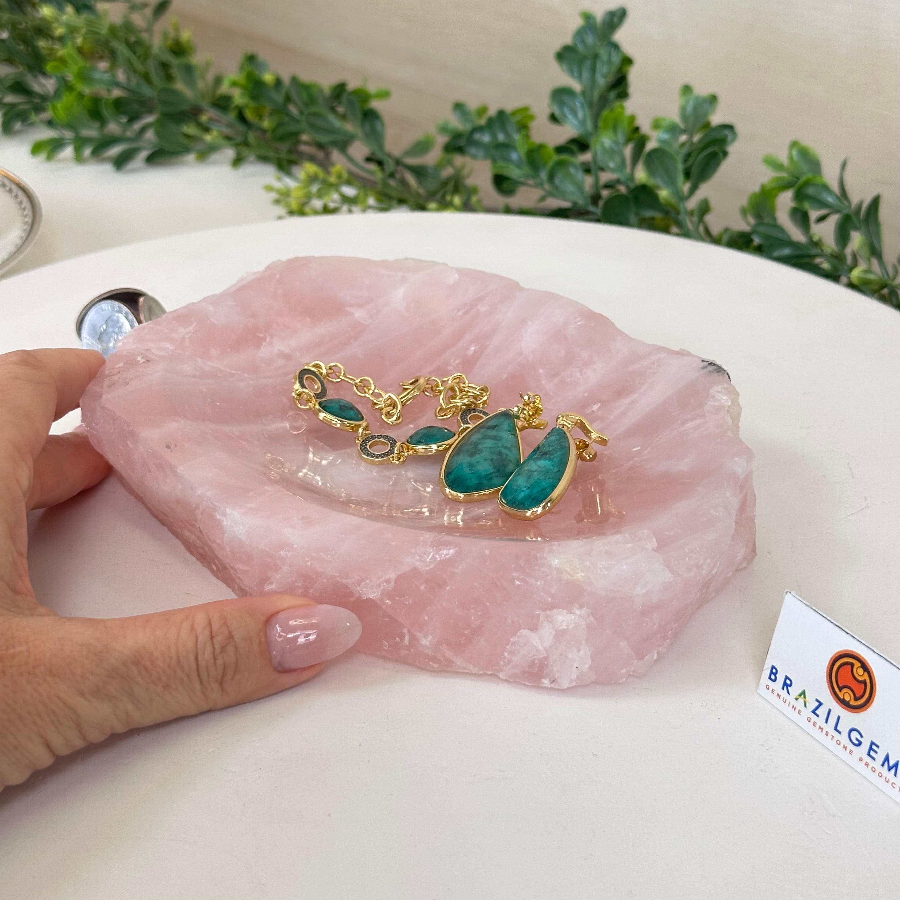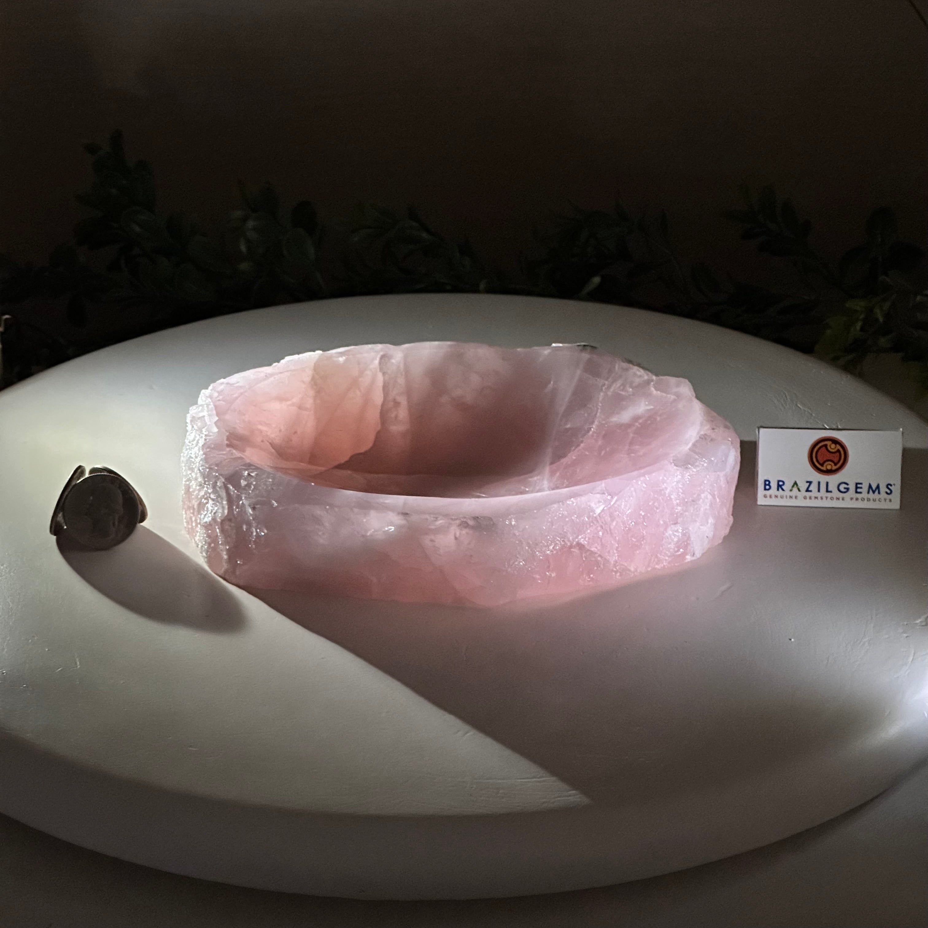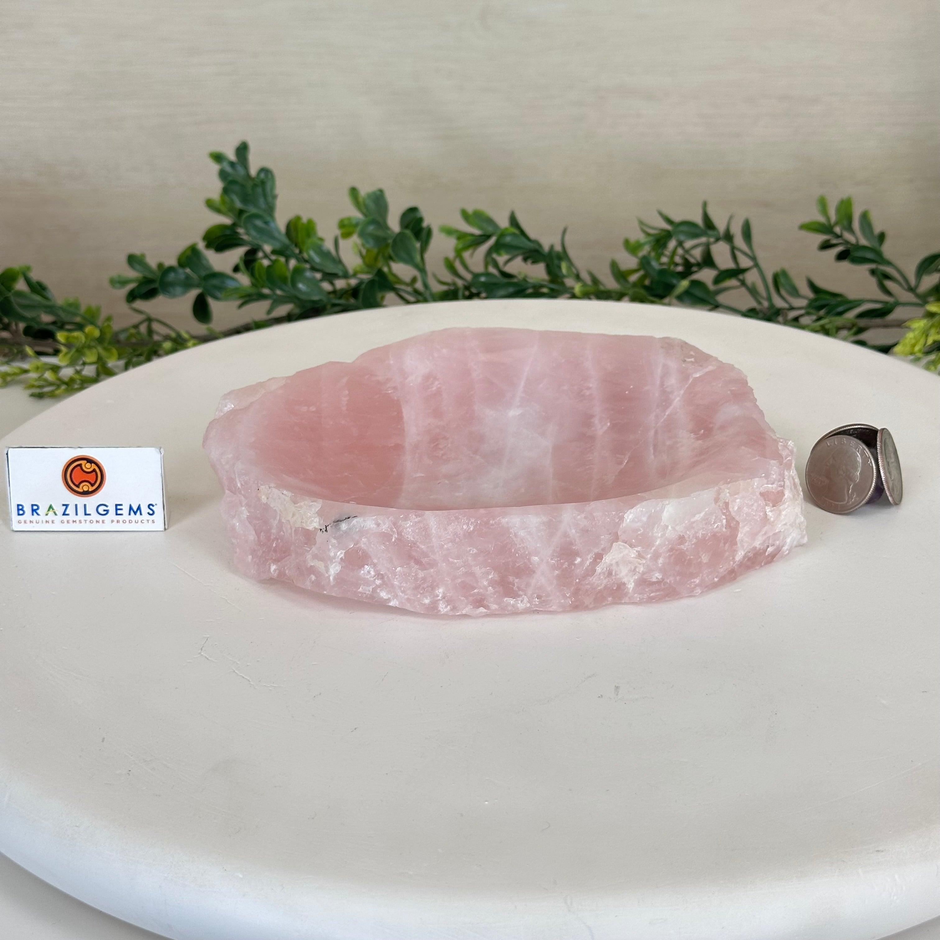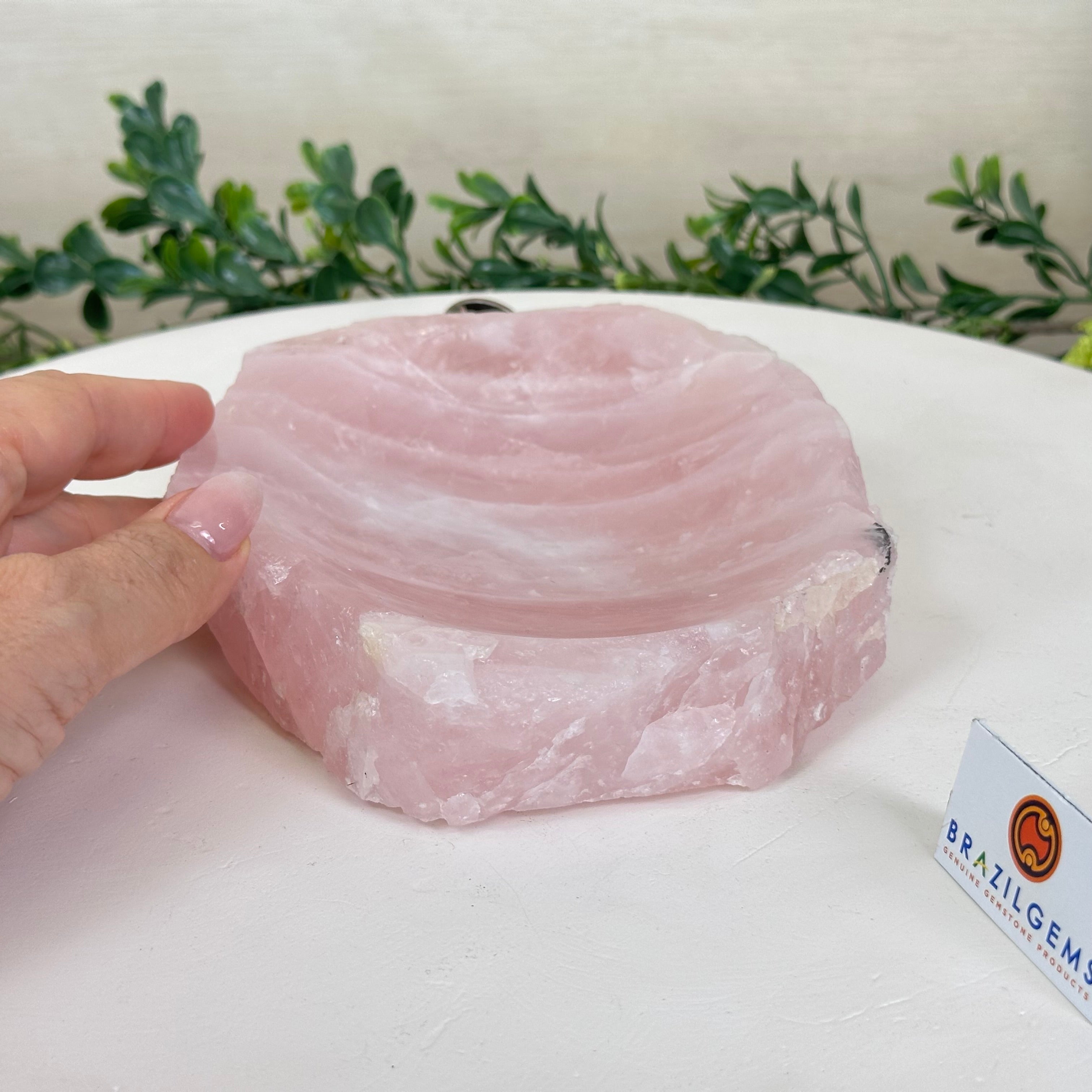 Elegant and versatile, this Rose Quartz decorative bowl is handcrafted from natural Brazilian stone and polished to reveal soft pink and white tones. Use it as a soap dish, jewelry and ring holder, or a decorative catch-all for small items like crystals, keys, or loose change. Its smooth, durable surface makes it ideal for bathroom countertops, bedside tables, or entryway décor. Its edges are rough and not polished.