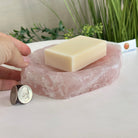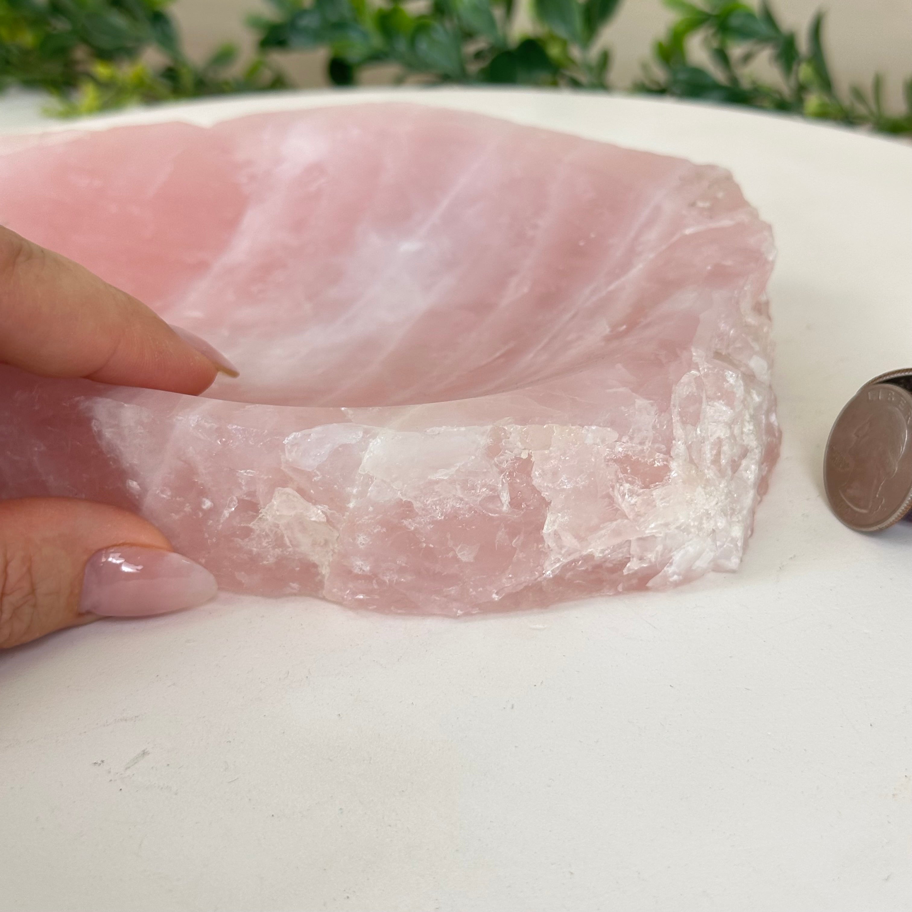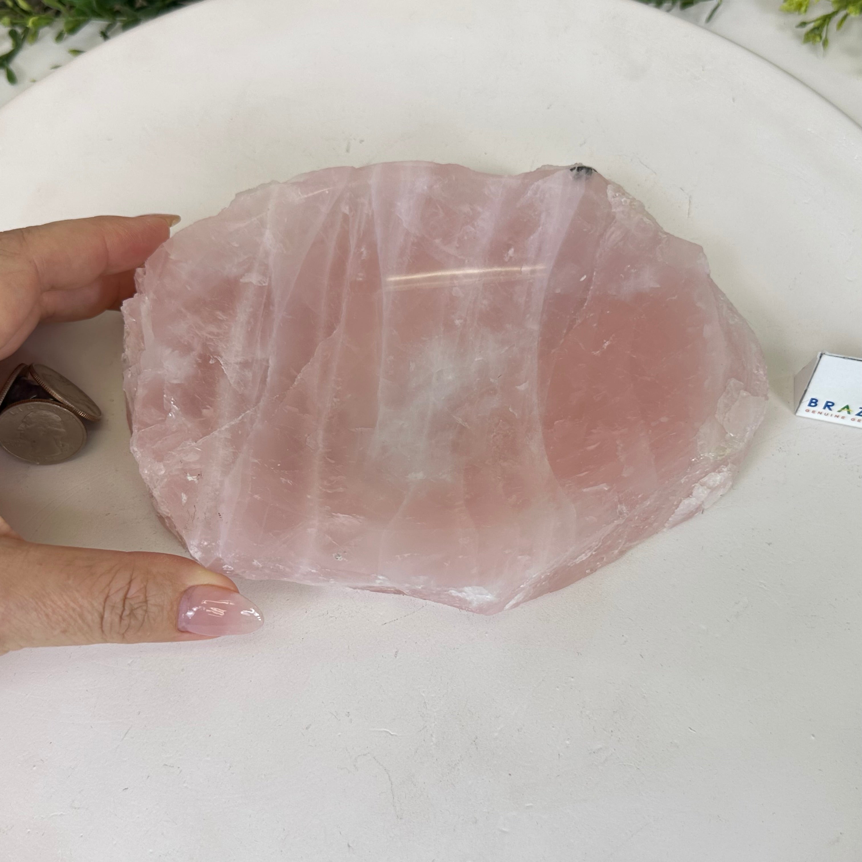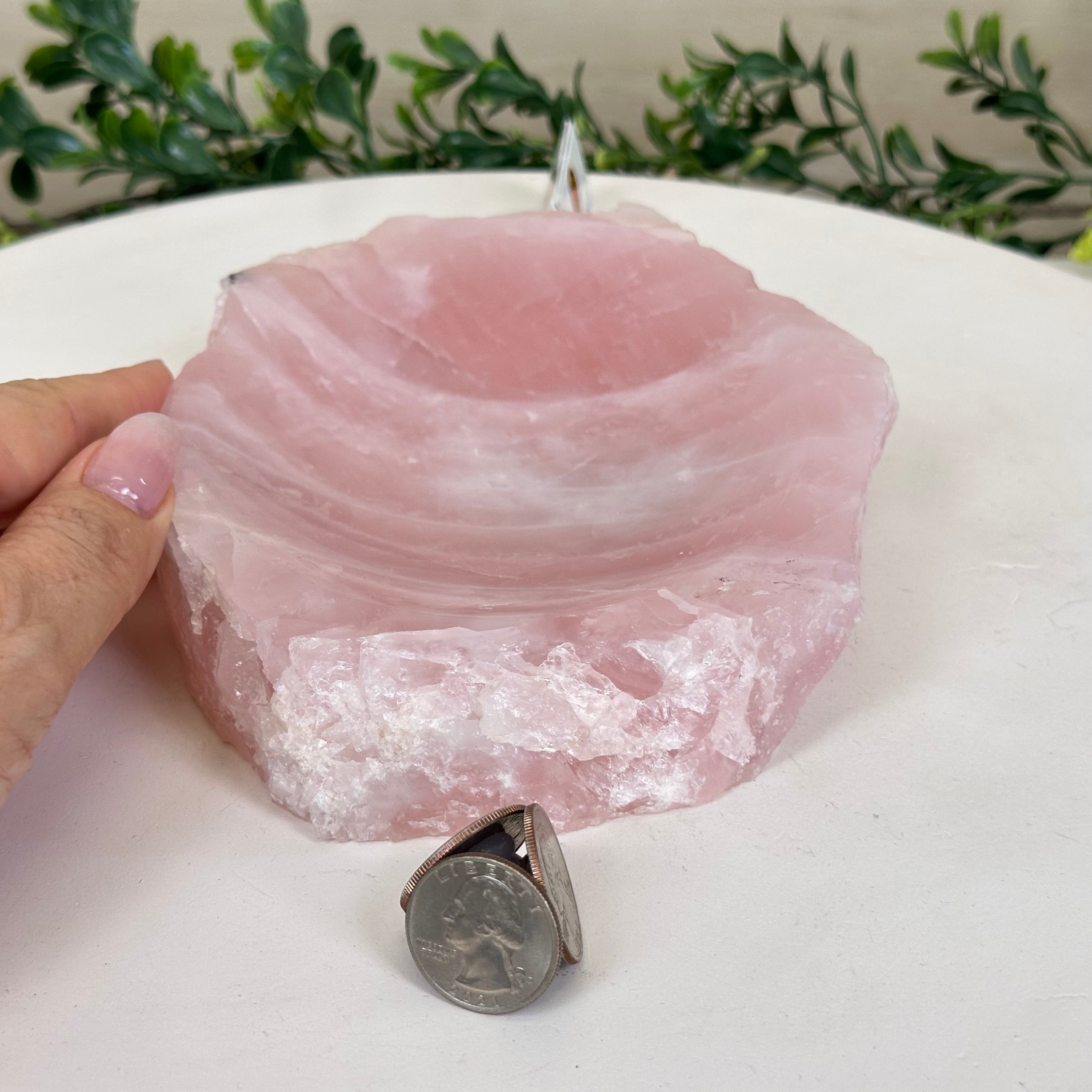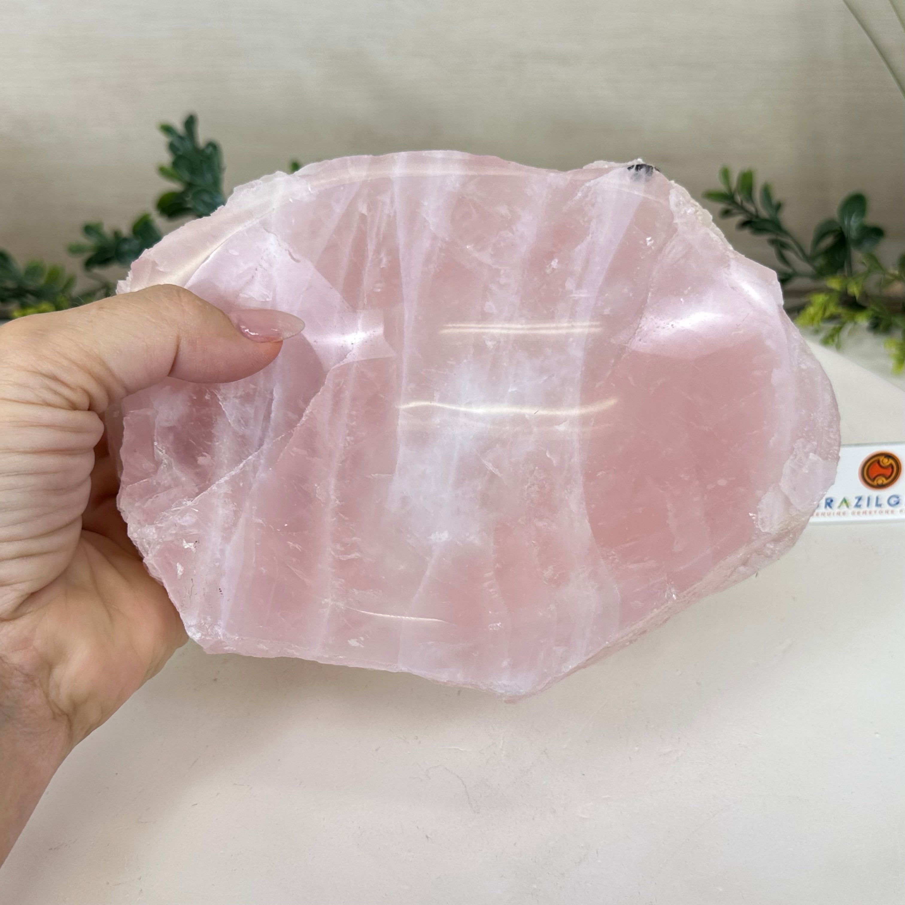 Elegant and versatile, this Rose Quartz decorative bowl is handcrafted from natural Brazilian stone and polished to reveal soft pink and white tones. Use it as a soap dish, jewelry and ring holder, or a decorative catch-all for small items like crystals, keys, or loose change. Its smooth, durable surface makes it ideal for bathroom countertops, bedside tables, or entryway décor. Its edges are rough and not polished.