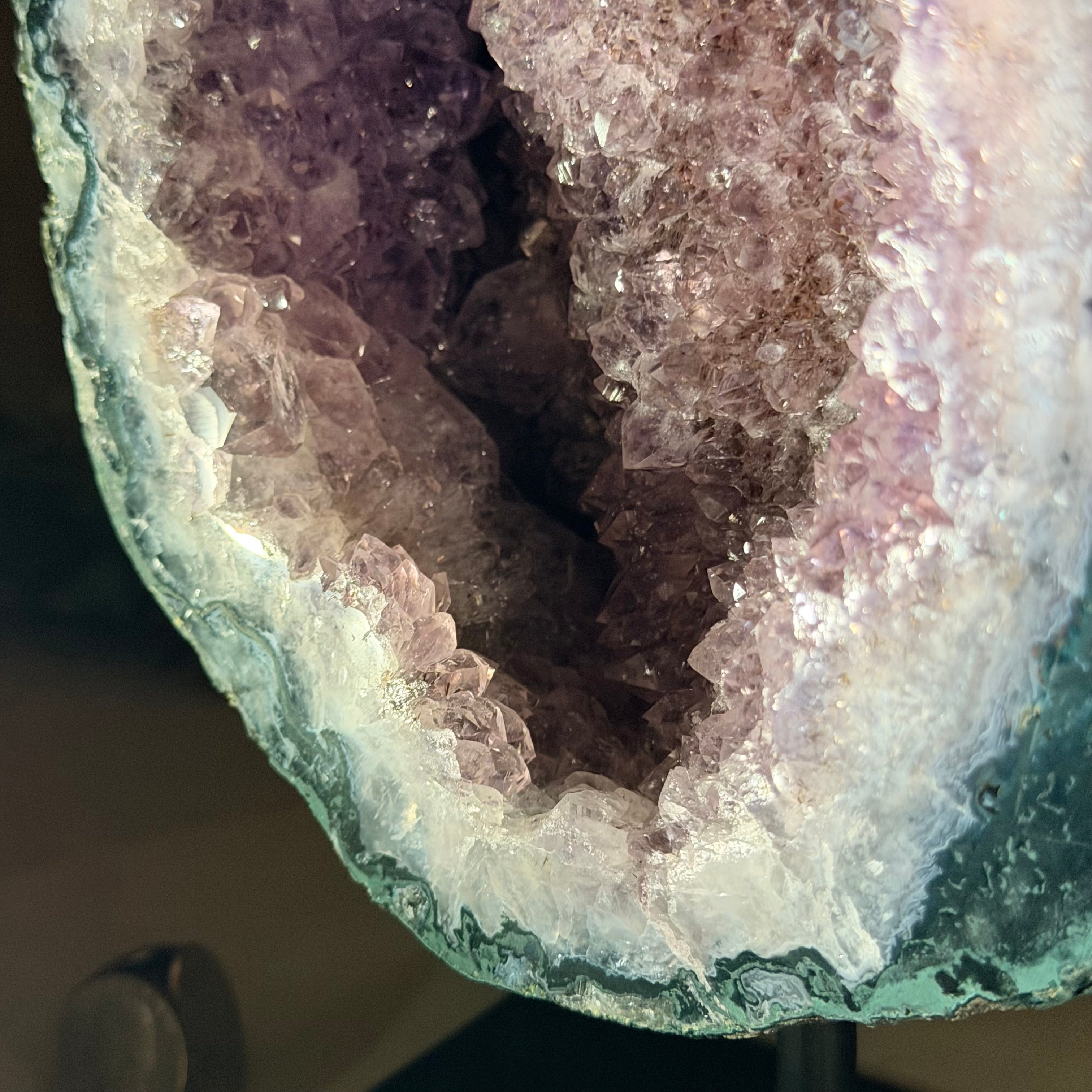 Add a touch of charm to your home or office decor with our Extra Quality Amethyst Cluster. This piece features amethyst points, polished edges and a rough natural outer shell mounted on a black metal stand (a drilled hole in the bottom of the piece allows it to mount and be upright on its stand). It's fabulous to display as a statement piece to elevate your space.