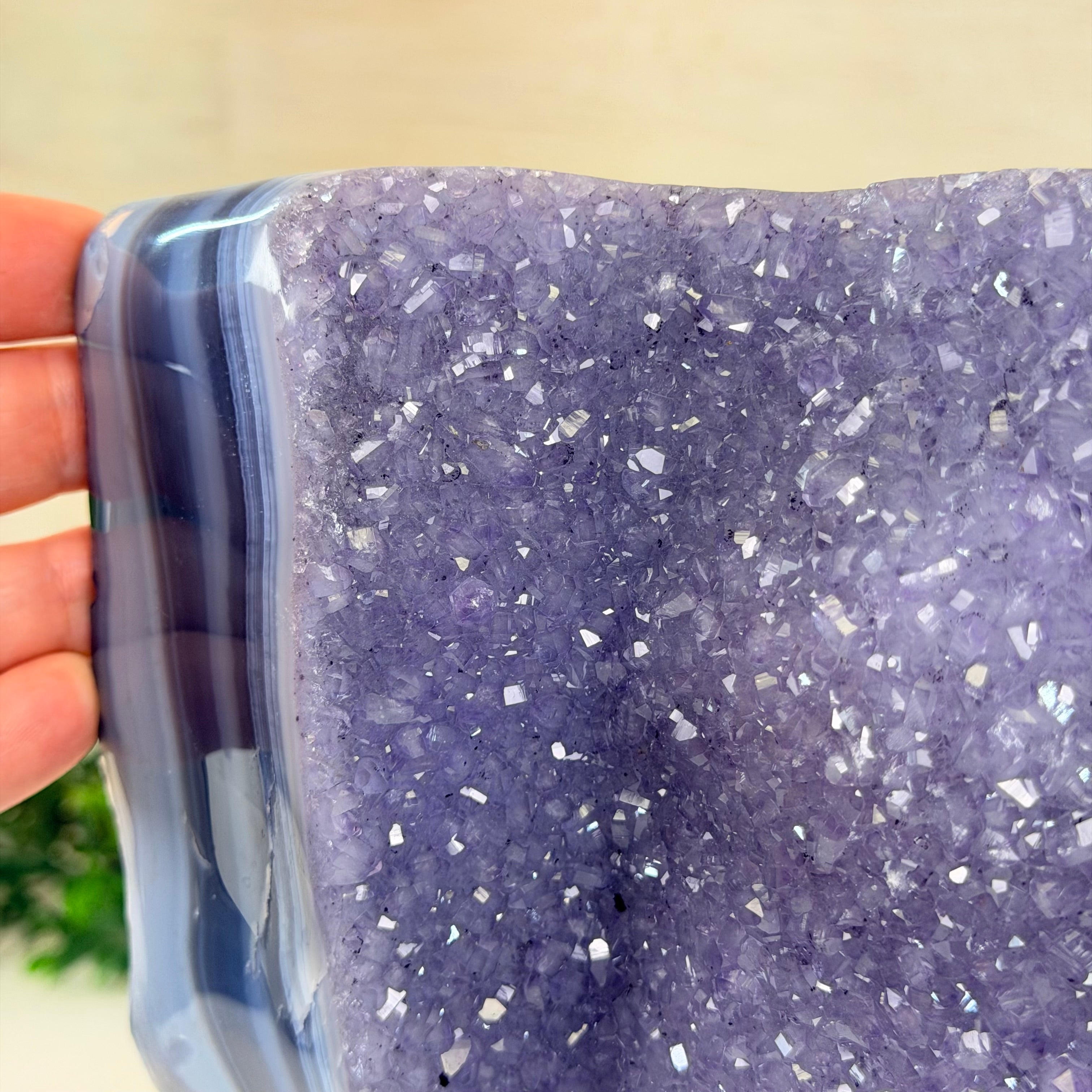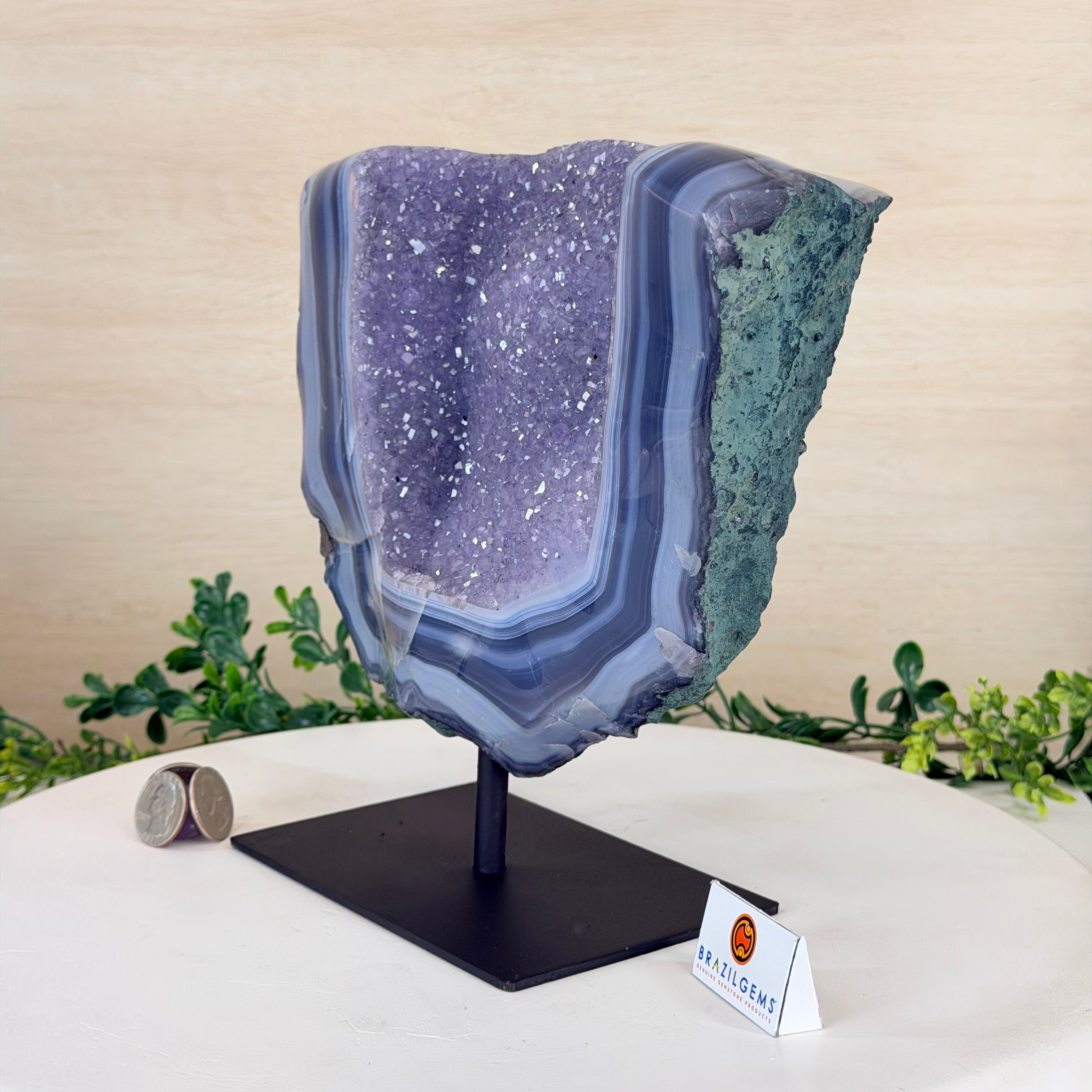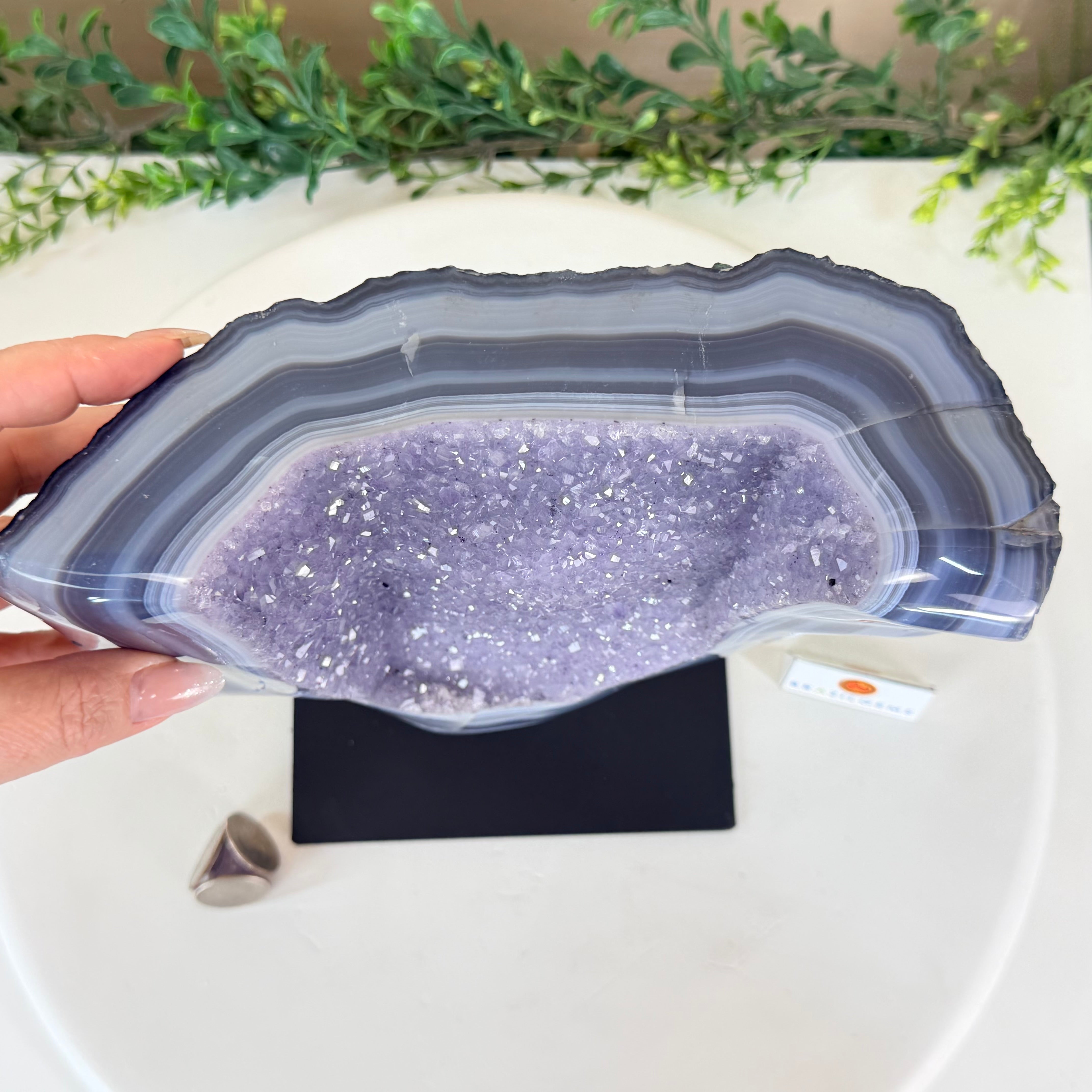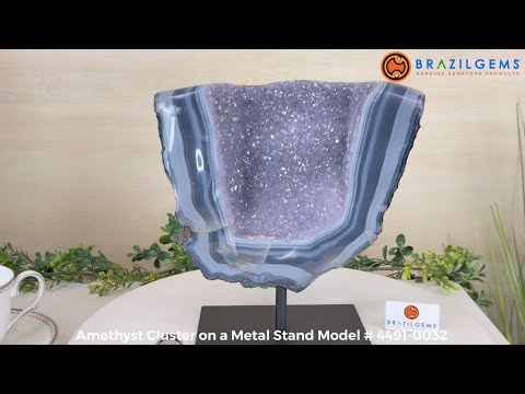 Add a touch of charm to your home or office decor with our Extra Quality Amethyst Cluster. This piece features small and sparkly amethyst points, polished edges with agate bands and a rough natural outer shell mounted on a black metal stand (a drilled hole in the bottom of the piece allows it to mount and be upright on its stand). It's fabulous to display as a statement piece to elevate your space.