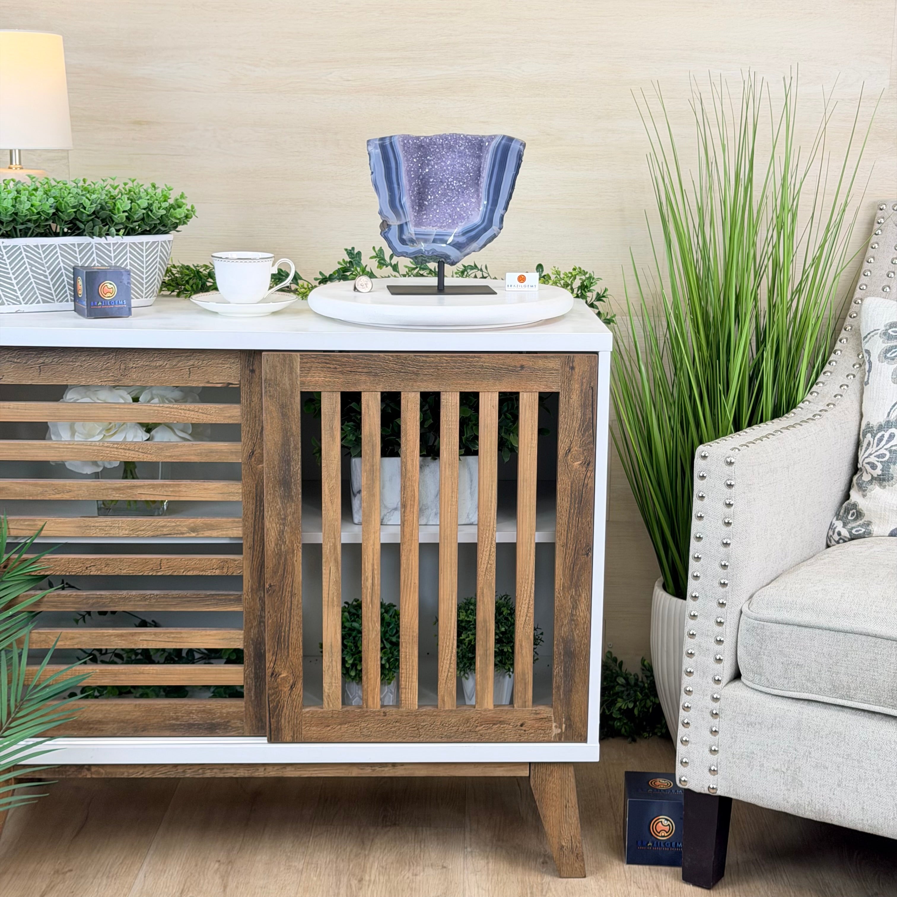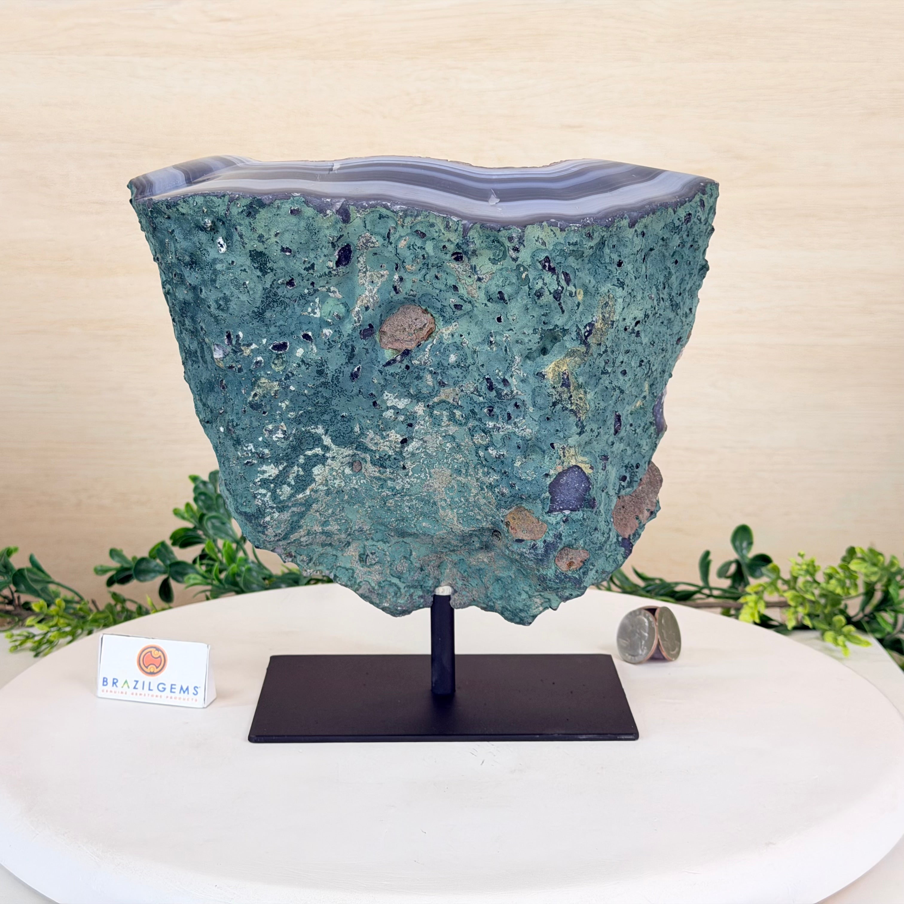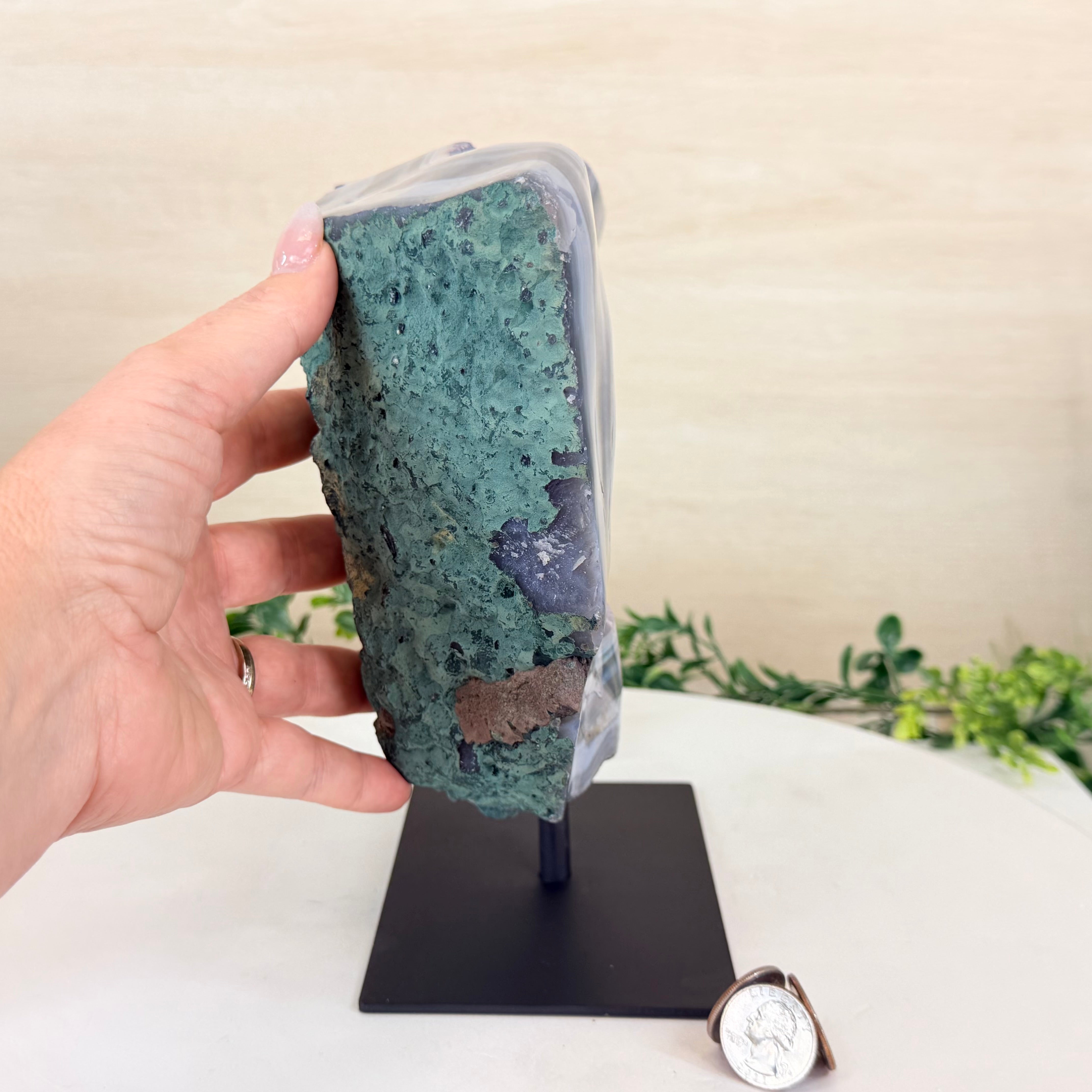 Add a touch of charm to your home or office decor with our Extra Quality Amethyst Cluster. This piece features small and sparkly amethyst points, polished edges with agate bands and a rough natural outer shell mounted on a black metal stand (a drilled hole in the bottom of the piece allows it to mount and be upright on its stand). It's fabulous to display as a statement piece to elevate your space.