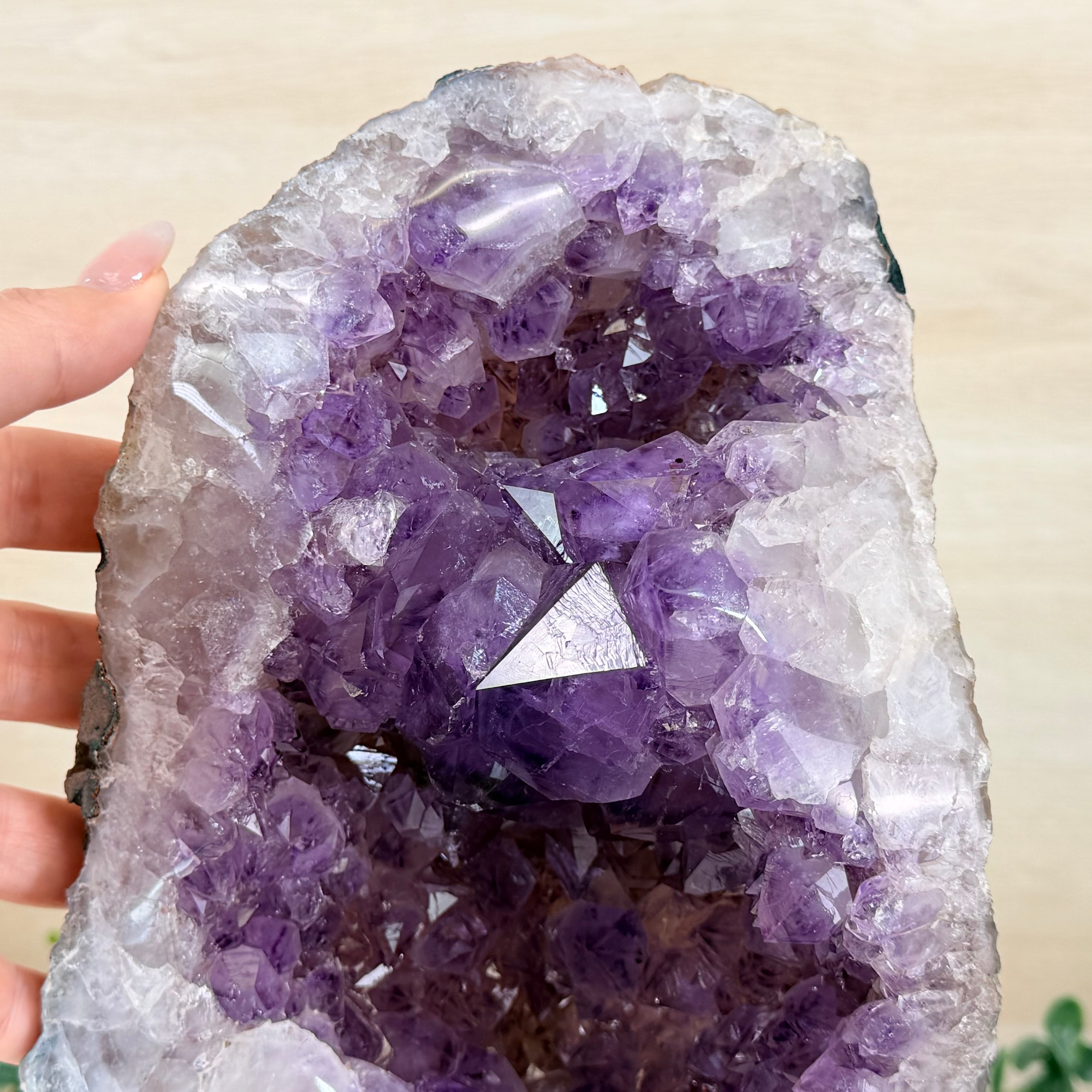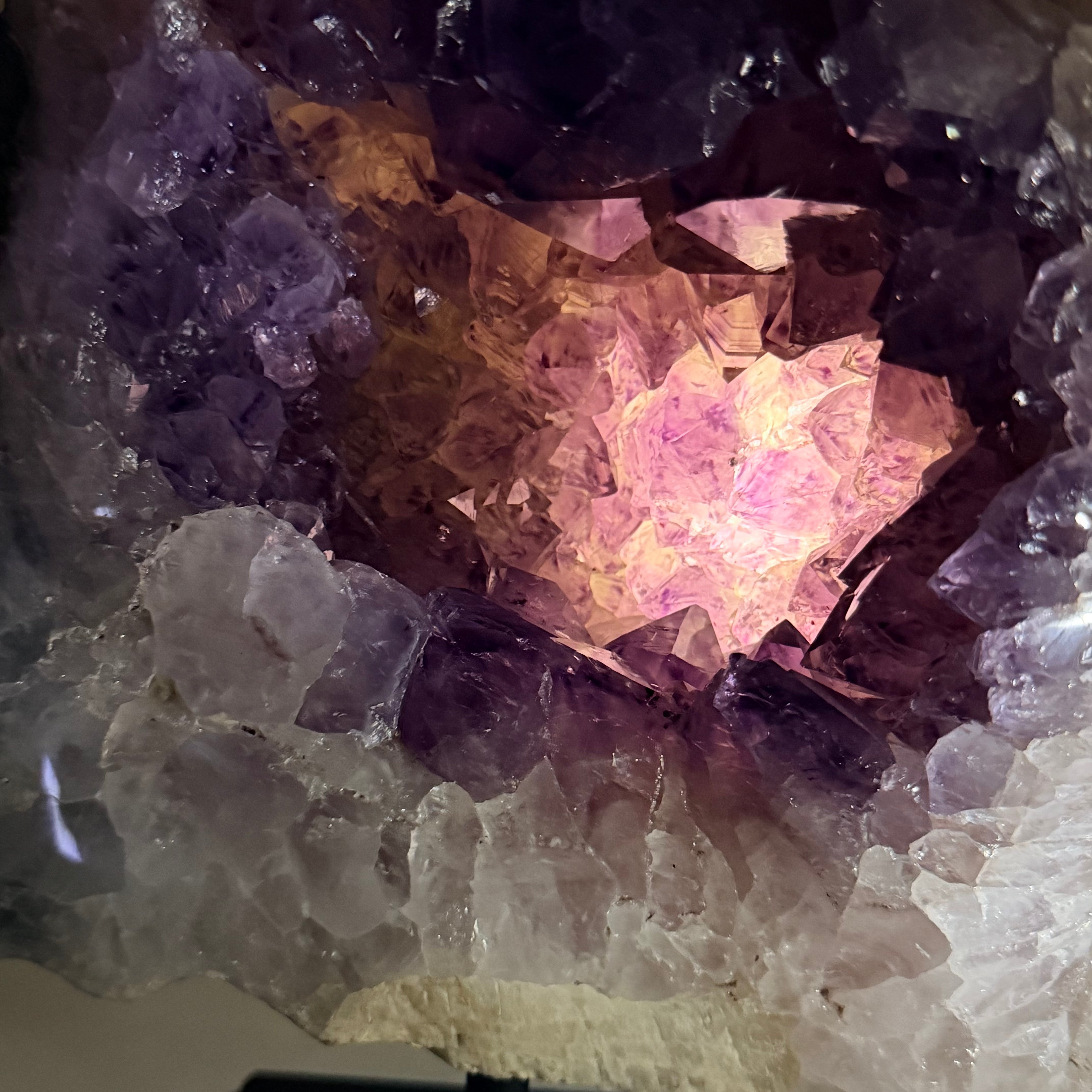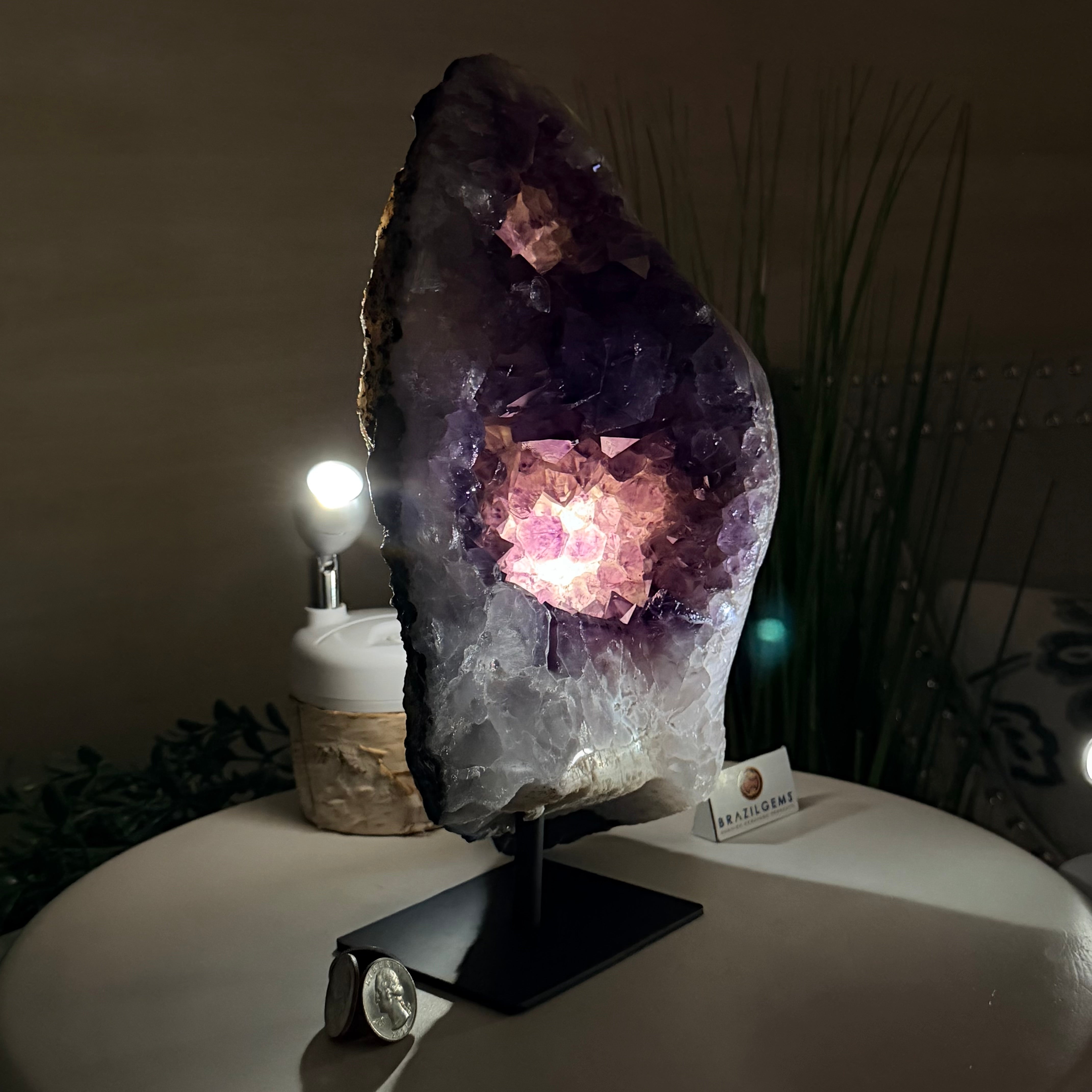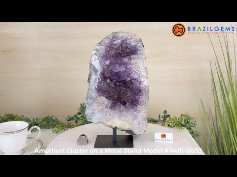 Add a touch of charm to your home or office decor with our Extra Quality Amethyst Cluster. This piece features amethyst points, polished edges and a rough natural outer shell mounted on a black metal stand (a drilled hole in the bottom of the piece allows it to mount and be upright on its stand). It's fabulous to display as a statement piece to elevate your space.