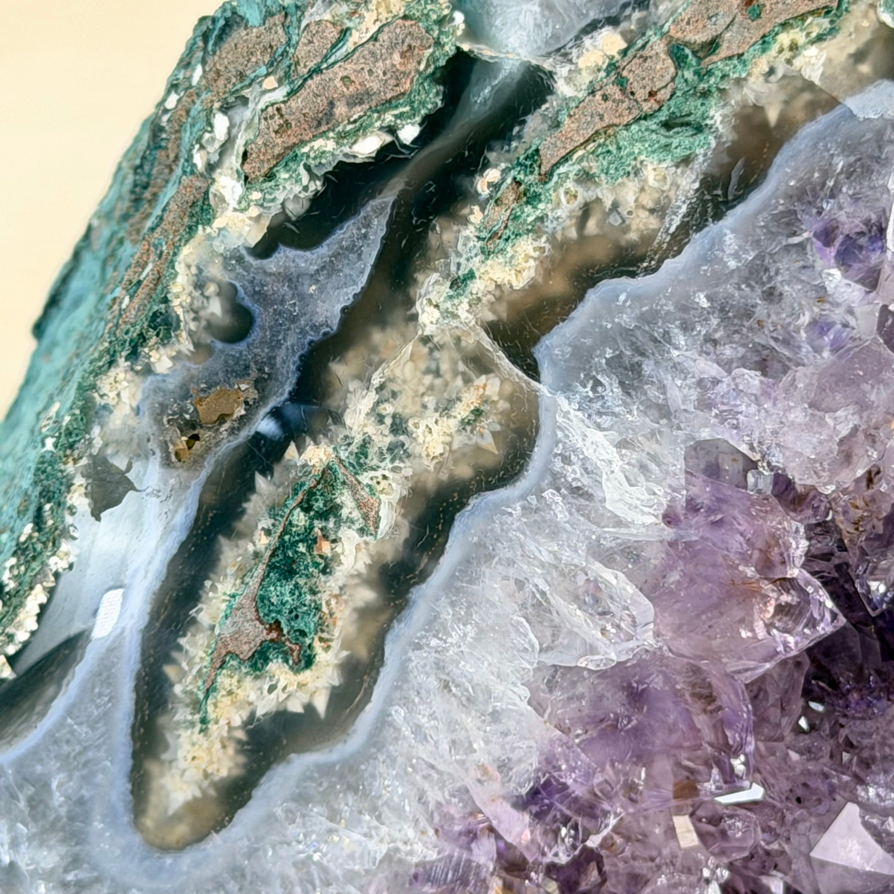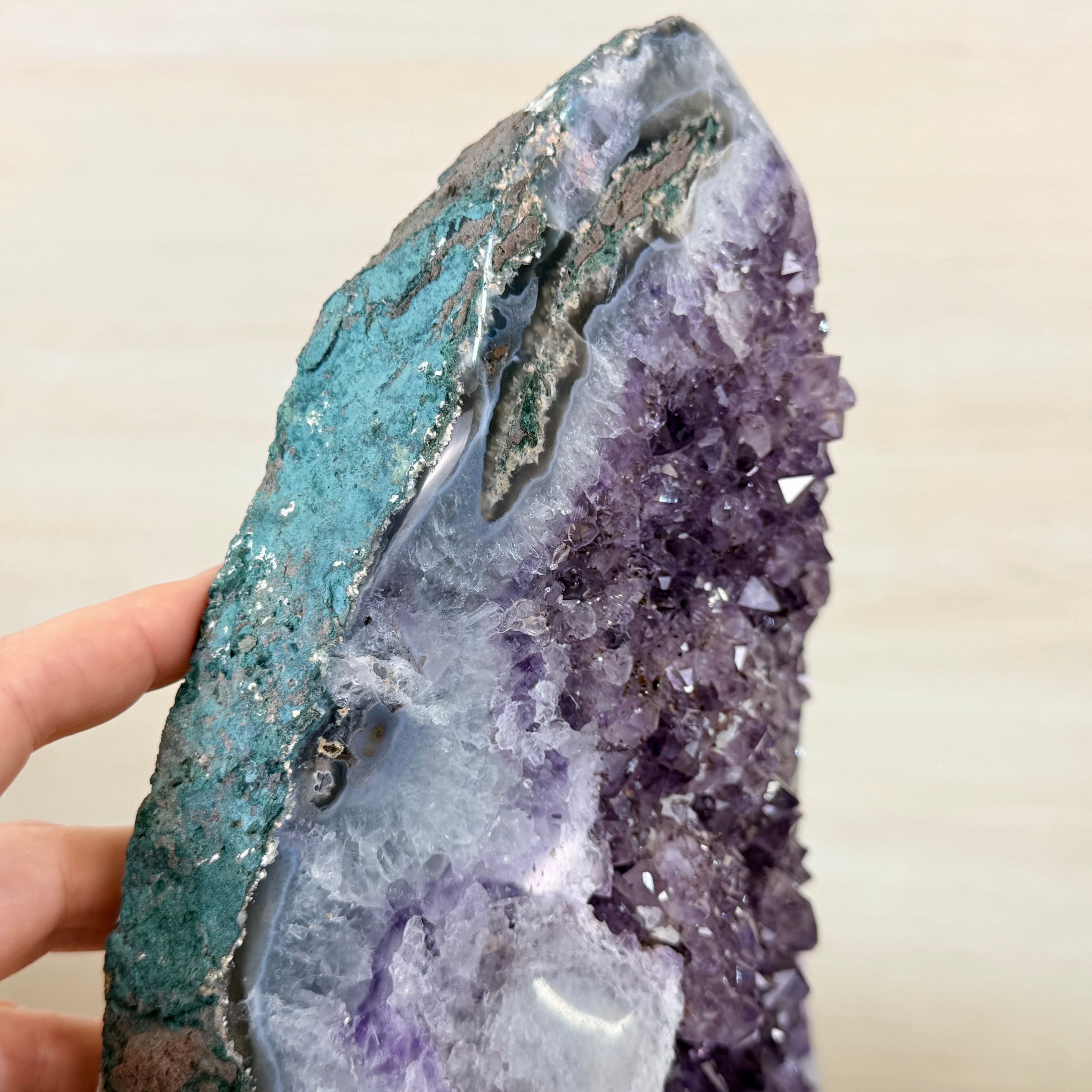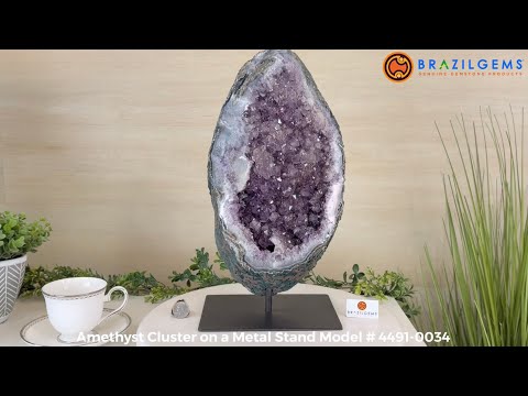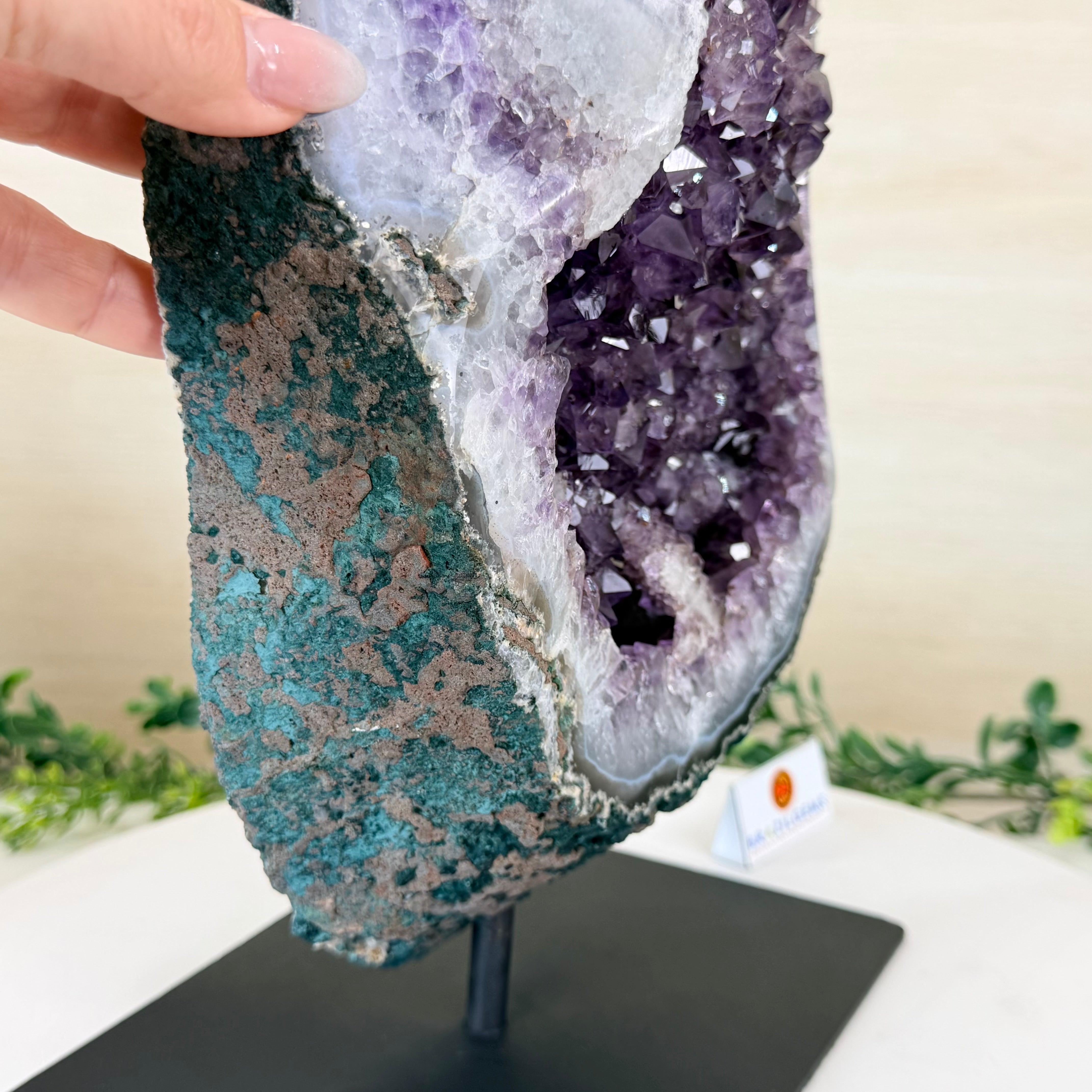 Add a touch of charm to your home or office decor with our Extra Quality Amethyst Cluster. This piece features amethyst points, polished edges and a rough natural outer shell mounted on a black metal stand (a drilled hole in the bottom of the piece allows it to mount and be upright on its stand). It's fabulous to display as a statement piece to elevate your space.