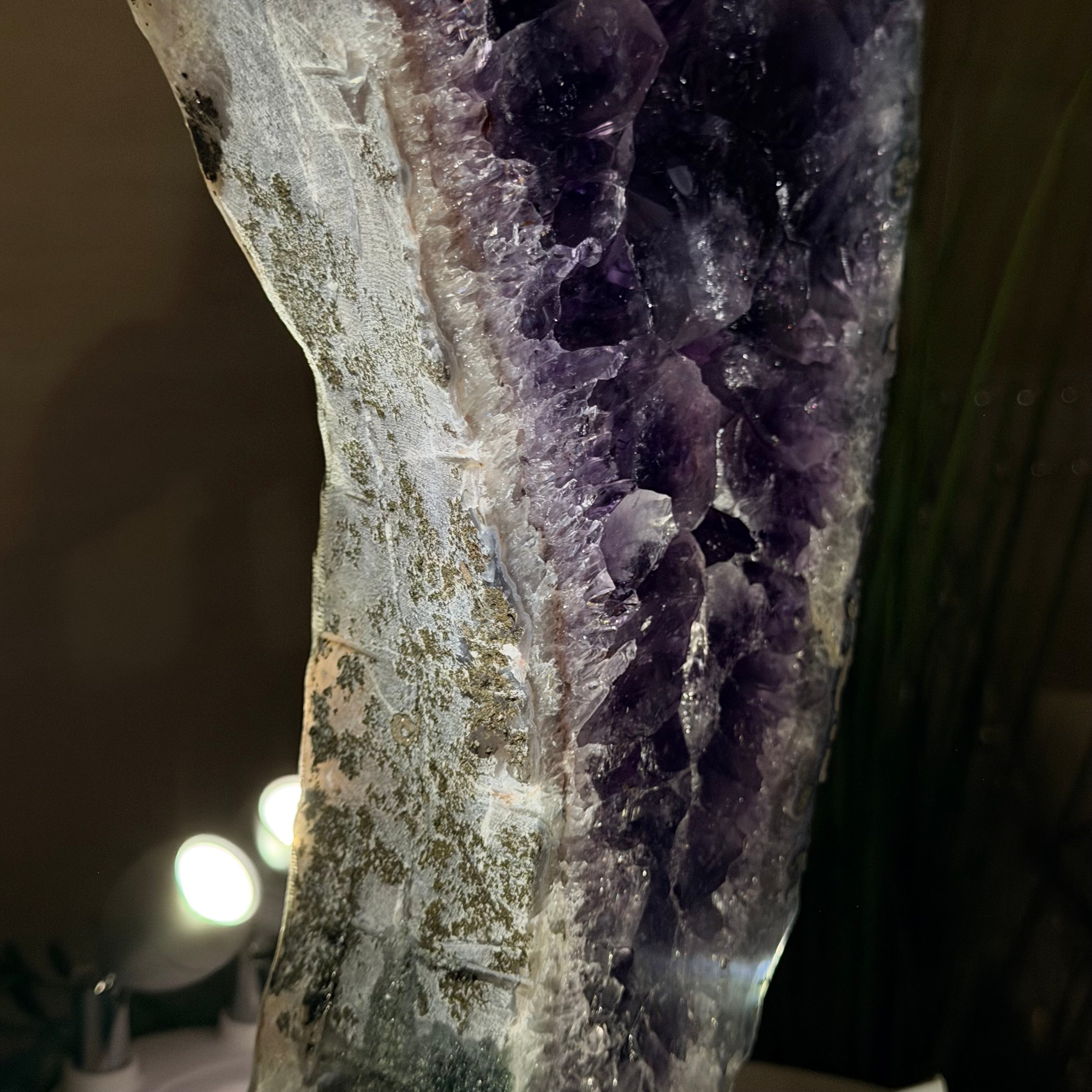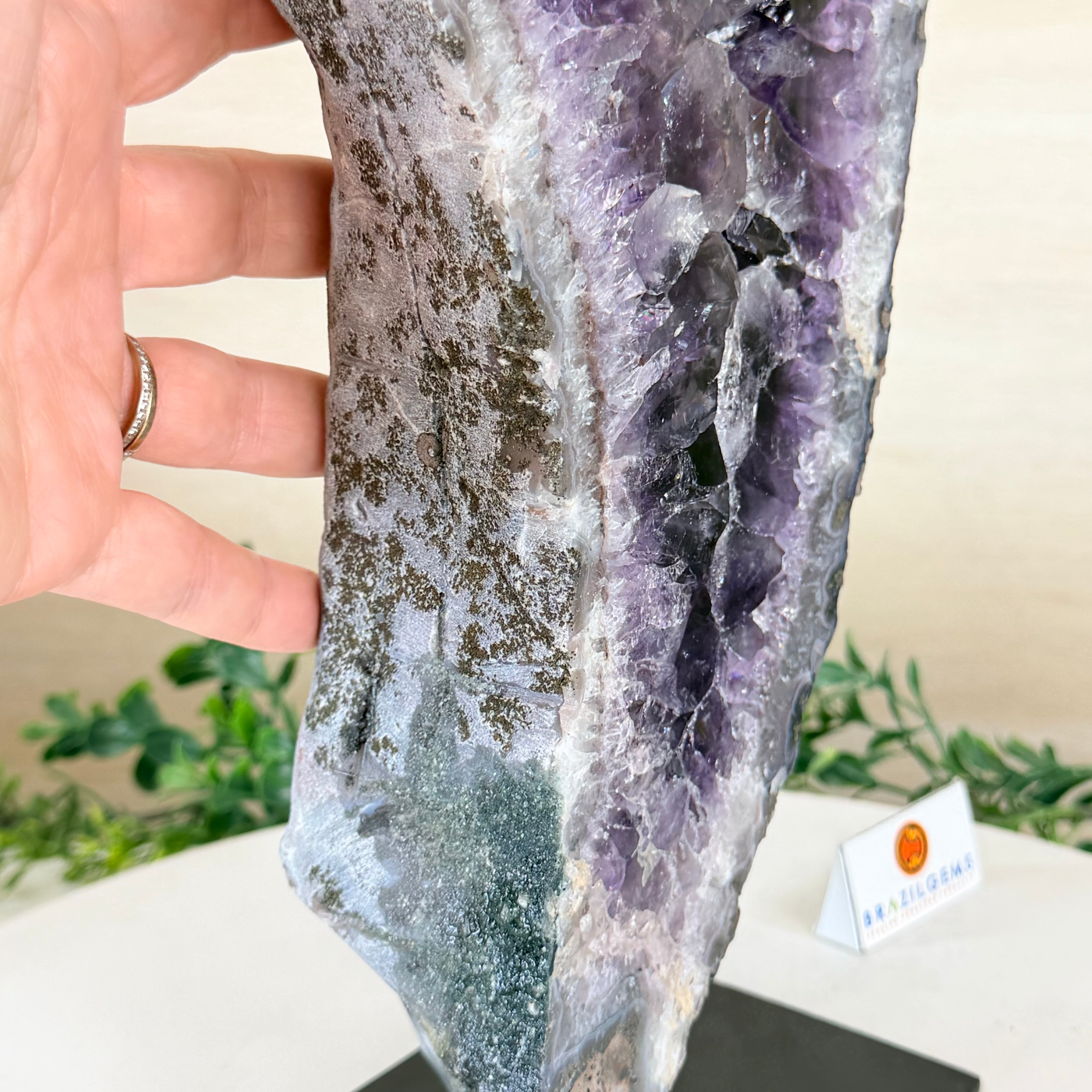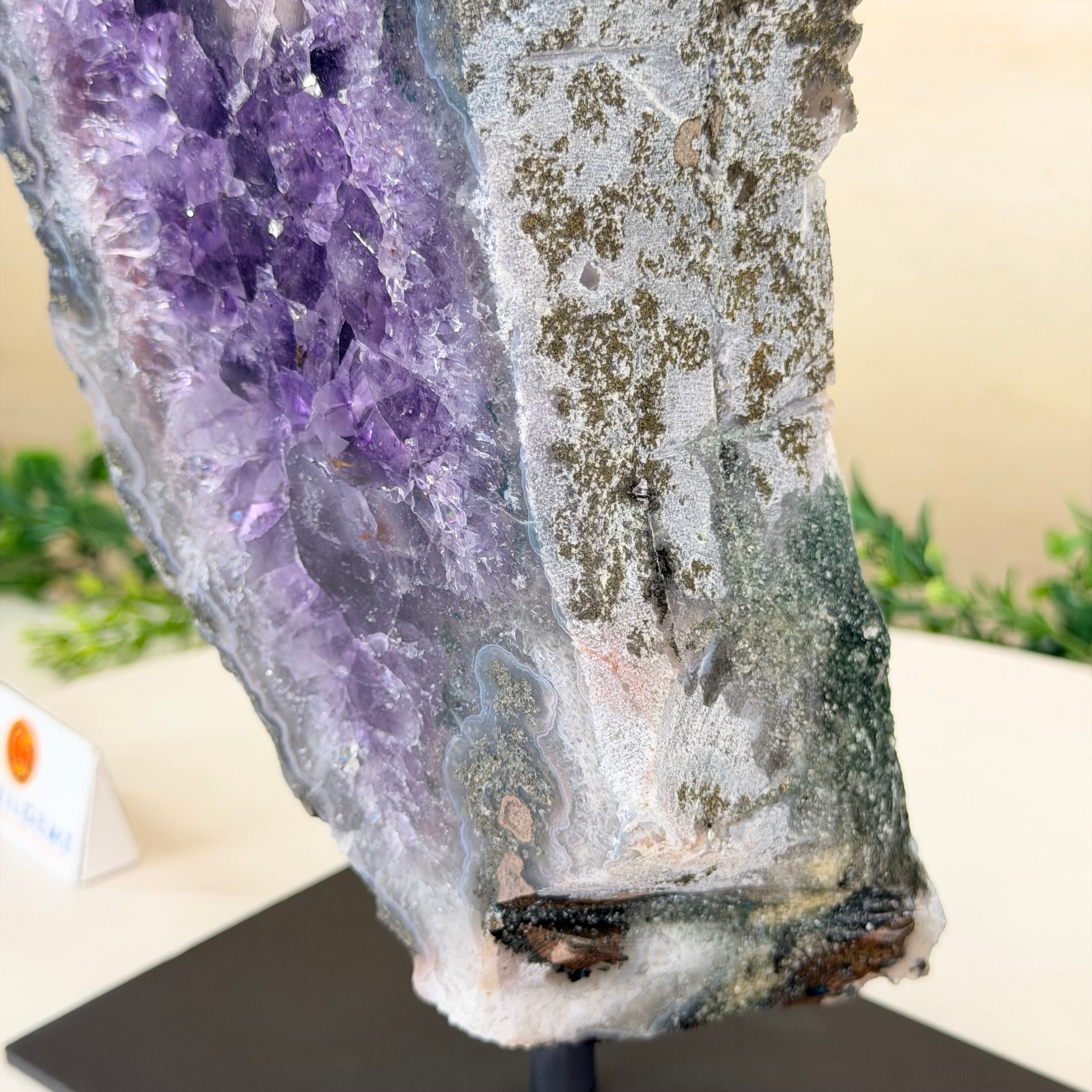 Unveil the charm of this natural Extra Quality Brazilian Amethyst Crystal "Portal" on a black metal fixed stand. A crystal portal is often depicted as a mystical gateway or entrance formed with crystals, believed to connect different realms or dimensions.