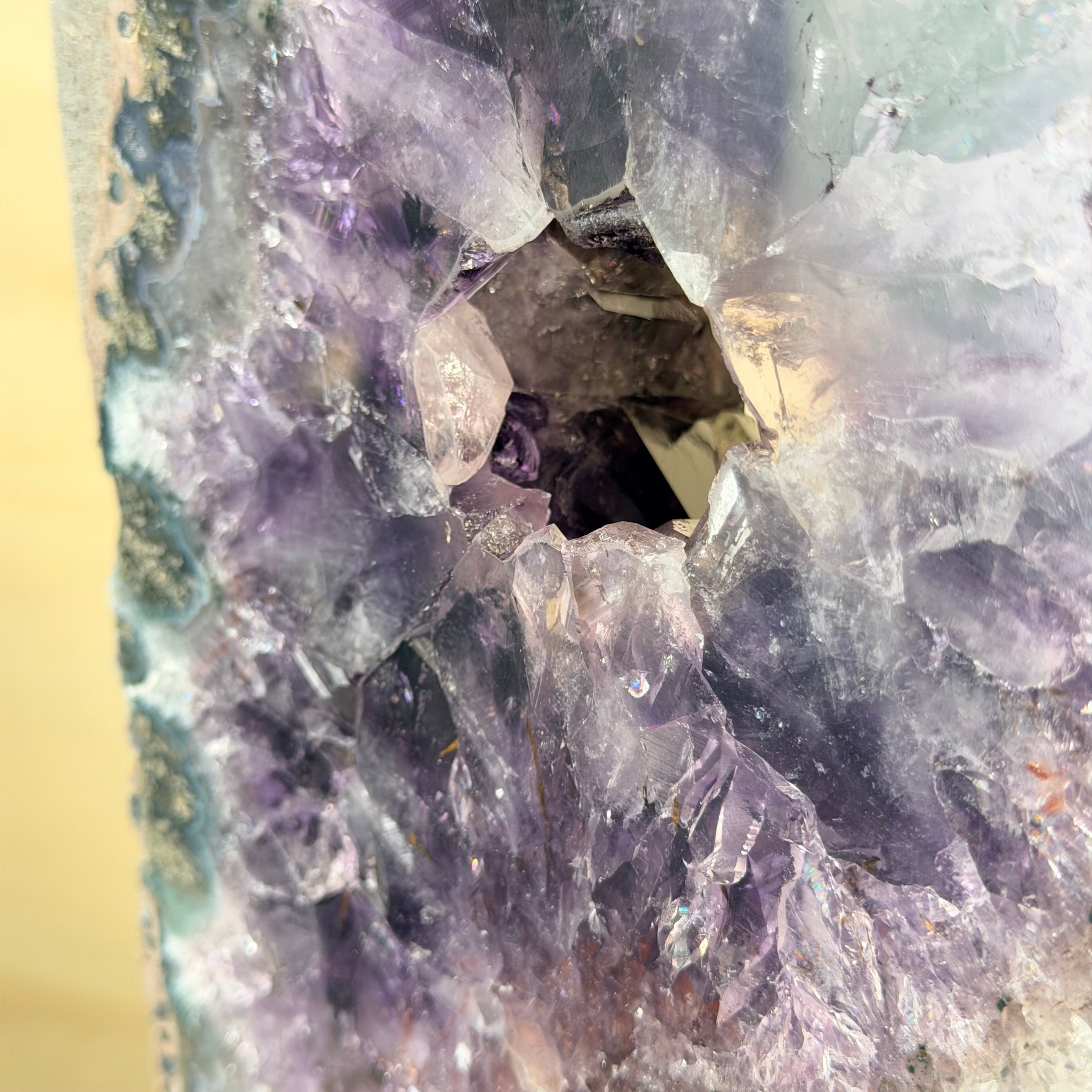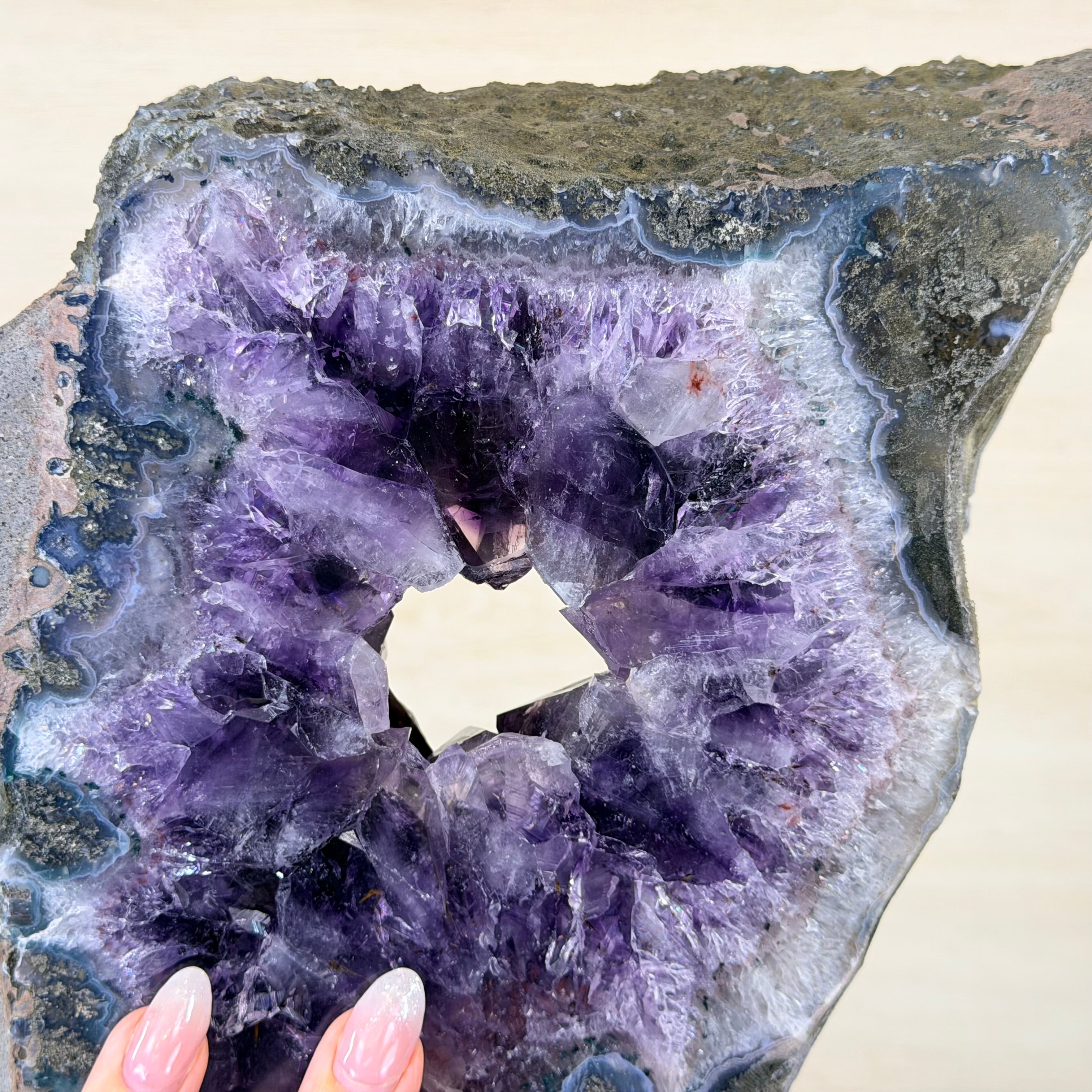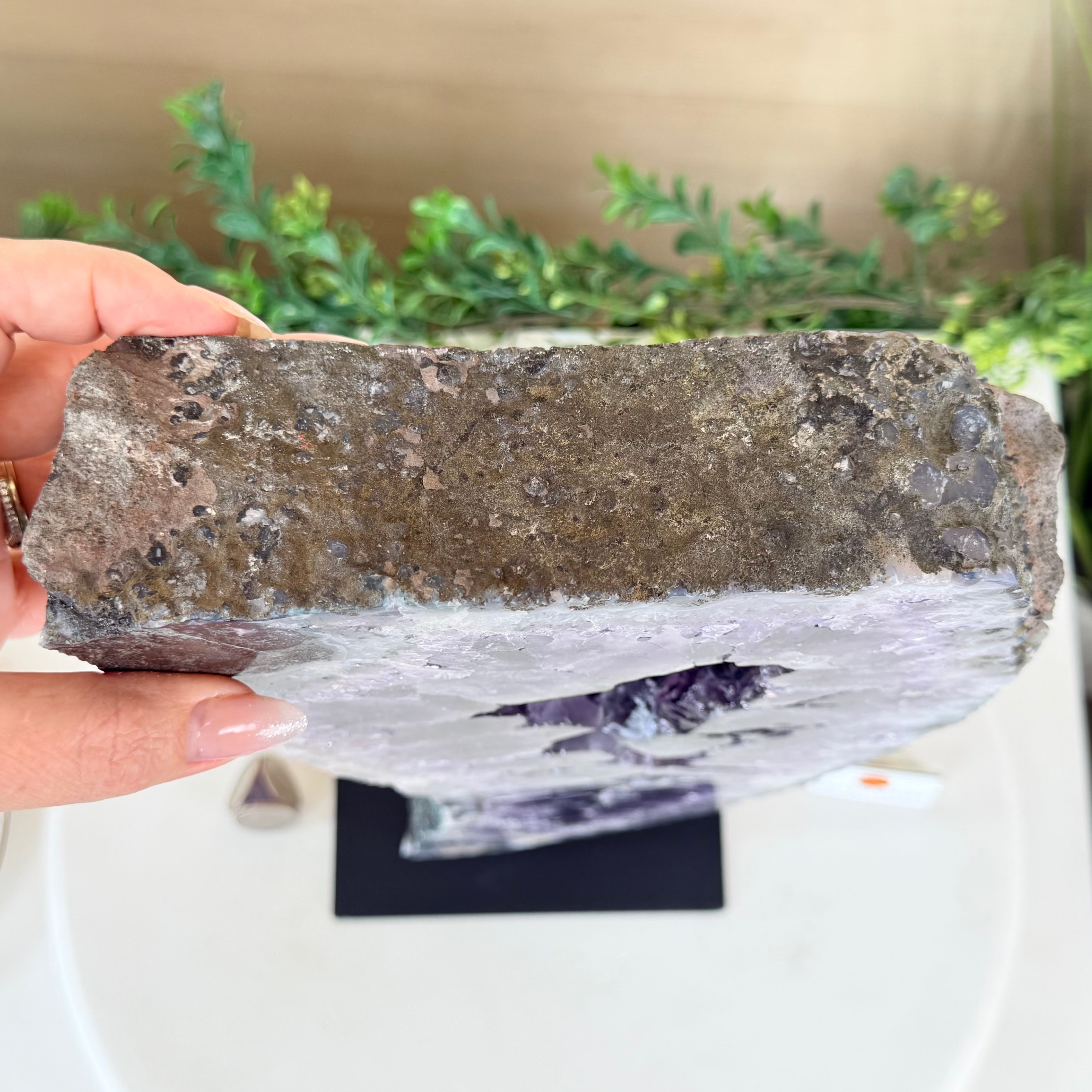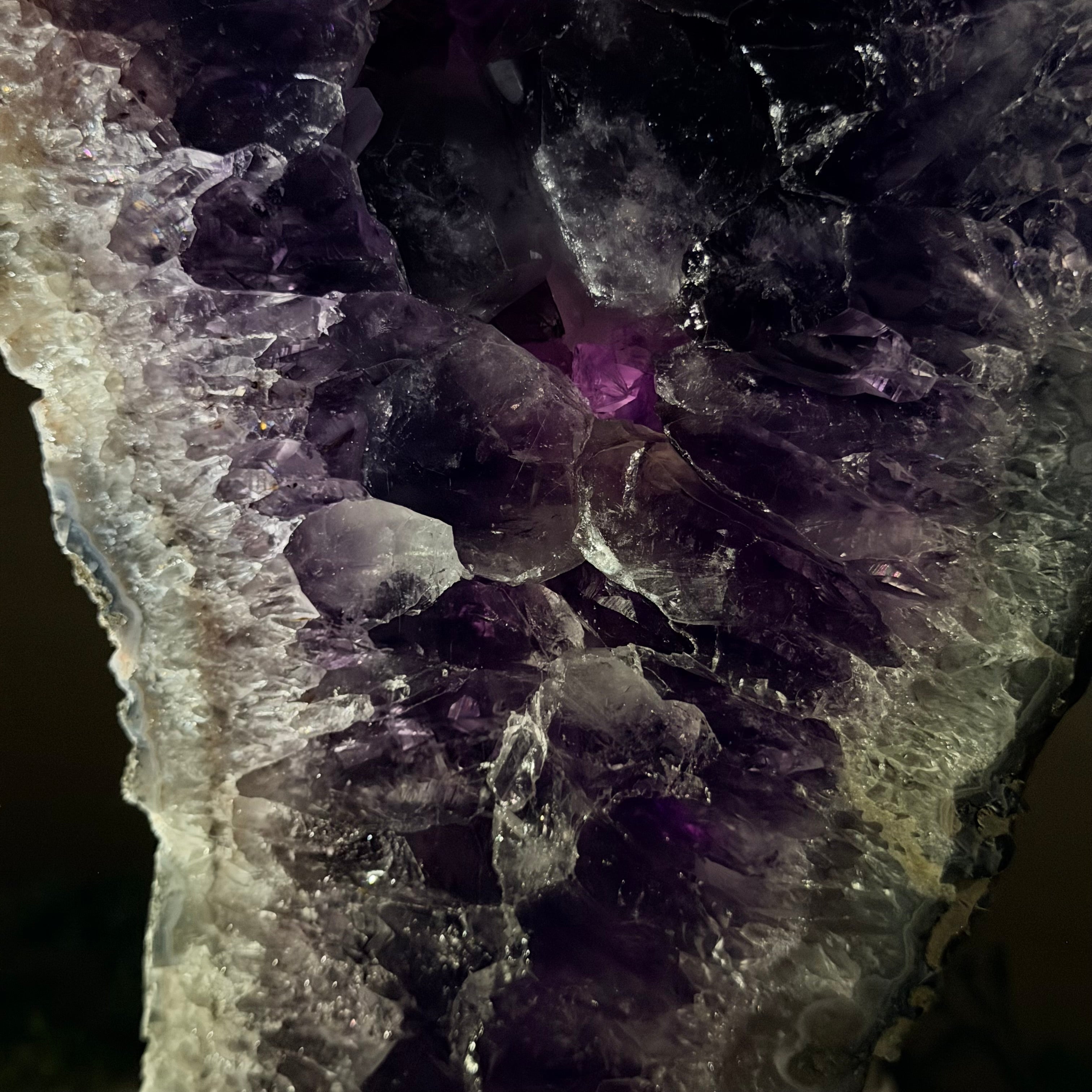 Unveil the charm of this natural Extra Quality Brazilian Amethyst Crystal "Portal" on a black metal fixed stand. A crystal portal is often depicted as a mystical gateway or entrance formed with crystals, believed to connect different realms or dimensions.