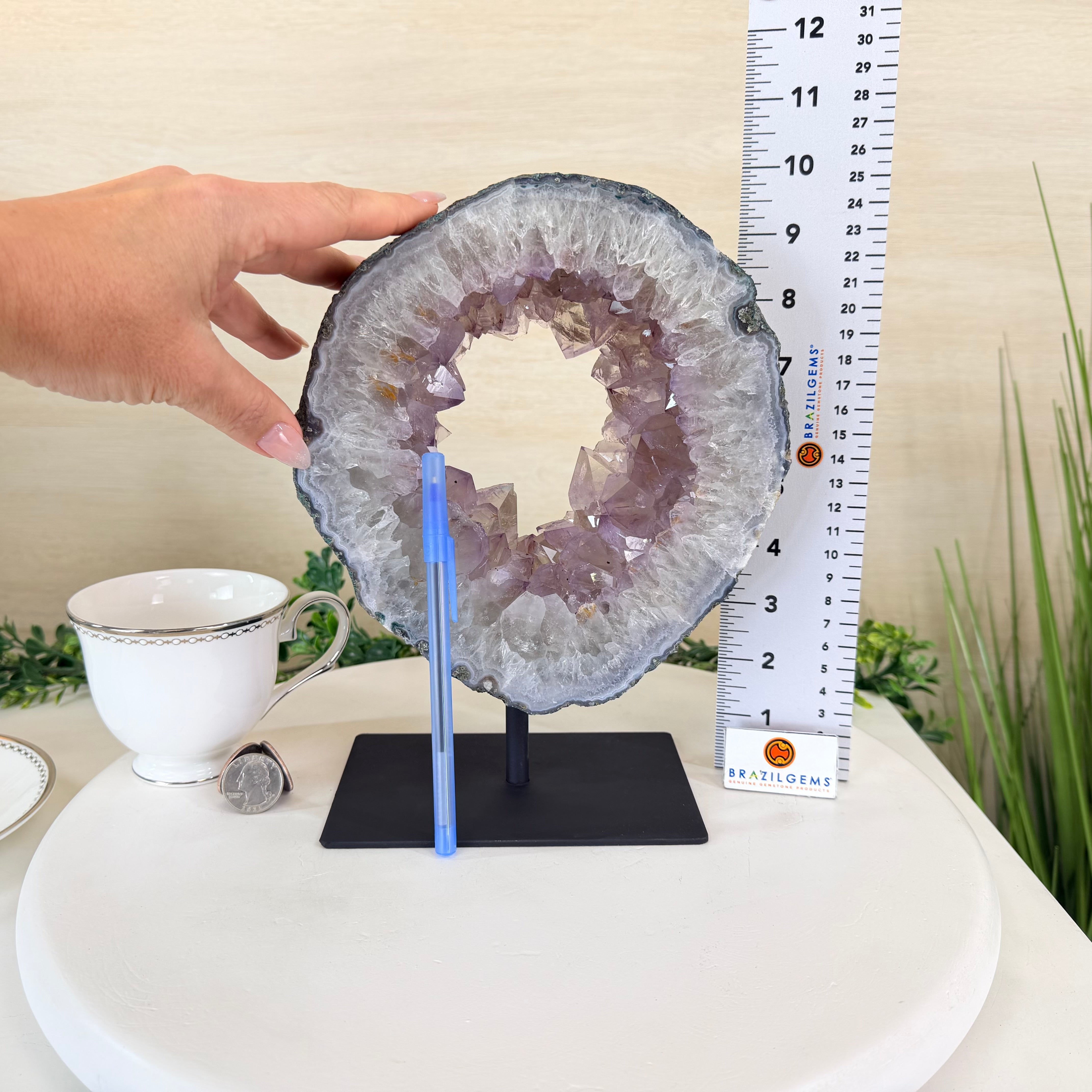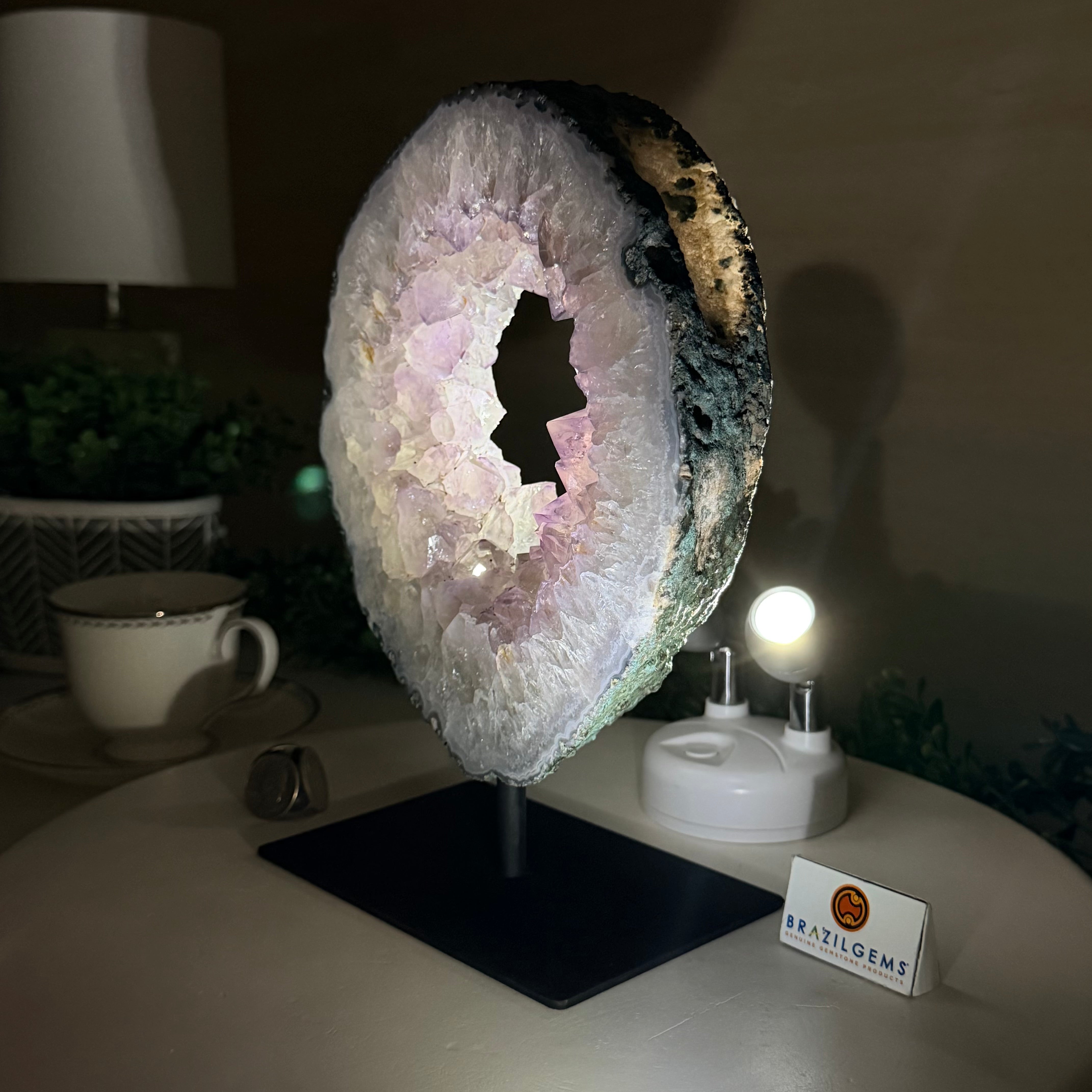 Disclaimer: This is a natural gemstone crystal sold by Brazil Gems® as is and as you see it in its images and video. It is the exact piece you will receive. It may contain natural imperfections as well as imperfections, scratches, broken edges and repairs from the extraction, polishing and mounting processes. The crystal has a hole drilled in its bottom to allow it to be mounted on its black painted metal stand. It may or may not be able to be removed from its stand, you may contact us prior to purchase to see if it is glued onto its stand or removable. At Brazil Gems® we make every effort to get measurements as exact as possible but they are done by human hands and eyes and therefore may have minor discrepancies.