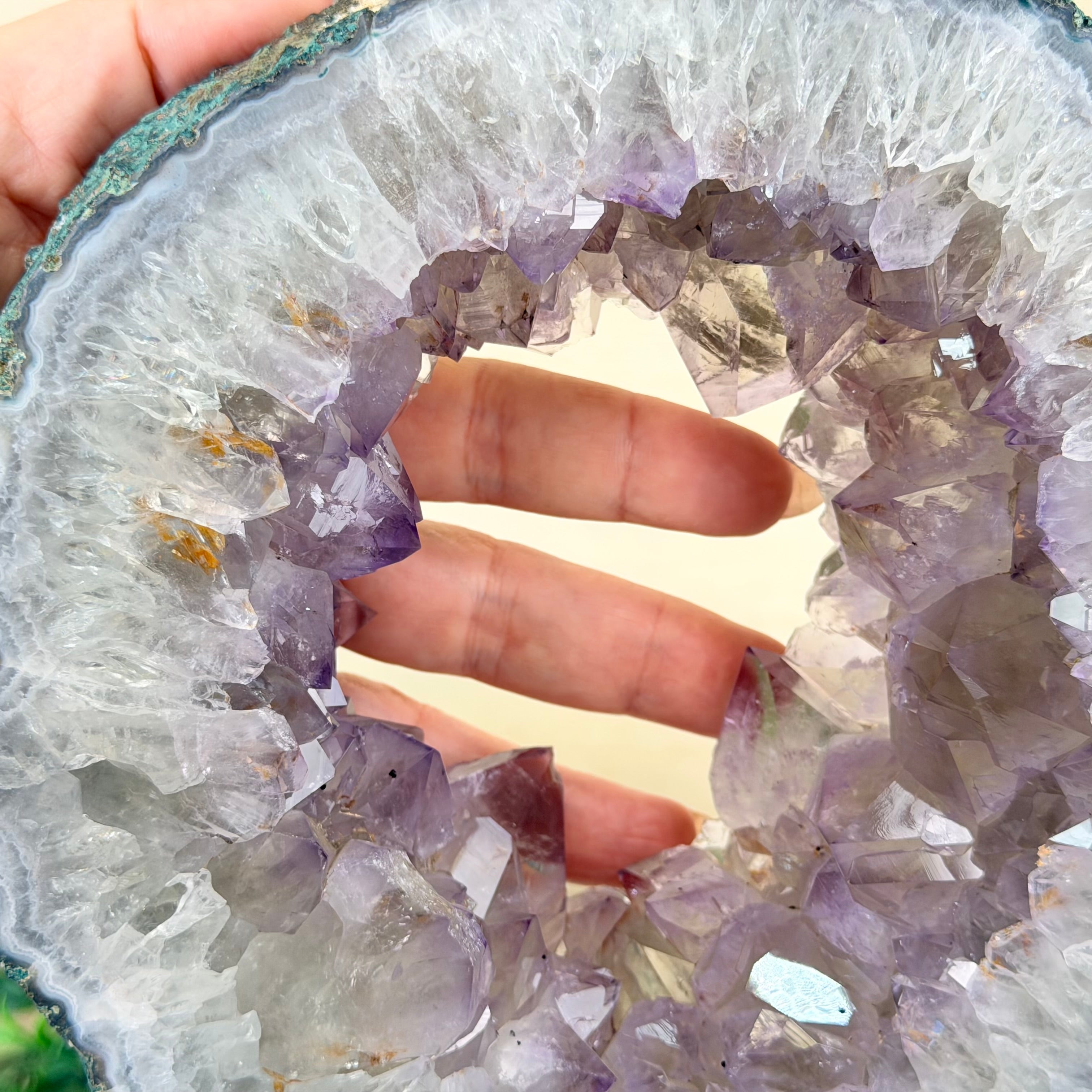 The formation of amethyst is a story of icy beauty crystallizing from a legacy of fire. Basaltic lava can cool with porous cavities that can be 15-feet long. As silica-rich waters run through these cavities, traces of silica leave the seeds of crystalline growth. The water’s iron content gives amethyst its signature purple color. Placement of amethyst in your environment is an invitation to let healing energy and the timelessness of the Earth take your journey to a higher plane. Protect your amethyst stones from direct sunlight to preserve their vibrancy.